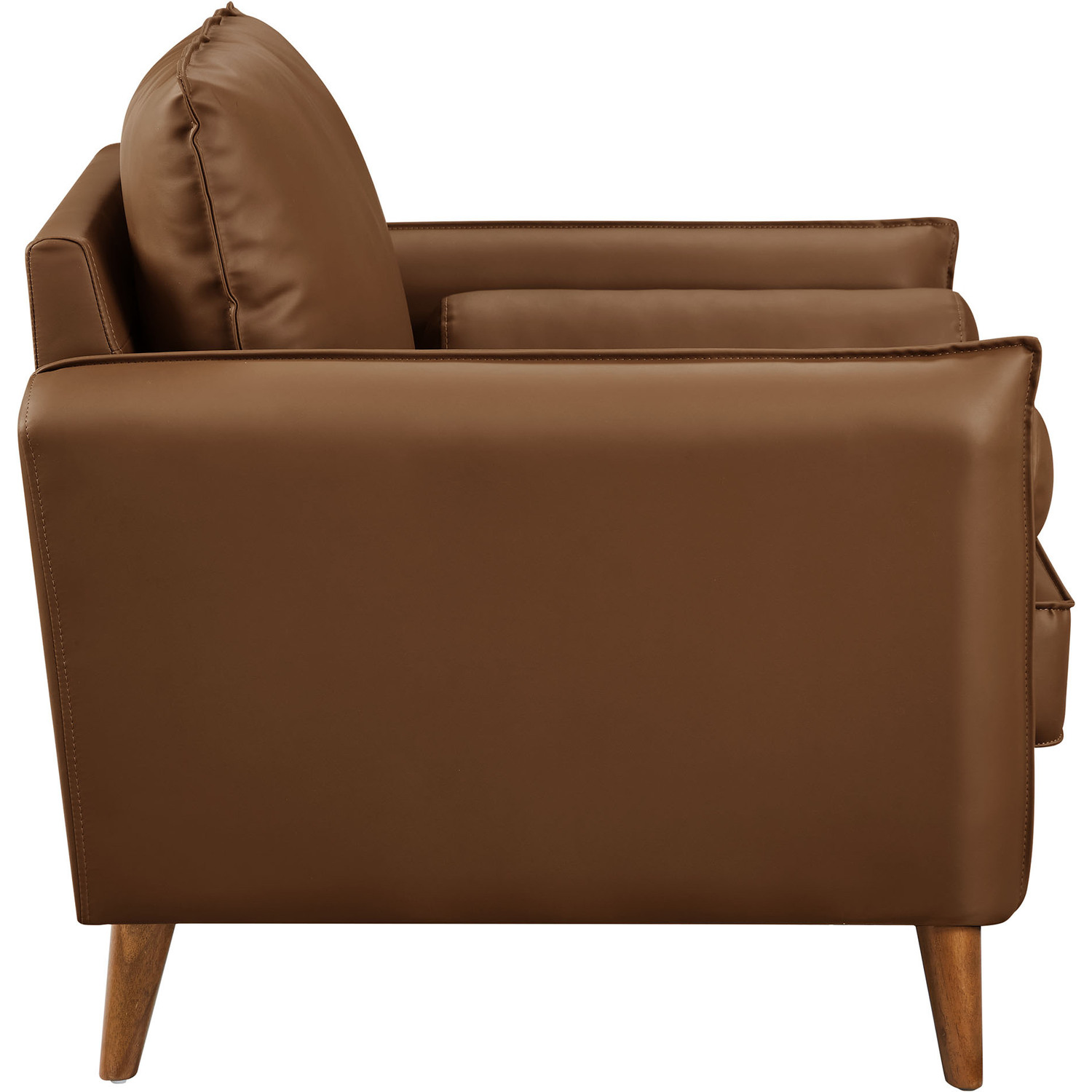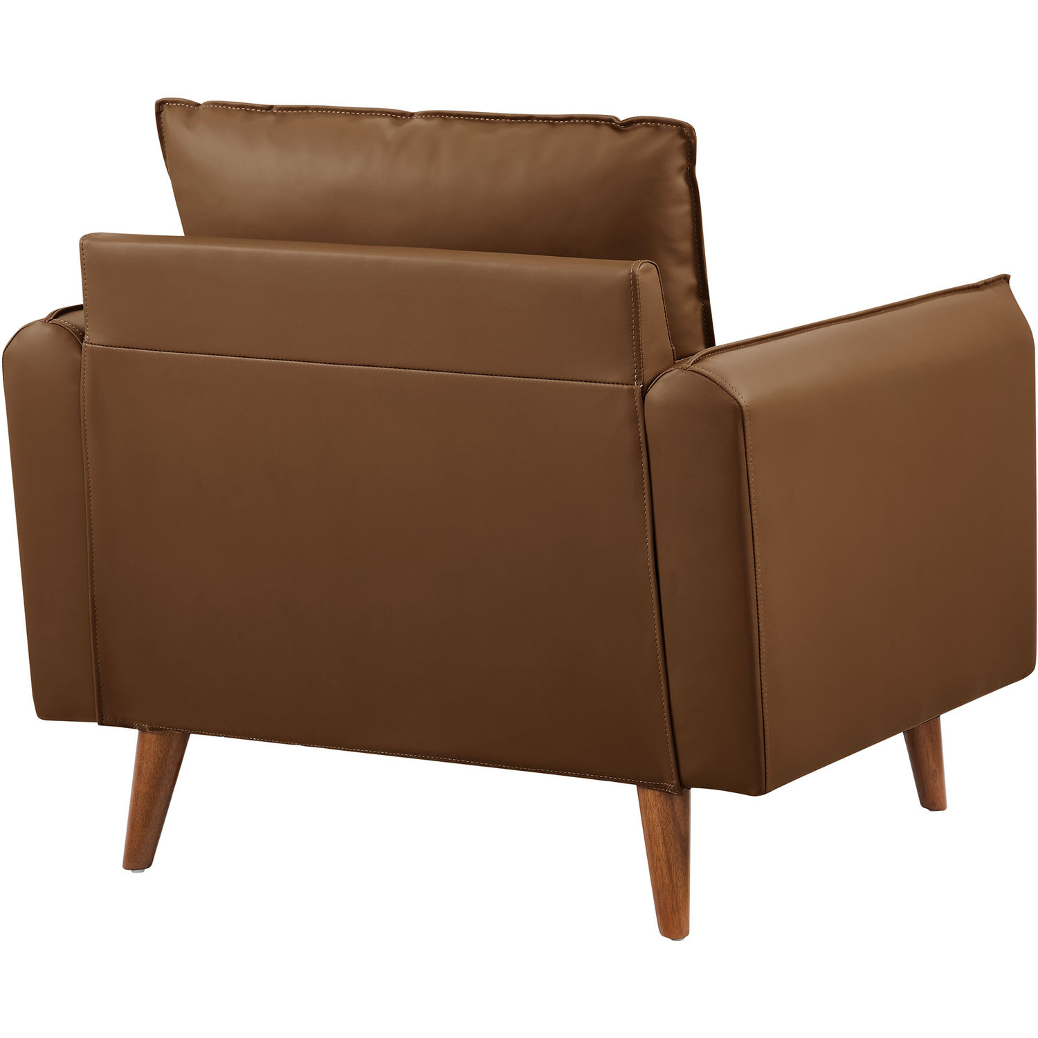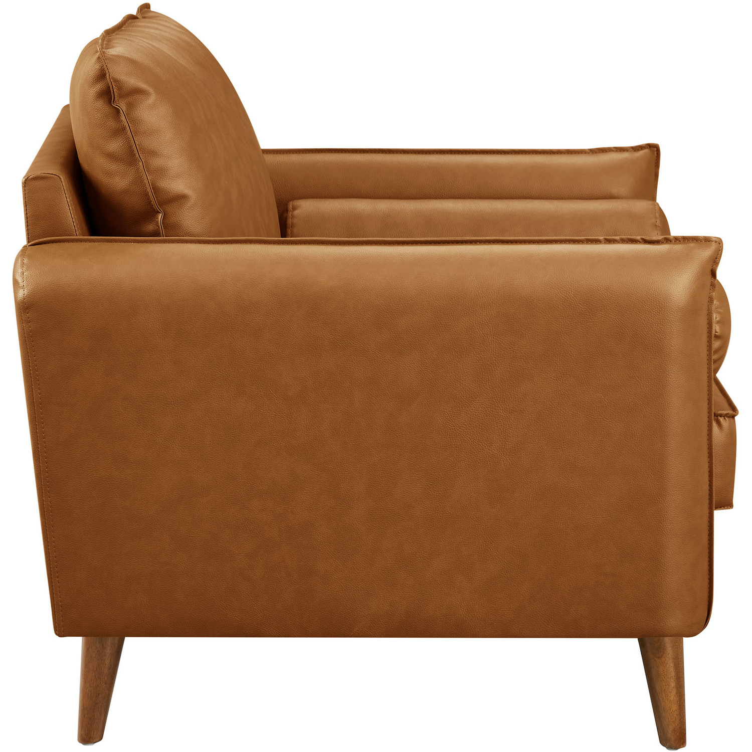 Give new vitality to your home or apartment with the Revive Faux Leather Accent Armchair. With its sleek, tailored profile and plush bolster pillows, this PU leather club chair invites you to sit back and relax in style. Upholstered in rich vegan leather, this accent chair with arms exudes an approachable elegance, perfectly complemented by its clean lines and splayed wood legs. Designed for both comfort and style, the durable faux leather upholstery ensures this vintage chair maintains its charm through everyday use. Whether positioned as a corner chair, an accent piece in the living room, or a cozy lounge office chair, the Revive Sofa Chair offers a welcoming spot for relaxation and conversation. With its perfect blend of mid-century modern design and classic comfort, the Revive 1-Seater Armchair effortlessly enhances the ambiance of any space. Wide Arm Chair Weight Capacity: 400 lbs.Vegan Leather Upholstery