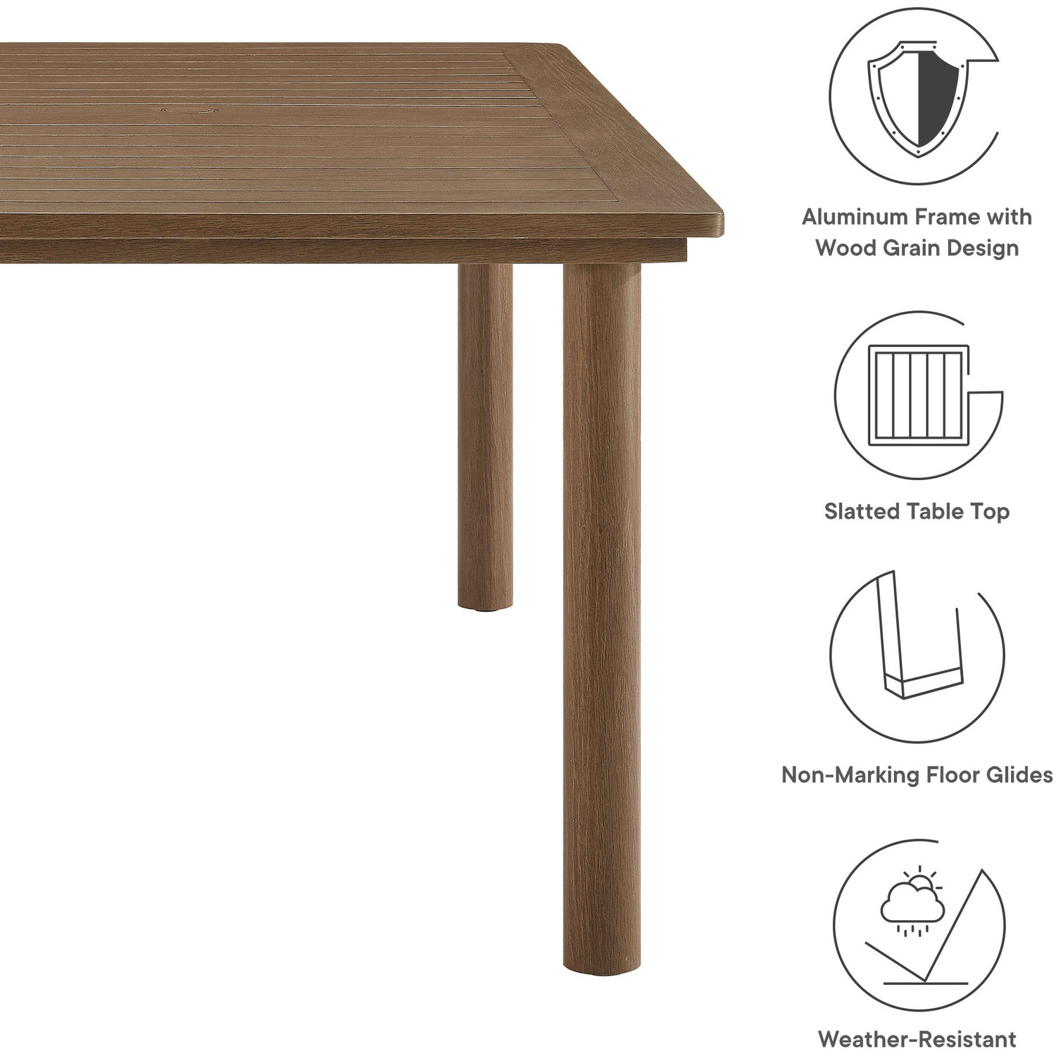 Transform your patio into a stylish retreat with the stunning Parkland outdoor aluminum dining table. This metal patio table seamlessly blends elegance and durability, featuring an aluminum frame with a chic wood grain design and a slatted tabletop. With its intricate pattern that adds a touch of sophistication to any outdoor setting, this rectangular dining table comfortably seats up to six, making it ideal for both casual and formal gatherings. Designed to withstand the elements, the Parkland all-weather modern patio table is equipped with an umbrella hole and is made to remain in pristine condition through all seasons. Enjoy immediate comfort and convenience as this outdoor aluminum dining table features simple assembly. This patio dining table for 6 comes with adjustable plastic floor glides to protect your flooring and offer stability, ready to elevate your outdoor dining experience.Rectangular Dining Table