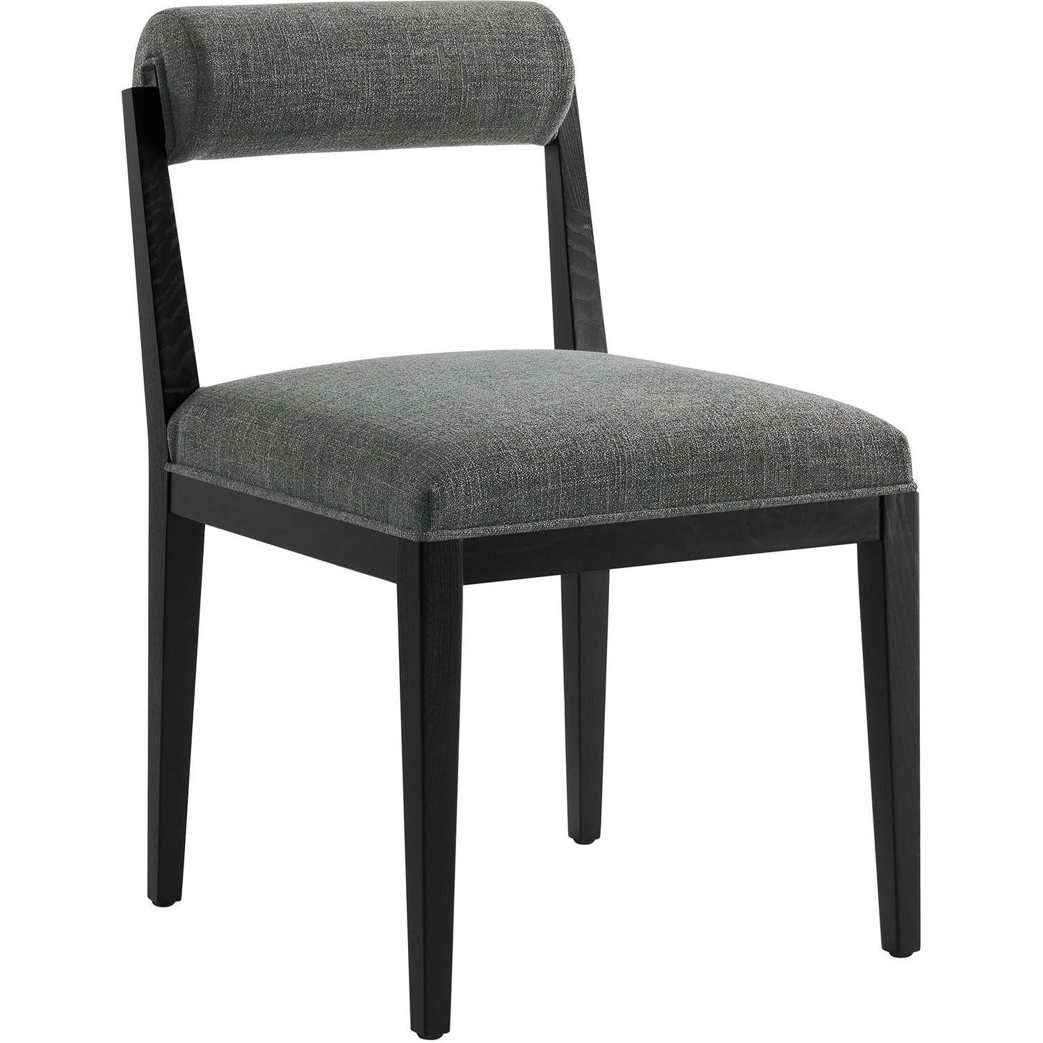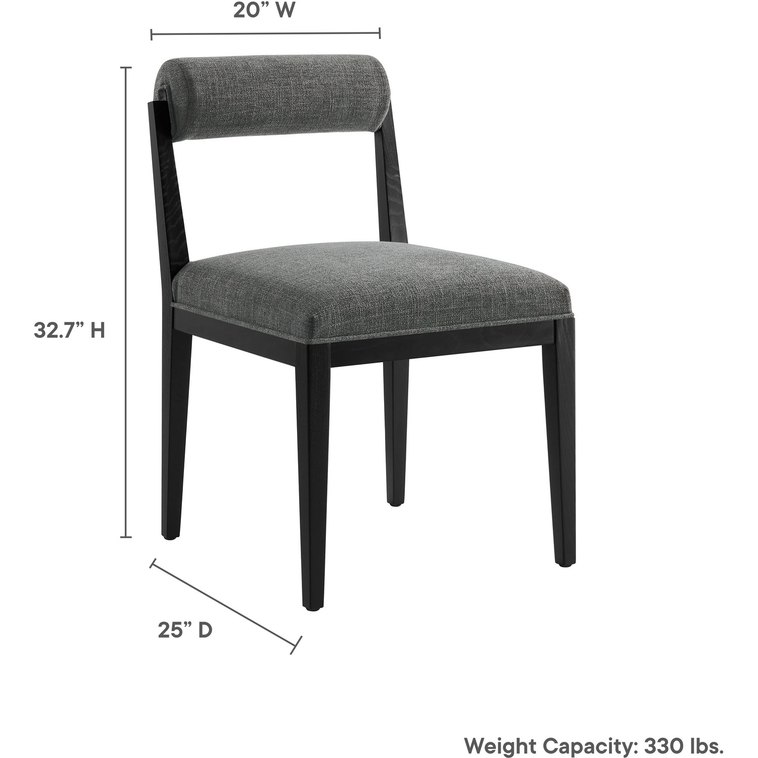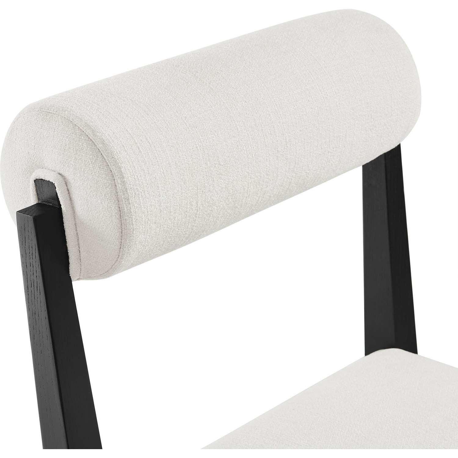 Bring the Kai Side Dining Chair into your home, a piece where bold, modern design meets plush, inviting textures. Combining chic fabric and wood, the Kai Armless Chair features sharp, angular lines and a minimalist design. It's an ideal fit for various spaces, whether as a side chair in the dining room, an accent chair in the living room, or as a stylish and comfortable kitchen chair. Built on an ash wood frame and legs, this farmhouse dining chair showcases a unique rolled backrest upholstered in premium fabric. This distinctive design element not only adds visual interest but also offers a soft, inviting texture that contrasts with the sleek lines of the wood accent chair's frame. The fixed cushion seat of this contemporary dining chair provides just the right amount of firmness for long meals and conversations. Equipped with non-marking foot pins to protect your floors, the Kai Fabric Dining Chair requires no assembly and is ready to use straight out of the box. Weight Capacity: 330 lbs.Ash Wood Frame and Legs