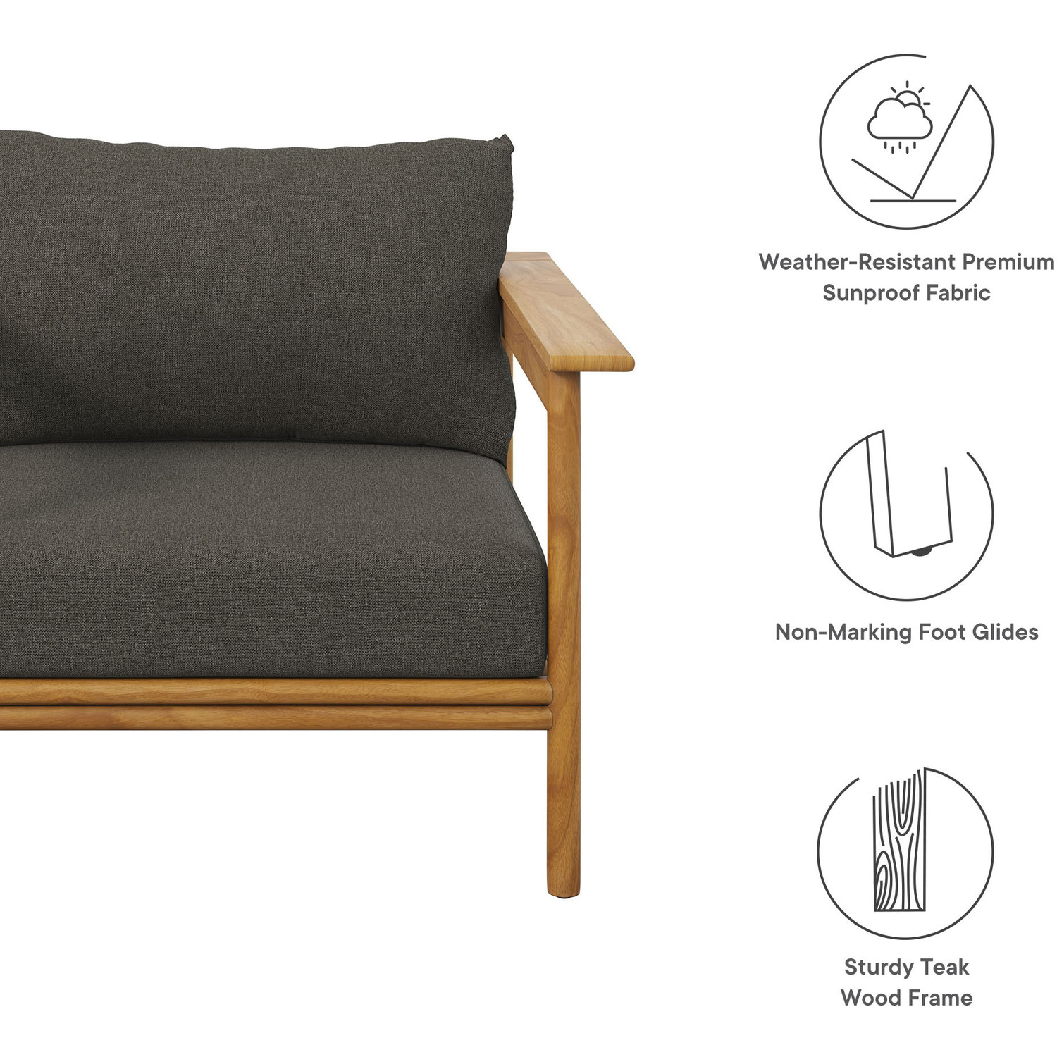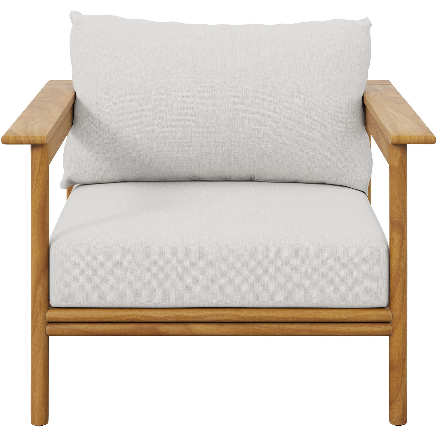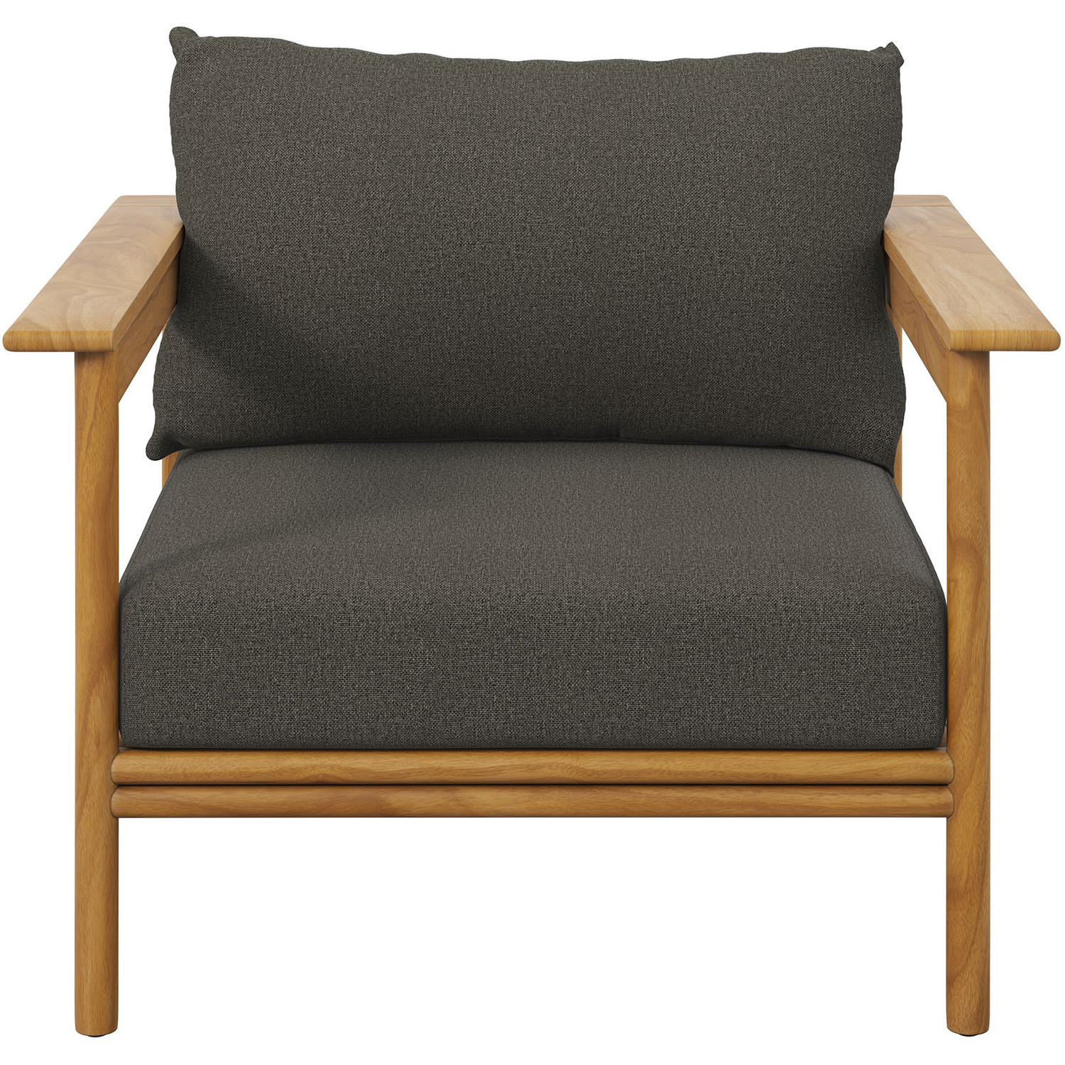 Enjoy the flexibility and charm of the Wren Teak Wood Armchair, designed for a variety of outdoor settings. This beautifully crafted single outdoor chair features a teak wood frame renowned for its all-weather qualities and timeless charm. The plush, removable cushions, wrapped in premium Sunproof fabric, offer superior comfort and excellent resistance to the elements, keeping this fabric patio armchair attractive season after season. With plastic floor glides to protect your surfaces and make repositioning easy, this outdoor accent chair is as practical as it is stylish. Use it on its own as a backyard chair, a balcony lounge chair or pair it with other pieces from the Wren teak patio furniture collection to instantly enhance your outdoor setup. Assembly Required. Single Patio Chair Weight Capacity: 800 lbs.Solid Teak Wood