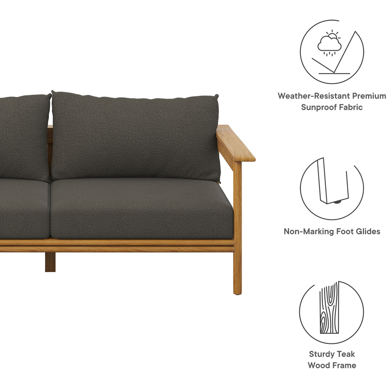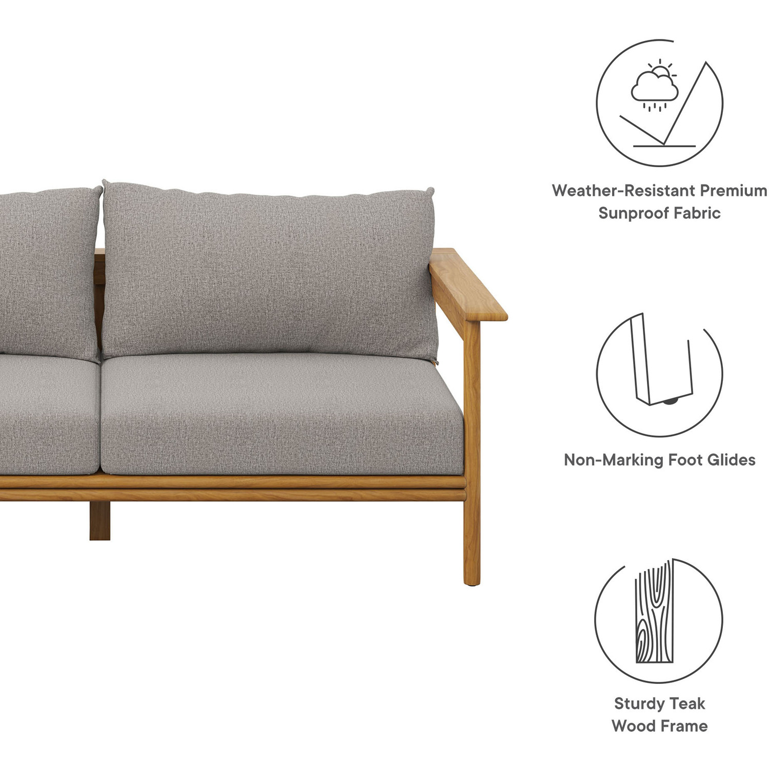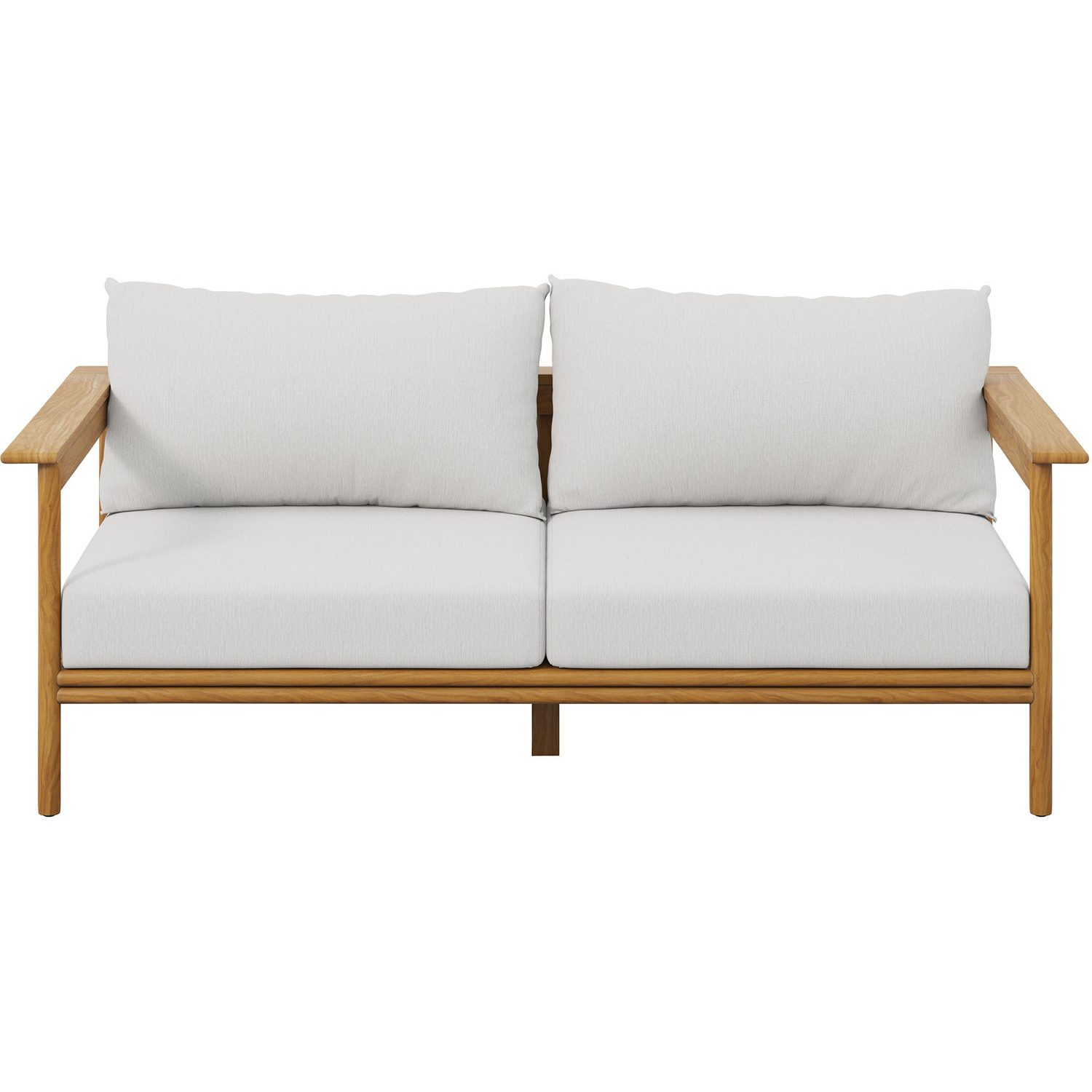 Enjoy the flexibility and charm of the Wren Teak Wood Outdoor Sofa, designed for a variety of outdoor settings. This beautifully crafted 2 seater patio couch features a teak wood frame renowned for its all-weather qualities and timeless charm. The plush, removable cushions, wrapped in premium Sunproof fabric, offer superior comfort and excellent resistance to the elements, keeping this patio sofa attractive season after season. With plastic floor glides to protect your surfaces and make repositioning easy, this outdoor sofa couch is as practical as it is stylish. Use it on its own as a small balcony couch or pair it with other pieces from the Wren teak patio furniture collection to instantly enhance your outdoor setup. Assembly Required. Outside Couch Weight Capacity: 800 lbs.Solid Teak Wood