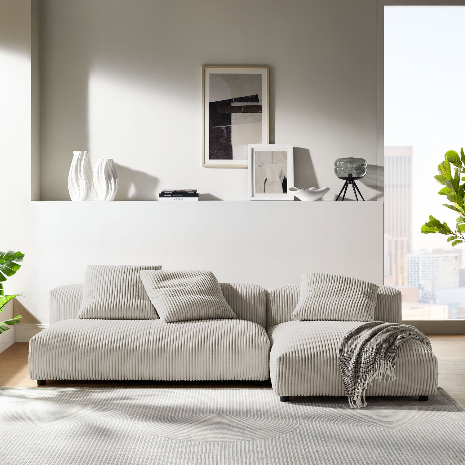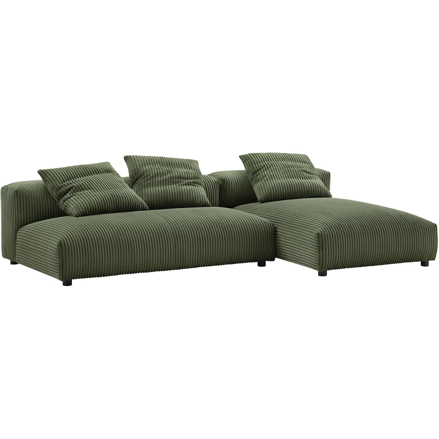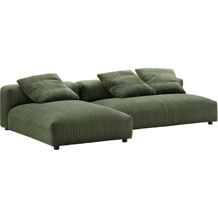 Revel in ultimate comfort and modern style with the Solace Modular Corduroy Modular Sofa with Chaise. This oversized corduroy sectional sofa with chaise is perfect for any living room, offering endless flexibility. Its modular furniture design allows you to change the arrangement to suit the needs of the moment or expand your seating by adding more pieces in the future. Featuring a sturdy frame, dense foam padding, and a sinuous spring support system, the Solace 3 Seater Couch grants a premium seating experience. The comfy corduroy upholstery adds a cozy, casual vibe, making this deep seat sofa a perfect addition to any living space or lounge area. Equipped with non-marking plastic glides and complementing accent pillows, this 2-piece sectional sofa set is both stylish and practical. With no assembly required, you can enjoy immediate relaxation with this L-shaped modular sectional sofa. Loveseat Weight Capacity: 800 lbs.,Chaise Weight Capacity: 500 lbs.Modular L-Shaped Sectional Sofa