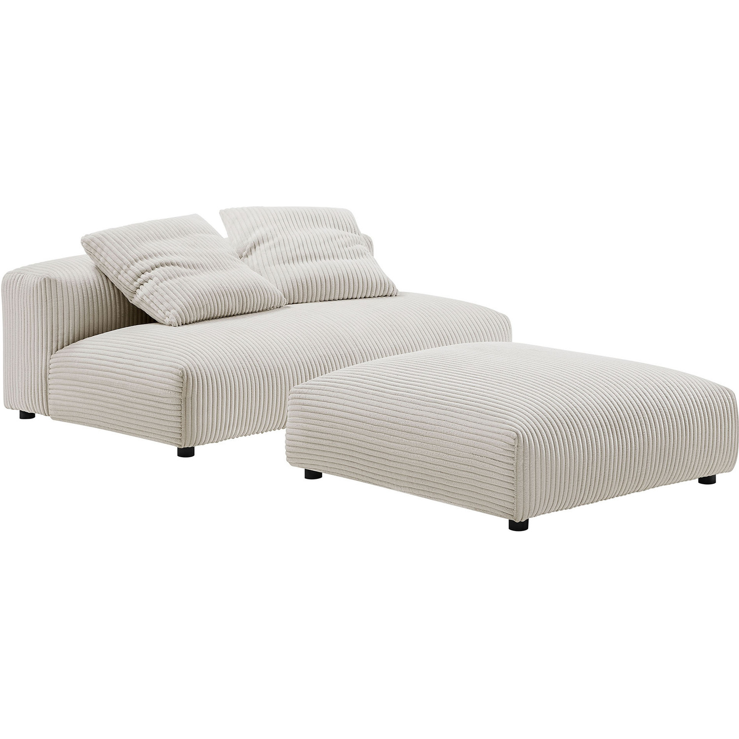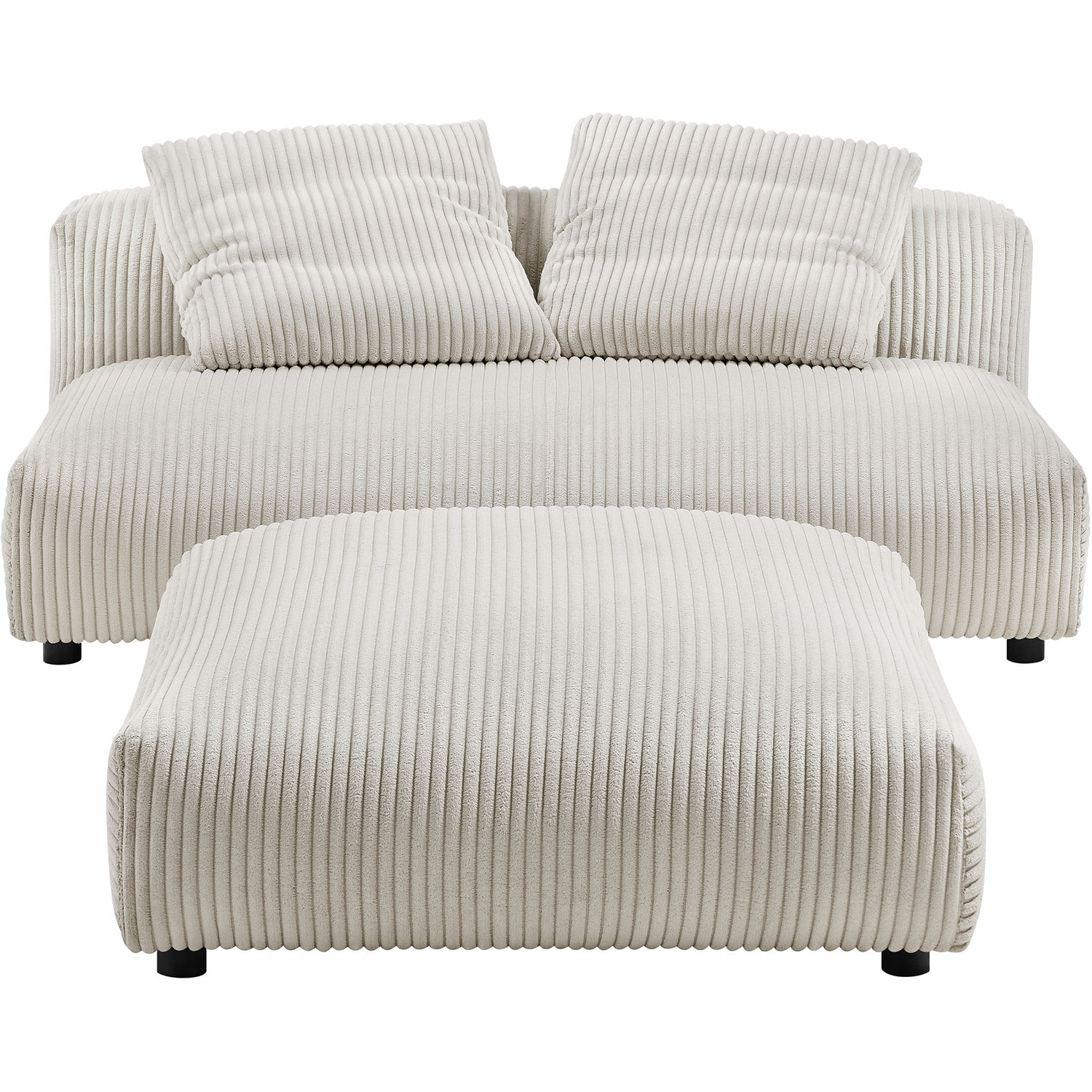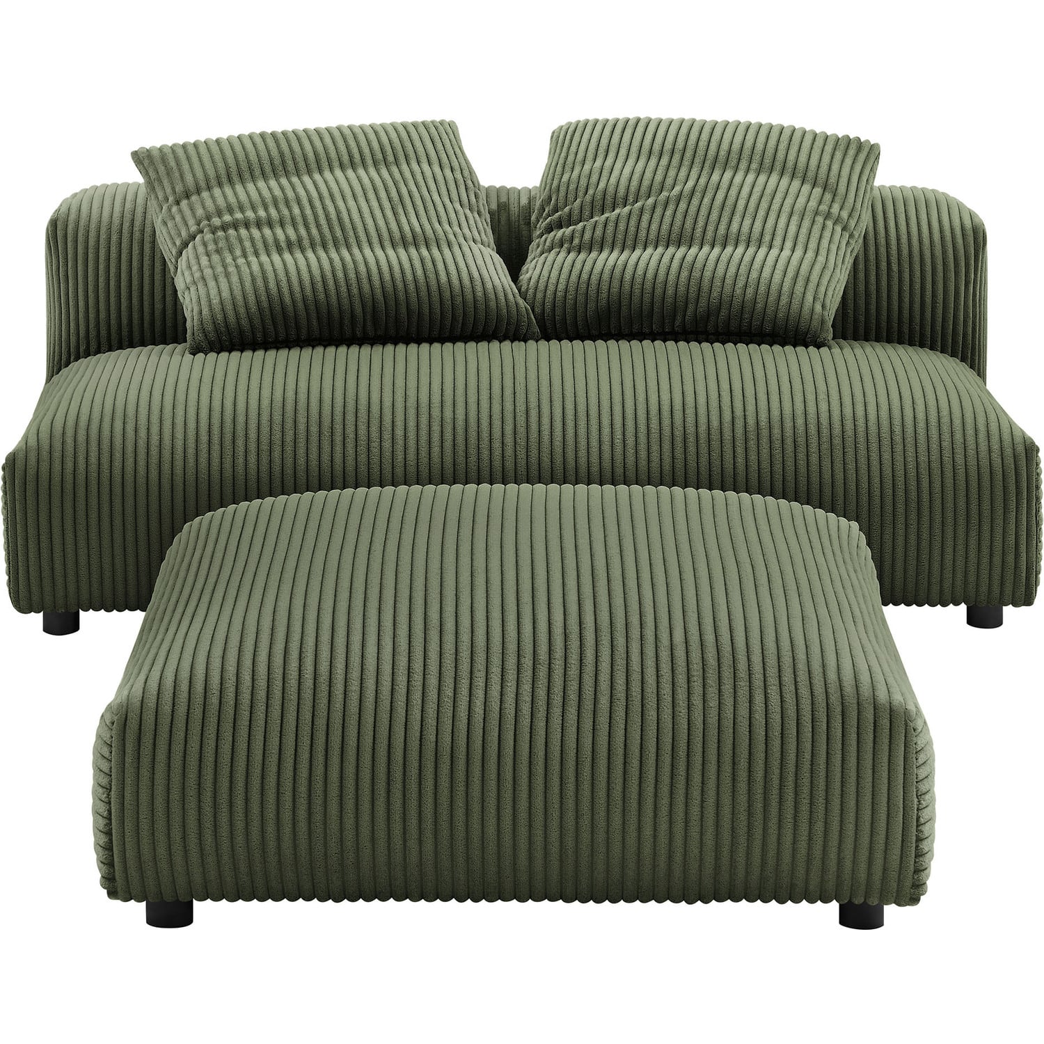 Revel in ultimate comfort and modern style with the Solace Modular Corduroy Armless Loveseat and Ottoman Set. This oversized corduroy armless loveseat with a matching ottoman is perfect for any living room, offering endless flexibility. Its modular furniture design allows you to change the arrangement to suit the needs of the moment or expand your seating by adding more pieces in the future. Featuring a sturdy frame, dense foam padding, and a sinuous spring support system, the Solace Small Sofa Couch grants a premium seating experience. The comfy corduroy upholstery adds a cozy, casual vibe, making this armless two-seater sofa a perfect addition to any living space or lounge area. Equipped with non-marking plastic glides and complementing accent pillows, this loveseat sectional is both stylish and practical. With no assembly required, you can enjoy immediate relaxation with this loveseat sofa with ottoman set. Loveseat Weight Capacity: 800 lbs., Ottoman Weight Capacity: 500 lbs.Modular Armless Loveseat and Ottoman Set