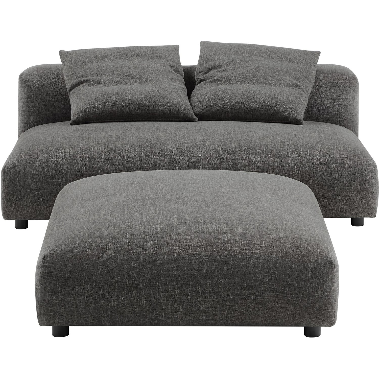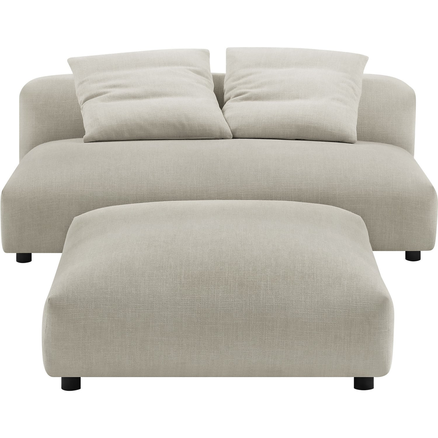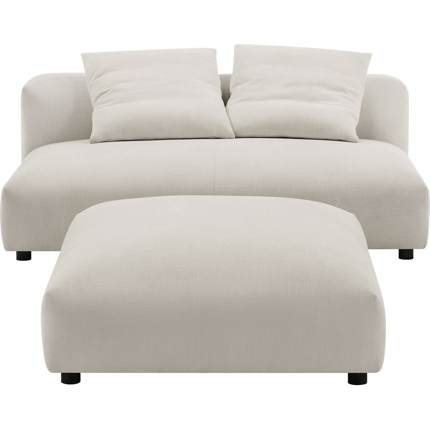 Revel in ultimate comfort and modern style with the Solace Modular Armless Loveseat and Ottoman Set. This oversized fabric armless loveseat with a matching ottoman is perfect for any living room, offering endless flexibility. Its modular furniture design allows you to change the arrangement to suit the needs of the moment or expand your seating by adding more pieces in the future. Featuring a sturdy frame, dense foam padding, and a sinuous spring support system, the Solace Small Sofa Couch grants a premium seating experience with it's soft textured woven fabric upholstery. The comfy upholstery adds a cozy, casual vibe, making this armless two-seater sofa a perfect addition to any living space or lounge area. Equipped with non-marking plastic glides and complementing accent pillows, this loveseat sectional is both stylish and practical. With no assembly required, you can enjoy immediate relaxation with this loveseat sofa with ottoman set. Loveseat Weight Capacity: 800 lbs., Ottoman Weight Capacity: 500 lbs.Modular Armless Loveseat and Ottoman Set