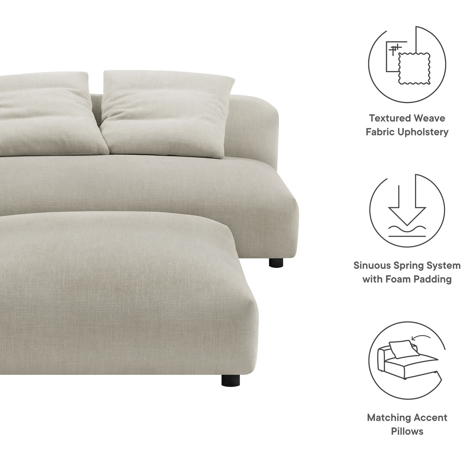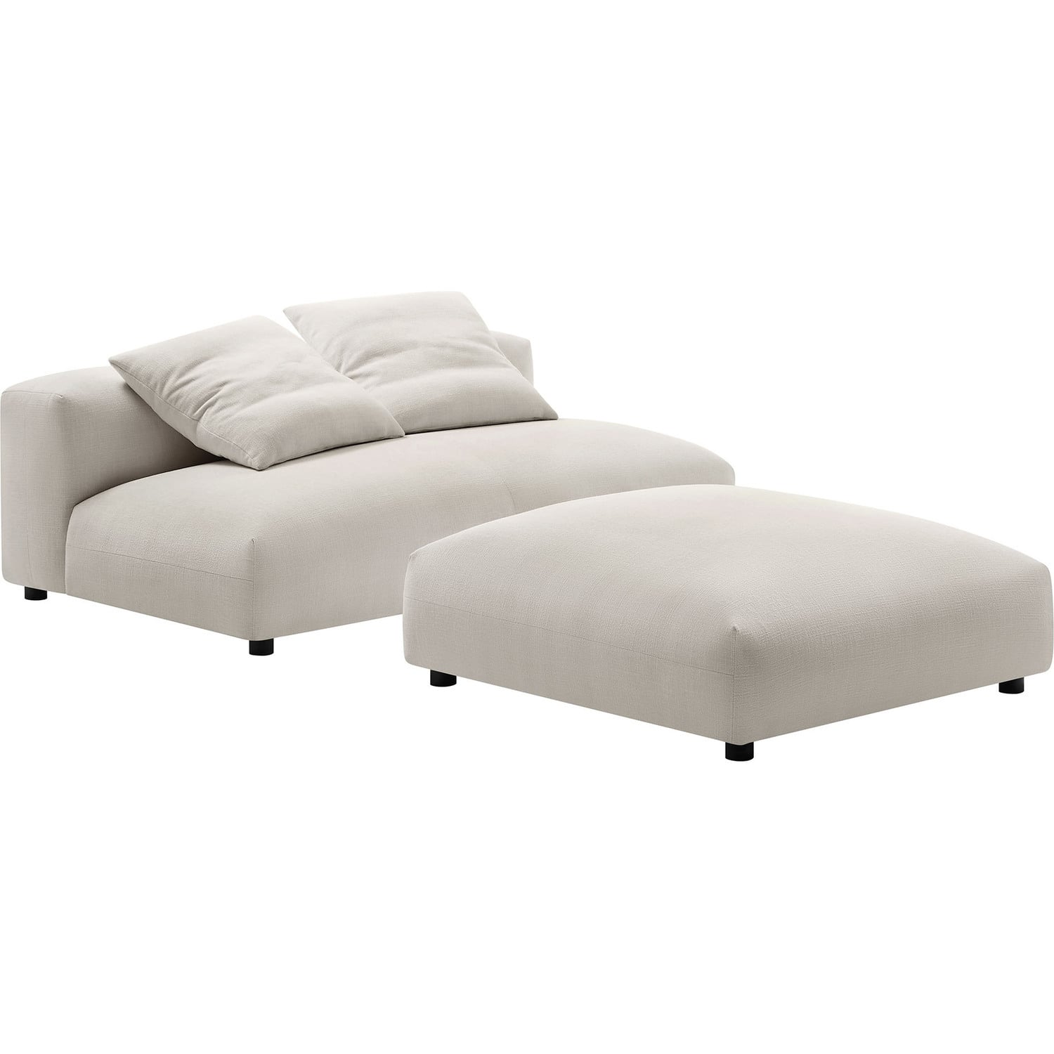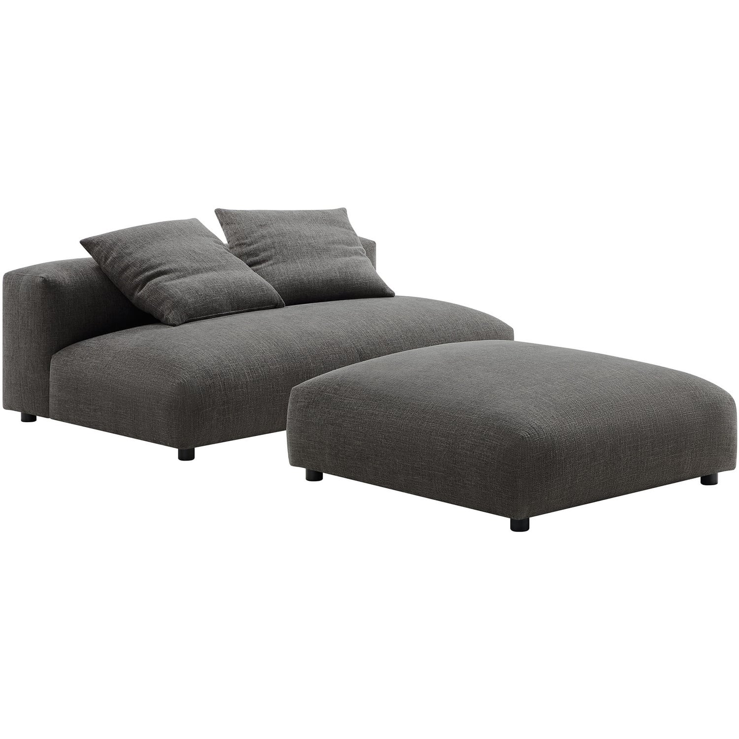 Revel in ultimate comfort and modern style with the Solace Modular Armless Loveseat and Ottoman Set. This oversized fabric armless loveseat with a matching ottoman is perfect for any living room, offering endless flexibility. Its modular furniture design allows you to change the arrangement to suit the needs of the moment or expand your seating by adding more pieces in the future. Featuring a sturdy frame, dense foam padding, and a sinuous spring support system, the Solace Small Sofa Couch grants a premium seating experience with it's soft textured woven fabric upholstery. The comfy upholstery adds a cozy, casual vibe, making this armless two-seater sofa a perfect addition to any living space or lounge area. Equipped with non-marking plastic glides and complementing accent pillows, this loveseat sectional is both stylish and practical. With no assembly required, you can enjoy immediate relaxation with this loveseat sofa with ottoman set. Loveseat Weight Capacity: 800 lbs., Ottoman Weight Capacity: 500 lbs.Modular Armless Loveseat and Ottoman Set
