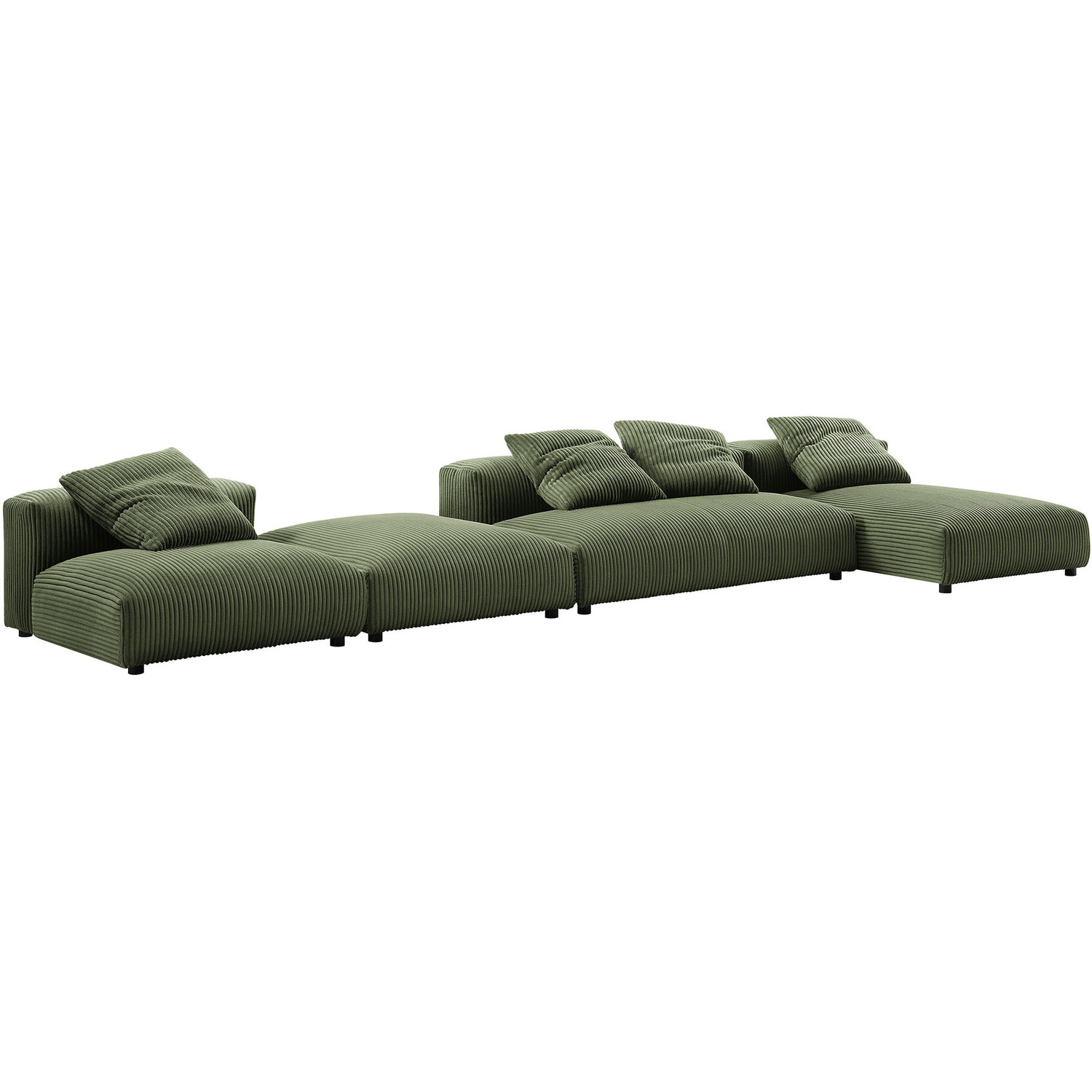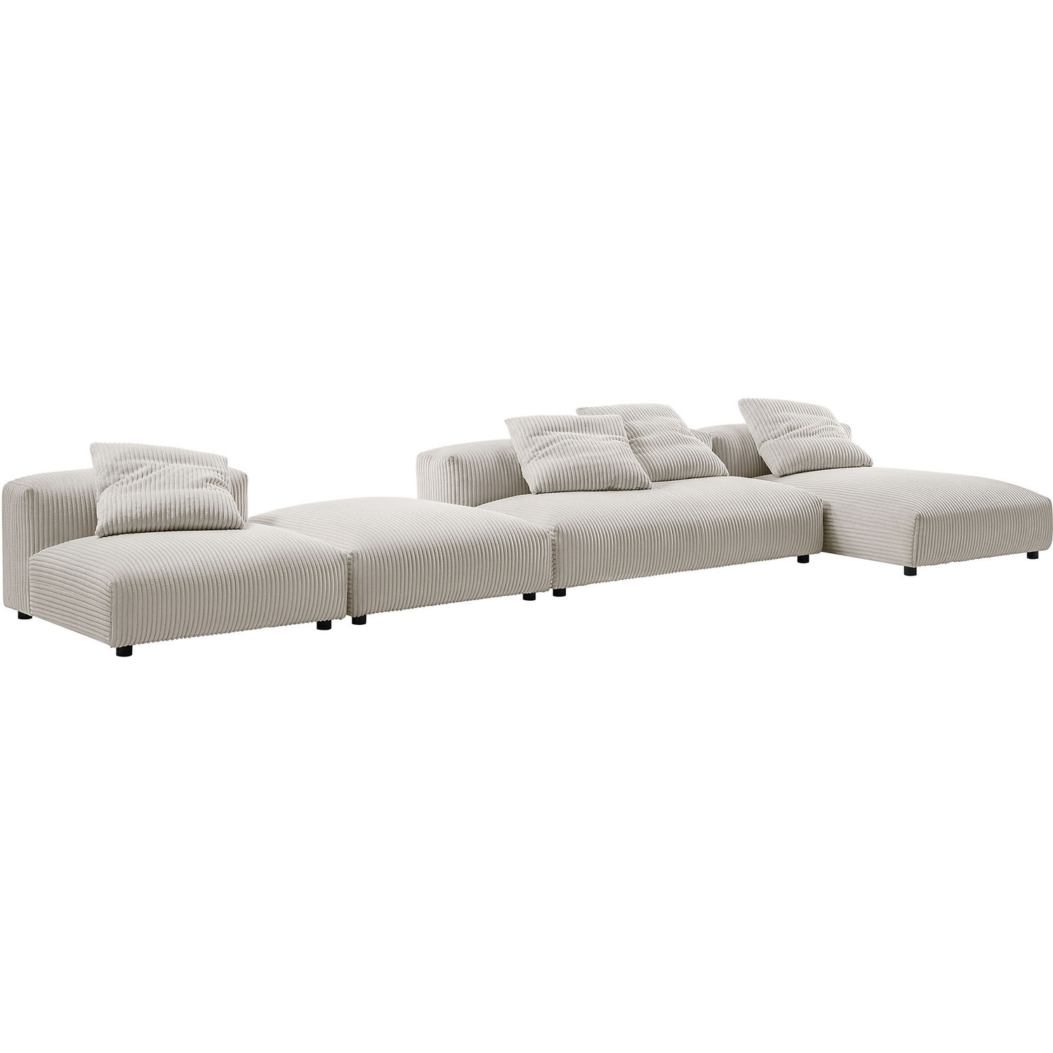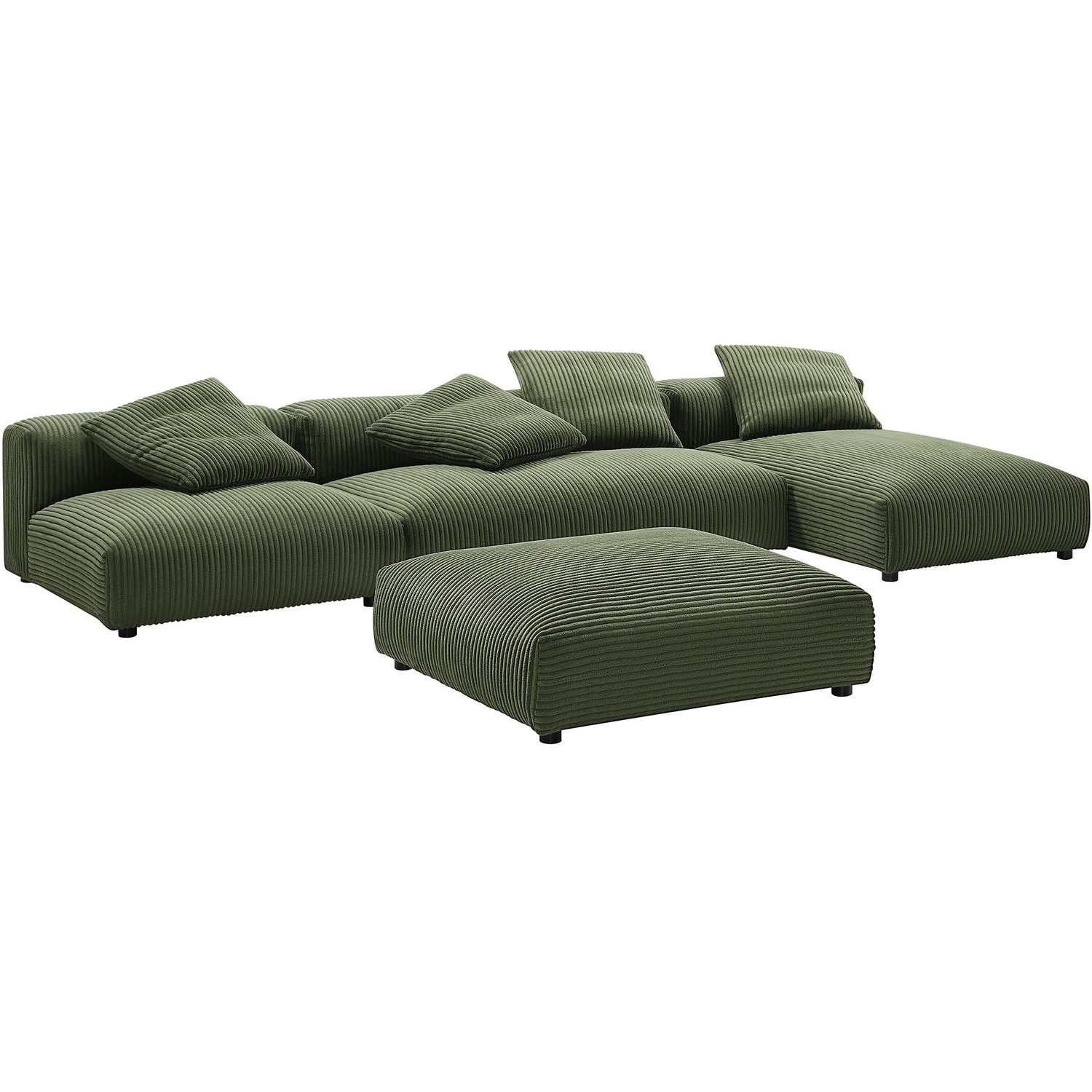 Revel in ultimate comfort and modern style with the Solace Modular Corduroy Sectional Sofa. This oversized corduroy sectional sofa is perfect for any living room, offering endless flexibility. Its modular furniture design allows you to change the arrangement to suit the needs of the moment or expand your seating by adding more pieces in the future. Featuring a sturdy frame, dense foam padding, and a sinuous spring support system, the Solace Large Sectional Sofa grants a premium seating experience. The comfy corduroy upholstery adds a cozy, casual vibe, making this deep sectional sofa a perfect addition to any living space or lounge area. Equipped with non-marking plastic glides and complementing accent pillows, this 4-piece sectional sofa set is both stylish and practical. With no assembly required, you can enjoy immediate relaxation with this L-shaped modular sectional sofa. Set Includes: 1 Armless Chair, 1 Armless Loveseat, 1 Armless Chaise, 1 OttomanModular L-Shaped Sectional Sofa