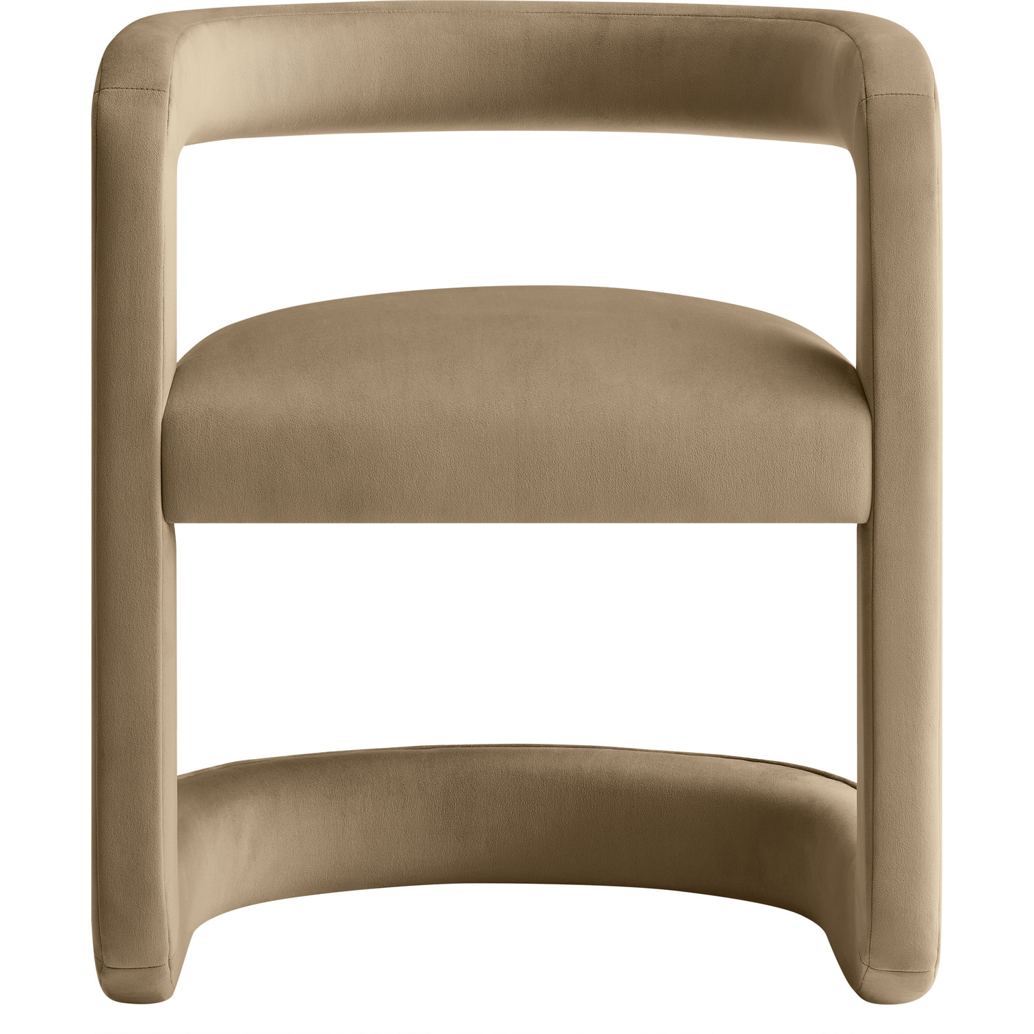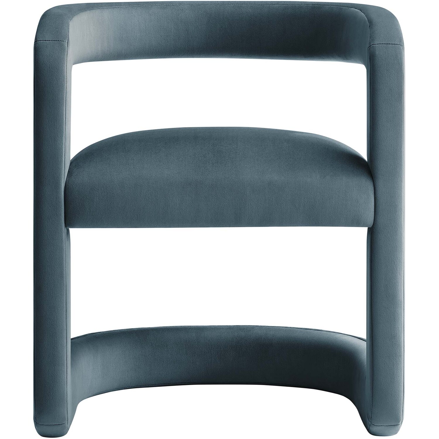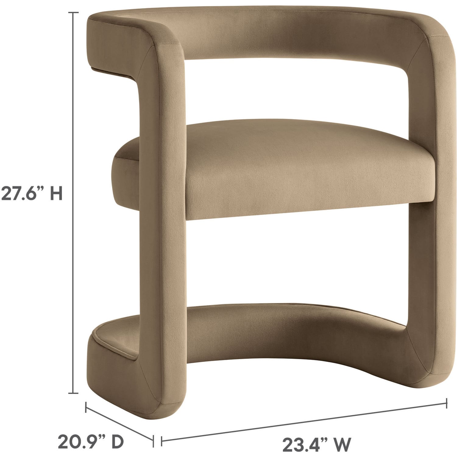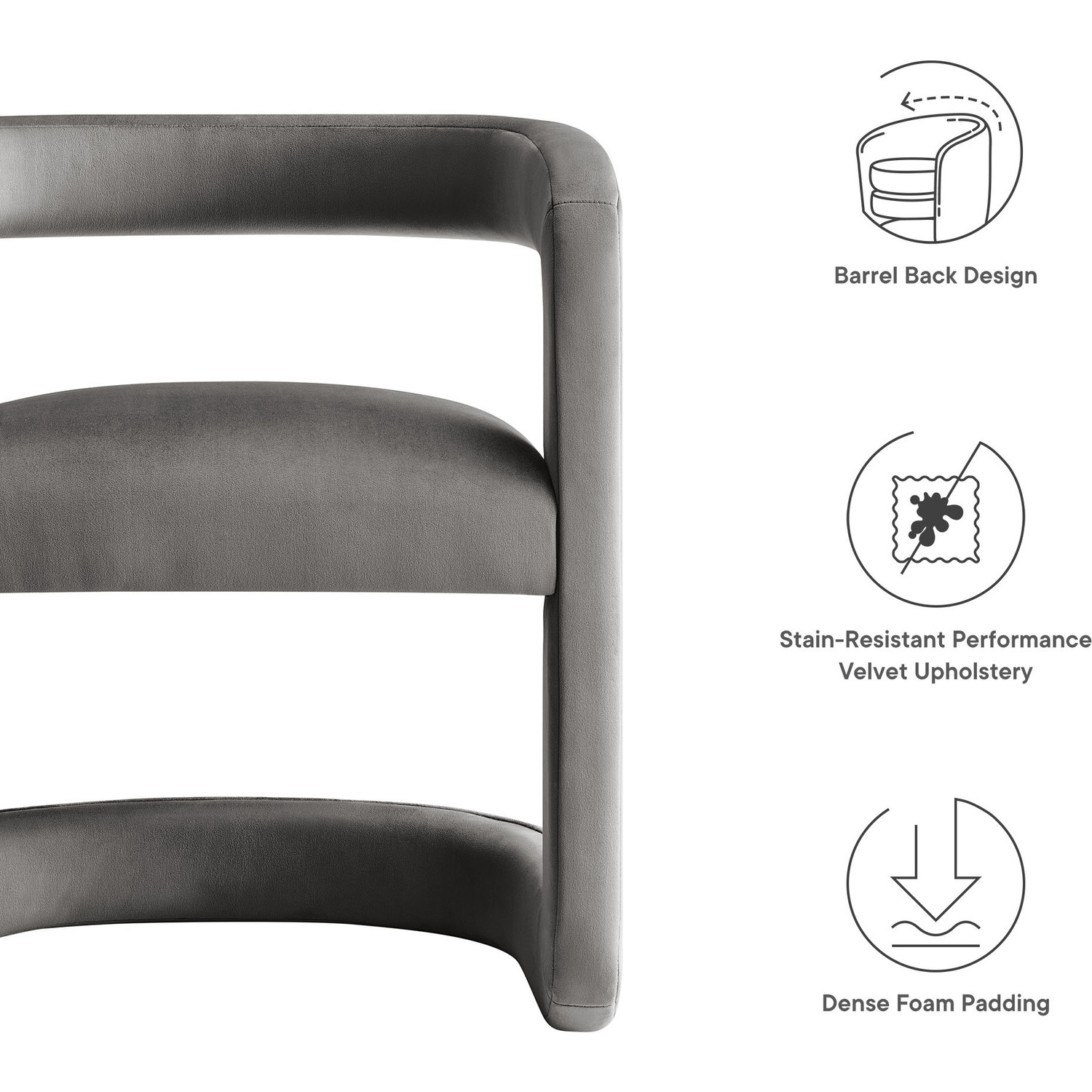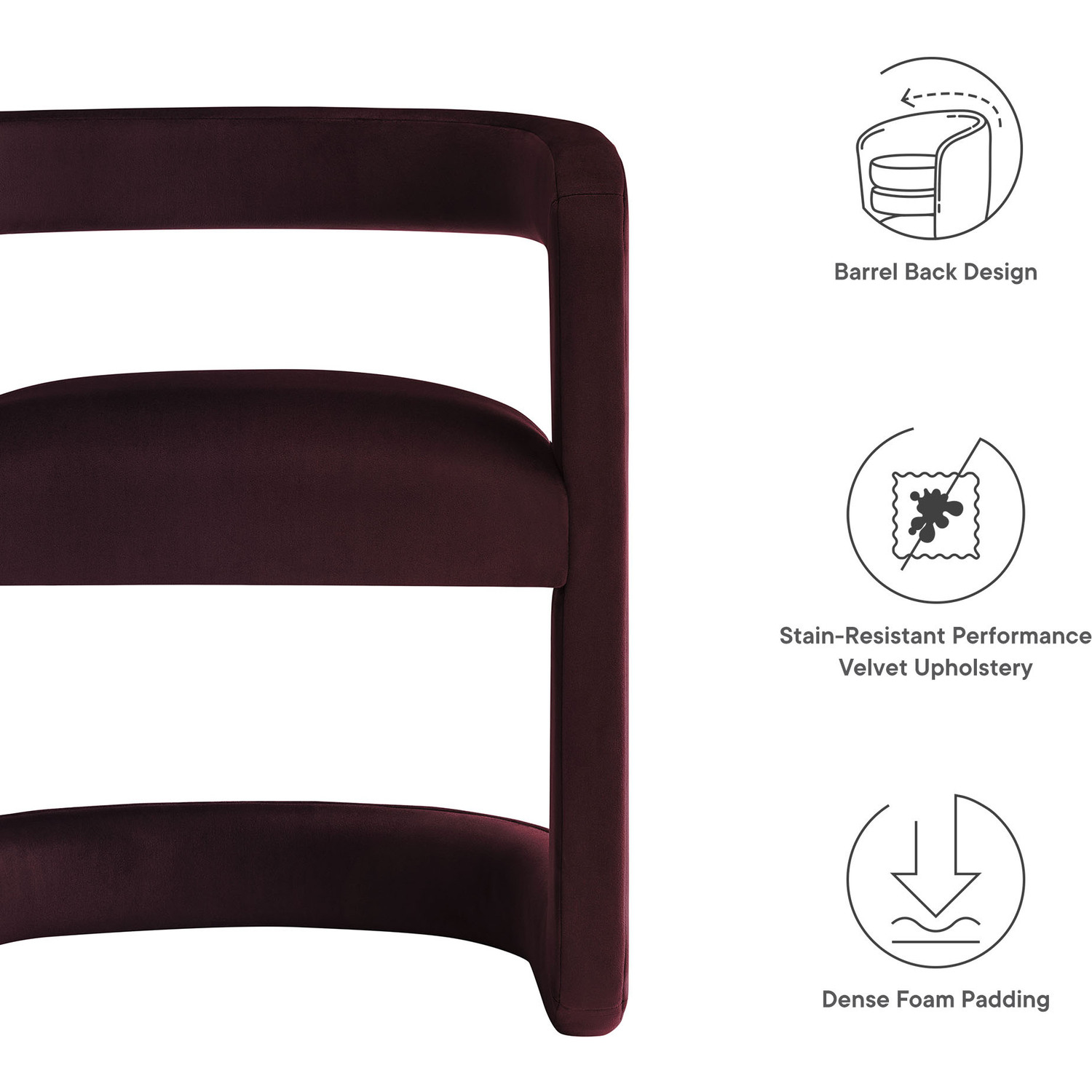 Lift the ambiance of your decor with the Winslow Performance Velvet Barrel Dining Chair. Its distinctive curved frame and supportive, open backrest create a unique silhouette that is visually pleasing and inviting. Crafted with a solid plywood foundation and completely draped in stain-resistant performance velvet upholstery, this kitchen and dining room chair offers a comforting, contoured seat, becoming a standout feature in any room. The fixed seat and cushion, padded in dense foam, add to the stylish allure, promising a sleek, uninterrupted line. Set upon non-marking plastic foot pins, the Winslow Velvet Dining Chair protects your flooring from scuffs and scratches. This barrel back dining chair is not just a seat but a beautiful addition to your home decor, perfect for adorning your dining room as a velvet dining chair, serving as a cozy reading nook chair, or adding an air of modern sophistication as a vanity chair. The Winslow Open Back Velvet Dining Chair invites you to sit down and stay awhile. Weight Capacity: 331 lbs.Barrel Dining Chair