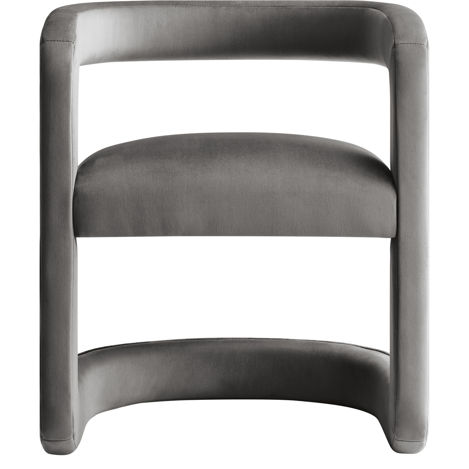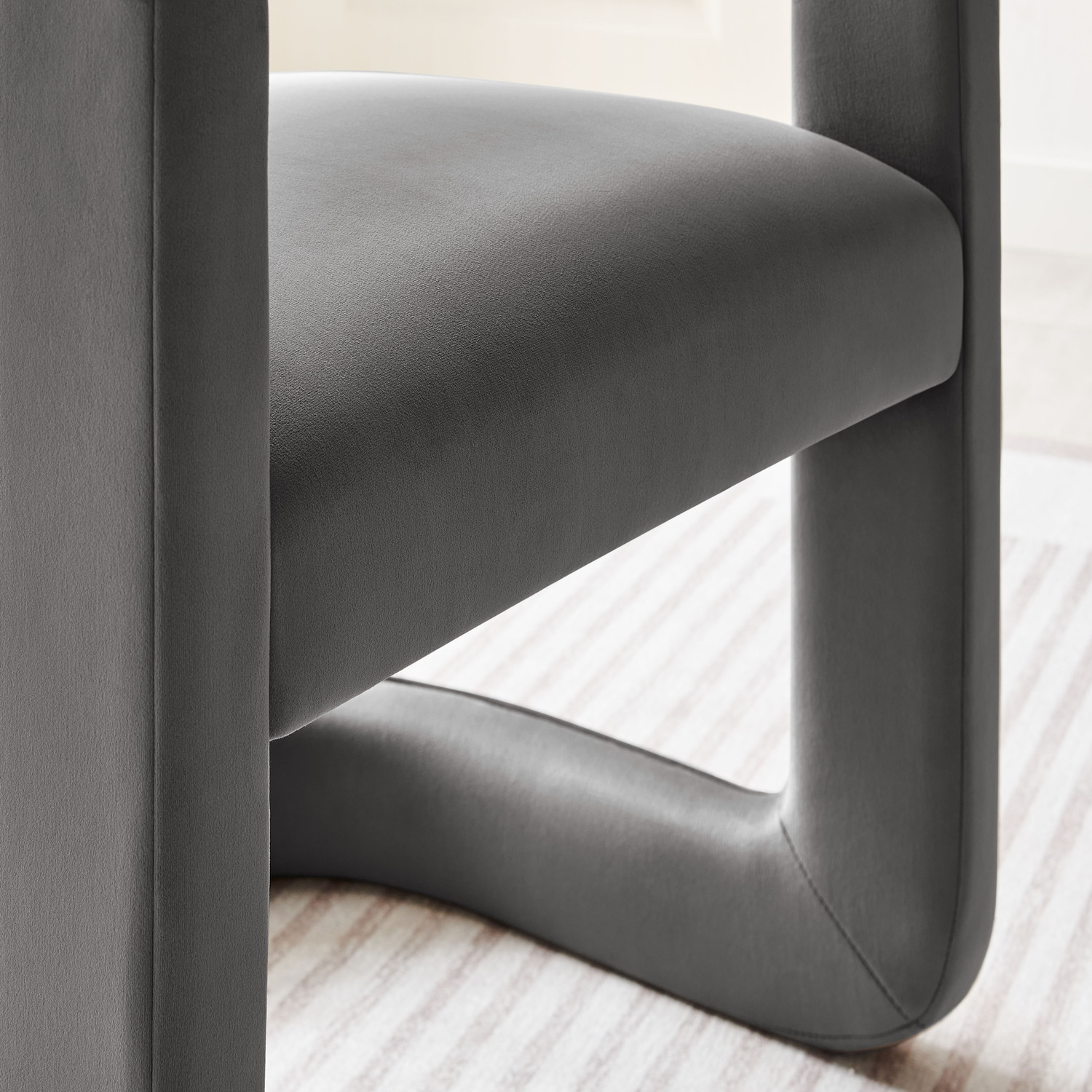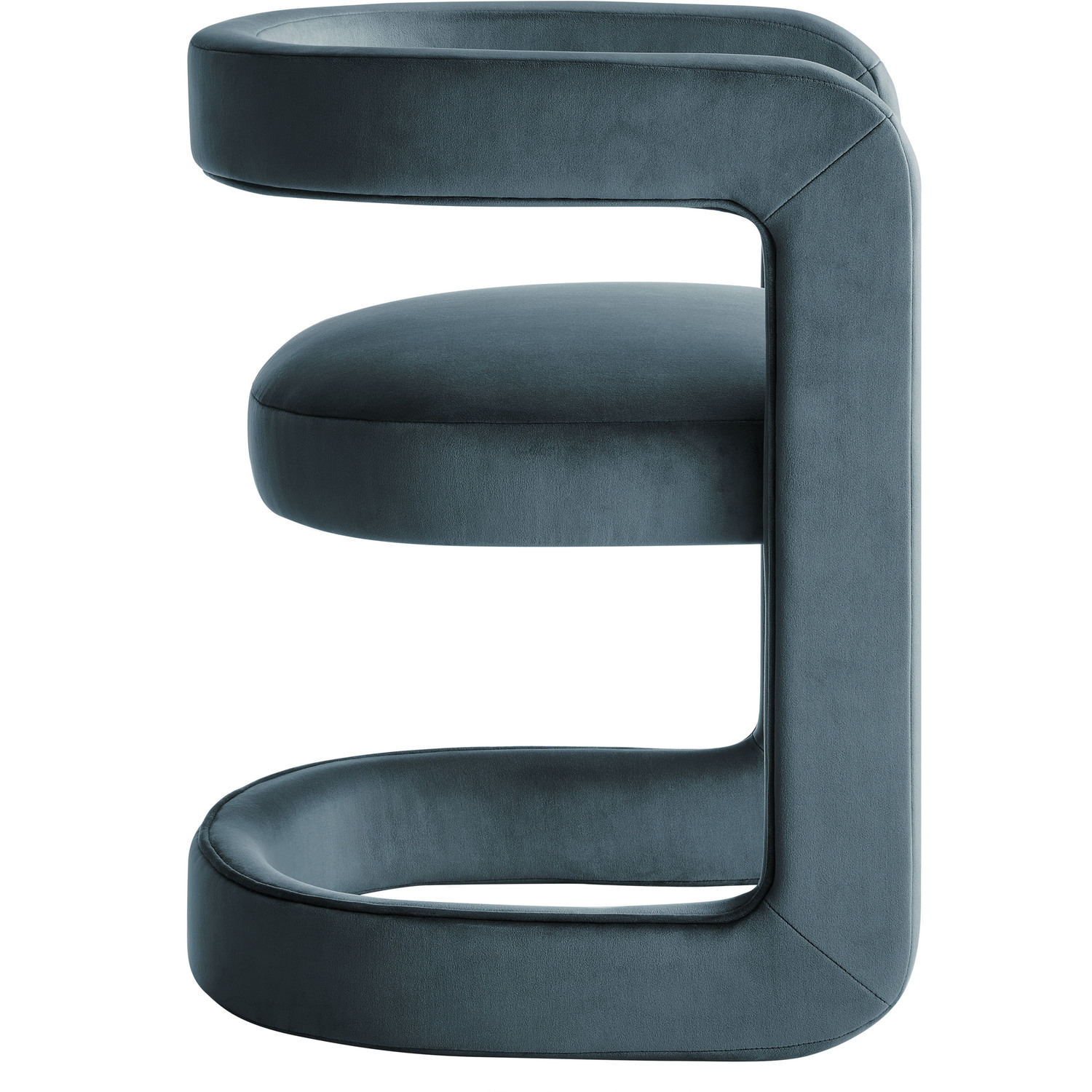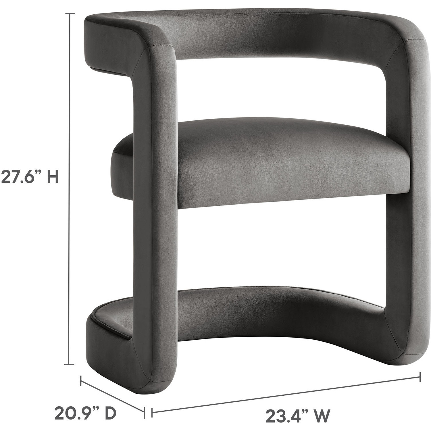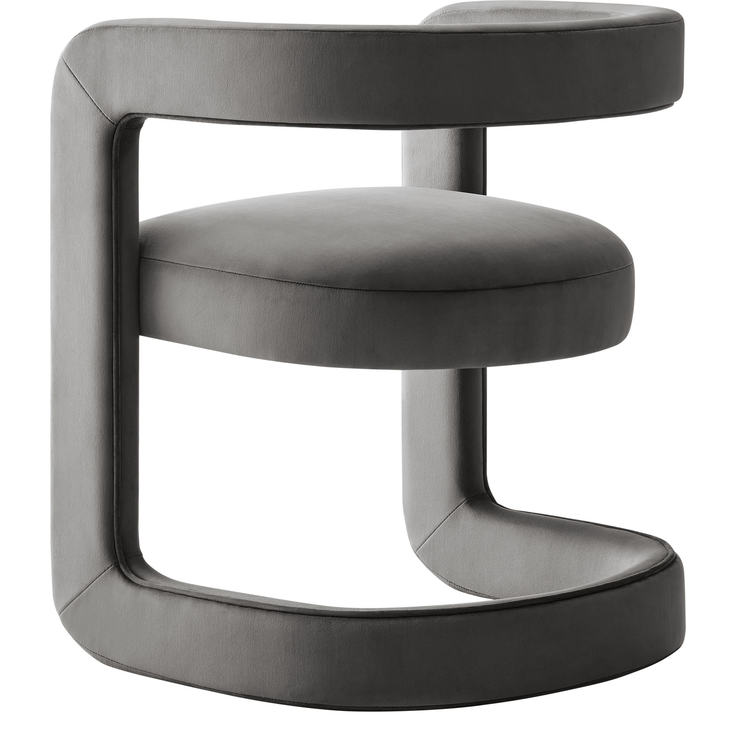 Lift the ambiance of your decor with the Winslow Performance Velvet Barrel Dining Chair. Its distinctive curved frame and supportive, open backrest create a unique silhouette that is visually pleasing and inviting. Crafted with a solid plywood foundation and completely draped in stain-resistant performance velvet upholstery, this kitchen and dining room chair offers a comforting, contoured seat, becoming a standout feature in any room. The fixed seat and cushion, padded in dense foam, add to the stylish allure, promising a sleek, uninterrupted line. Set upon non-marking plastic foot pins, the Winslow Velvet Dining Chair protects your flooring from scuffs and scratches. This barrel back dining chair is not just a seat but a beautiful addition to your home decor, perfect for adorning your dining room as a velvet dining chair, serving as a cozy reading nook chair, or adding an air of modern sophistication as a vanity chair. The Winslow Open Back Velvet Dining Chair invites you to sit down and stay awhile. Weight Capacity: 331 lbs.Barrel Dining Chair