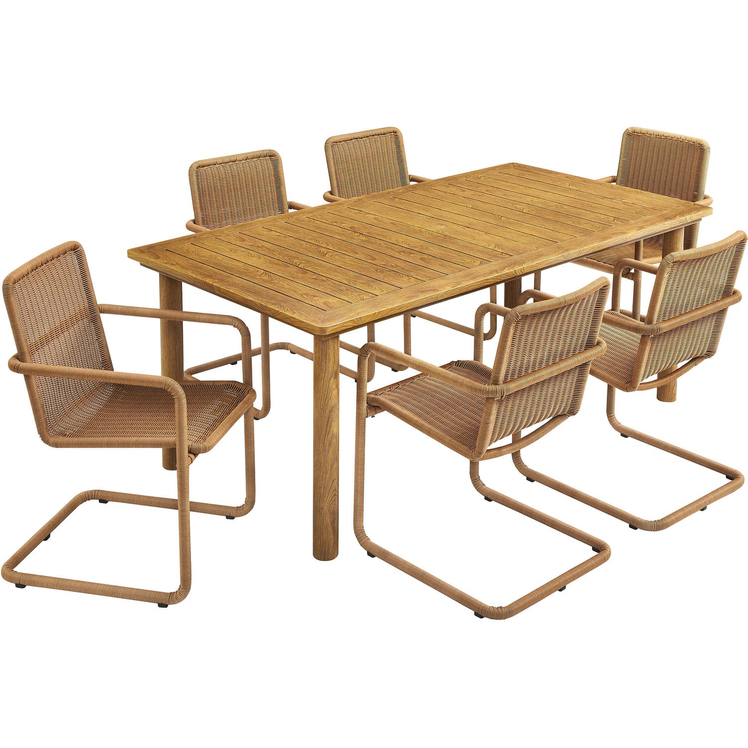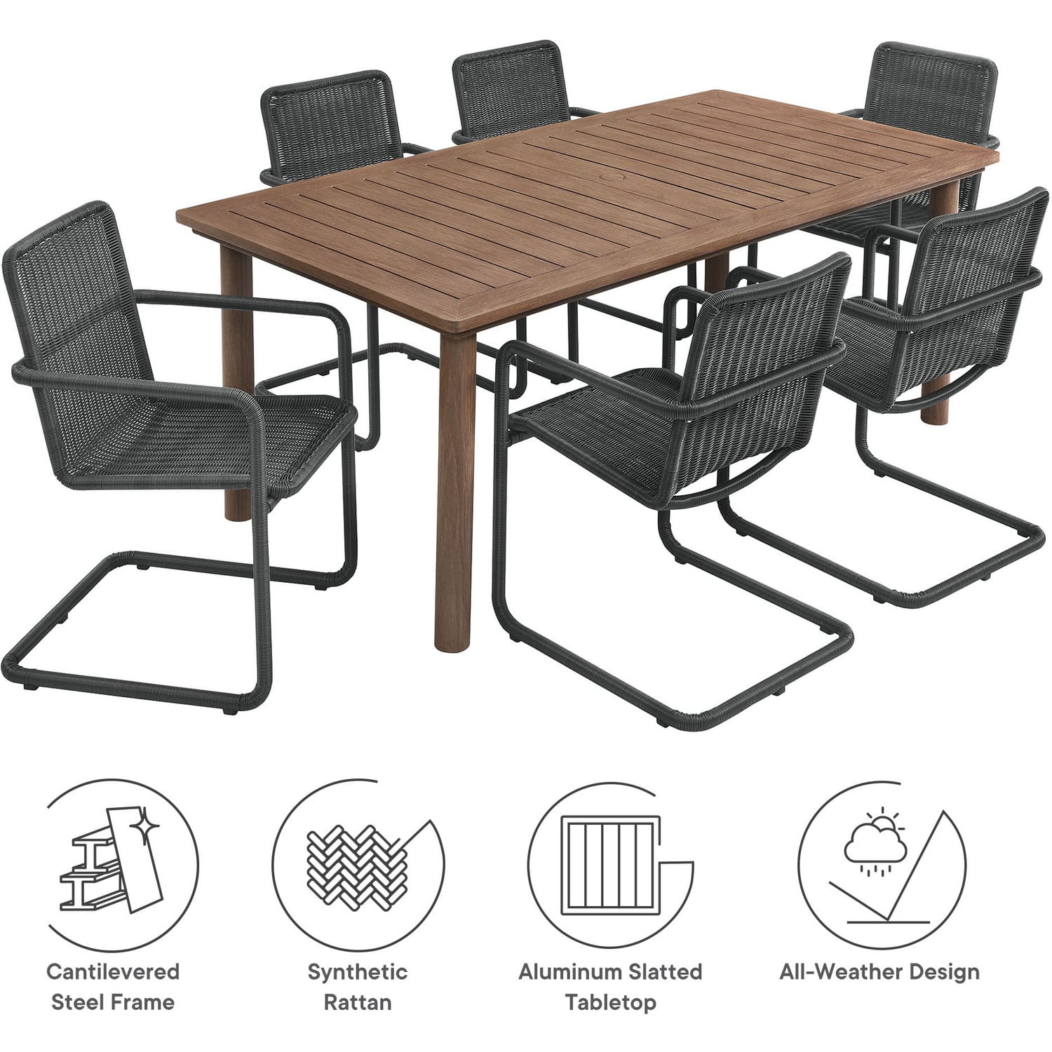 The Abacus 7-Piece Patio Dining Set brings both style and durability to your outdoor space. This 6 person outdoor dining set includes a stunning 76" aluminum dining table and six rattan dining chairs. The rectangular dining table features a slatted tabletop with a chic wood grain design and is equipped with an umbrella hole, perfect for adding shade on sunny days (umbrella not included). Each outdoor dining chair of this outside patio set is crafted with a continuous steel frame, where the armrests, seat, and legs flow together in a cantilever chair design, then wrapped in synthetic rattan, creating a natural, earthy look. The tight, horizontal basket weave of the rattan patio chairs adds texture and depth, while the aluminum frame of the dining table enhances durability. Both materials contribute to the 7 piece patio dining set's weather-resistant and UV-protected features, making it ideal for year-round use. Featuring plastic foot pads to prevent floor damage, this aluminum dining set with rattan dining armchairs is an ideal addition to your patio, deck, or garden.76” Rectangular Aluminum Dining Table