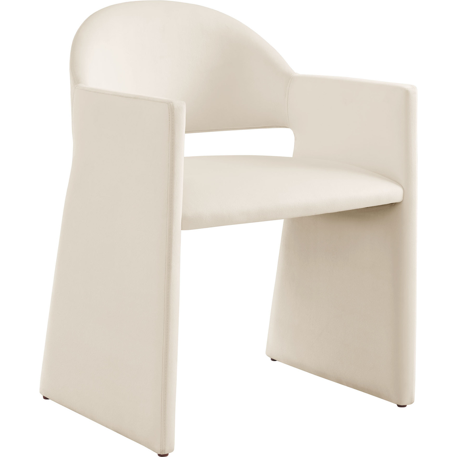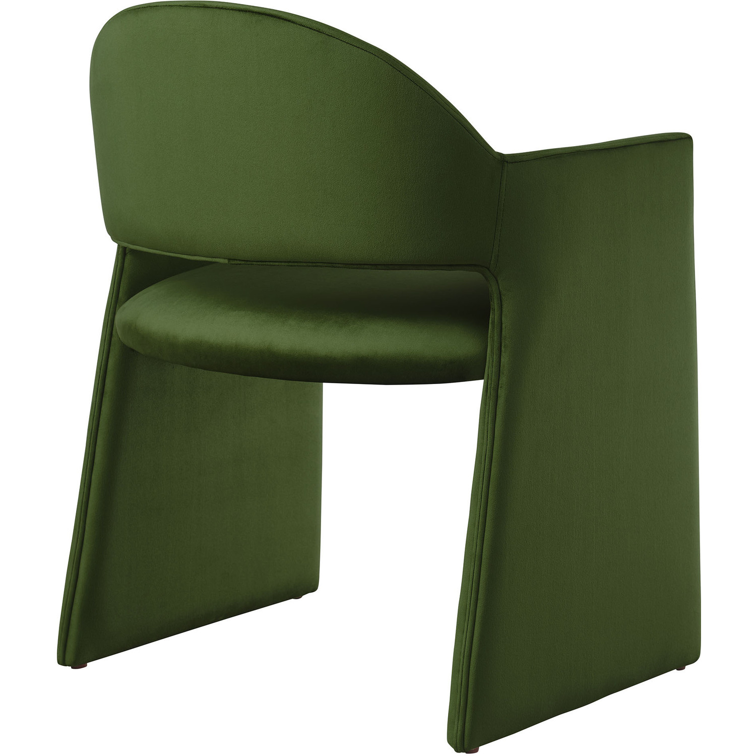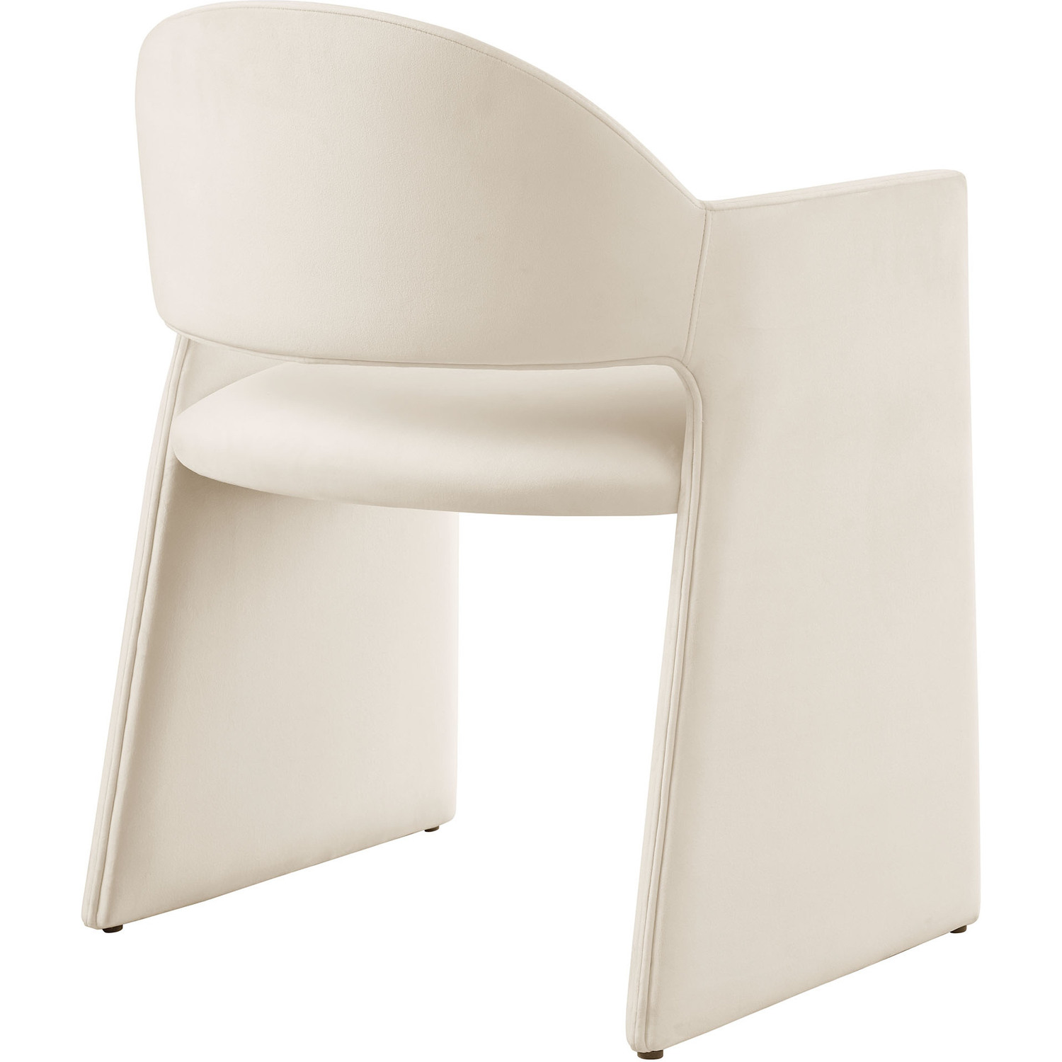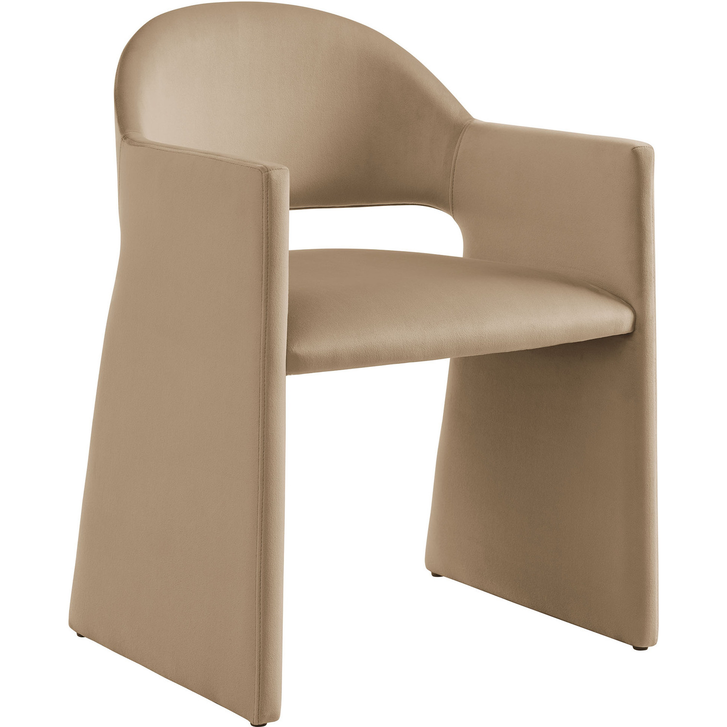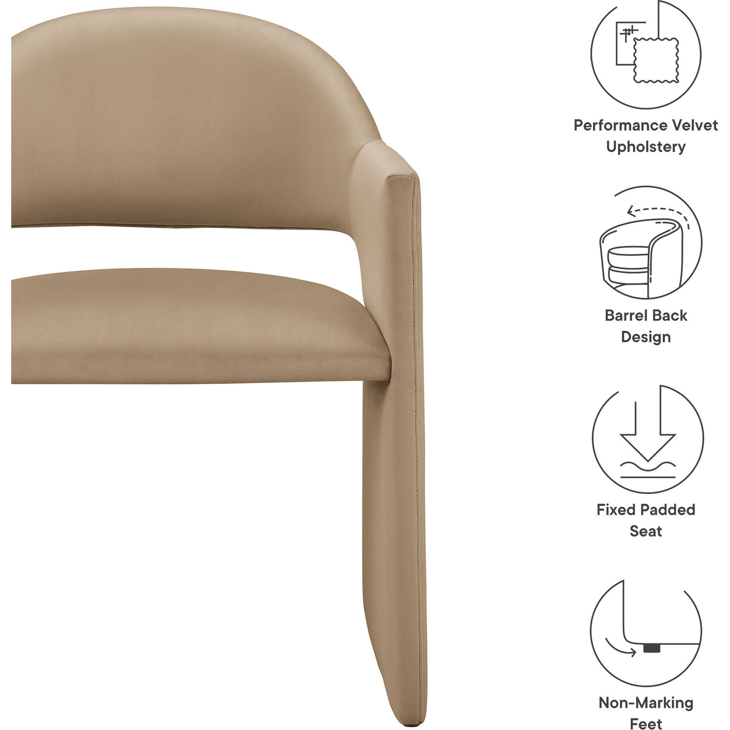 The Talia Performance Velvet Dining Chair is a stunning example of modern design, blending clean lines with luxurious comfort. Whether as a stylish living room accent chair, a statement piece in the dining area, or even a chic office accent chair, the Talia Barrel Back Dining Chair offers both timeless style and versatility. Built on a sturdy bentwood frame, this dining chair with arms is fully upholstered in soft, stain-resistant performance velvet for a premium feel. Its elegantly curved backrest flows seamlessly into wide, angular armrests that extend down to the floor, creating a sculptural look that's perfect for minimalist and contemporary spaces. The open-back design of this curved dining chair provides a light and airy feel, while the generously padded seat ensures lasting comfort. Completing the design, floor-protecting foot pins are included to prevent scratches, making it easy to move and enjoy without worry. The Talia Velvet Armchair arrives fully assembled, ready to elevate your space. Weight Capacity: 300 lbs.Stain-Resistant Performance Velvet