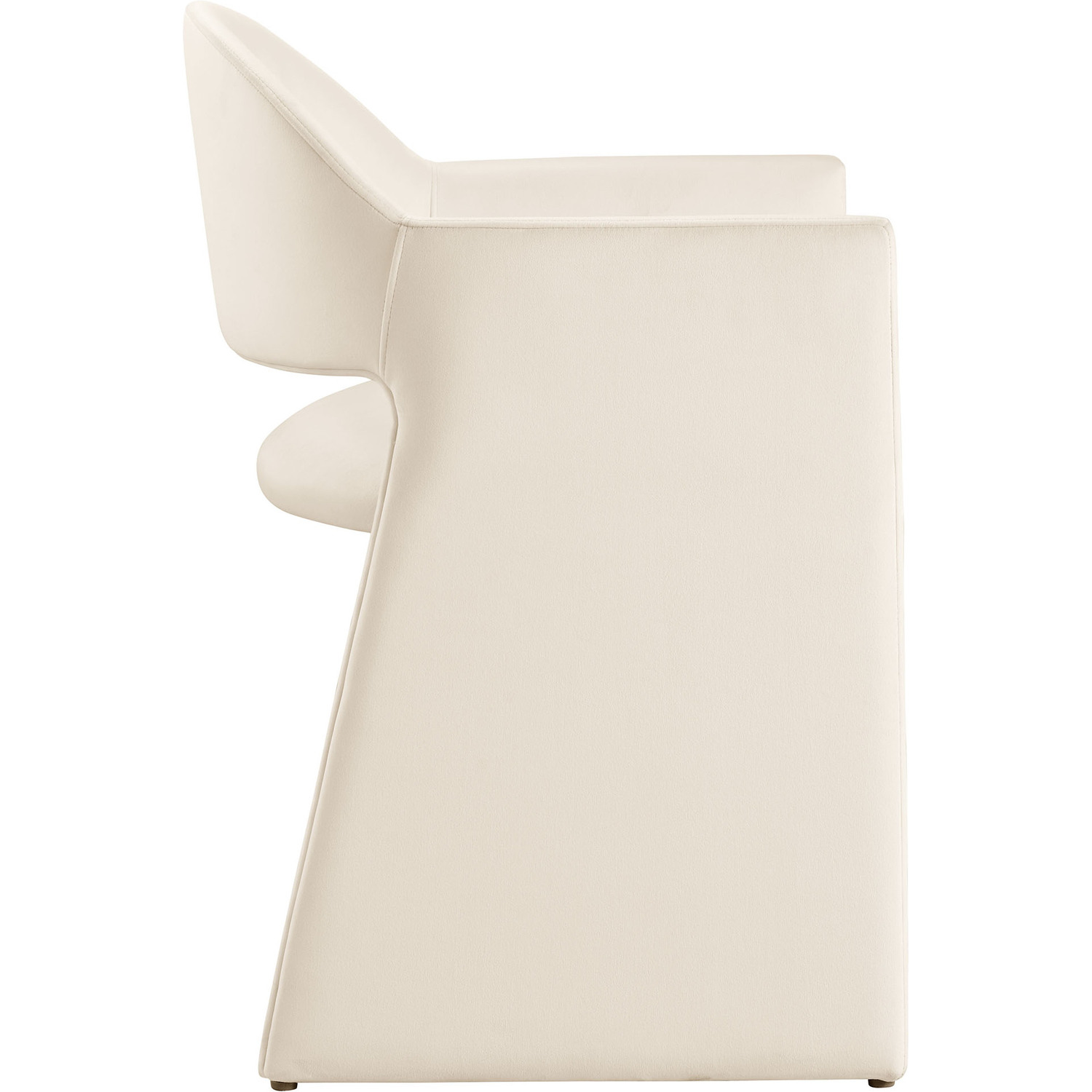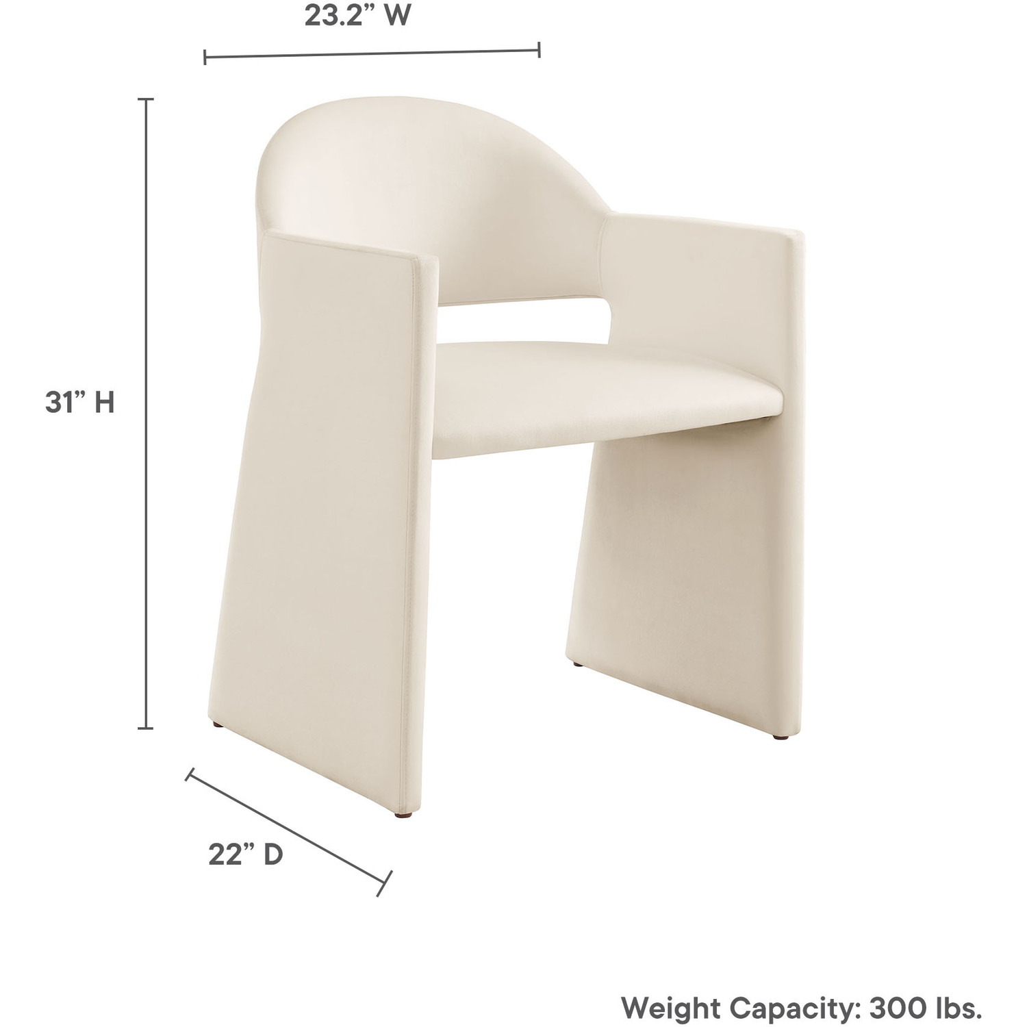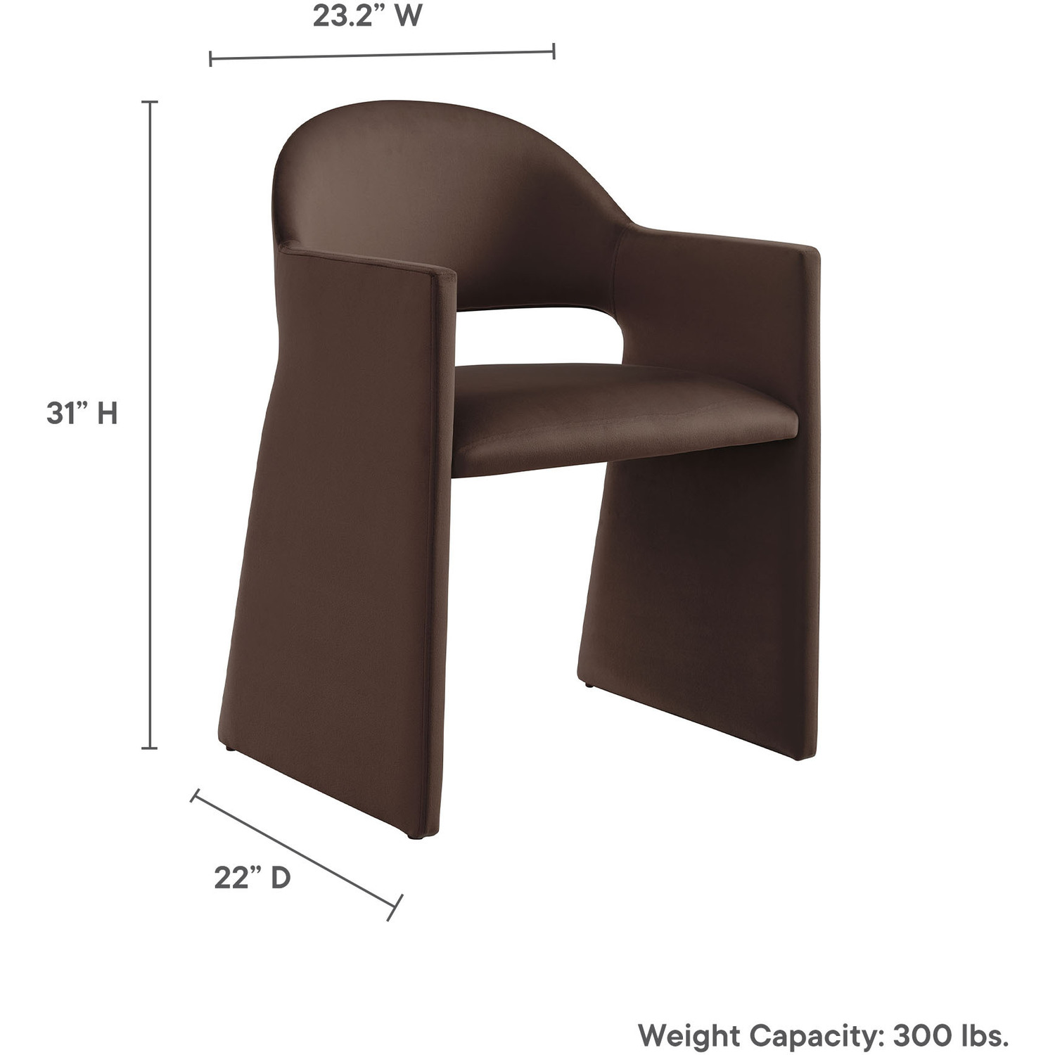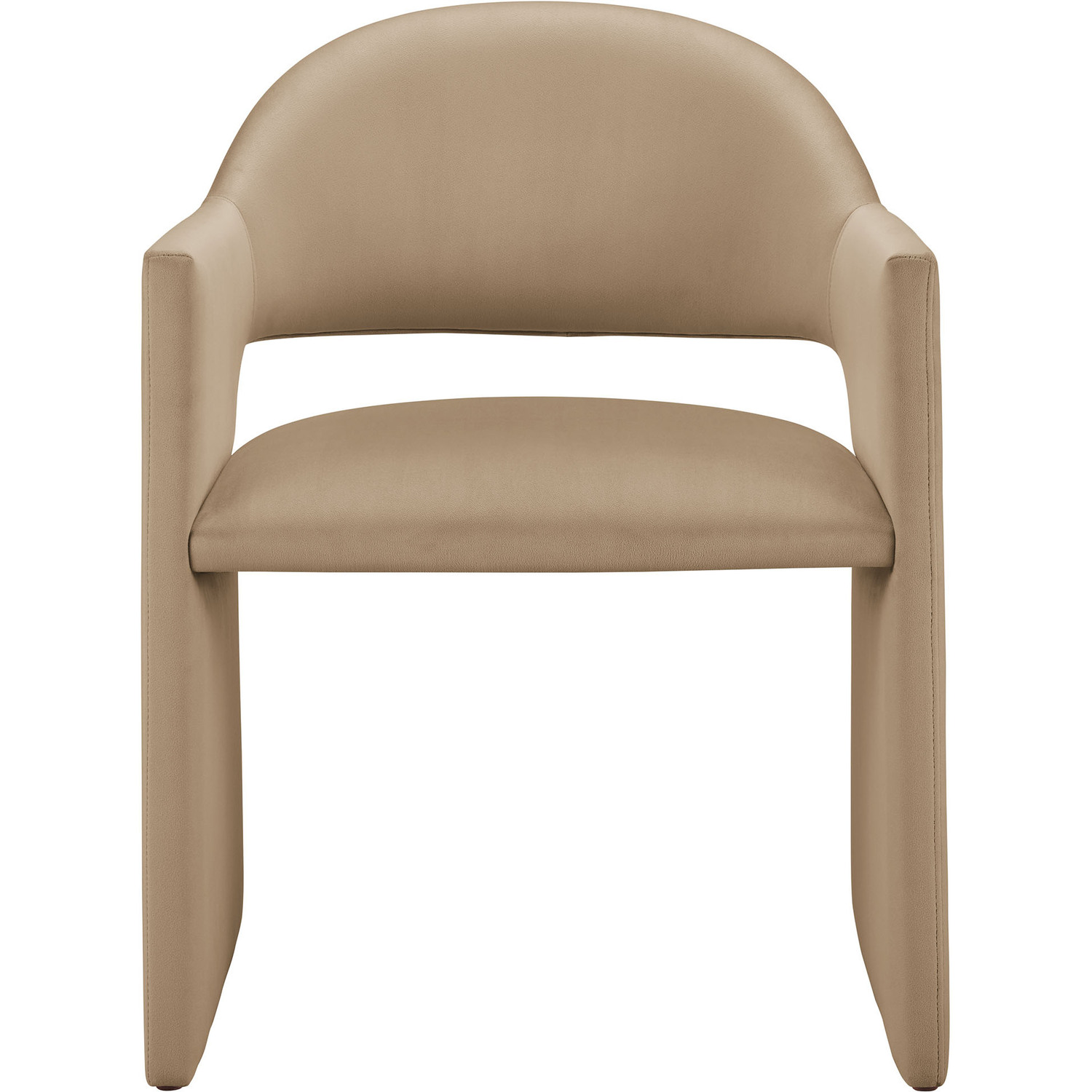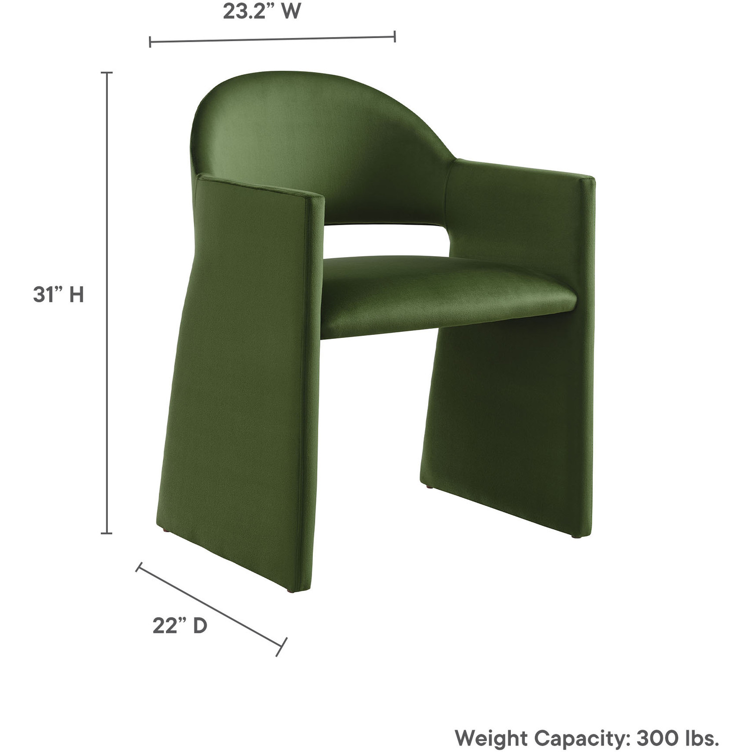 The Talia Performance Velvet Dining Chair is a stunning example of modern design, blending clean lines with luxurious comfort. Whether as a stylish living room accent chair, a statement piece in the dining area, or even a chic office accent chair, the Talia Barrel Back Dining Chair offers both timeless style and versatility. Built on a sturdy bentwood frame, this dining chair with arms is fully upholstered in soft, stain-resistant performance velvet for a premium feel. Its elegantly curved backrest flows seamlessly into wide, angular armrests that extend down to the floor, creating a sculptural look that's perfect for minimalist and contemporary spaces. The open-back design of this curved dining chair provides a light and airy feel, while the generously padded seat ensures lasting comfort. Completing the design, floor-protecting foot pins are included to prevent scratches, making it easy to move and enjoy without worry. The Talia Velvet Armchair arrives fully assembled, ready to elevate your space. Weight Capacity: 300 lbs.Stain-Resistant Performance Velvet