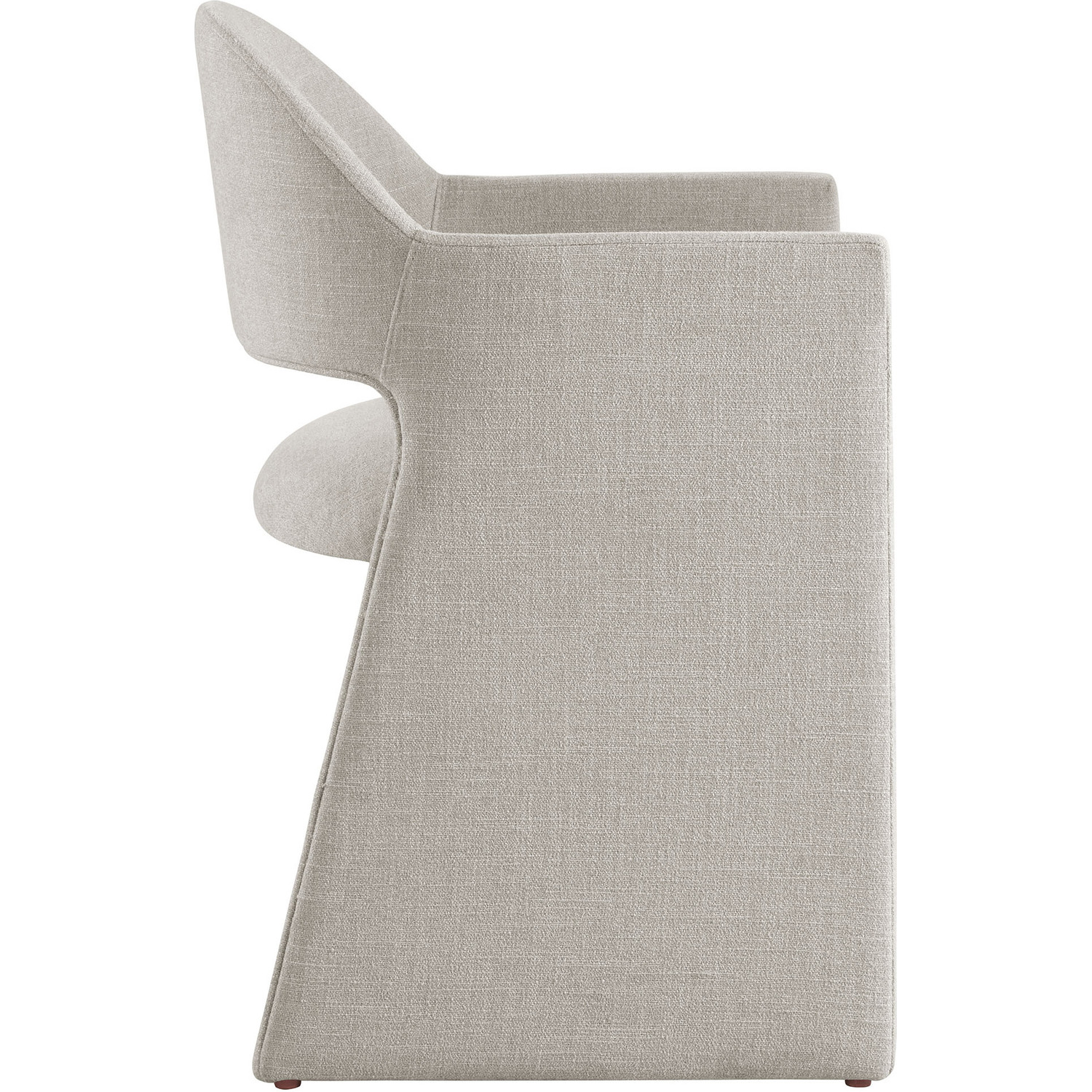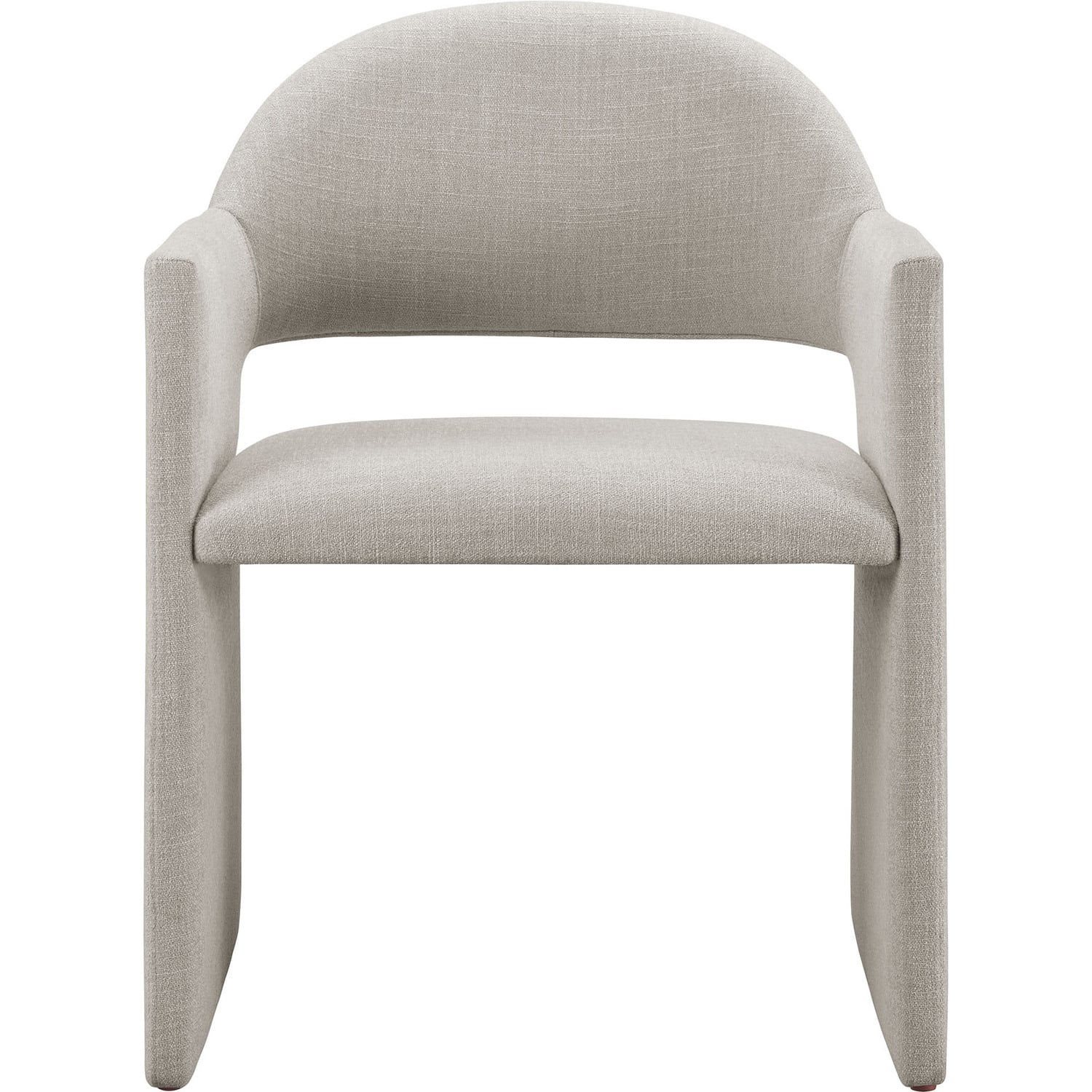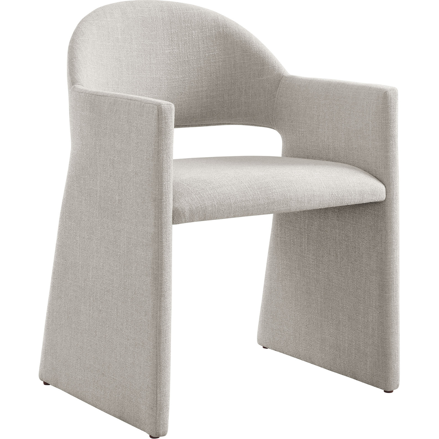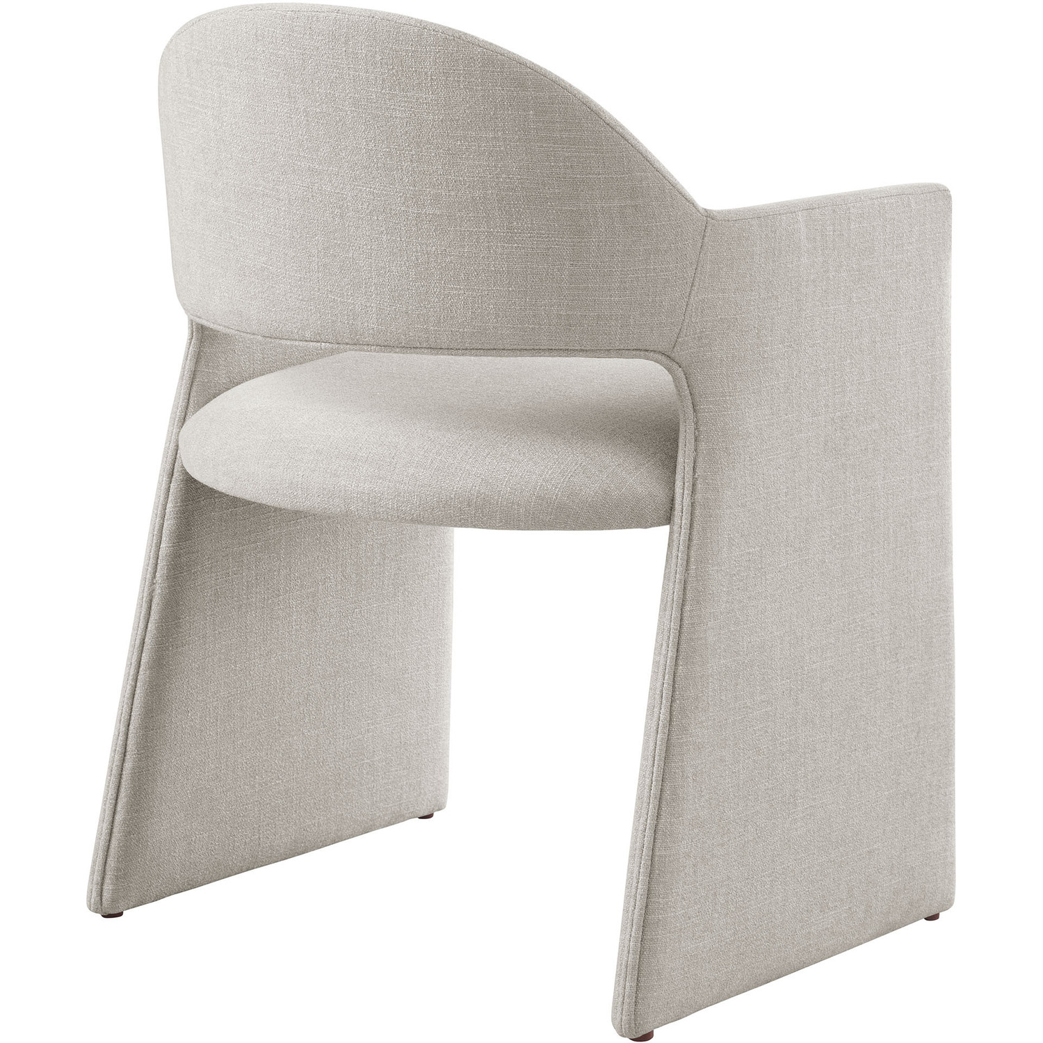 The Talia Upholstered Dining Chair is a stunning example of modern design, blending clean lines with luxurious comfort. Whether as a stylish living room accent chair, a statement piece in the dining area, or even a chic office accent chair, the Talia Barrel Back Dining Chair offers both timeless style and versatility. Built on a sturdy bentwood frame, this dining chair with arms is fully upholstered in soft slub weave fabric for a premium feel. Its elegantly curved backrest flows seamlessly into angular armrests that extend down to the floor, creating a sculptural look that's perfect for minimalist and contemporary spaces. The open-back design of this curved dining chair provides a light and airy feel, while the generously padded seat ensures lasting comfort. Completing the design, floor-protecting foot pins are included to prevent scratches, making it easy to move and enjoy without worry. The Talia Dining Armchair arrives fully assembled, ready to elevate your space. Weight Capacity: 300 lbs.Soft Slub Weave Fabric Upholstery