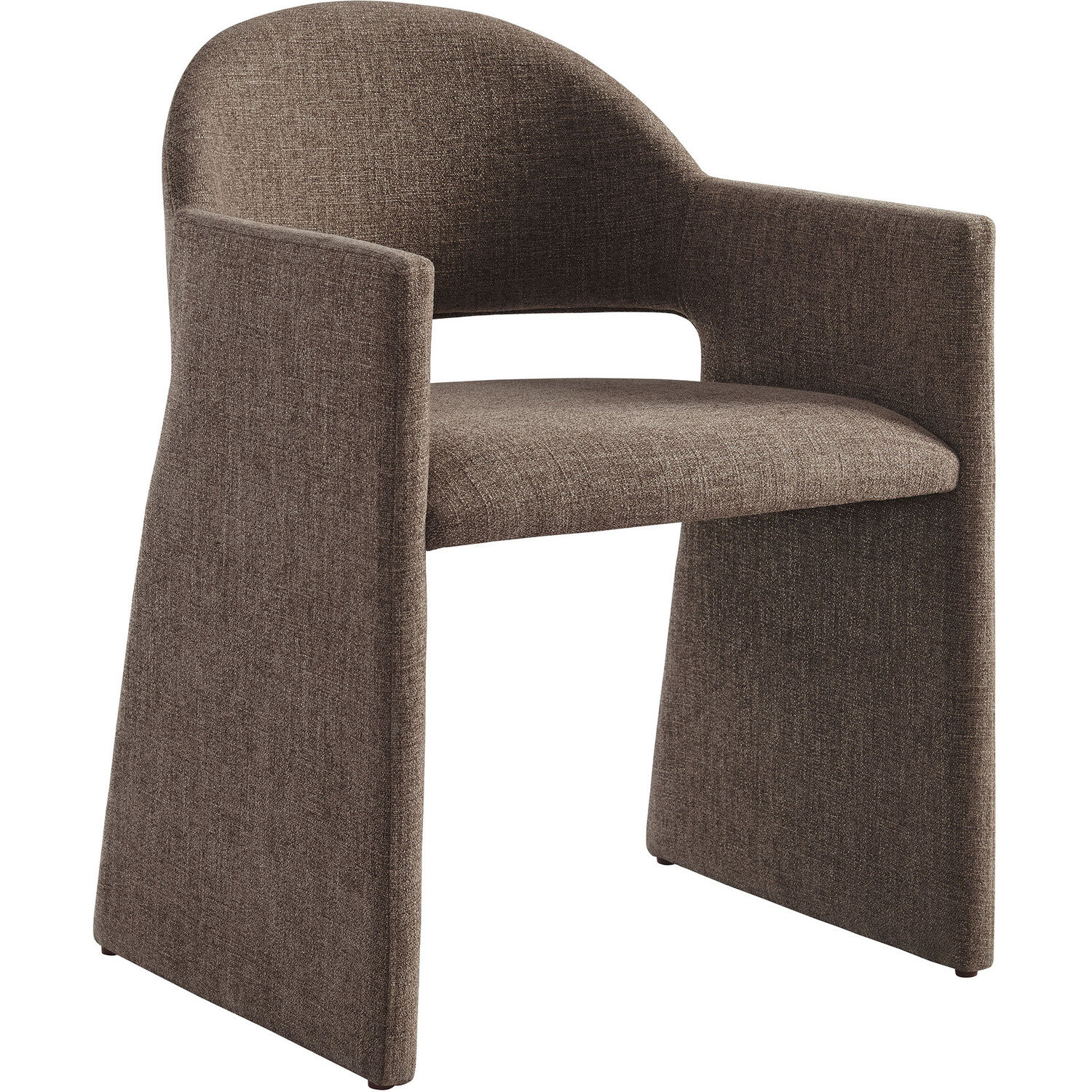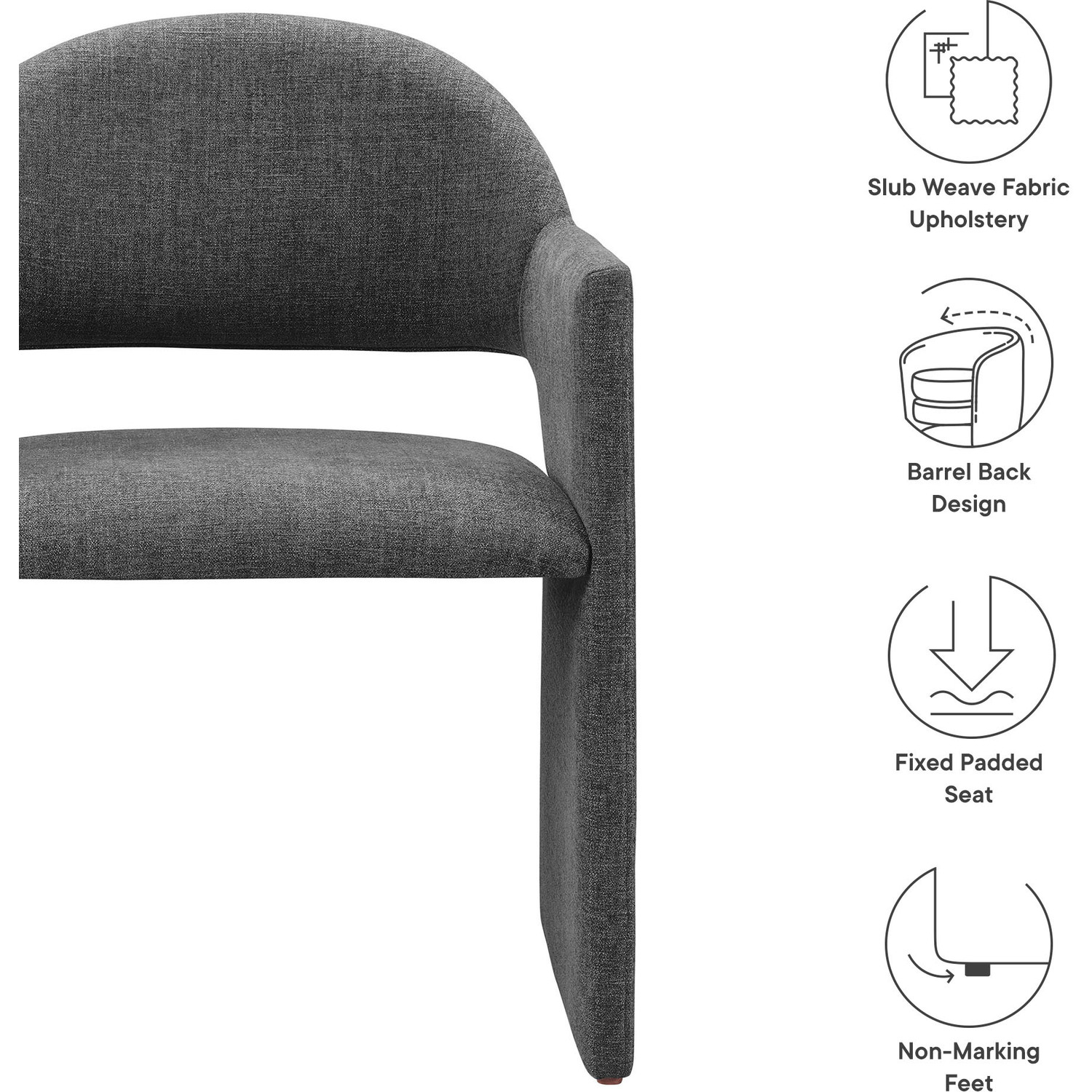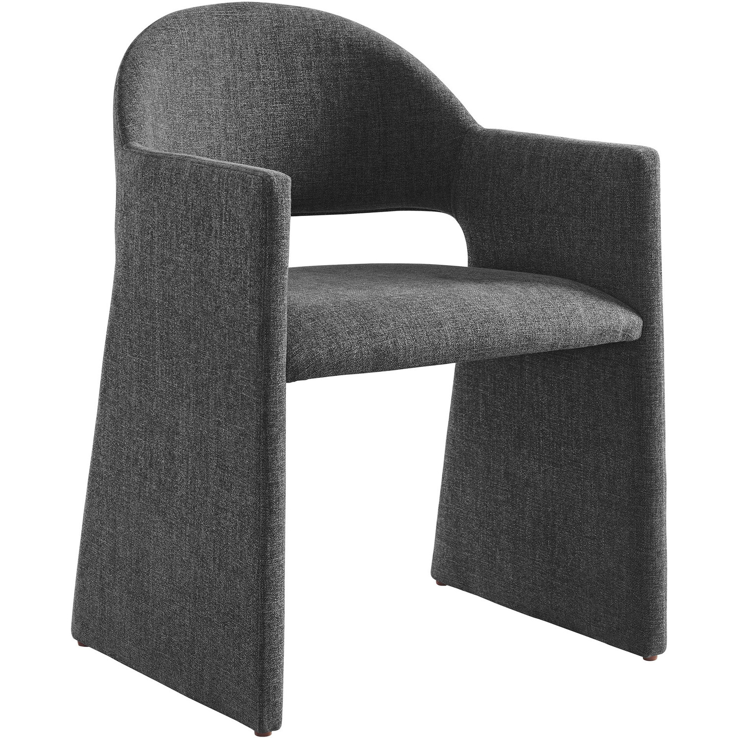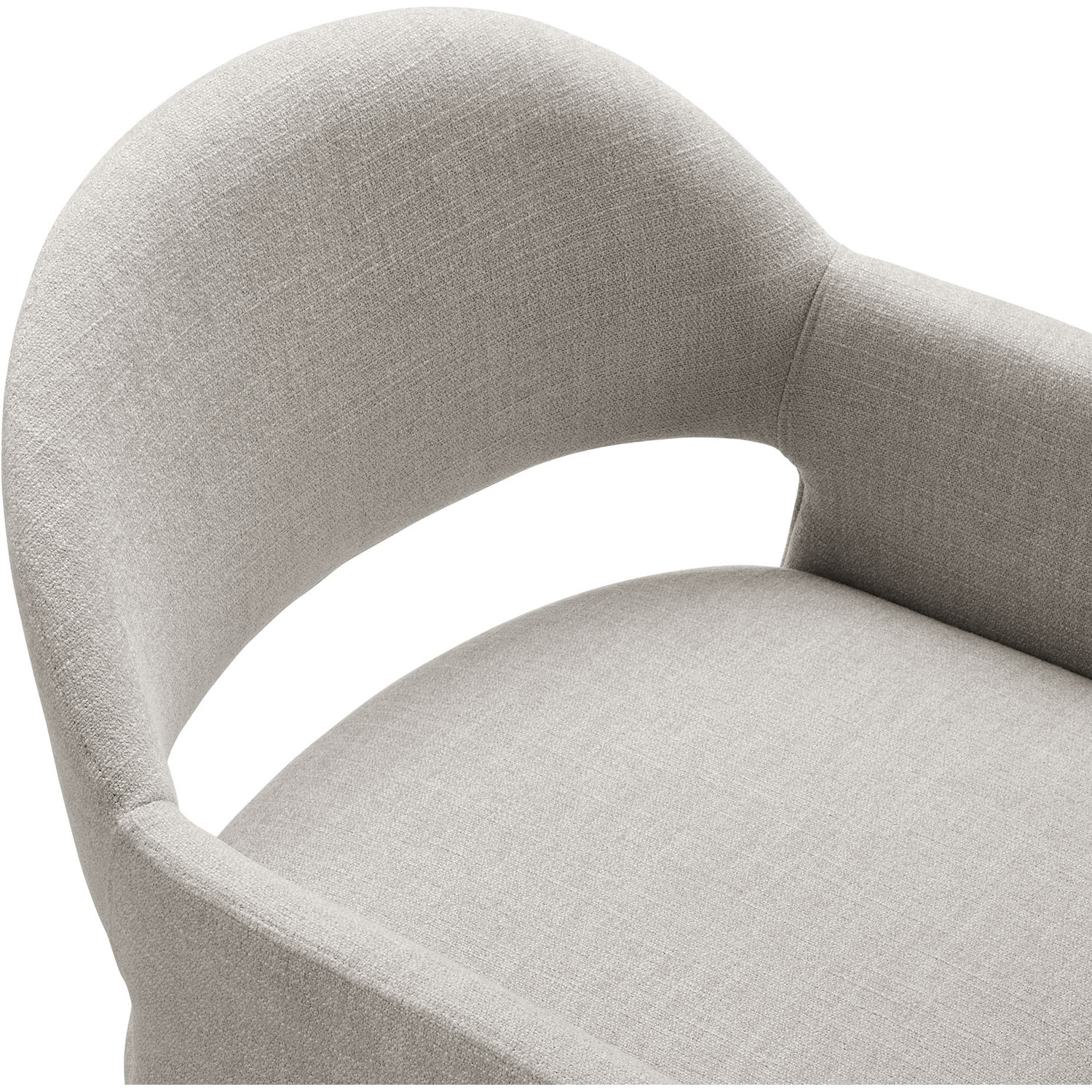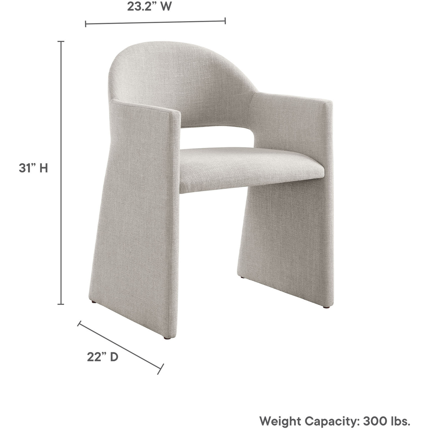 The Talia Upholstered Dining Chair is a stunning example of modern design, blending clean lines with luxurious comfort. Whether as a stylish living room accent chair, a statement piece in the dining area, or even a chic office accent chair, the Talia Barrel Back Dining Chair offers both timeless style and versatility. Built on a sturdy bentwood frame, this dining chair with arms is fully upholstered in soft slub weave fabric for a premium feel. Its elegantly curved backrest flows seamlessly into angular armrests that extend down to the floor, creating a sculptural look that's perfect for minimalist and contemporary spaces. The open-back design of this curved dining chair provides a light and airy feel, while the generously padded seat ensures lasting comfort. Completing the design, floor-protecting foot pins are included to prevent scratches, making it easy to move and enjoy without worry. The Talia Dining Armchair arrives fully assembled, ready to elevate your space. Weight Capacity: 300 lbs.Soft Slub Weave Fabric Upholstery