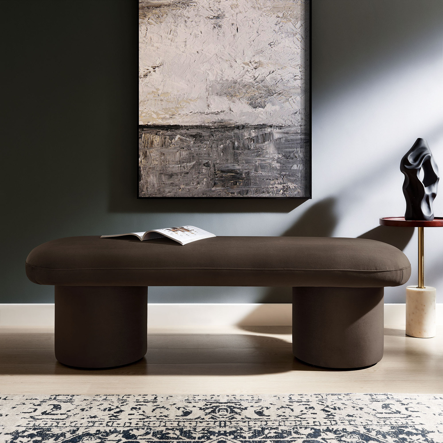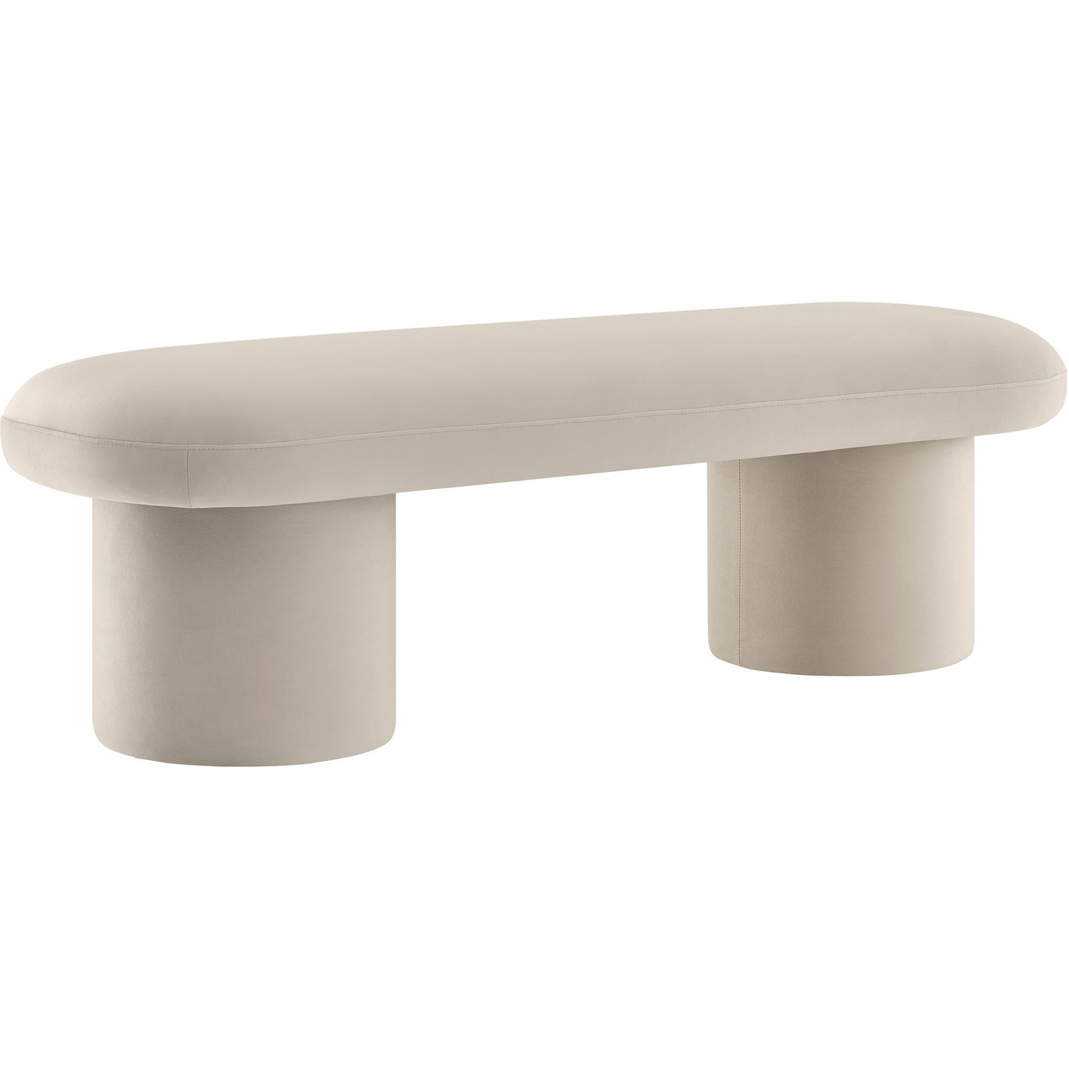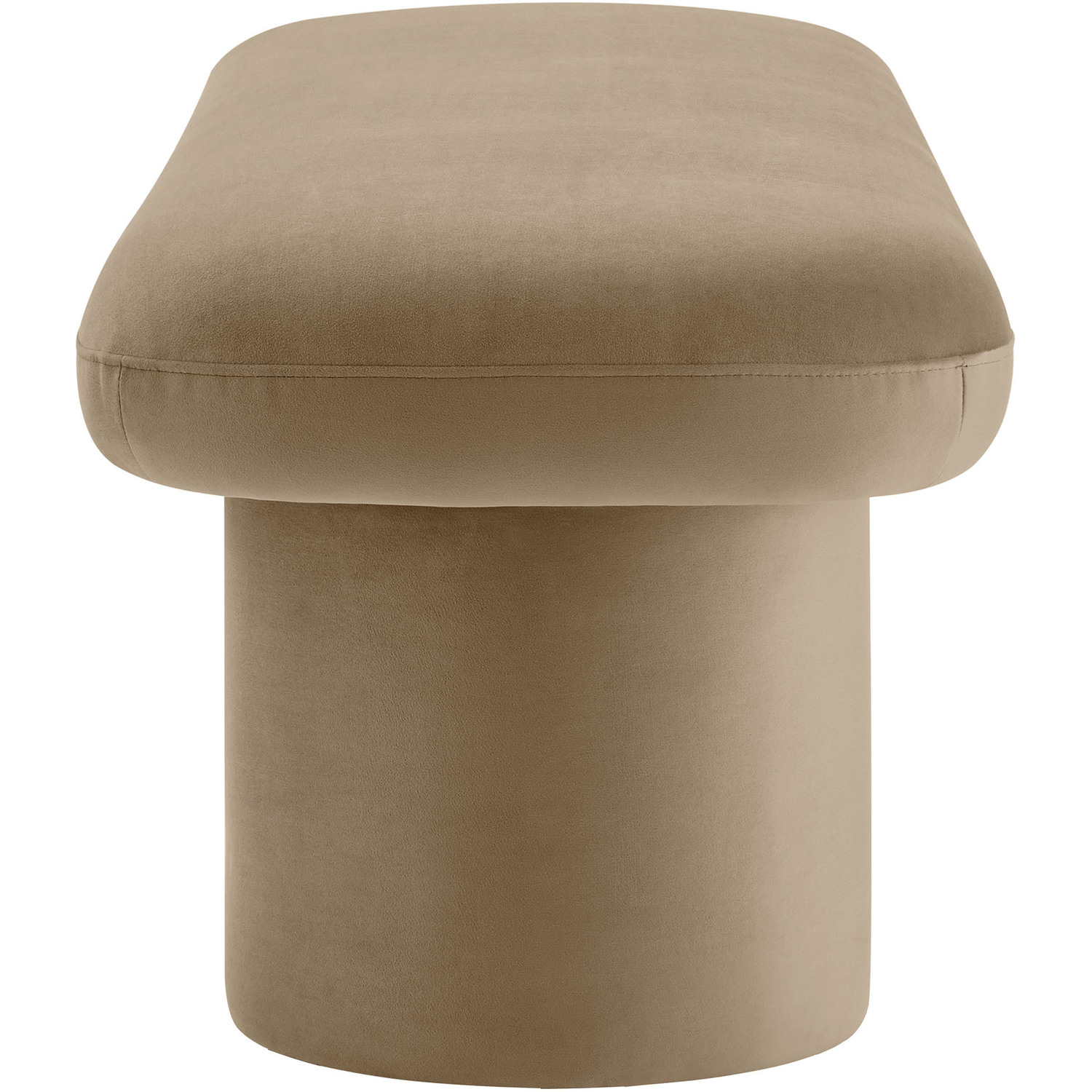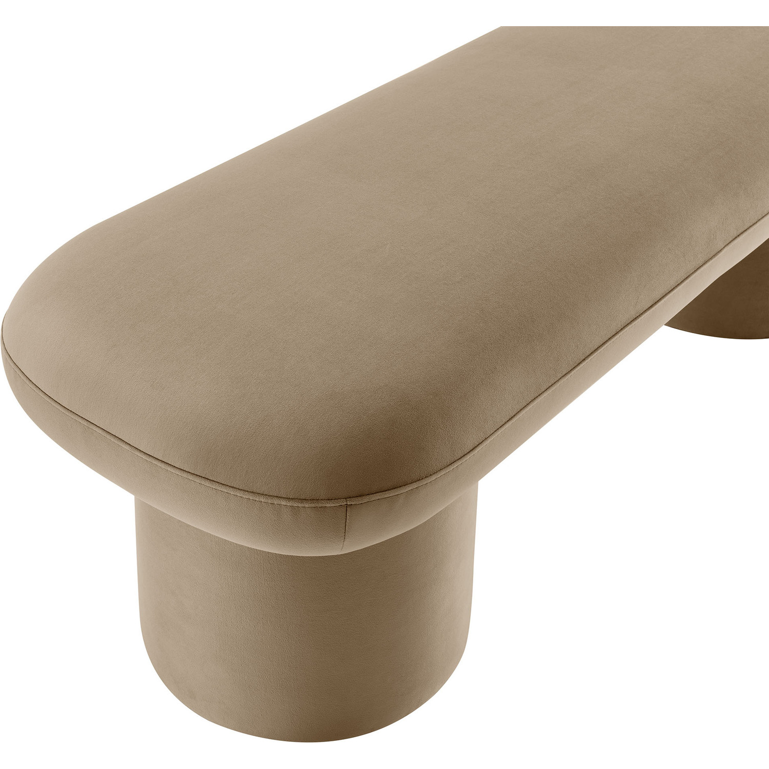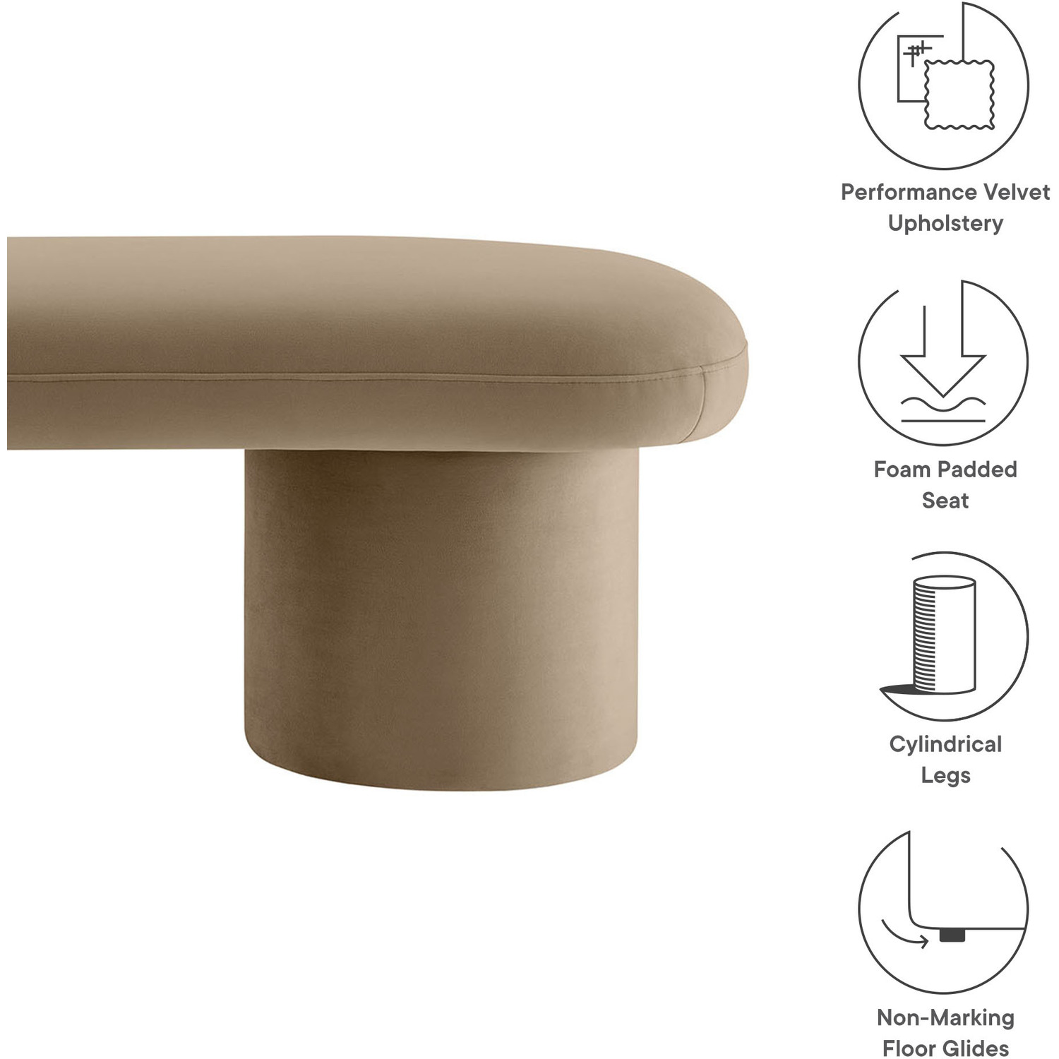 Cozy and chic, the Orla Performance Velvet Bench adds the perfect finishing touch to any space. Fully wrapped in luxurious, stain-resistant performance velvet, this bench sofa offers a soft yet durable seating experience, perfect for everyday use. The plush seat, padded with dense foam, subtly overhangs its round, wide cylindrical legs, which not only provide strong support but also give the modern bench an eye-catching aesthetic. No matter where you place it, Orla looks stunning—whether as an end of bed ottoman, a modern entryway bench, or as additional seating as a living room bench. It also works perfectly as window seating, providing a spacious, comfortable spot to relax and take in the view. Equipped with non-marking floor glides, the Orla Bedroom Bench keeps your floors protected while making it easy to move from one room to another. Fully assembled and ready to use, this velvet ottoman bench brings a soft, modern touch to any decor. Weight Capacity: 220 lbs.Stain-Resistant Performance Velvet