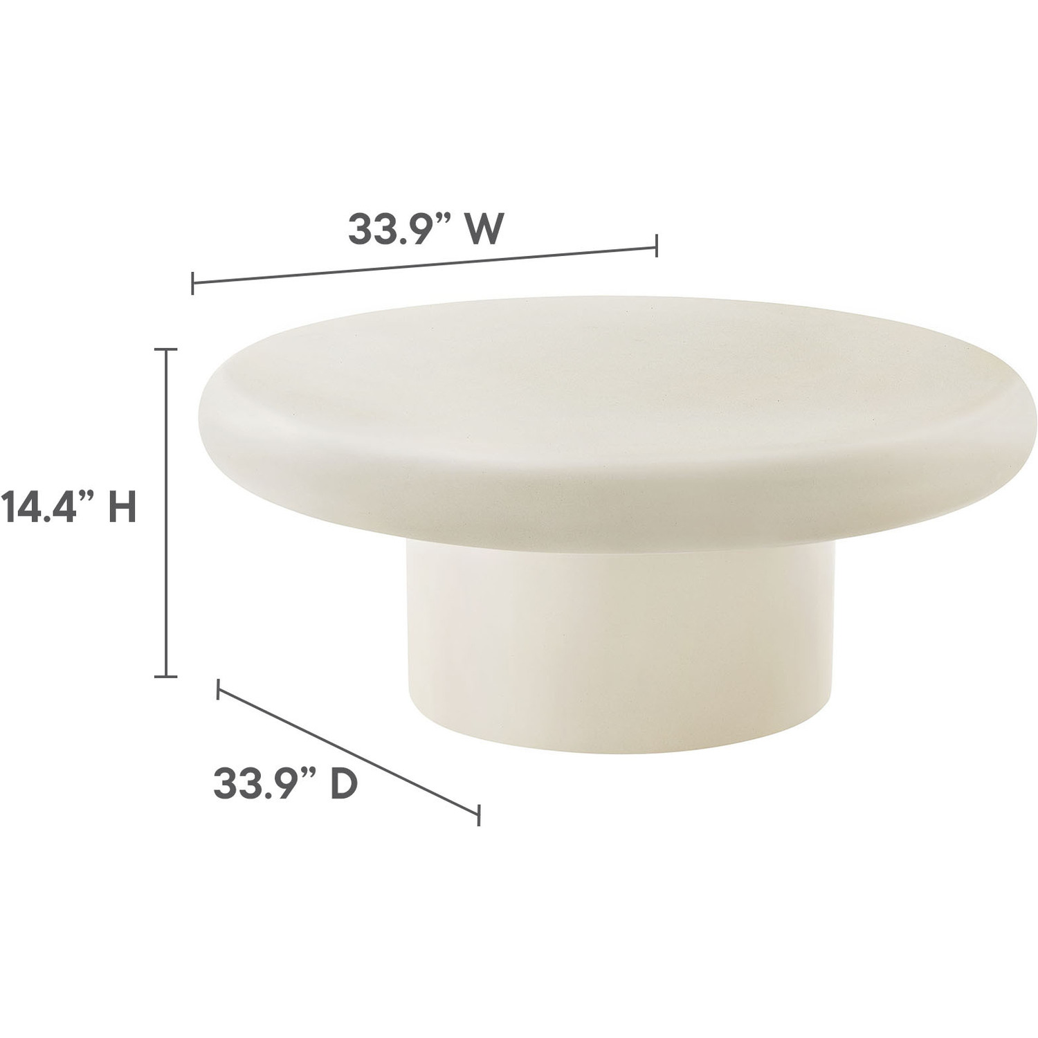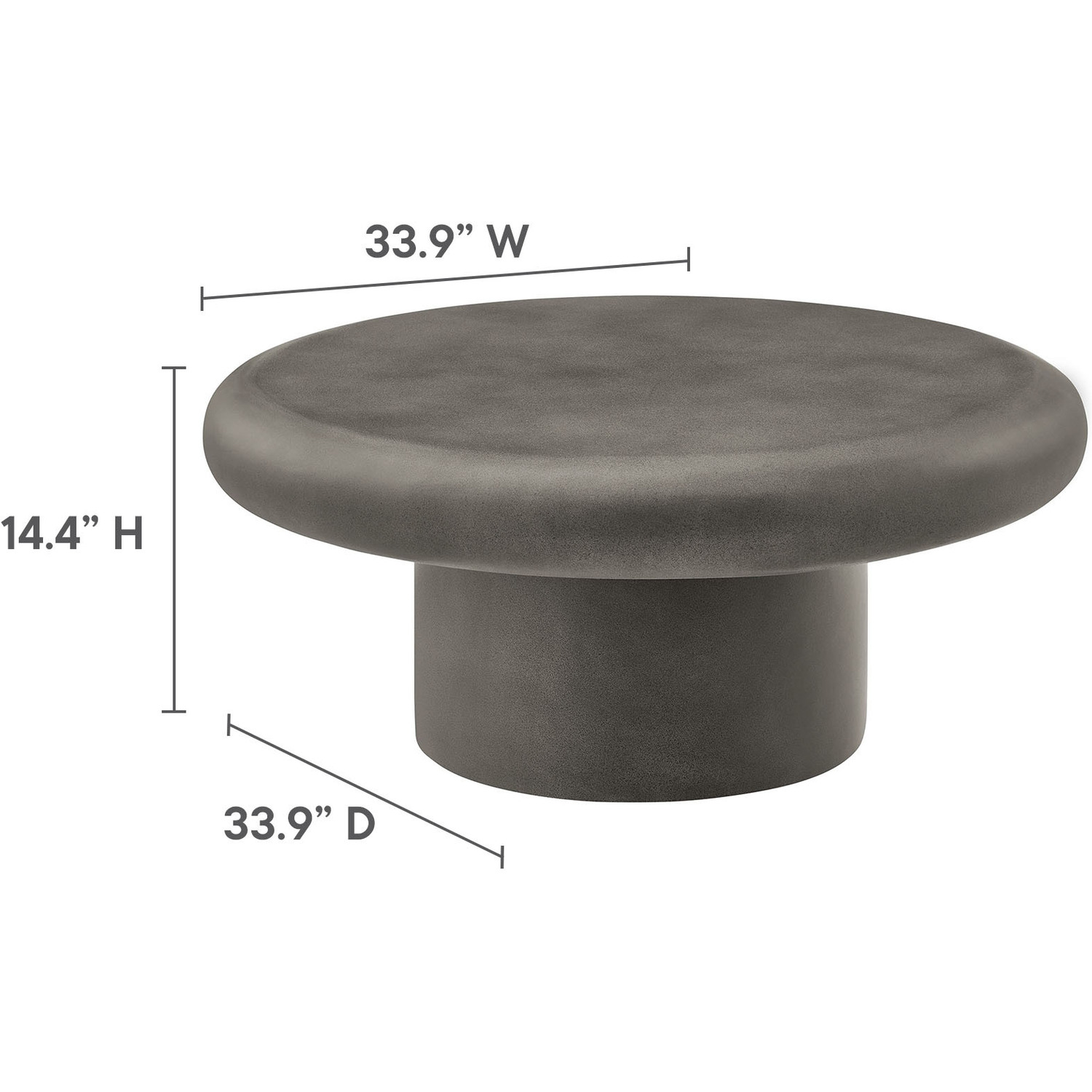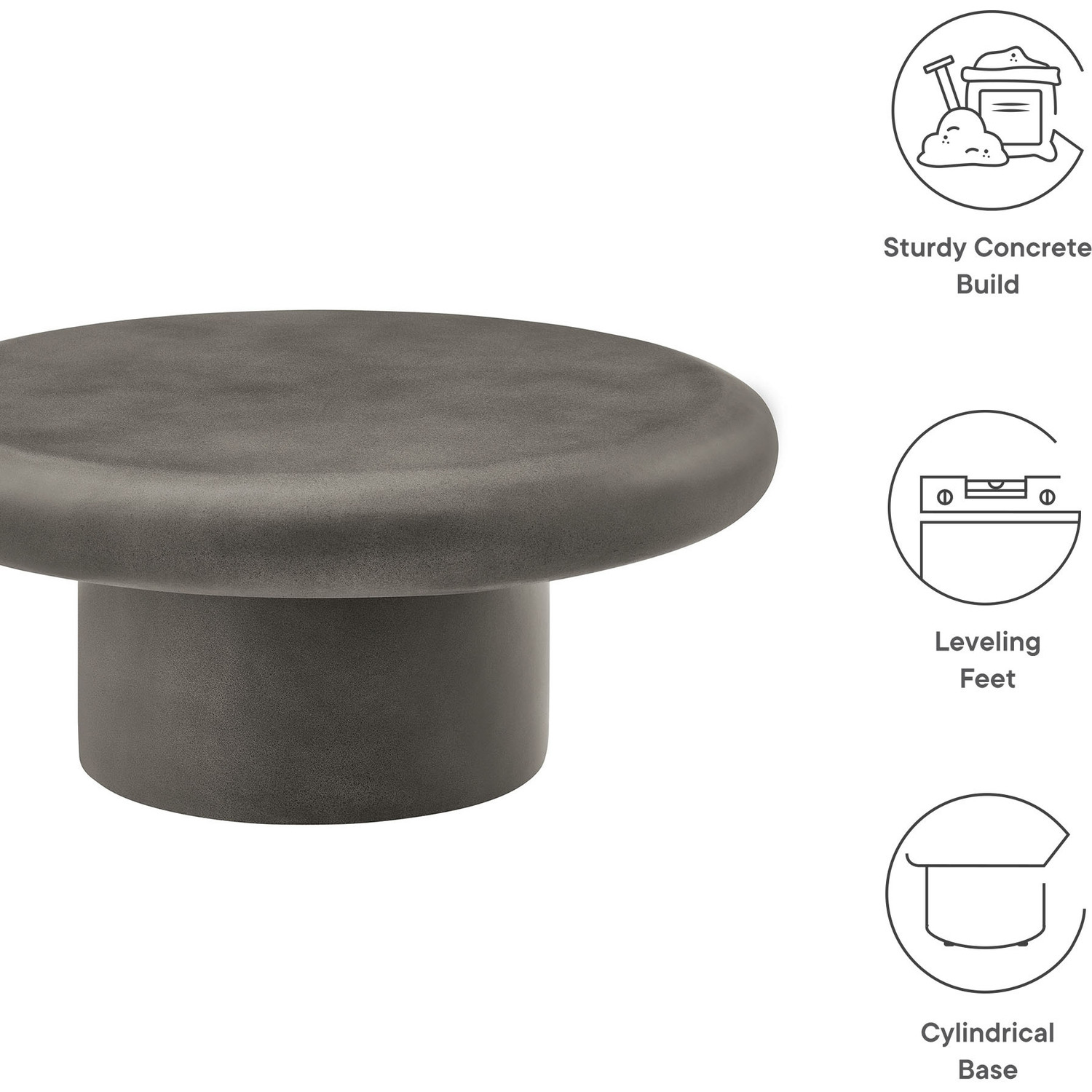 The Argos Concrete Coffee Table strikes a balance between boldness and elegance, making it an essential centerpiece for any space. With its 34-inch round top and soft bullnose edges, this circle table combines clean, gentle curves with a robust concrete build for an eye-catching, durable aesthetic. The sleek finish not only adds a refined touch but also provides a smooth texture that elevates the cement center table’s overall appeal. Its wide, cylindrical base further anchors the design, providing stability while adding to its modern look. Whether holding your favorite books, decorative pieces, or coffee essentials, the generous surface offers ample space, maintaining minimalist appeal throughout. Ideal for indoor or outdoor settings, this low coffee table comes with non-marking leveling feet to keep your floors scratch-free. Whether placed in a living room, patio, or garden, Argos offers versatility and strength in equal measure. With easy assembly required, this outdoor round stone coffee table is ready to serve as the focal point of your space. Weight Capacity: 230 lbs.34" Round Coffee Table