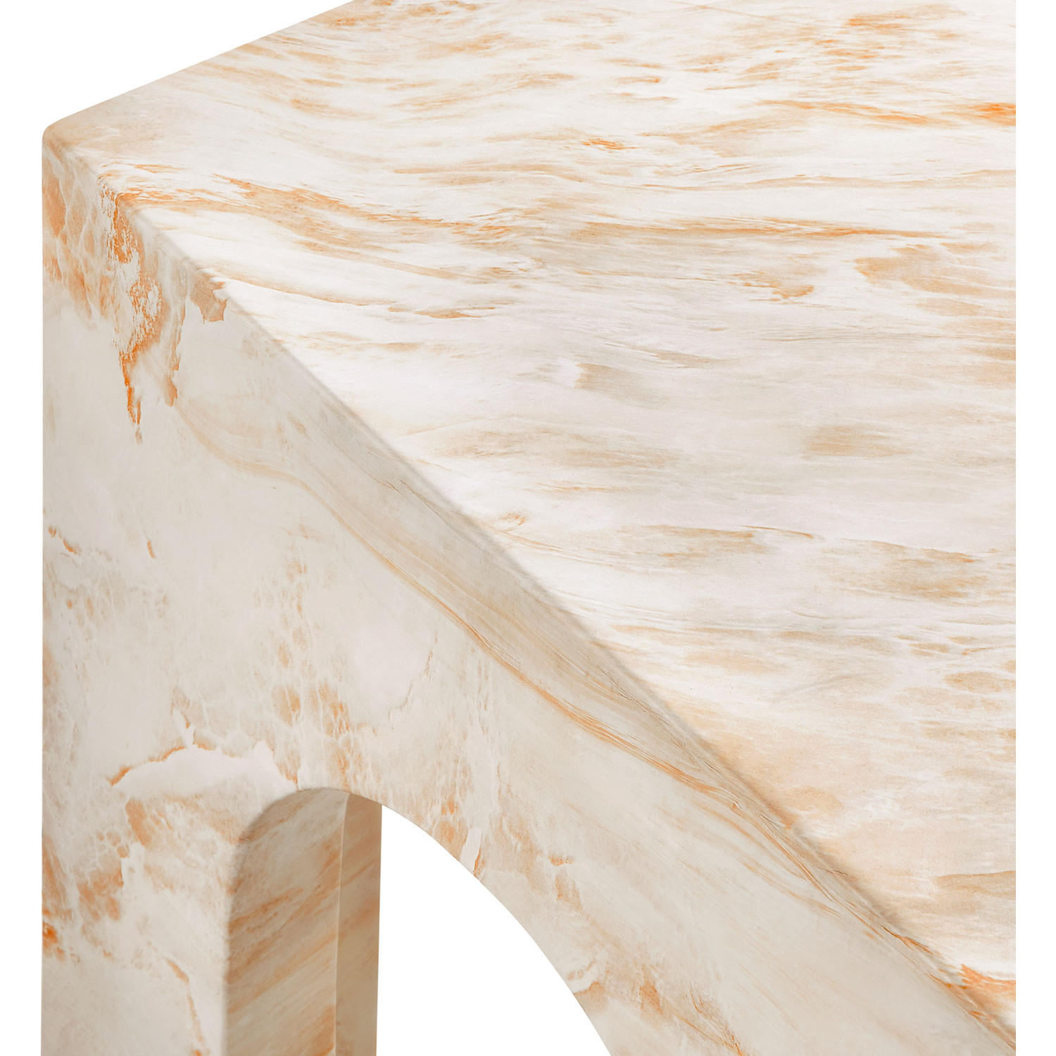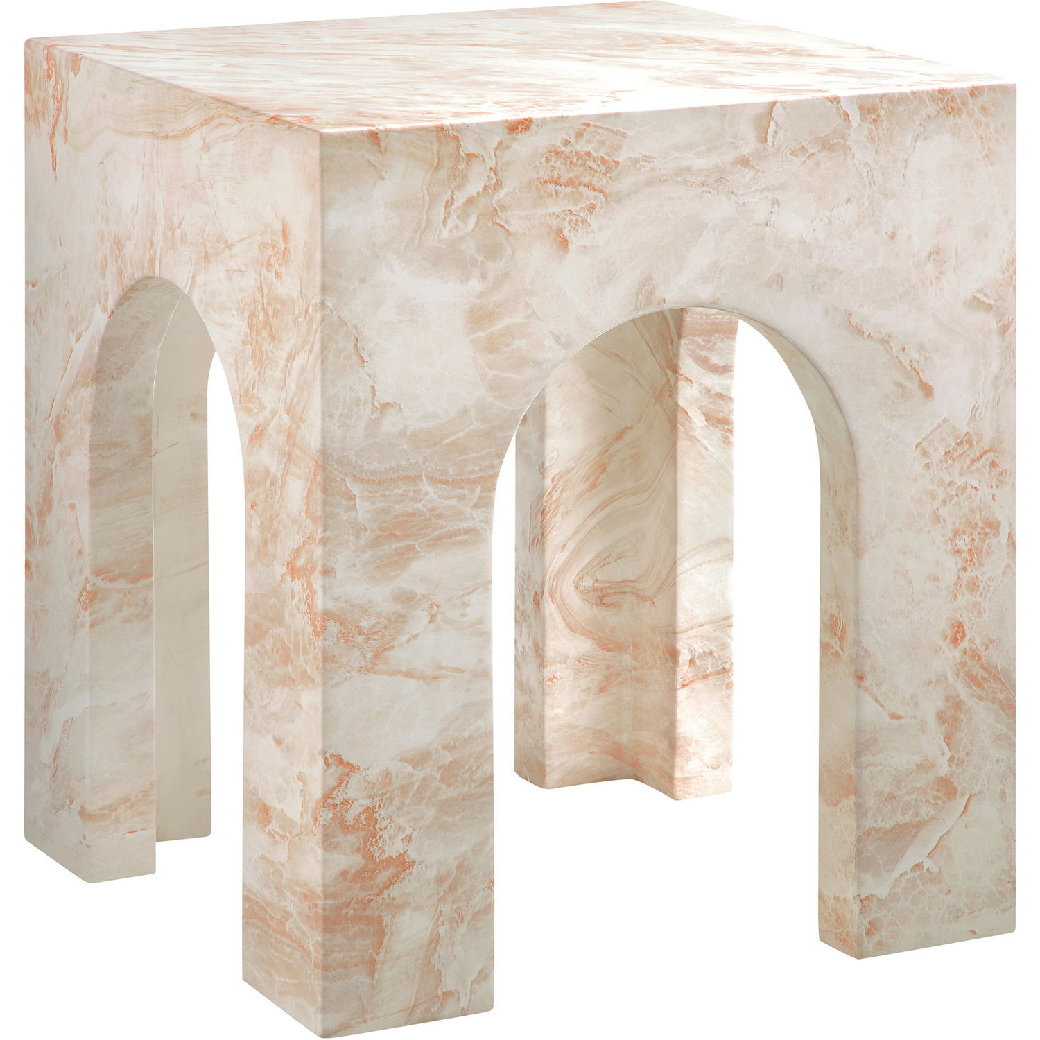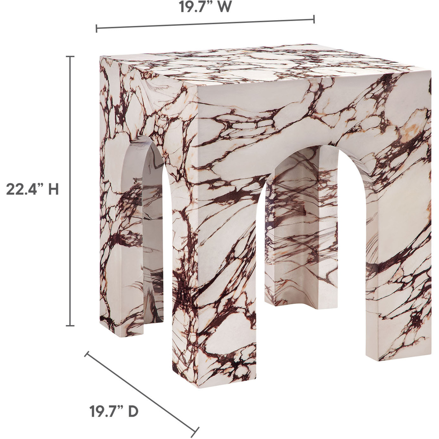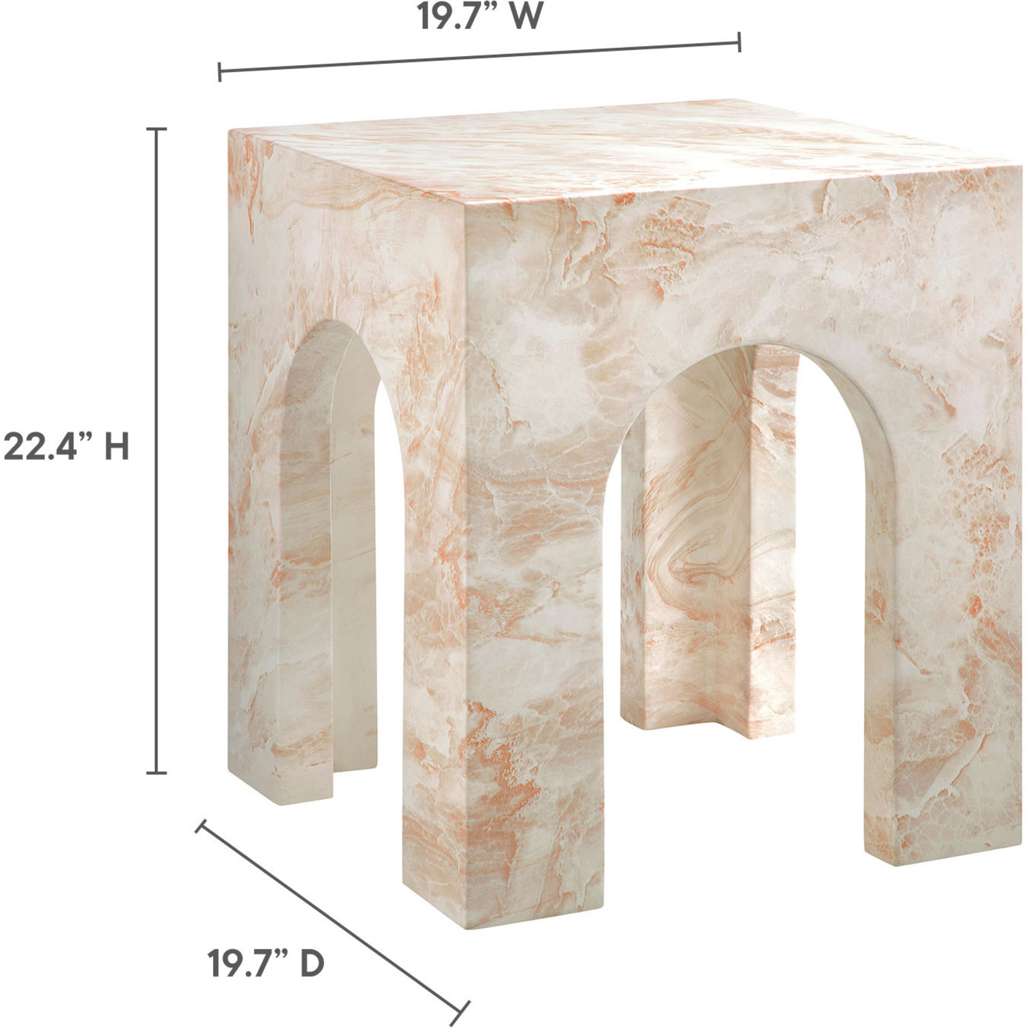 Instantly eye-catching, the Valen Arched Concrete Side Table turns heads with its unique design. Entirely crafted from concrete with a faux stone finish, the square side table offers both durability and a luxurious appearance. Its curved arches on all four sides create a sense of openness, while the solid legs provide strength and stability, reminiscent of classic architectural designs. More than just a minimalist side table, Valen’s design offers a unique combination of bold geometry and airy elegance, making it a standout accent table that uplifts any space. Perfect for indoor or outdoor settings, Valen brings an artful touch whether used as a square end table in your living room or as an outdoor drink table for your patio. Complete with non-marking leveling feet for added stability and floor protection, this faux stone side table arrives fully assembled and ready to transform your environment with its distinctive presence. Weight Capacity: 230 lbs.Unique Arched Design