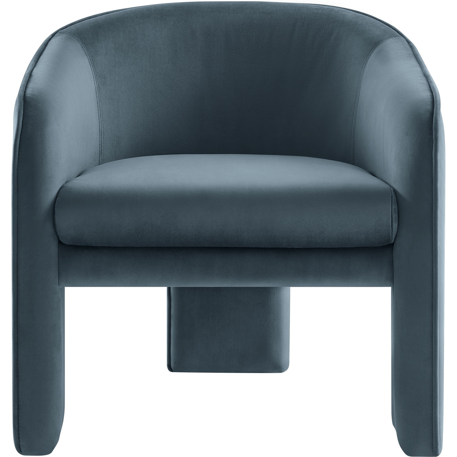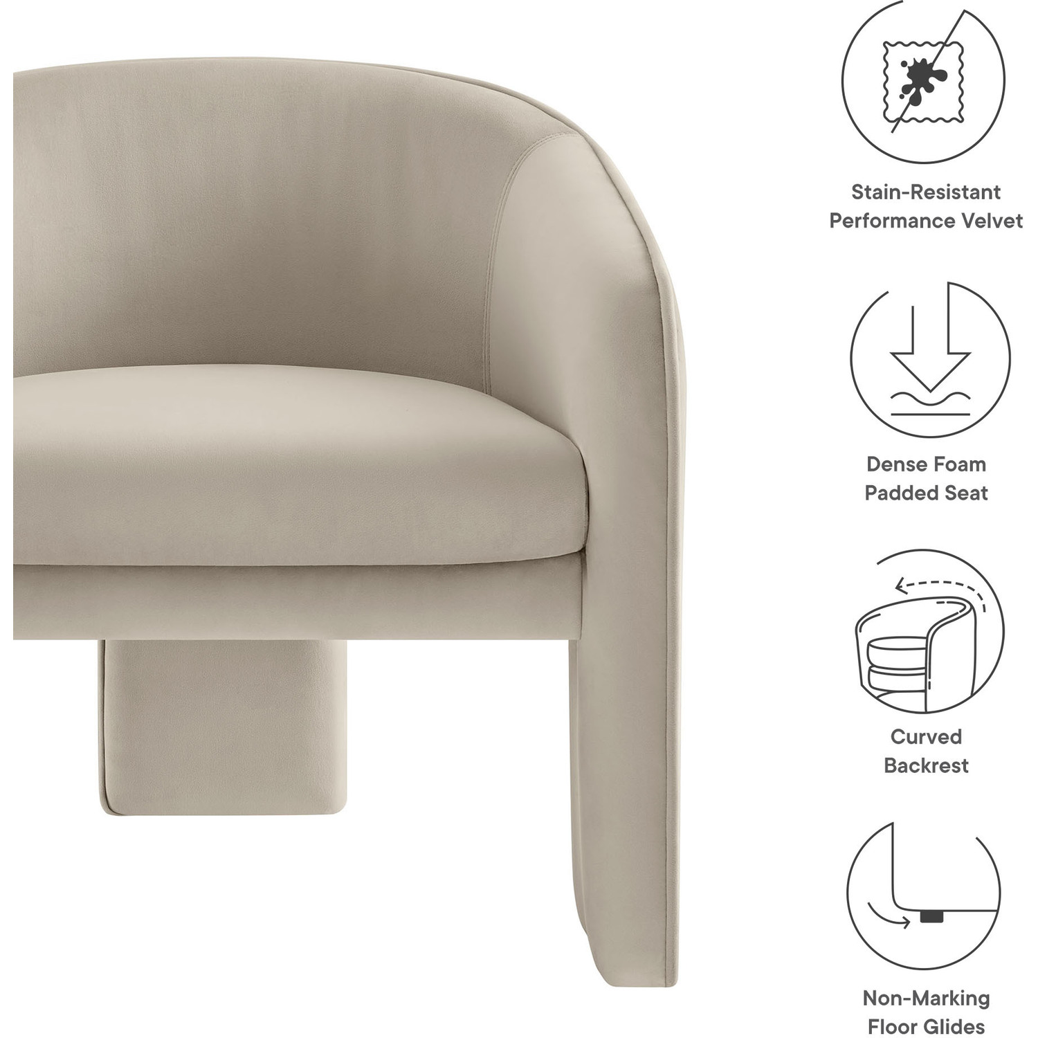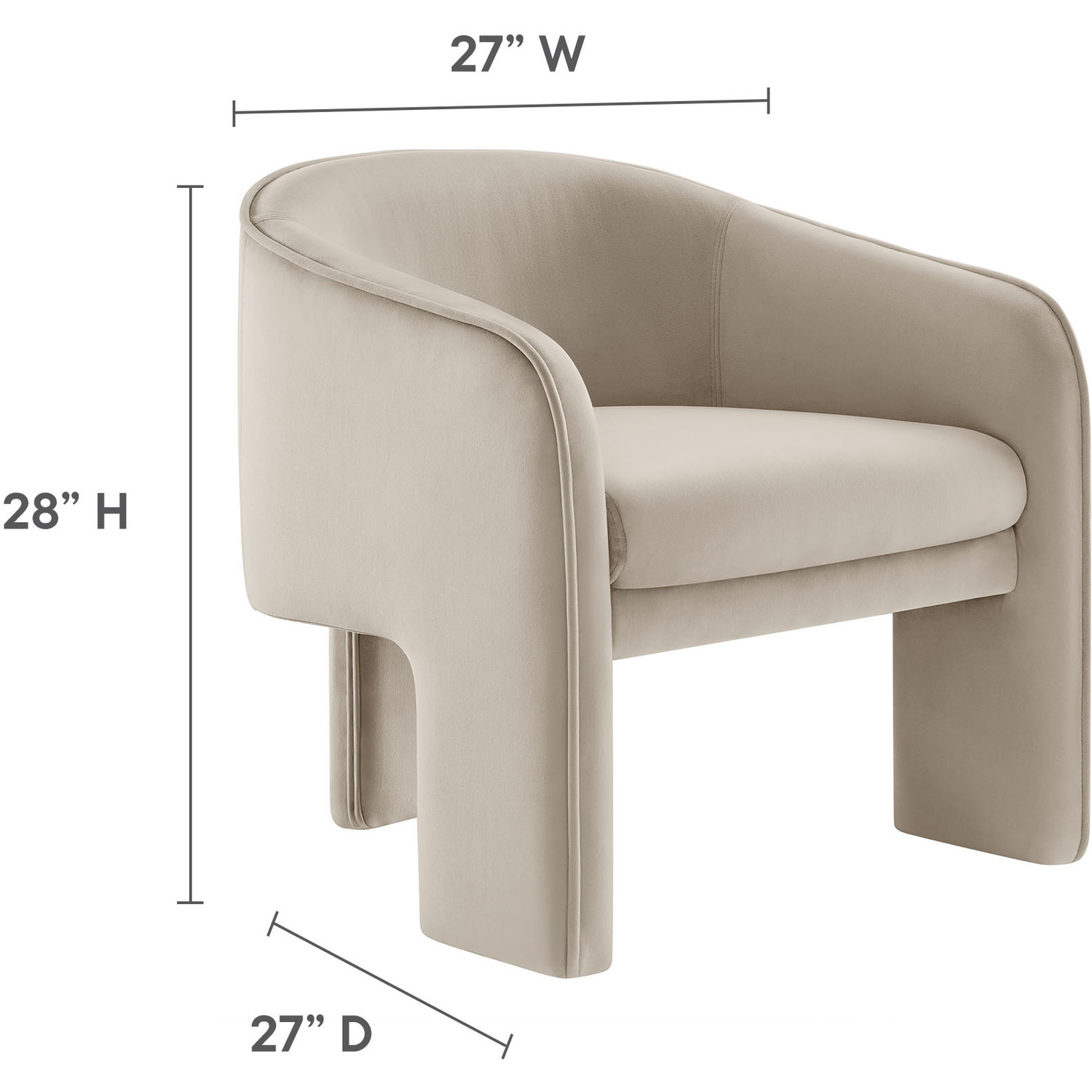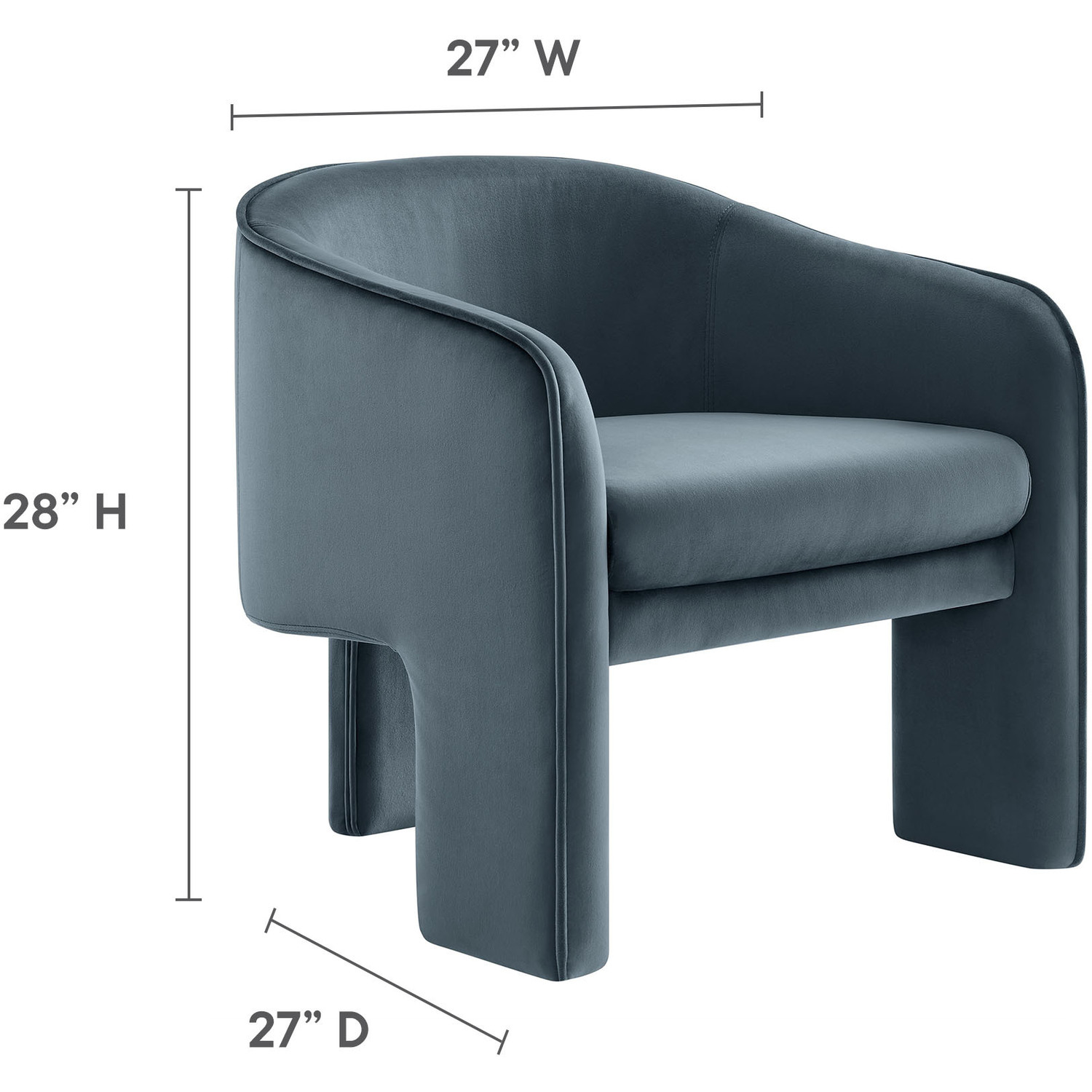 Distinctive and bold, the Greer Performance Velvet Accent Chair offers a fresh take on modern seating. Covered in stain-resistant performance velvet, this soft upholstered reading armchair features a barrel chair silhouette with a unique three-legged design that sets it apart. Its curved back flows into the gently angled arms, creating a cocoon-like seating experience that's as comfortable as it is stylish. With padding throughout, the Greer Velvet Armchair provides a cozy place to relax or dine. Perfect for small spaces or as a wide velvet dining chair, the lower backrest adds to its sleek, modern look. Whether you’re creating a reading nook or upgrading your reception space decor, Greer’s bold shape and contemporary flair make it an ideal choice for versatile seating. This velvet barrel chair arrives fully assembled, ready to enhance your space immediately. Weight Capacity: 331 lbs.Performance Velvet Fabric