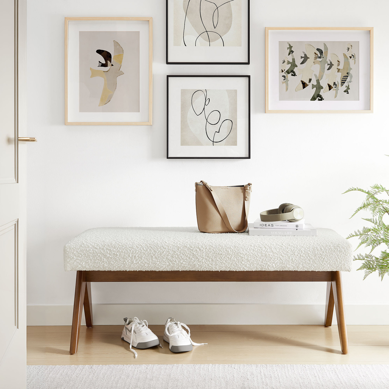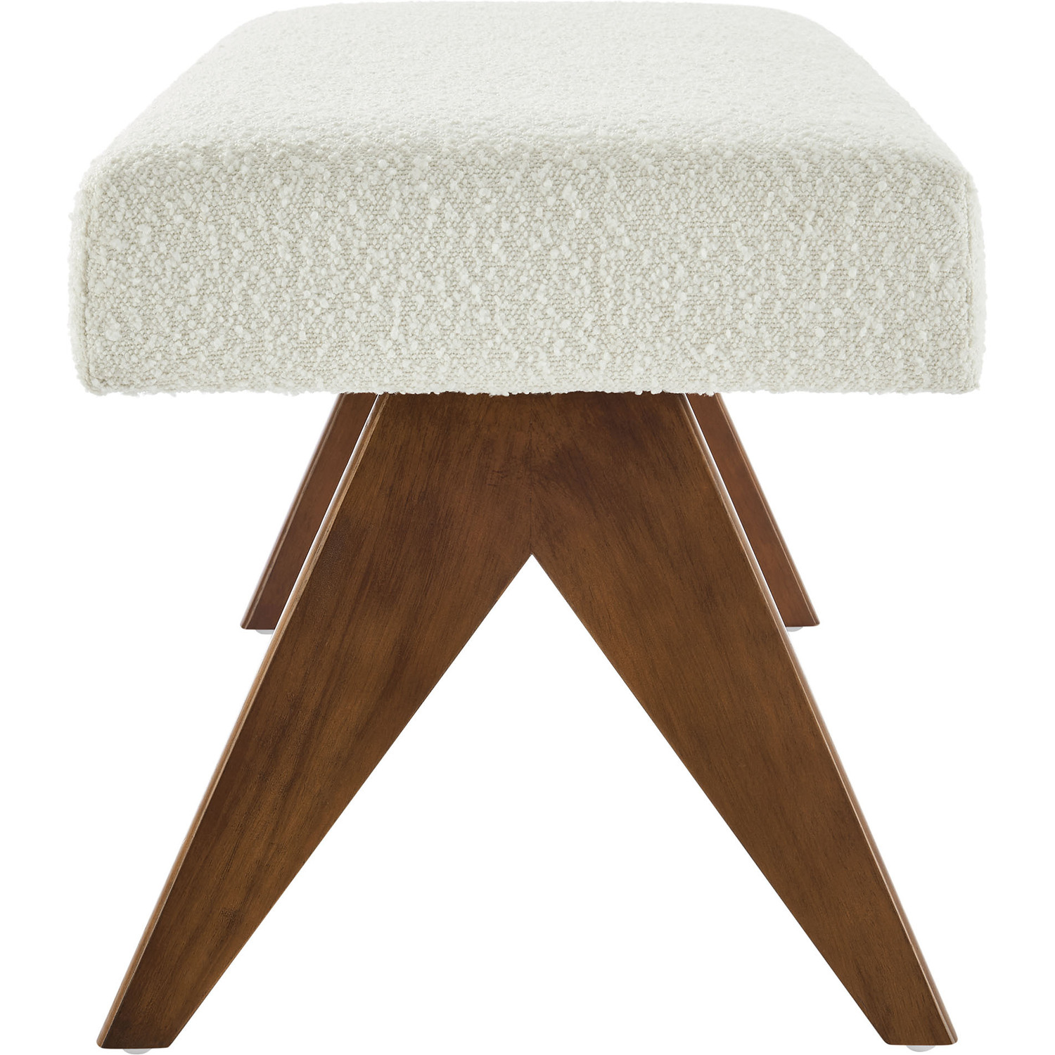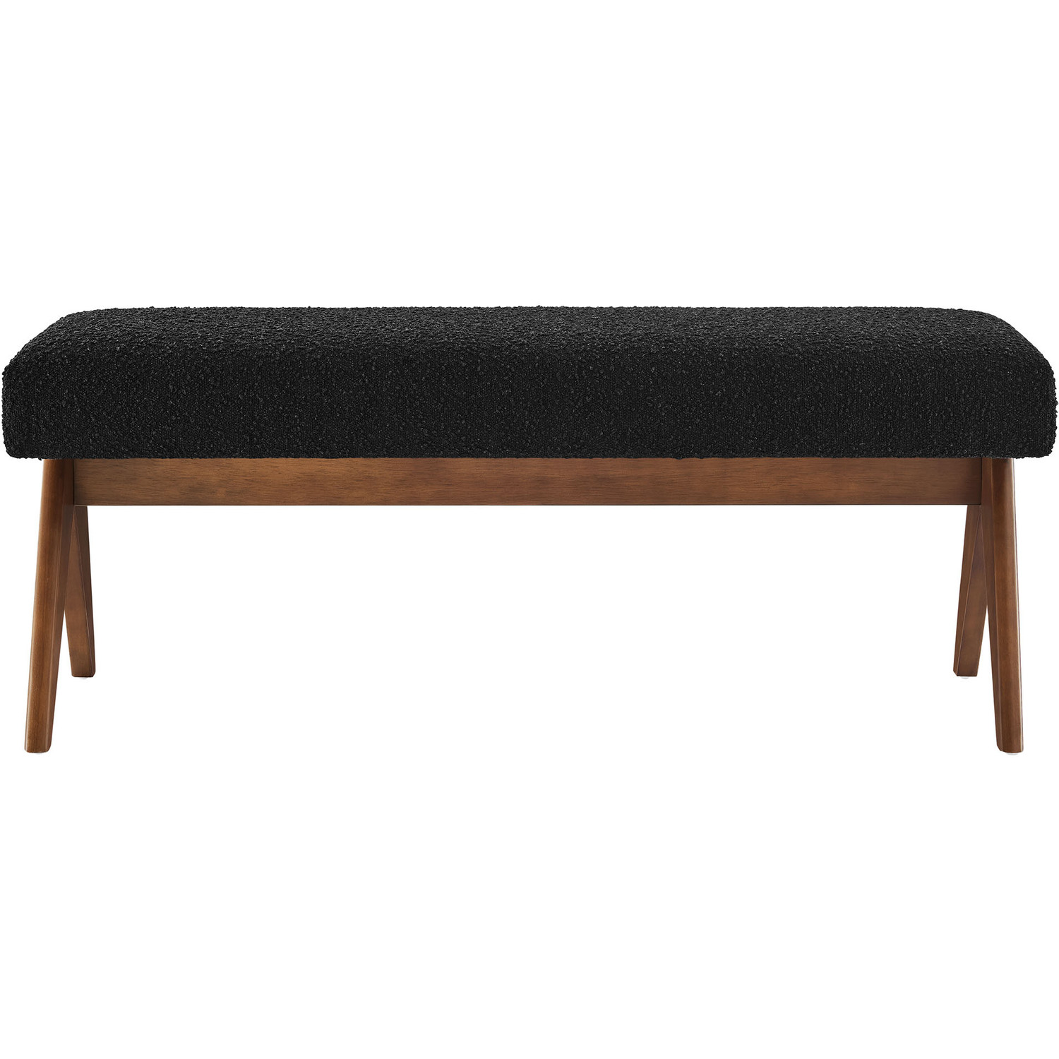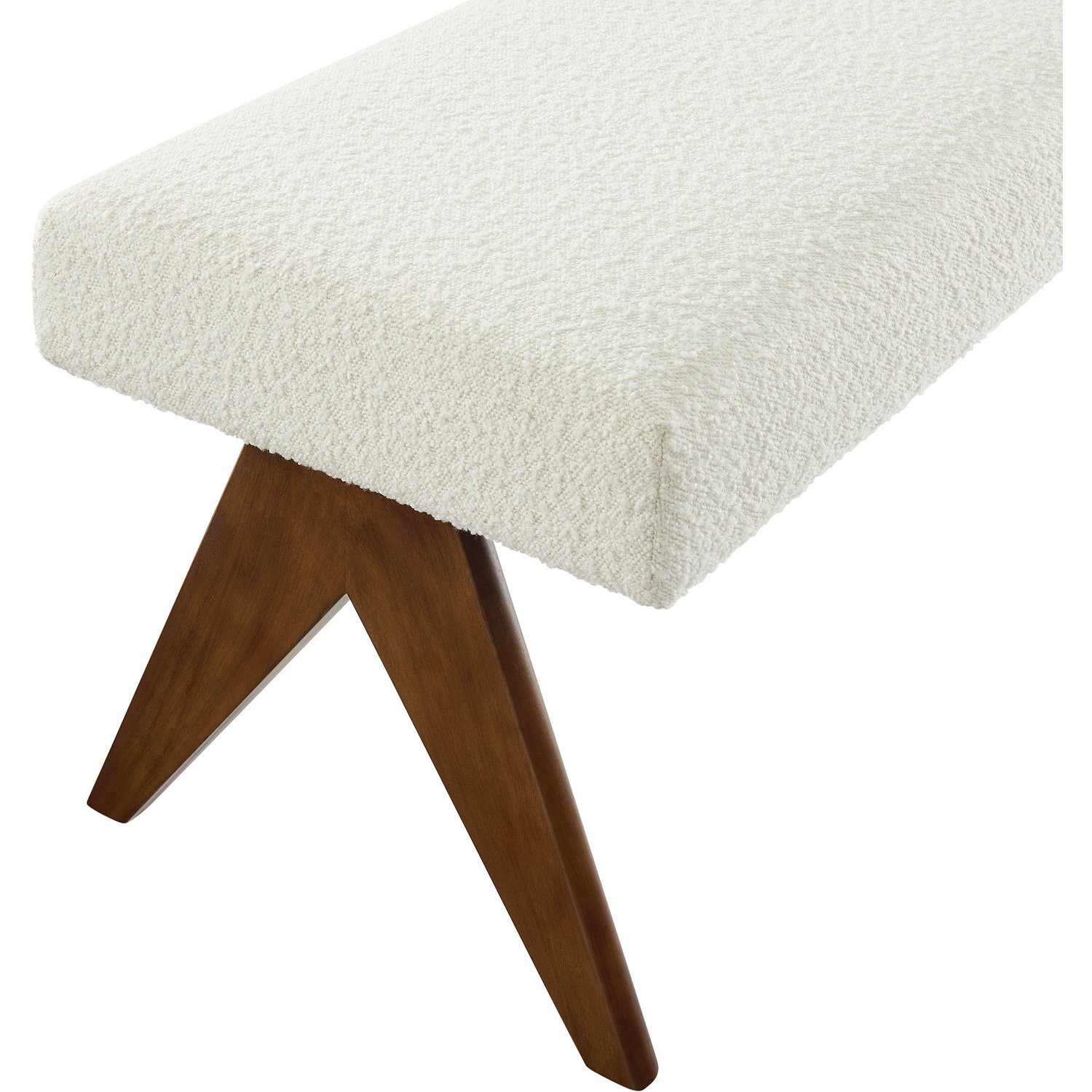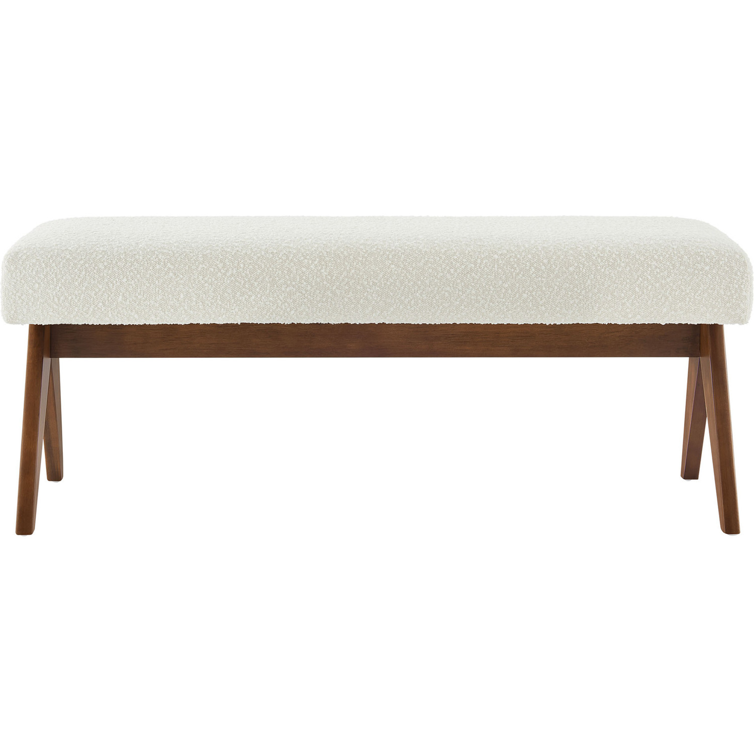 Add comfort and style to your home with the Lyra Boucle Fabric Upholstered Bench. This 47" accent bench is chic and luxurious, featuring a softly contoured design with a plush padded seat. Lyra comes upholstered in boucle fabric, providing a versatile and trendy seating option whether used as a sitting bench, entryway bench, or even as additional seating in a breakfast nook. With a sturdy plywood frame, splayed rubberwood legs, and dense foam padding, this boucle bench seat offers both stability and style, enhancing living room, bedroom, or entryways. Positioned at the end of your bed or used as a window seat, the Lyra decorative bench effortlessly adds a touch of elegance wherever it's placed. Includes non-marking feet. Assembly Required. Weight Capacity: 661 lbs.Boucle Fabric Upholstery