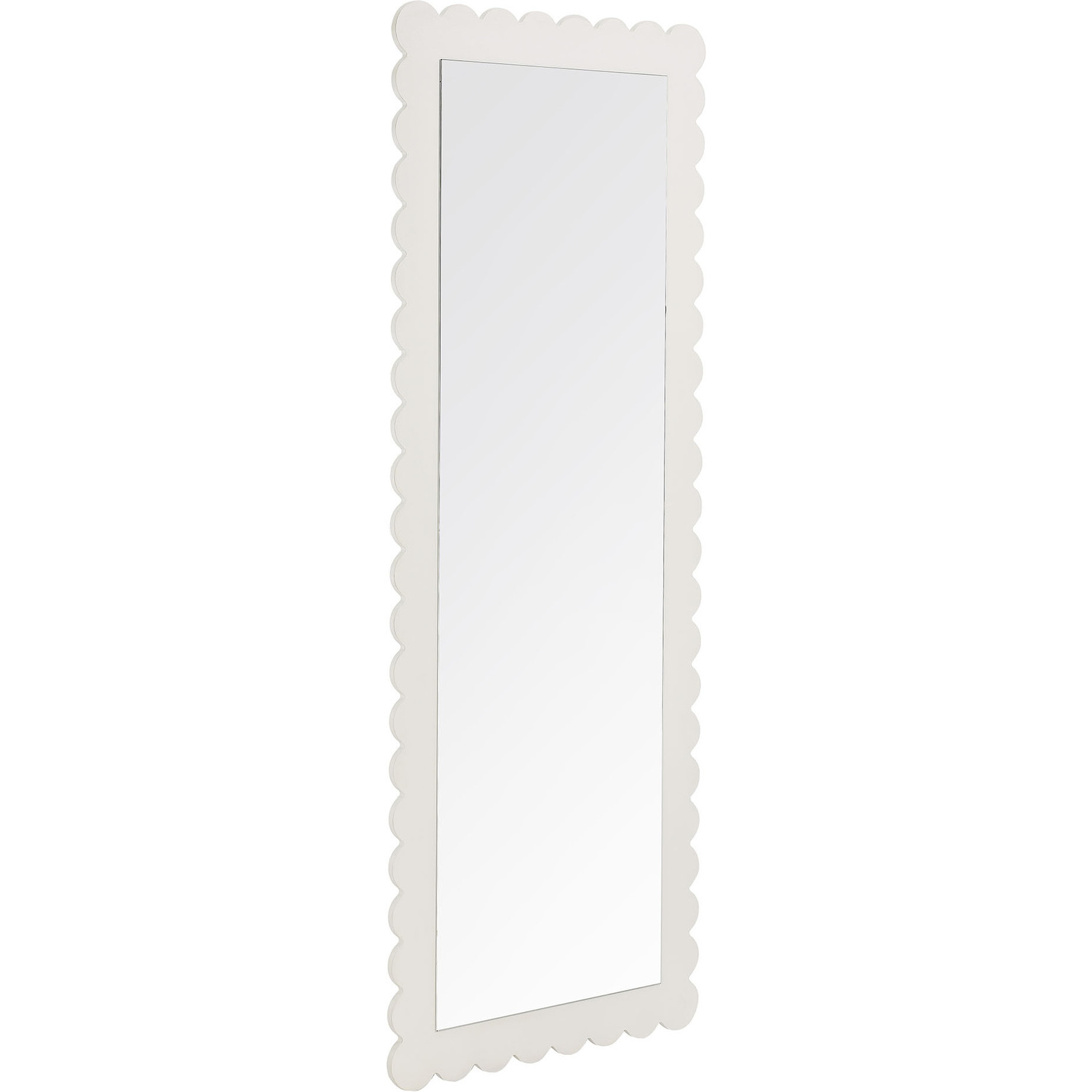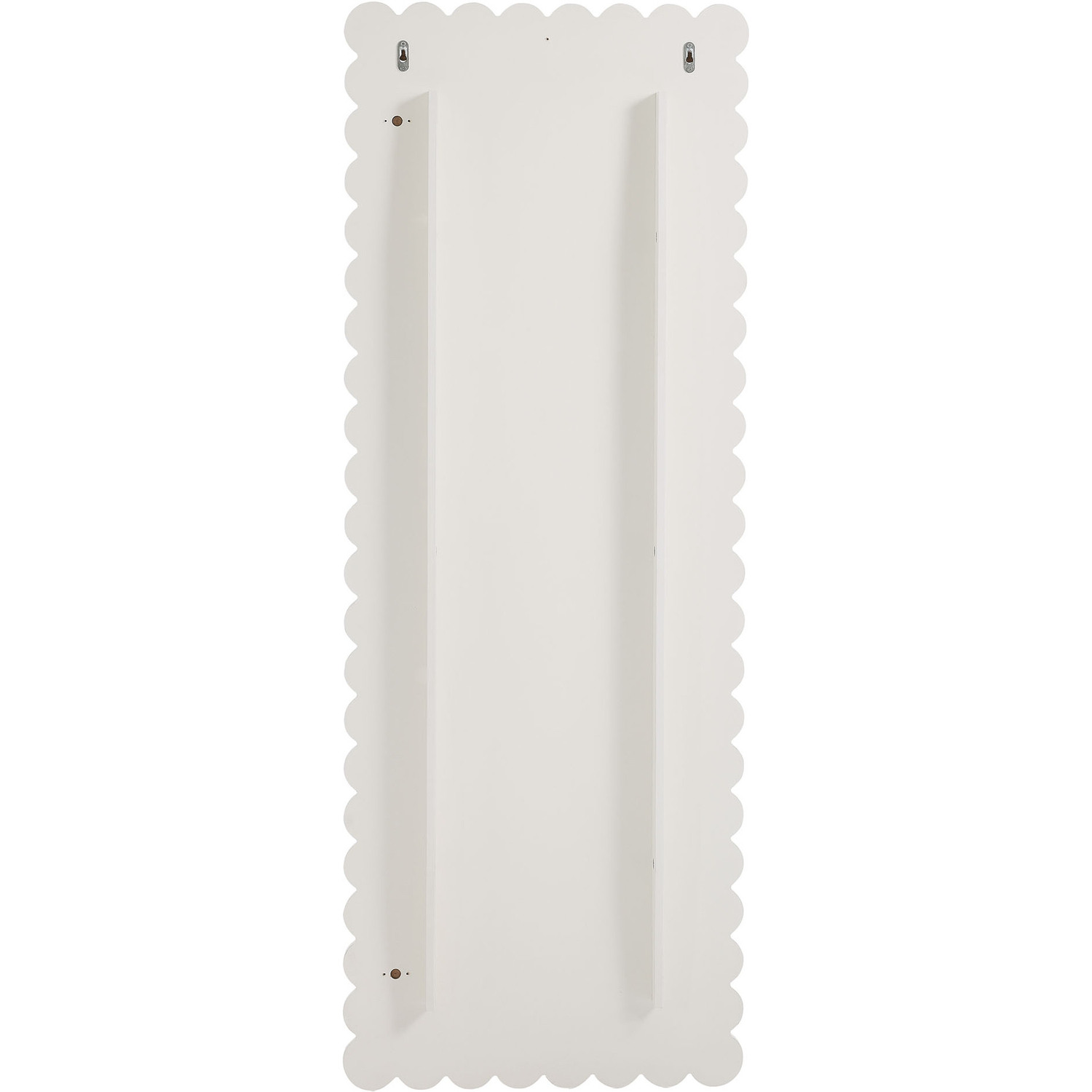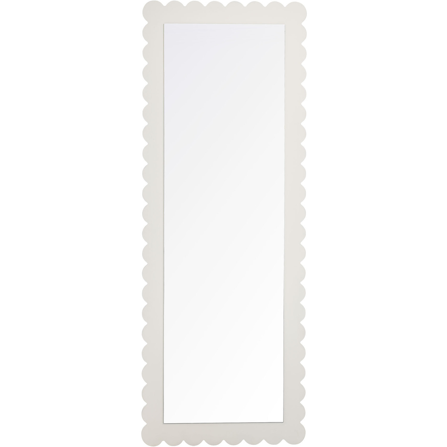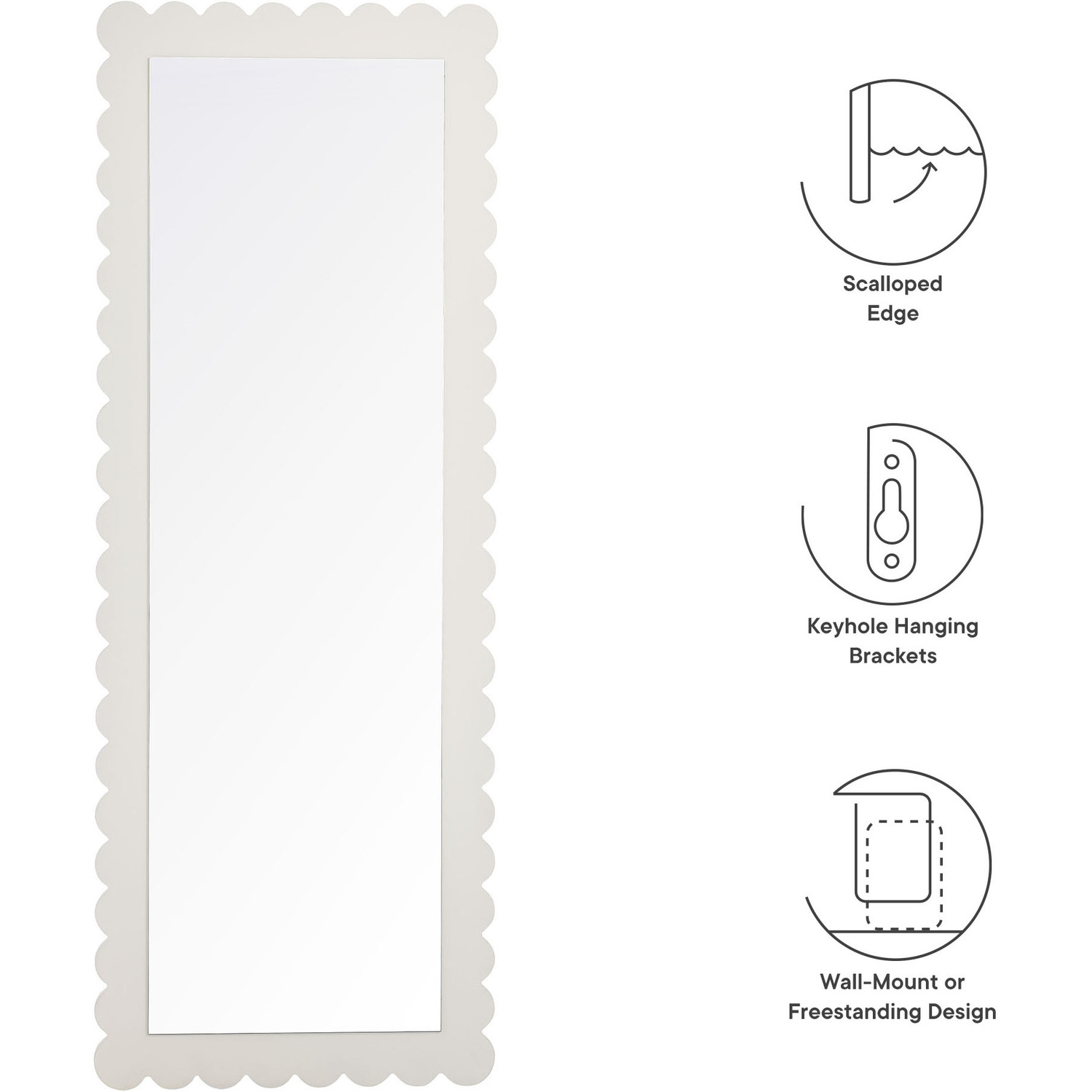 Add a touch of whimsical elegance to your home with the Emmeline Wavy Full-Length Mirror. Featuring a distinctive scalloped edge, this large floor mirror brings a soft, artistic element to any room. Whether mounted on the wall with its keyhole hanging brackets, leaned against it, or used as a standing mirror, the Emmeline mirror offers versatile functionality and style for any bedroom, entryway, or living room. Its full-length design makes it perfect for outfit checks or adding visual depth to your space. With a sturdy frame and a charming scalloped silhouette, this mirror adds a modern, playful touch to your decor. The Emmeline mirror can be wall-mounted for a secure fit or used freestanding, offering flexibility in any setting.Versatile Full-Length Mirror