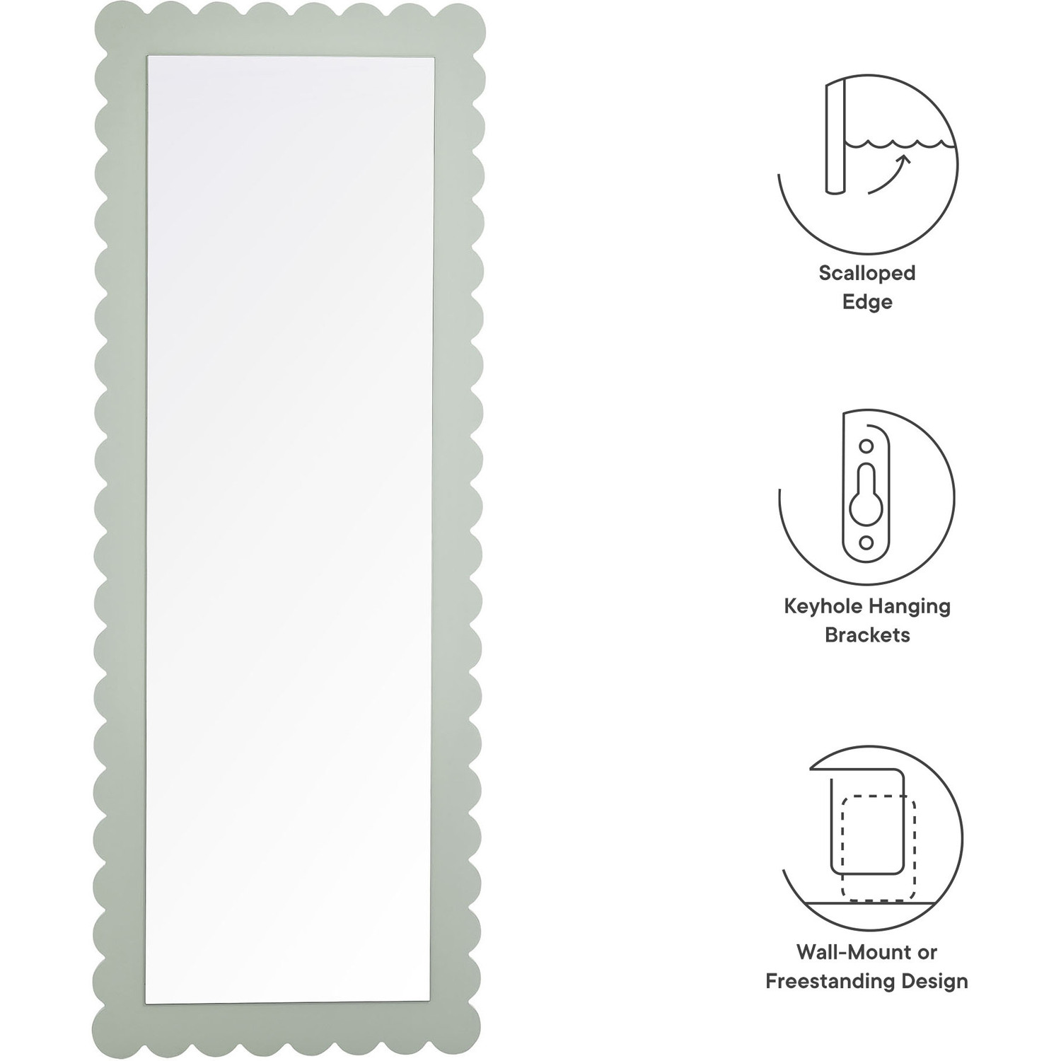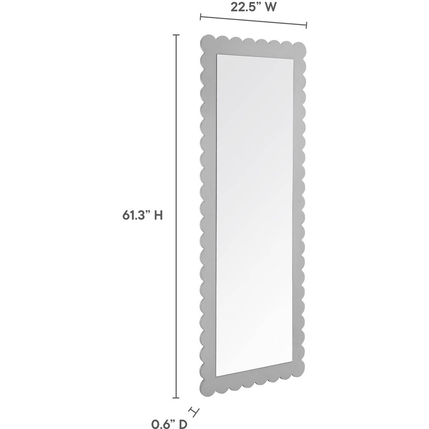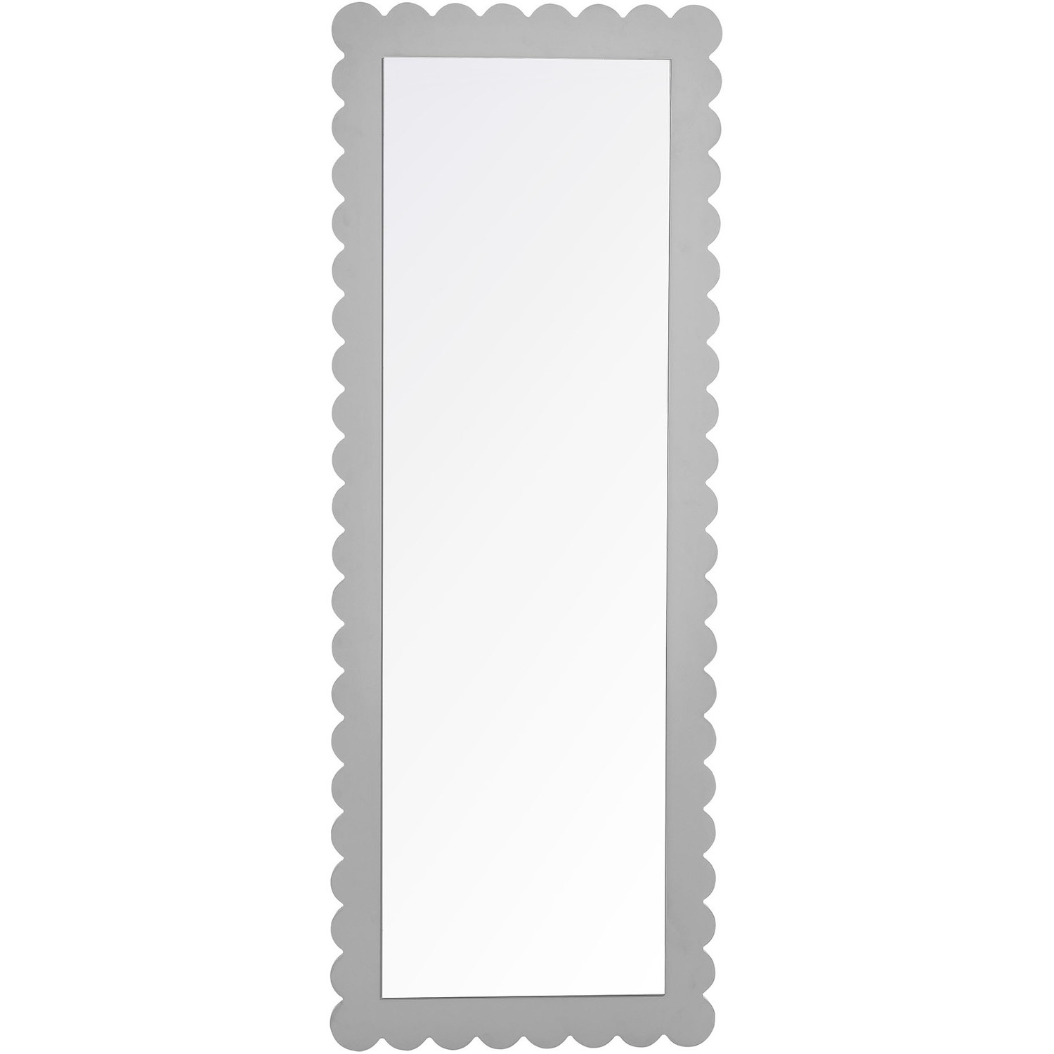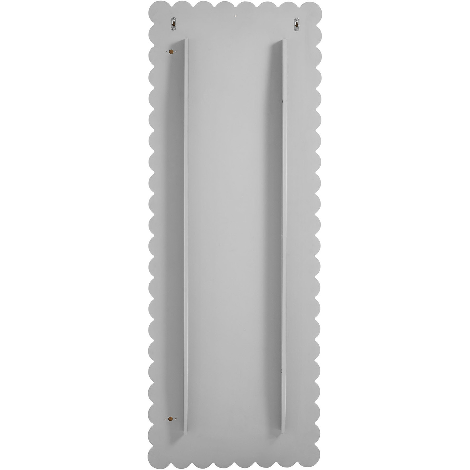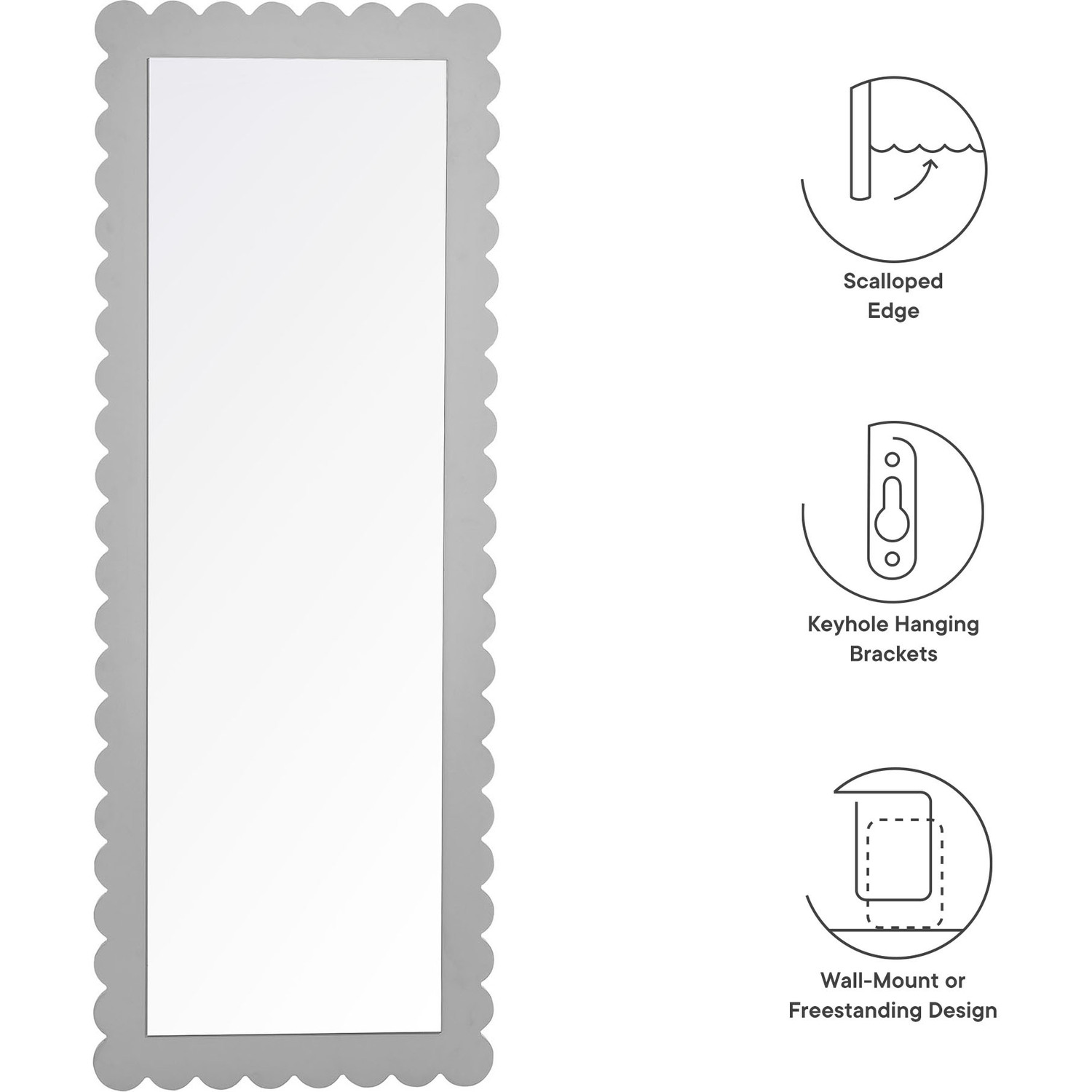 Add a touch of whimsical elegance to your home with the Emmeline Wavy Full-Length Mirror. Featuring a distinctive scalloped edge, this large floor mirror brings a soft, artistic element to any room. Whether mounted on the wall with its keyhole hanging brackets, leaned against it, or used as a standing mirror, the Emmeline mirror offers versatile functionality and style for any bedroom, entryway, or living room. Its full-length design makes it perfect for outfit checks or adding visual depth to your space. With a sturdy frame and a charming scalloped silhouette, this mirror adds a modern, playful touch to your decor. The Emmeline mirror can be wall-mounted for a secure fit or used freestanding, offering flexibility in any setting.Versatile Full-Length Mirror