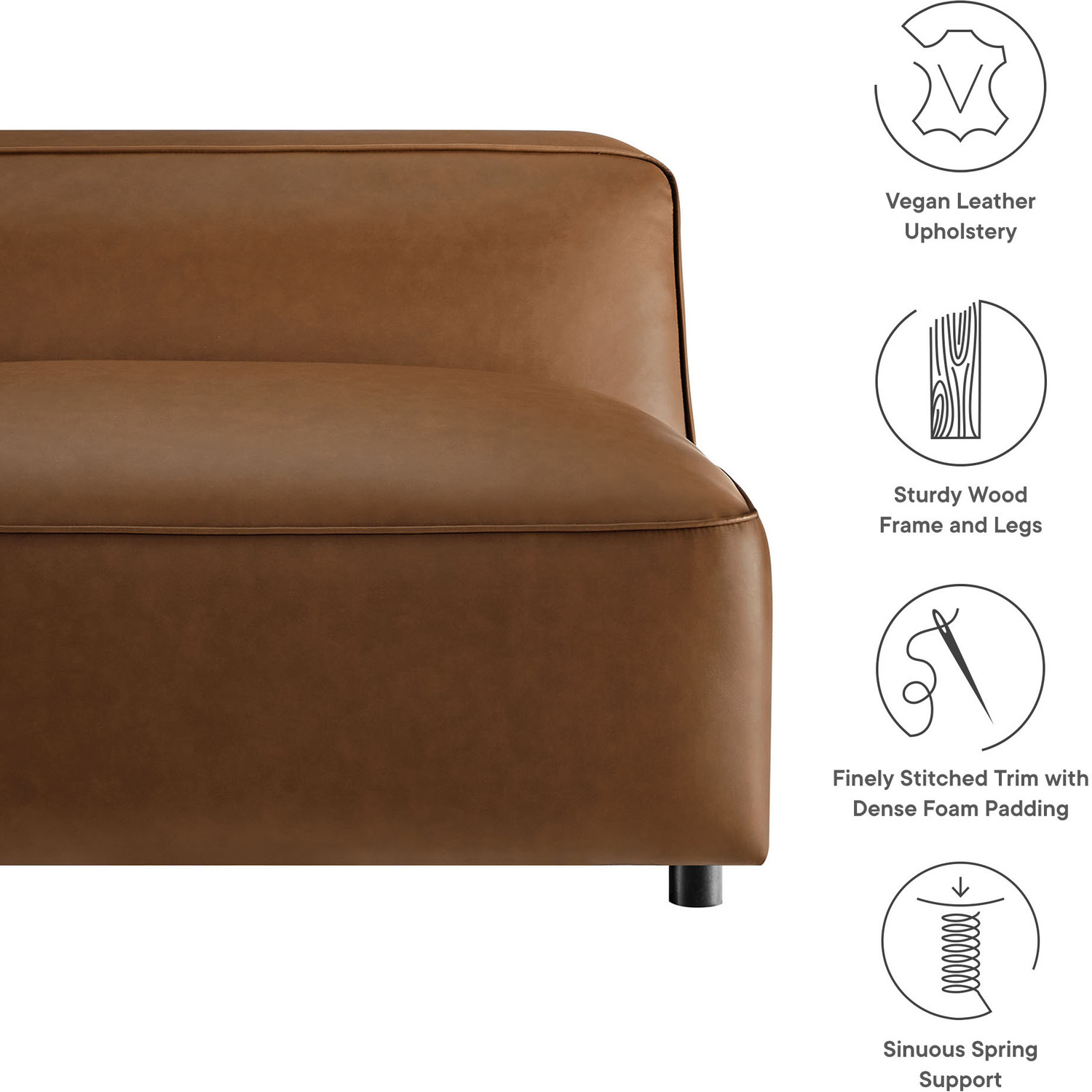 Make your living room feel instantly stylish with the low-key elegance of the Auren Vegan Leather Chair. Wrapped in smooth, high-quality faux leather, this armless chair blends effortlessly into different interior styles, offering subtle charm. The deep seating invites relaxation, while the low backrest and generously cushioned seats create a cozy yet modern aesthetic. Finely stitched trim along the seams adds a tailored finish, while the entire faux leather accent chair is generously padded with dense foam for a soft, supportive feel. Built on a sturdy wood frame, the Auren Slipper Chair features sinuous springs for firm, flexible seating that holds its shape. Plus, this single sofa chair ships fully assembled with just the legs to attach, so you can relax and enjoy it right out of the box. Whether placed alongside your current furniture or paired with other Auren sectional pieces, this faux leather modular chair offers versatile styling options to complete your space. Weight Capacity: 800 lbsVegan Leather Upholstery