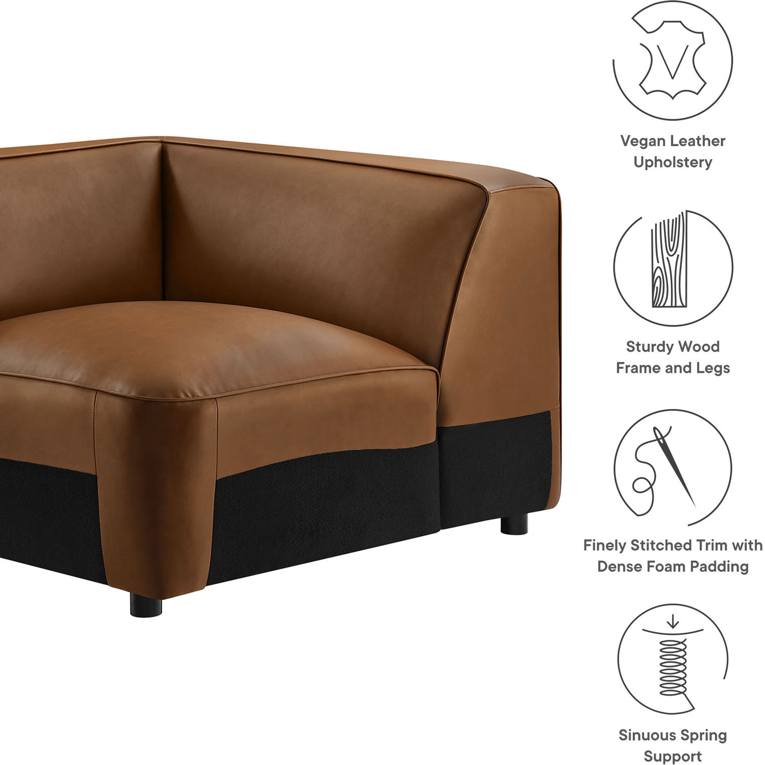 Make your living room feel instantly stylish with the low-key elegance of the Auren Vegan Leather Corner Chair. Part of the Auren Sectional Set, this corner modular chair is wrapped in smooth, high-quality faux leather. Equipped with an alligator clip, this oversized accent chair stays securely in place when connected with other modular pieces. The deep seating invites relaxation, while the low backrest and generously cushioned, armless design create a cozy yet modern aesthetic. Finely stitched trim along the seams adds a tailored finish, while the entire faux leather corner chair is generously padded with dense foam for a soft, supportive feel. Built on a sturdy wood frame, the Auren Single Corner Couch features sinuous springs for firm, flexible seating that holds its shape. Plus, this corner sectional ships fully assembled with just the legs to attach, so you can relax and enjoy it right out of the box. Whether used alone alongside your current furniture, or paired with its matching sectional pieces, this faux leather corner sofa offers versatile styling options to complete your space. Weight Capacity: 800 lbsVegan Leather Upholstery