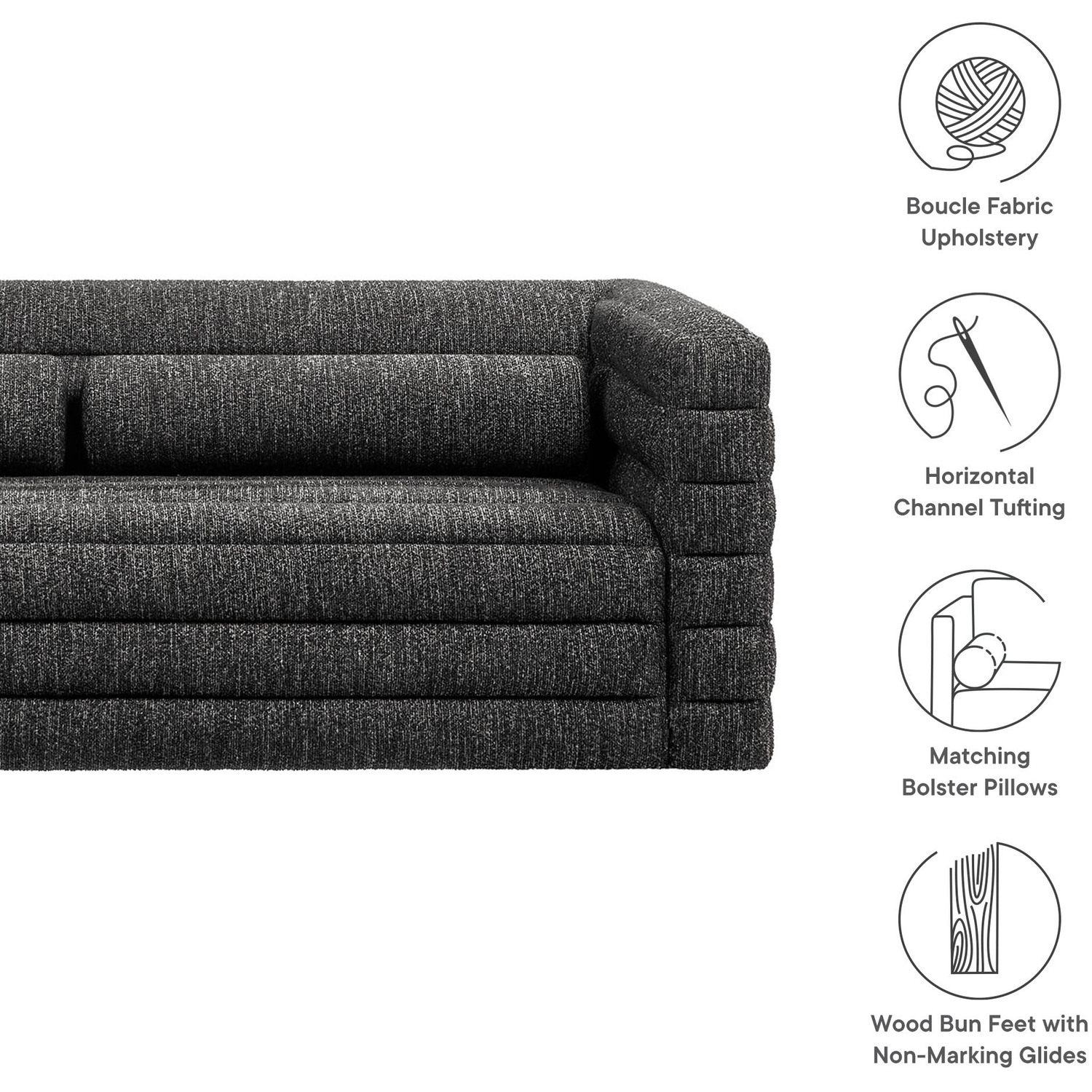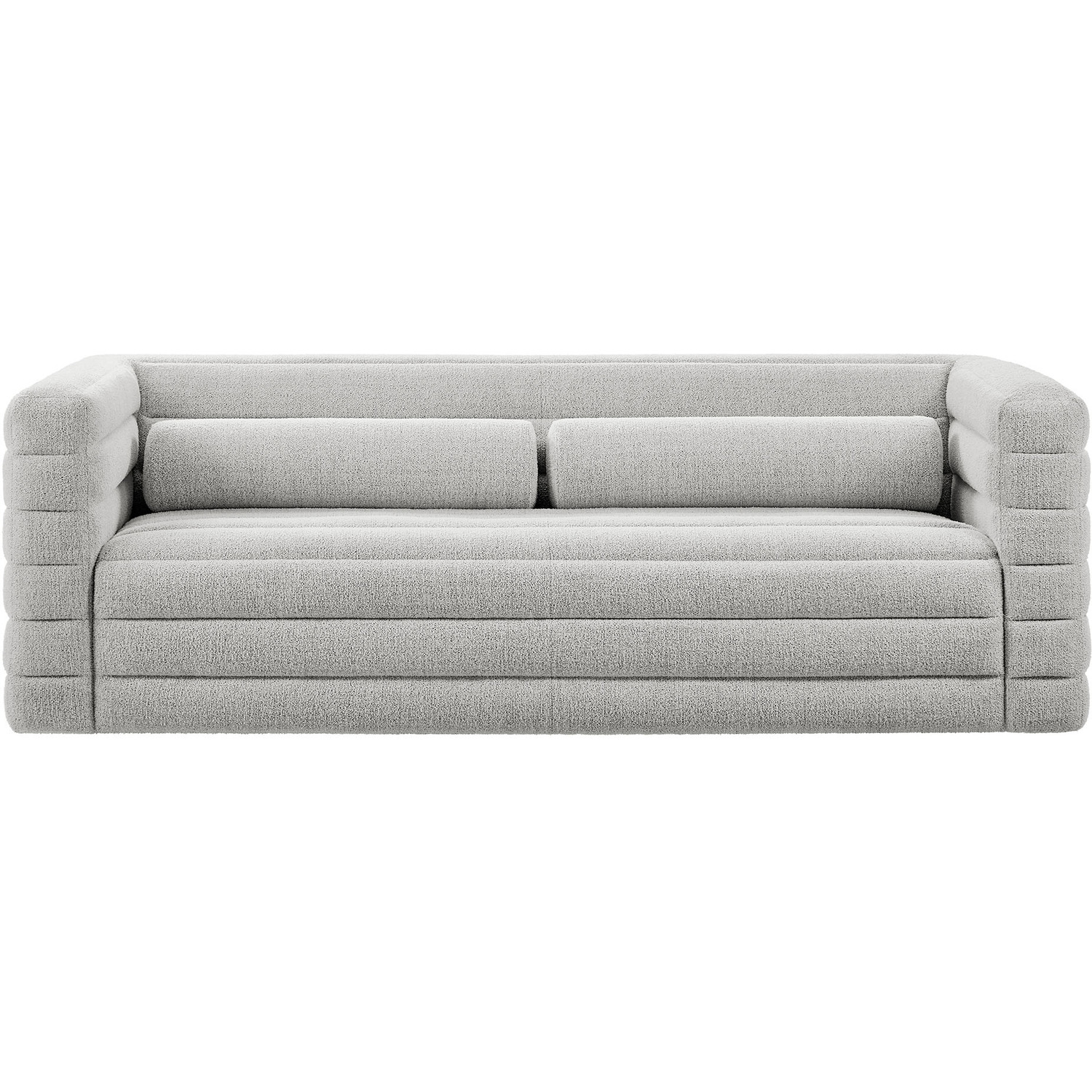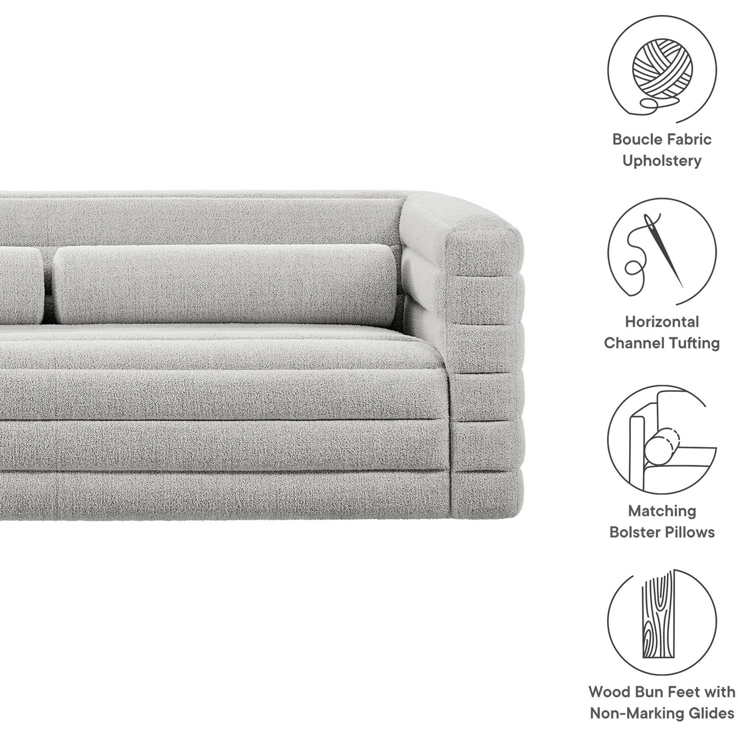Introducing the Relle Boucle Sofa, with its modern lines and cozy, laid-back feel. Wrapped in soft, textured boucle fabric, this 3 seater couch features all-over channel tufting that adds striking visual depth while maintaining an inviting aesthetic. The tufted detailing highlights its retro-inspired form, with two bolster pillows that further accentuate its vintage mid-century charm. Built with a kiln-dried wood frame and reinforced with sinuous springs, the Relle Tufted Sofa provides flexible comfort. Perfect for creating a cozy focal point, its solid wood bun feet with non-marking foot glides ensure this comfortable couch stays in place without damaging your floors. Ideal for a variety of decor styles, the Relle Boucle Sofa offers a sophisticated, timeless piece for any living room or cozy corner. Assembly required. Weight Capacity: 800 lbs.Textured Boucle Fabric