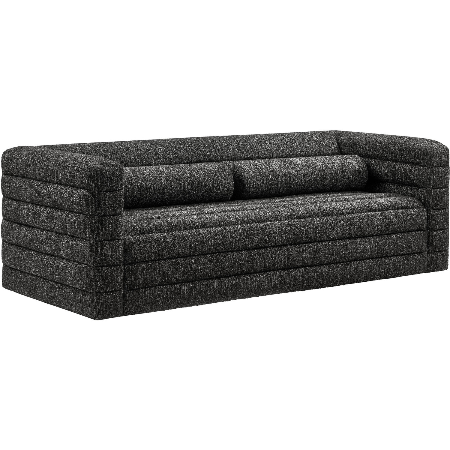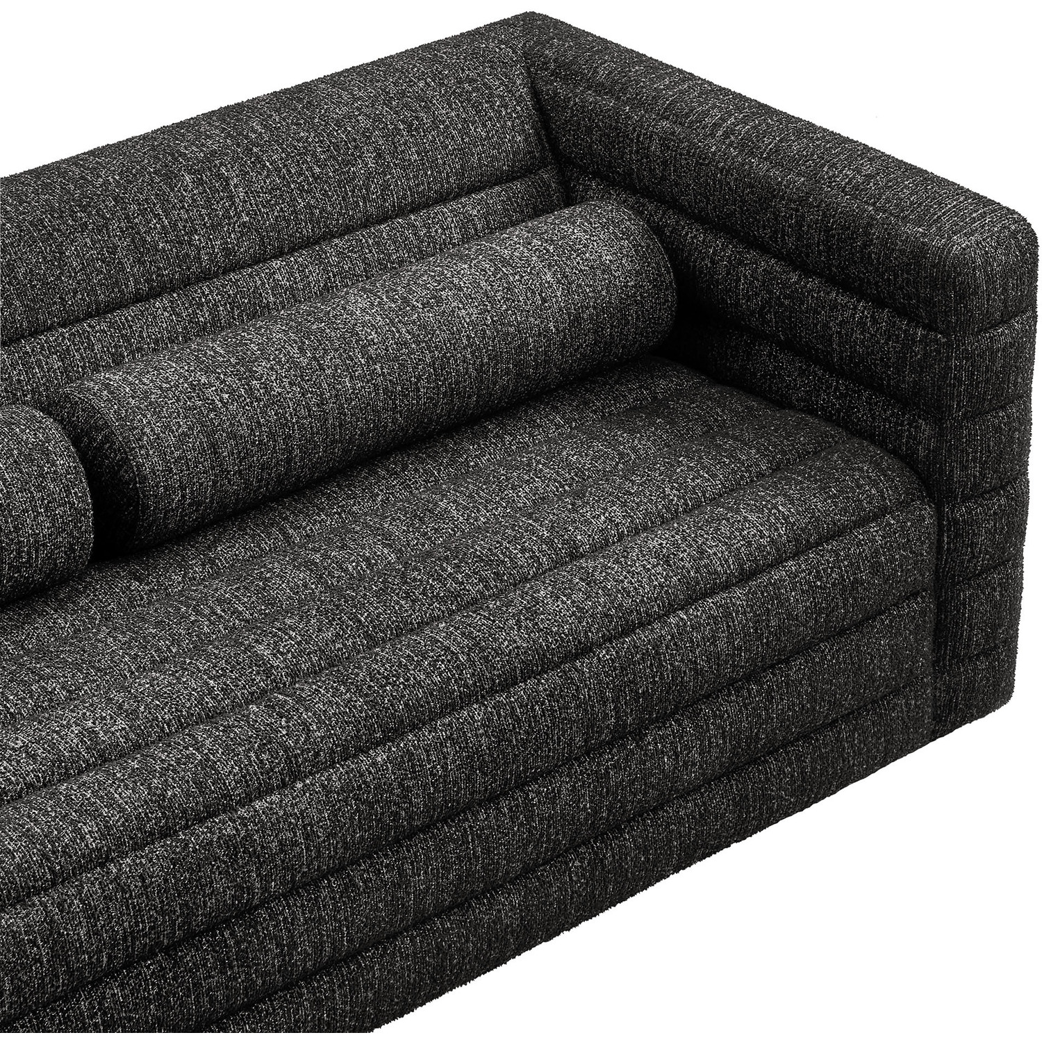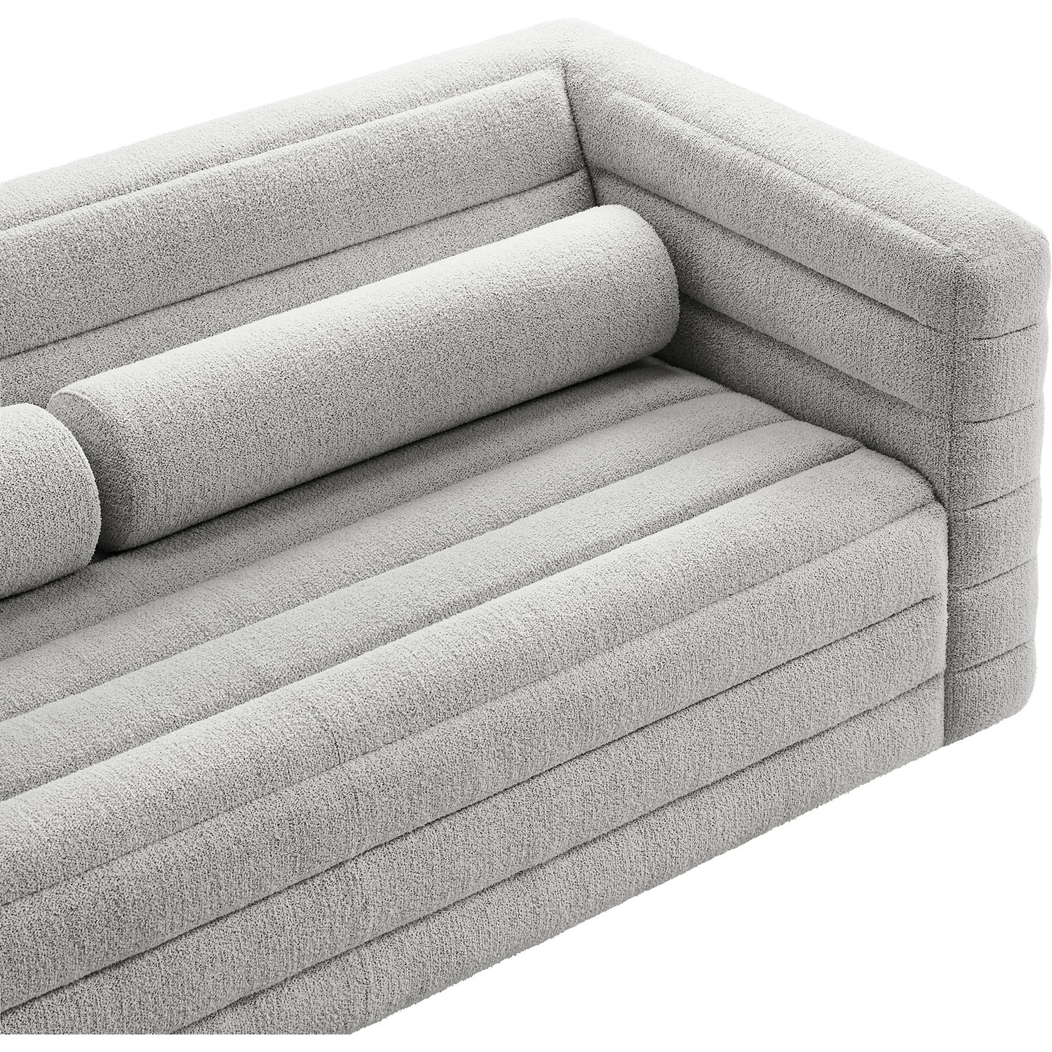 Introducing the Relle Boucle Sofa, with its modern lines and cozy, laid-back feel. Wrapped in soft, textured boucle fabric, this 3 seater couch features all-over channel tufting that adds striking visual depth while maintaining an inviting aesthetic. The tufted detailing highlights its retro-inspired form, with two bolster pillows that further accentuate its vintage mid-century charm. Built with a kiln-dried wood frame and reinforced with sinuous springs, the Relle Tufted Sofa provides flexible comfort. Perfect for creating a cozy focal point, its solid wood bun feet with non-marking foot glides ensure this comfortable couch stays in place without damaging your floors. Ideal for a variety of decor styles, the Relle Boucle Sofa offers a sophisticated, timeless piece for any living room or cozy corner. Assembly required. Weight Capacity: 800 lbs.Textured Boucle Fabric