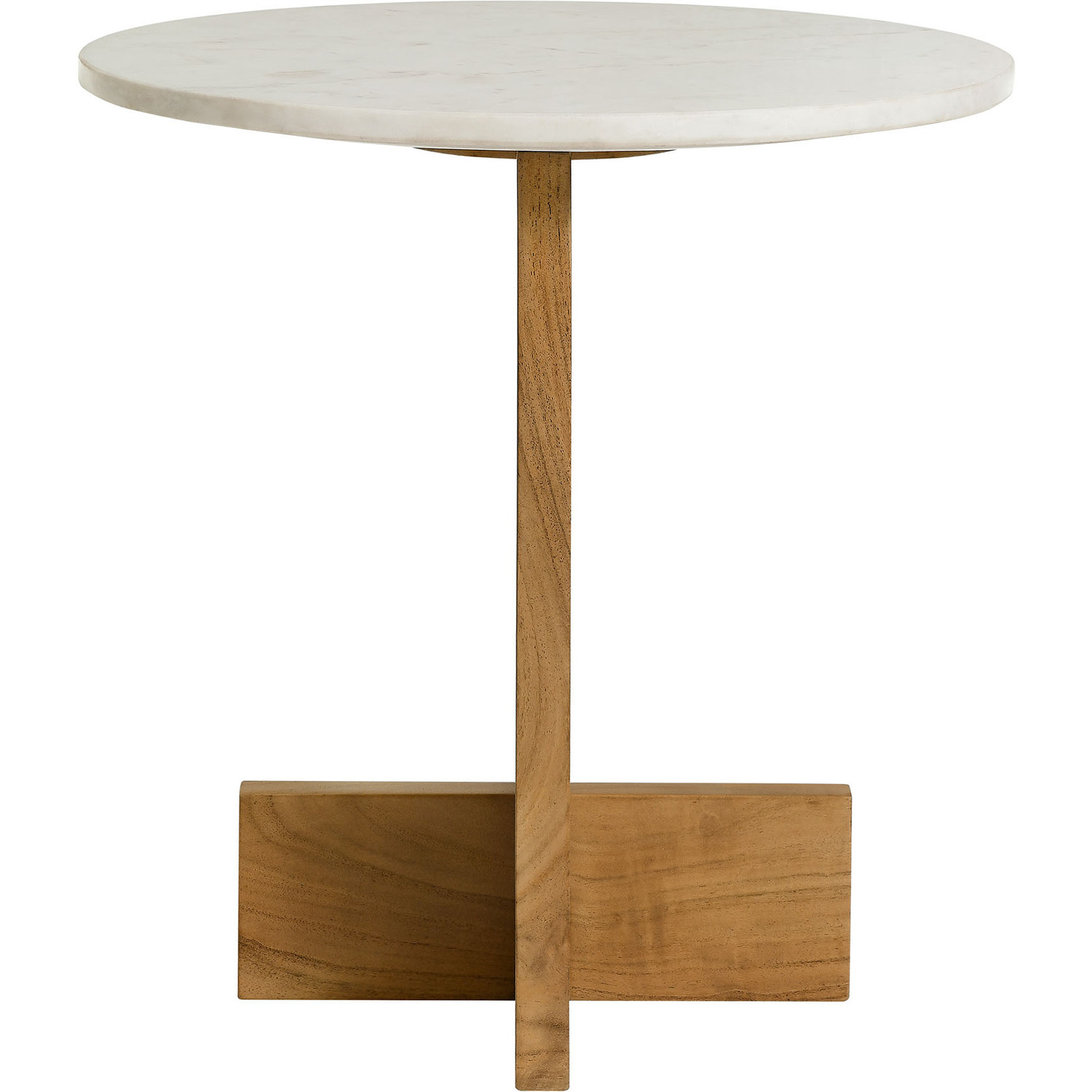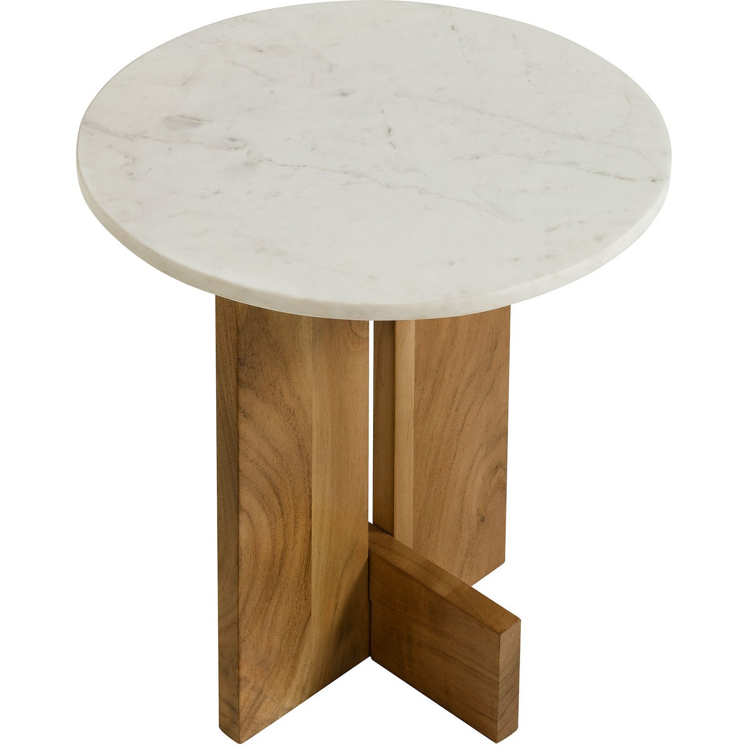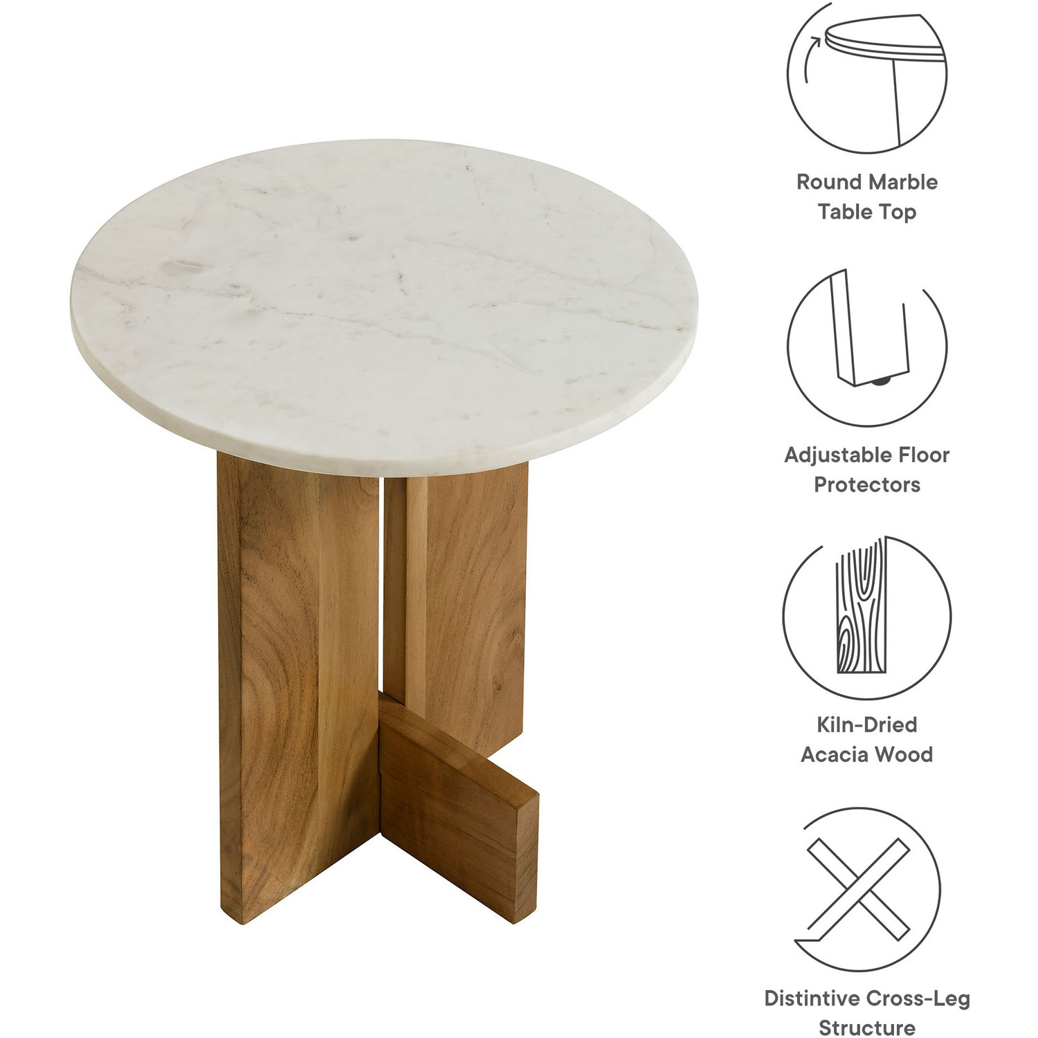 Revitalize your space with the classic-meets-modern design of the Tarin Round Side Table. Featuring a solid marble top that exudes elegance while resting on sturdy acacia wood legs, this marble round table complements a variety of interiors from mid-century modern to minimalist. The accent table's distinctive base highlights the natural beauty of wood, with its crossbeam-style legs featuring wide, flat ends that extend outward for a sturdy and grounded look. Perfect as a marble end table for the living room or an accent table in the bedroom, Tarin pairs natural elements with a chic, updated look. Designed for versatility, it also works beautifully as a modern drink table, side cocktail table, or even a marble plant table. However you choose to use it, Tarin comes with adjustable floor protectors for added stability while safeguarding your floors from scratches. Assembly required. Weight Capacity: 33 lbs.Marble Table Top