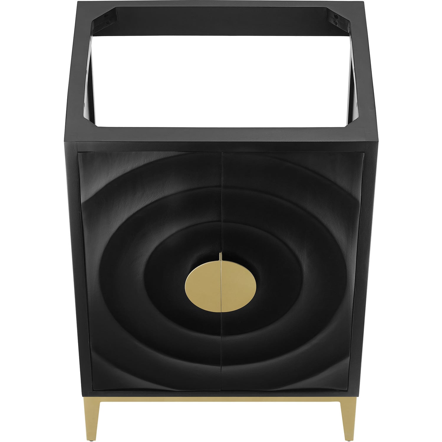 Refresh your bathroom's look with the Beau Wood 24” Bathroom Vanity, combining modern design with a classic sense of style. Made from solid wood, it offers both durability and a rich texture that complements any decor. Featuring an eye-catching design with concentric circles that draw the eye inward to a chic, brass-like metal cabinet pulls, this single bathroom vanity pairs classic elegance with contemporary flair. Standing on tapered legs that match the pulls, the Beau wood bathroom vanity creates a cohesive and sophisticated look. Inside, an adjustable shelf cleverly uses the available space while accommodating plumbing with its thoughtful cut-out design. Ideal for those who prefer to personalize their space, this cabinet vanity comes without a basin, allowing you to choose the perfect top. Whether it’s for a compact or more spacious bathroom, Beau blends aesthetic charm with everyday usability making it a smart yet fashionable choice for modern living. Assembly required. Sink basin not included.24” Bathroom Vanity (Sink Not Included)