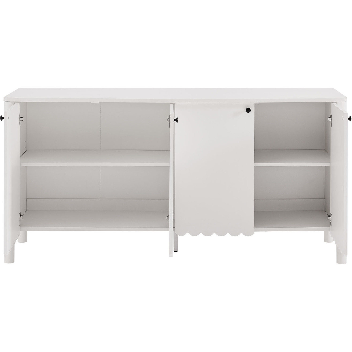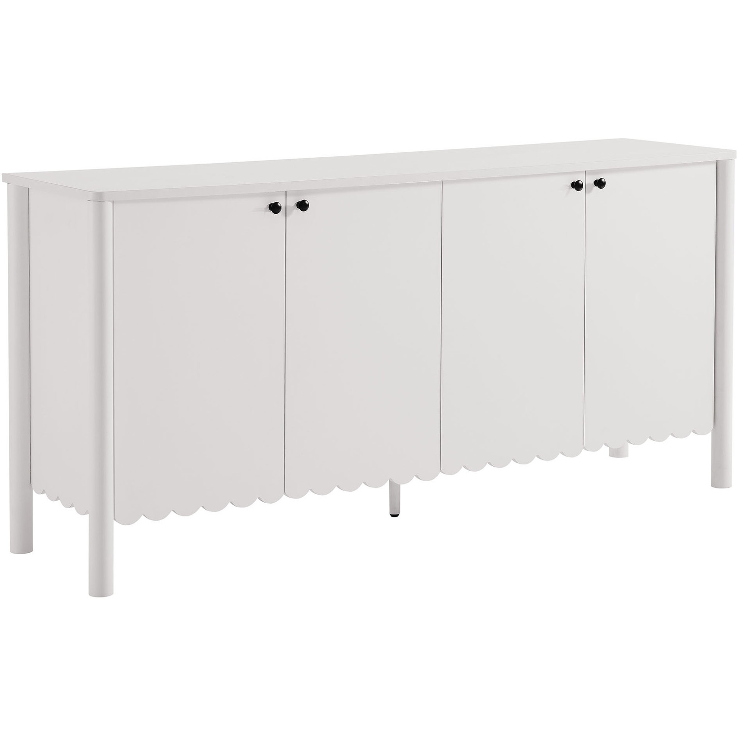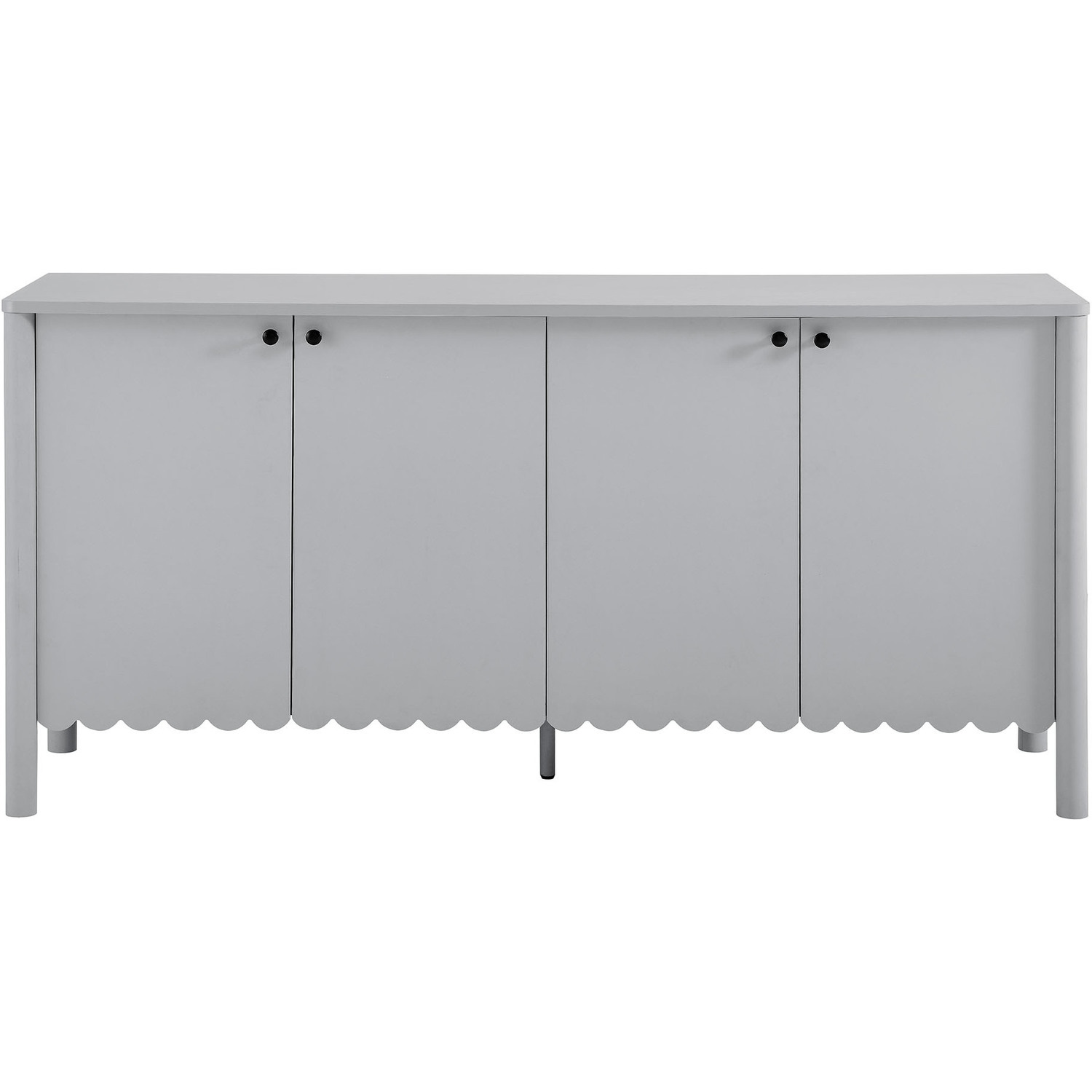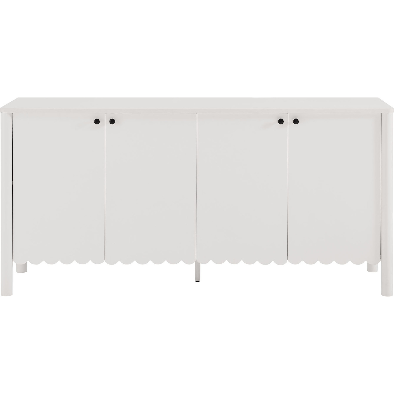 An elegant blend of subtle curves and practical storage, the Emmeline 4-Door Wavy Sideboard Cabinet adds a touch of artistic flair to any room. Its standout feature—a scalloped bottom edge—creates a soft, flowing silhouette that enhances the modern simplicity of the design. Behind its four soft-close doors, adjustable shelves provide flexible storage space, ideal for organizing dining essentials, decor, or media accessories. Crafted with a sturdy frame and finished in smooth laminate, this wide farmhouse sideboard is as functional as it is stylish. The round door knobs and non-marking glides add to its refined appearance, while ensuring your floors remain protected. Whether serving as a modern sideboard, accent cabinet, or entryway console with storage, Emmeline brings a contemporary, polished look to hallways, dining rooms, or living spaces. Assembly required.Versatile Storage Cabinet