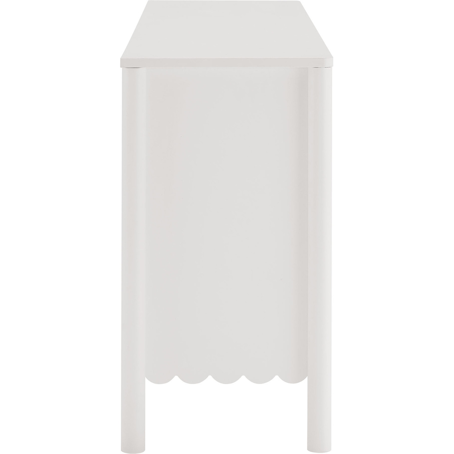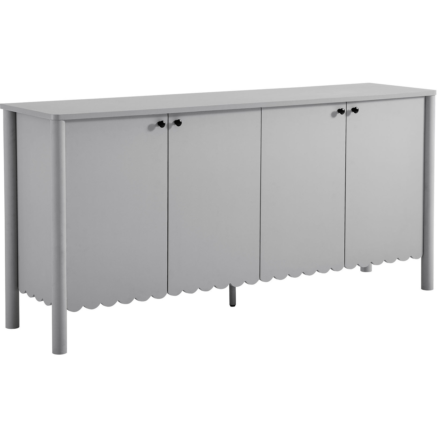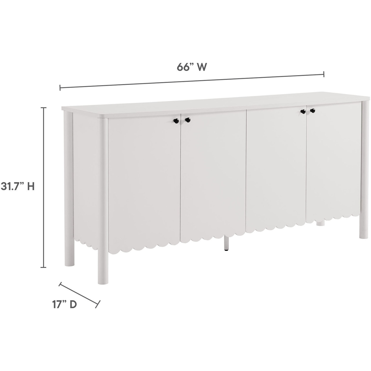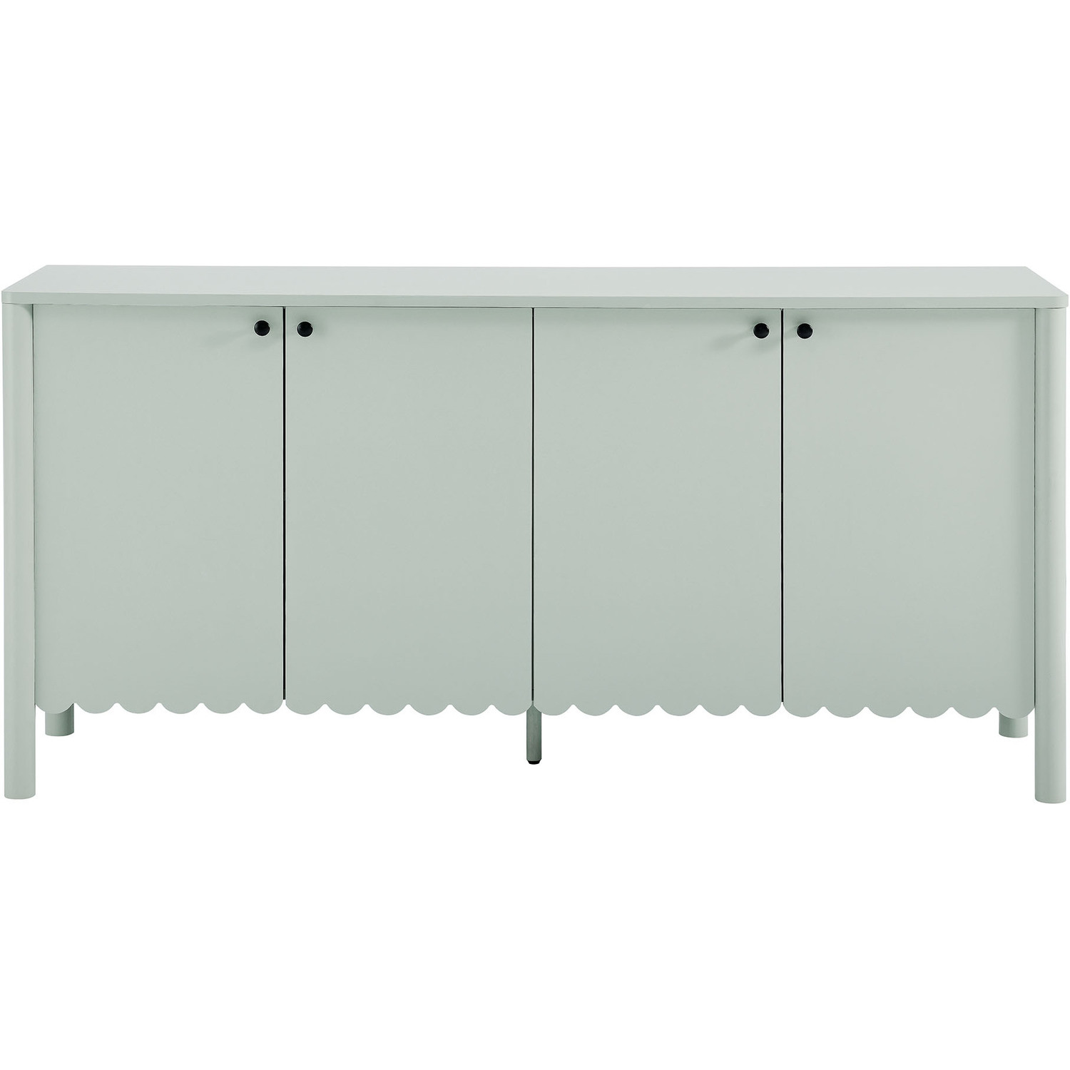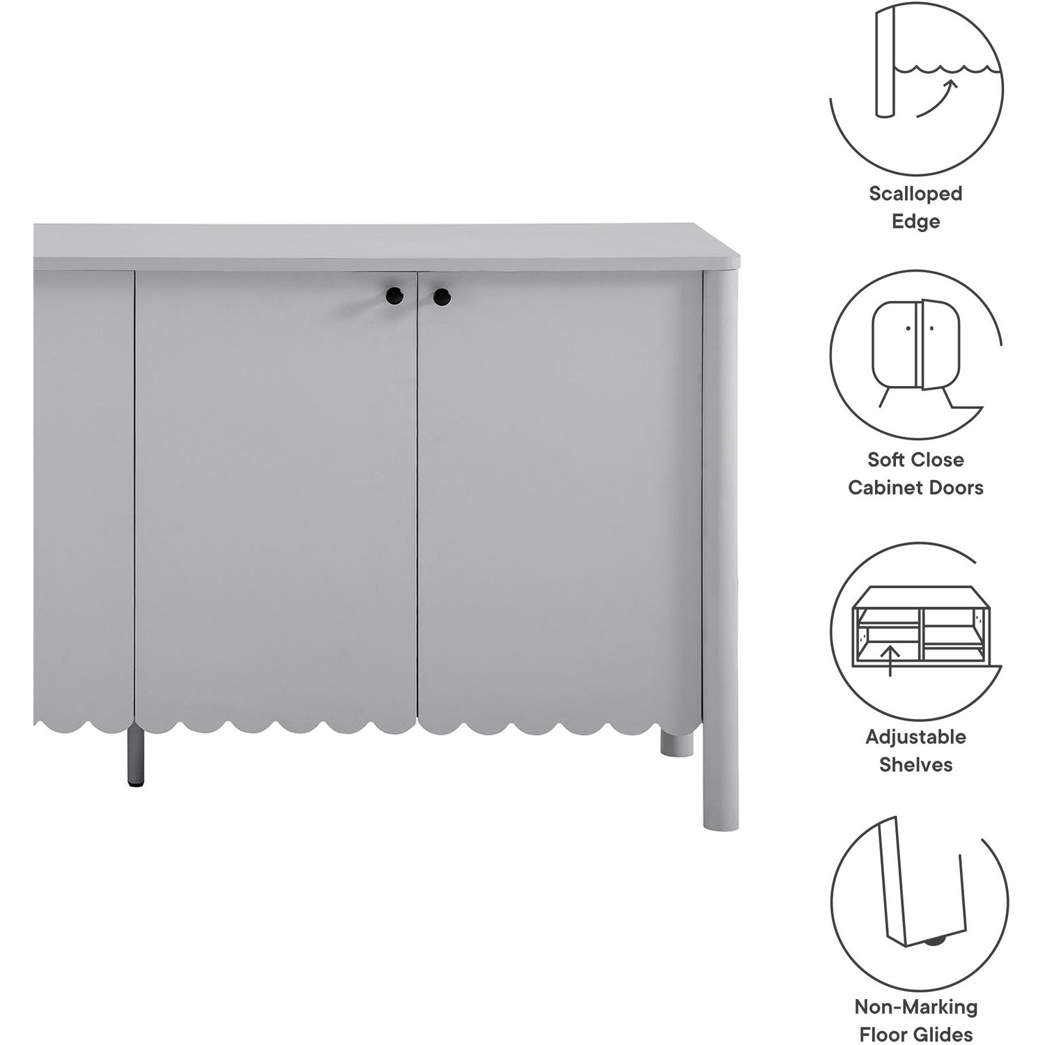An elegant blend of subtle curves and practical storage, the Emmeline 4-Door Wavy Sideboard Cabinet adds a touch of artistic flair to any room. Its standout feature—a scalloped bottom edge—creates a soft, flowing silhouette that enhances the modern simplicity of the design. Behind its four soft-close doors, adjustable shelves provide flexible storage space, ideal for organizing dining essentials, decor, or media accessories. Crafted with a sturdy frame and finished in smooth laminate, this wide farmhouse sideboard is as functional as it is stylish. The round door knobs and non-marking glides add to its refined appearance, while ensuring your floors remain protected. Whether serving as a modern sideboard, accent cabinet, or entryway console with storage, Emmeline brings a contemporary, polished look to hallways, dining rooms, or living spaces. Assembly required.Versatile Storage Cabinet