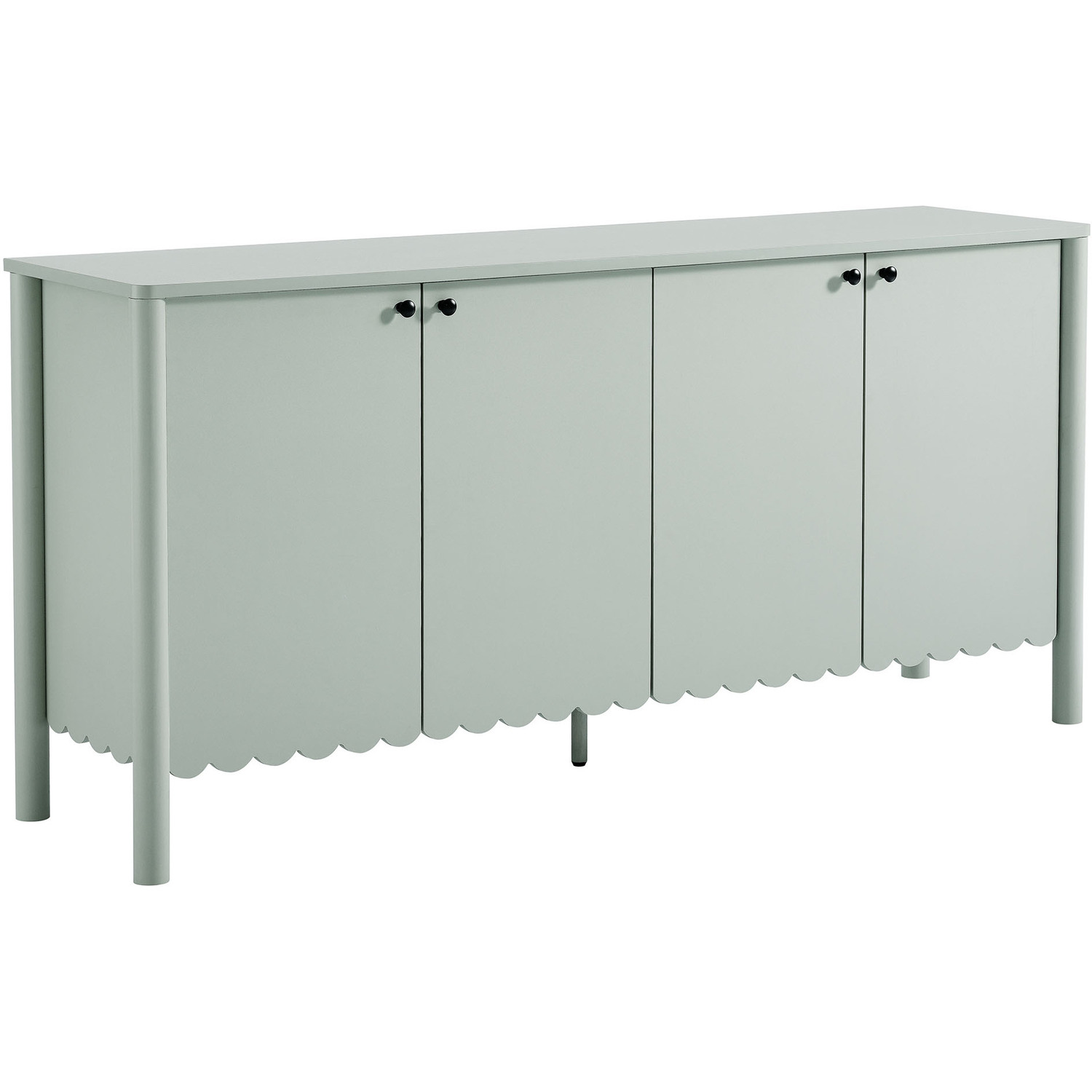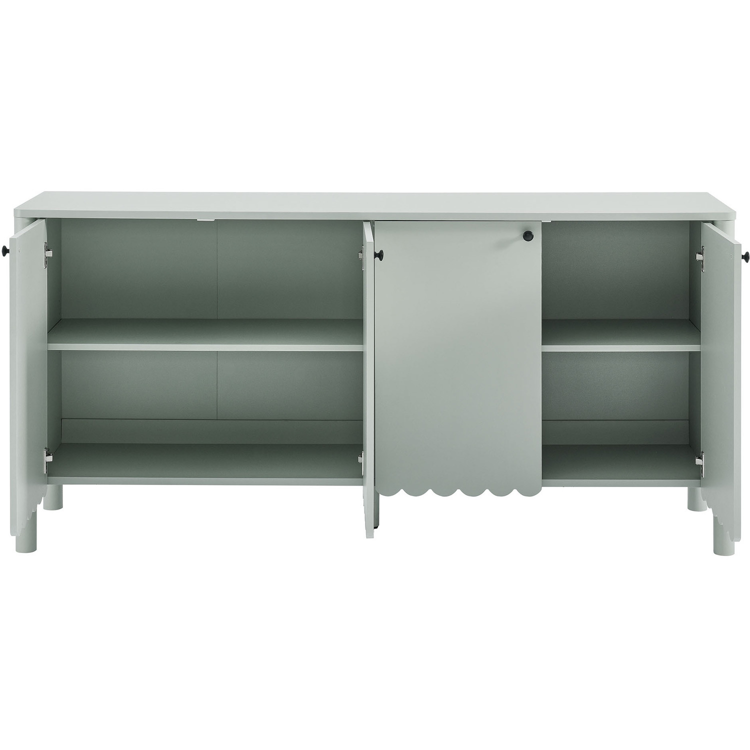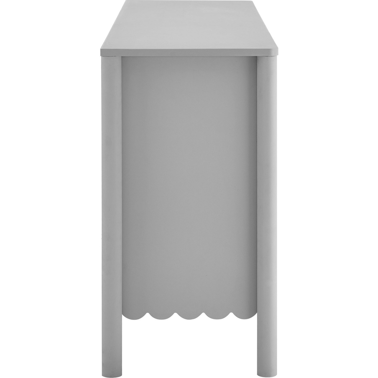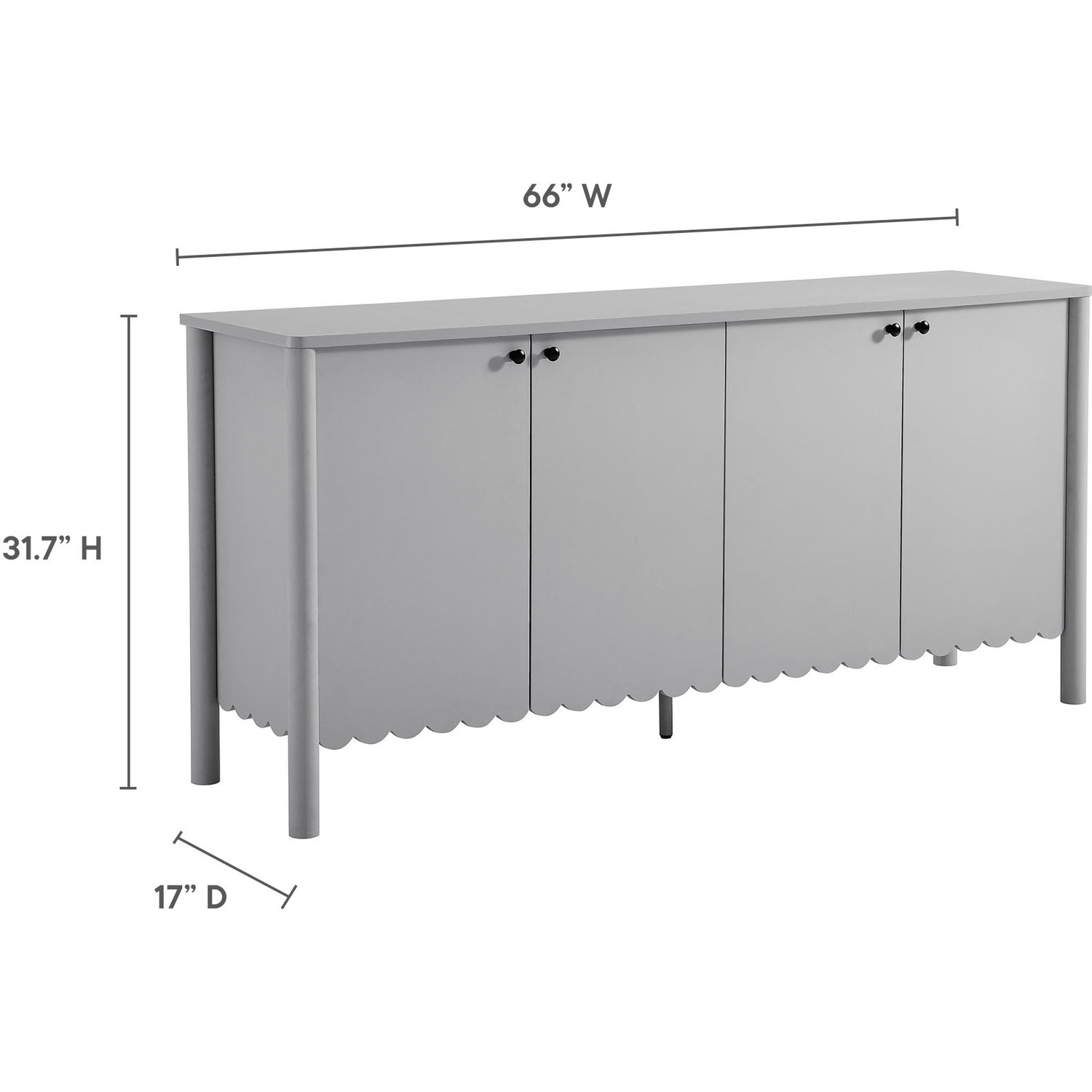 An elegant blend of subtle curves and practical storage, the Emmeline 4-Door Wavy Sideboard Cabinet adds a touch of artistic flair to any room. Its standout feature—a scalloped bottom edge—creates a soft, flowing silhouette that enhances the modern simplicity of the design. Behind its four soft-close doors, adjustable shelves provide flexible storage space, ideal for organizing dining essentials, decor, or media accessories. Crafted with a sturdy frame and finished in smooth laminate, this wide farmhouse sideboard is as functional as it is stylish. The round door knobs and non-marking glides add to its refined appearance, while ensuring your floors remain protected. Whether serving as a modern sideboard, accent cabinet, or entryway console with storage, Emmeline brings a contemporary, polished look to hallways, dining rooms, or living spaces. Assembly required.Versatile Storage Cabinet
