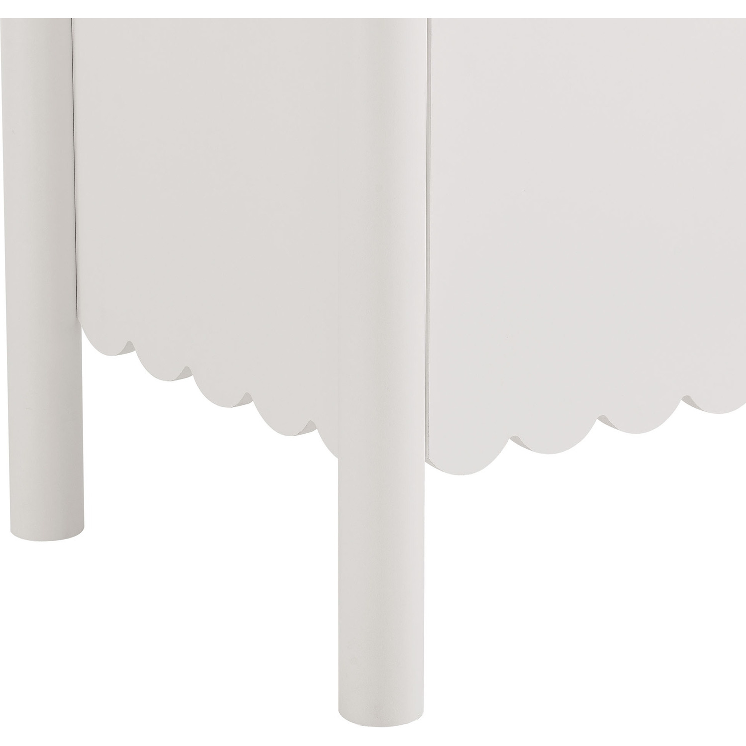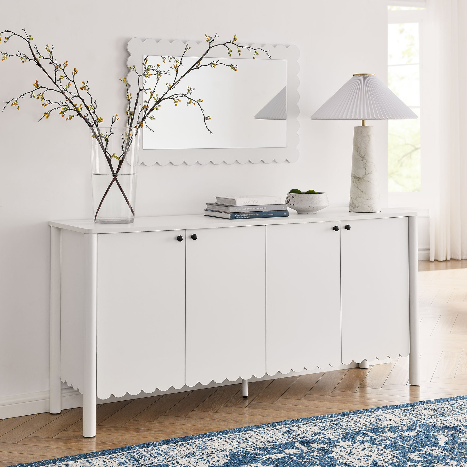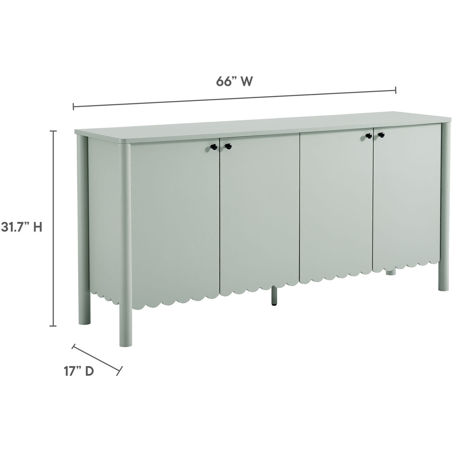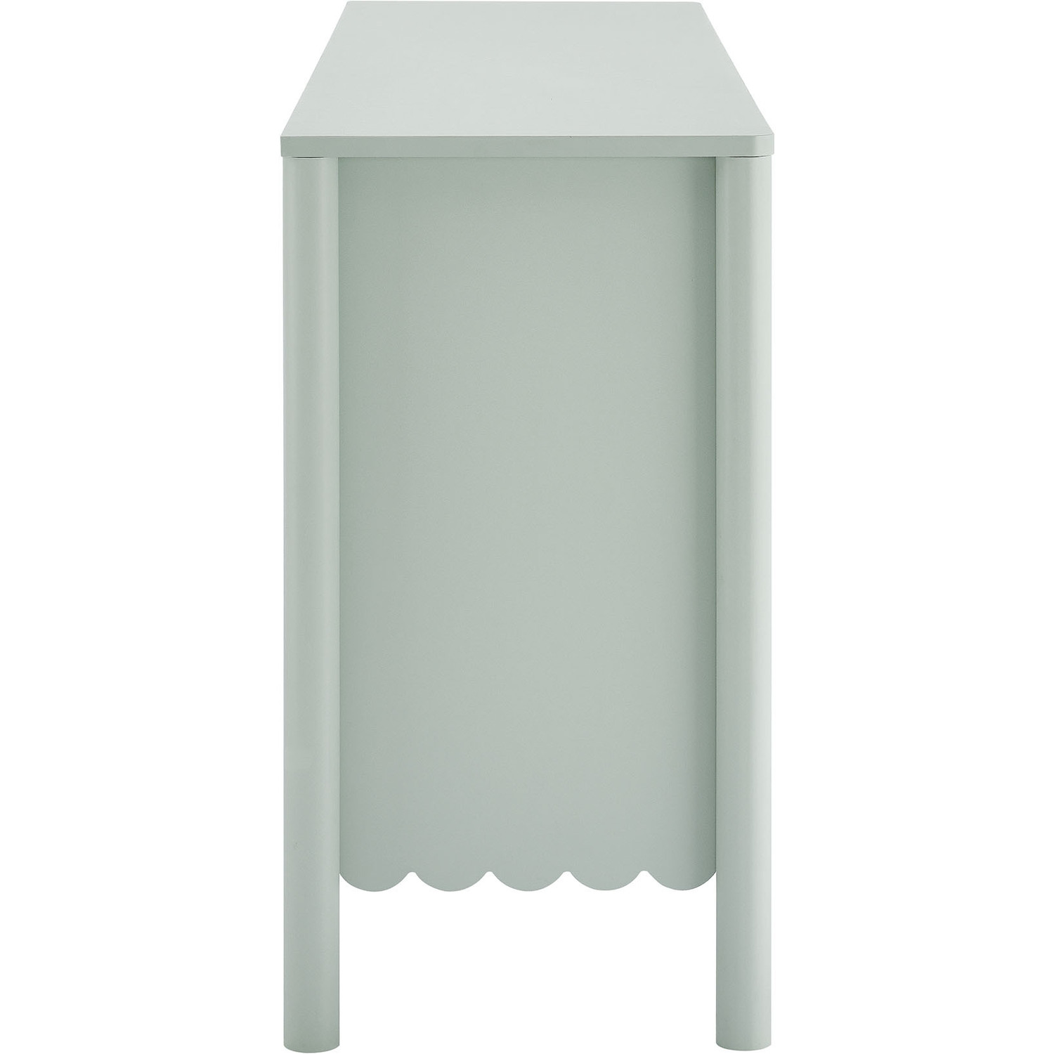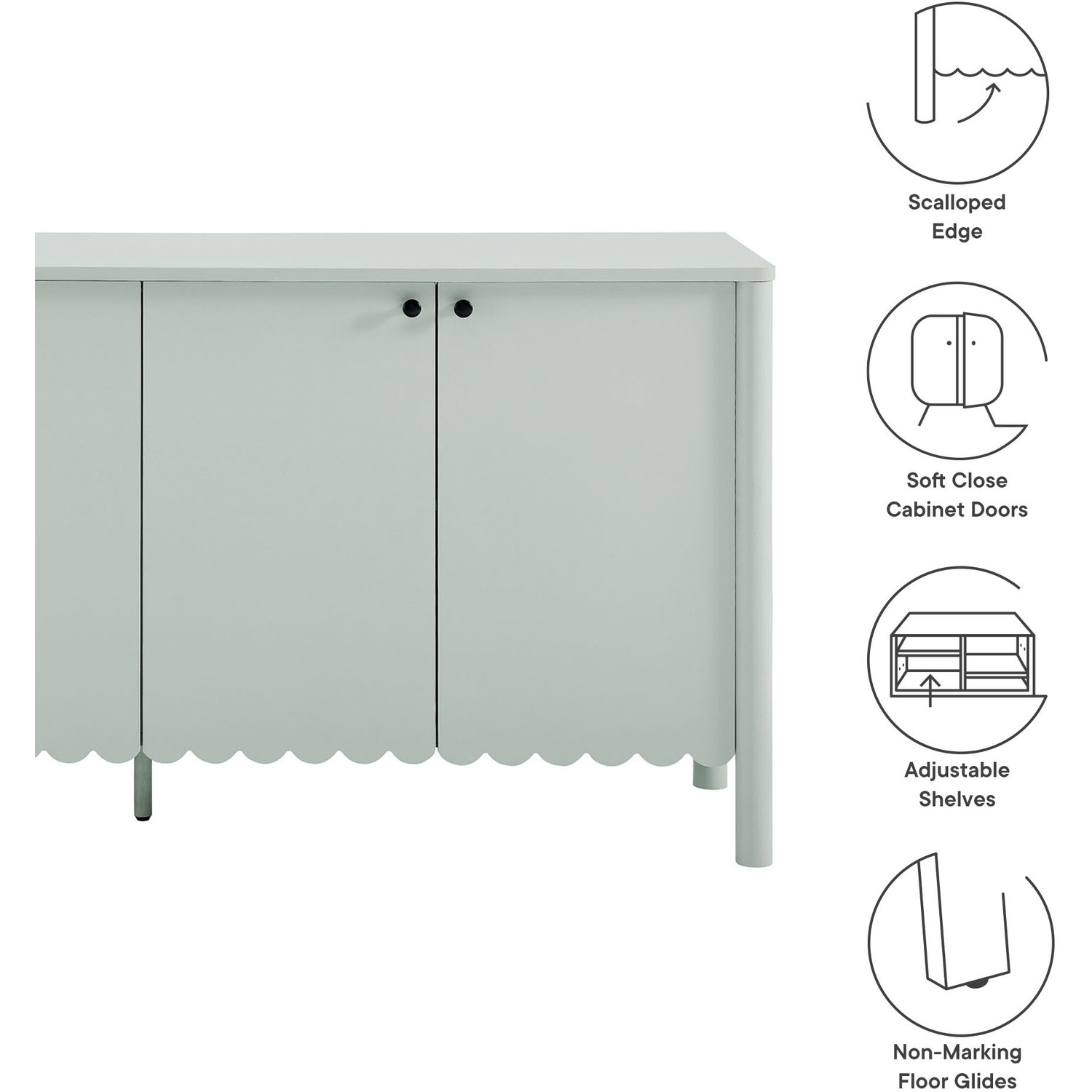 An elegant blend of subtle curves and practical storage, the Emmeline 4-Door Wavy Sideboard Cabinet adds a touch of artistic flair to any room. Its standout feature—a scalloped bottom edge—creates a soft, flowing silhouette that enhances the modern simplicity of the design. Behind its four soft-close doors, adjustable shelves provide flexible storage space, ideal for organizing dining essentials, decor, or media accessories. Crafted with a sturdy frame and finished in smooth laminate, this wide farmhouse sideboard is as functional as it is stylish. The round door knobs and non-marking glides add to its refined appearance, while ensuring your floors remain protected. Whether serving as a modern sideboard, accent cabinet, or entryway console with storage, Emmeline brings a contemporary, polished look to hallways, dining rooms, or living spaces. Assembly required.Versatile Storage Cabinet