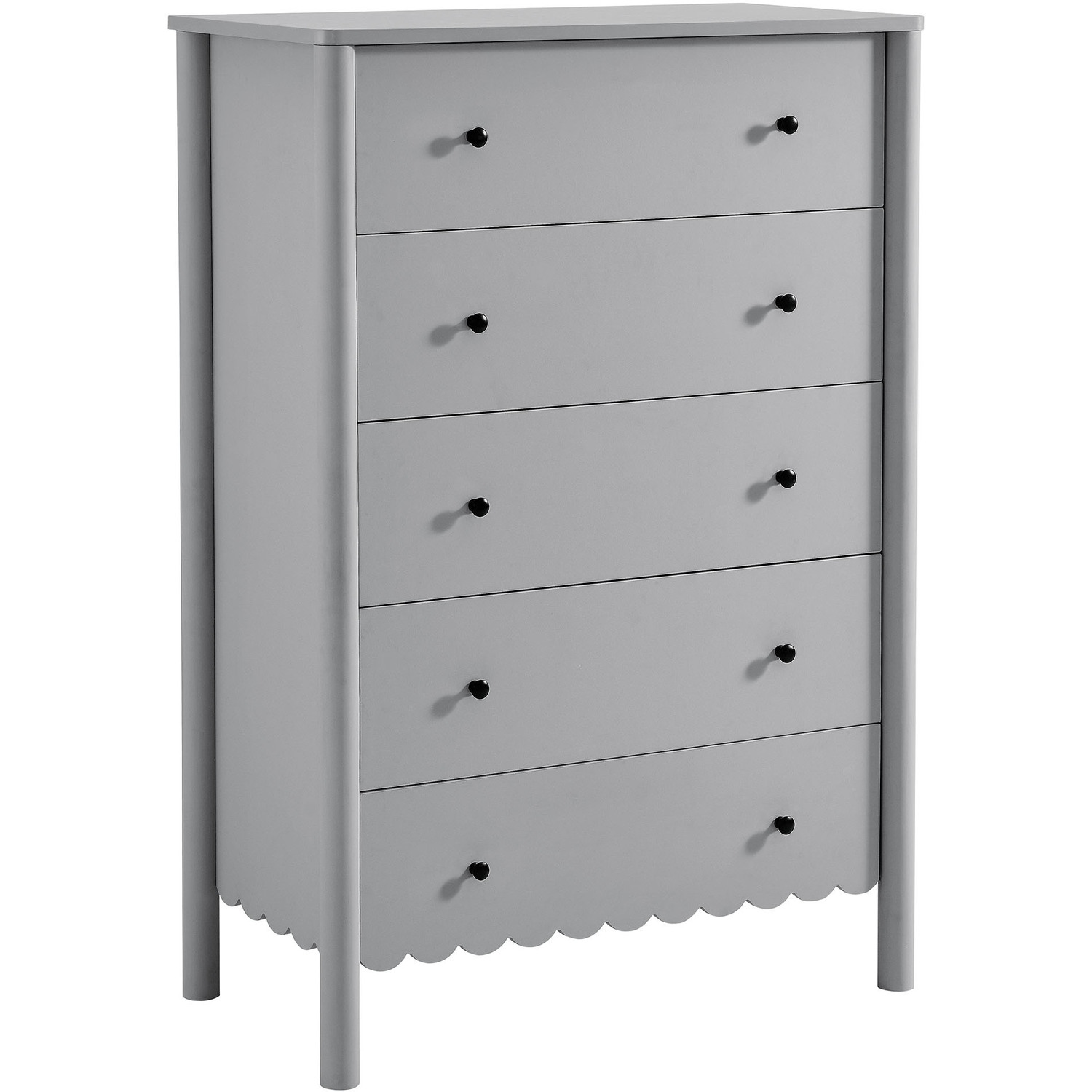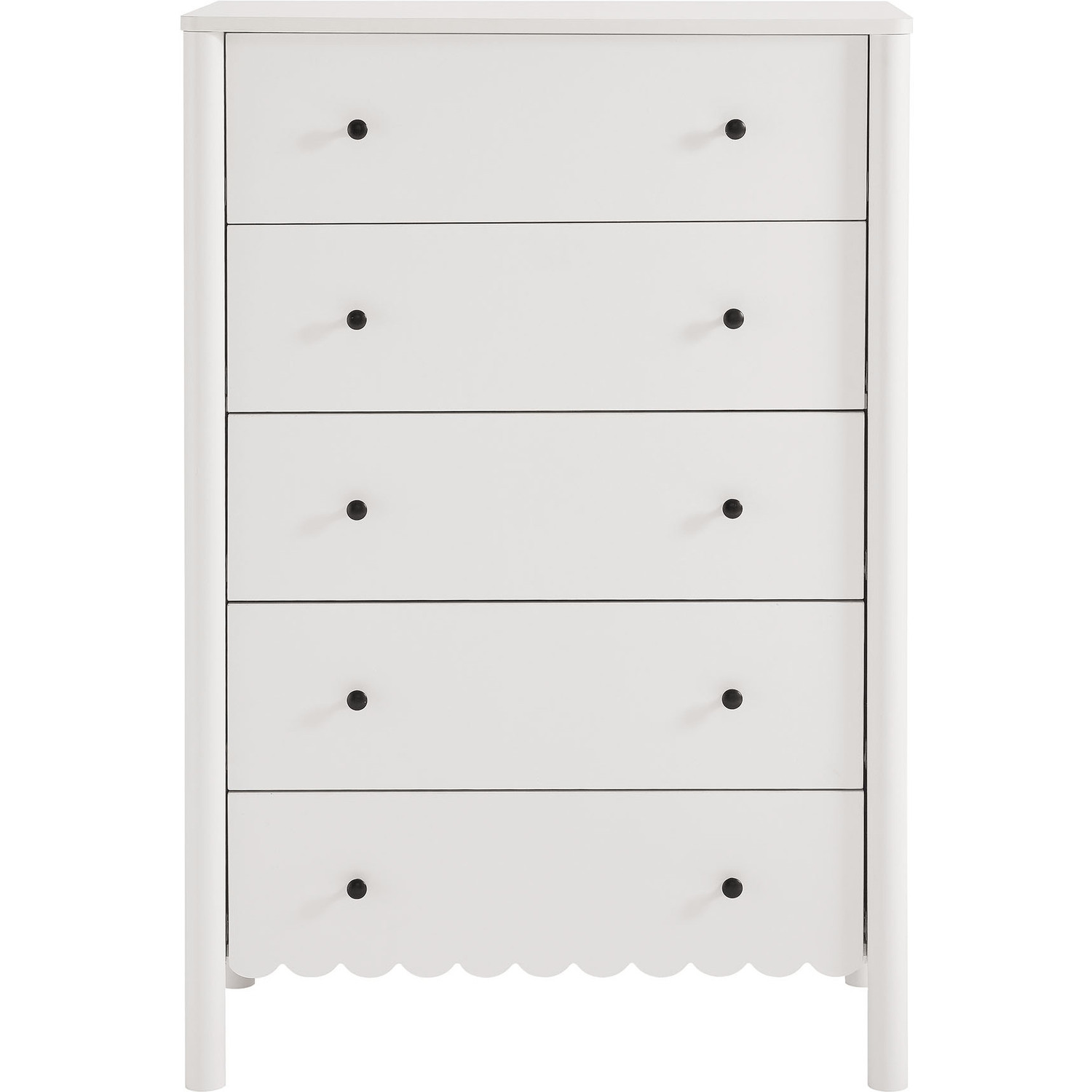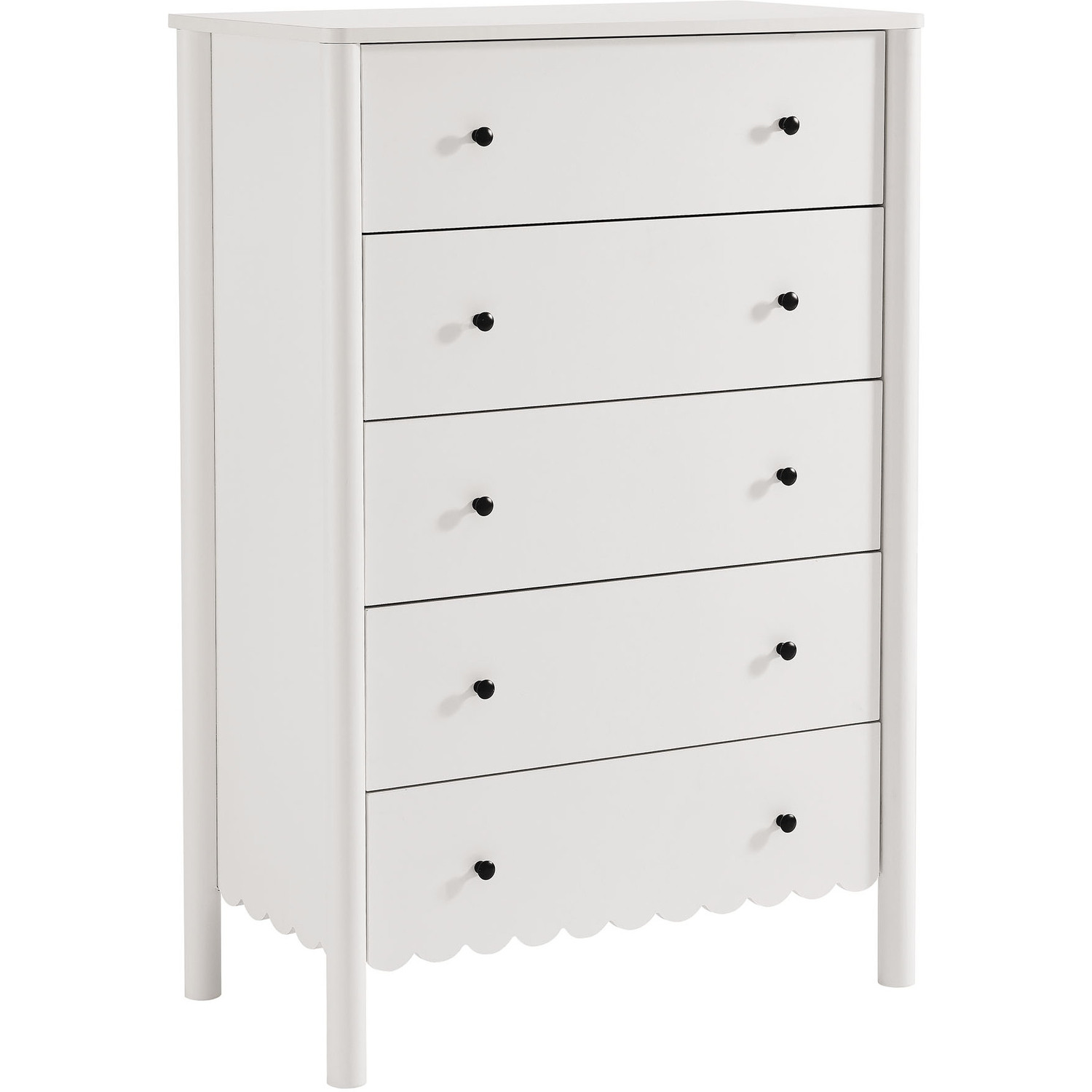 An elegant blend of subtle curves and practical storage, the Emmeline 5-Drawer Chest brings a touch of artistic flair to any room. Its standout feature—a scalloped edge design—creates a soft, flowing silhouette that enhances the modern simplicity of the design. With five spacious full-glide drawers, this chest of drawers offers flexible storage space, ideal for organizing clothing, bedroom essentials, linens, and more. Crafted with a sturdy frame and finished in smooth laminate, this versatile 51-inch tall dresser is as functional as it is stylish. The round drawer knobs and non-marking glides add to its refined appearance, while ensuring your floors remain protected. Whether serving as a modern bedroom dresser or living room organizer, the Emmeline 5-Drawer Chest adds a contemporary, polished look to any space. Assembly required.Versatile 5-Drawer Chest