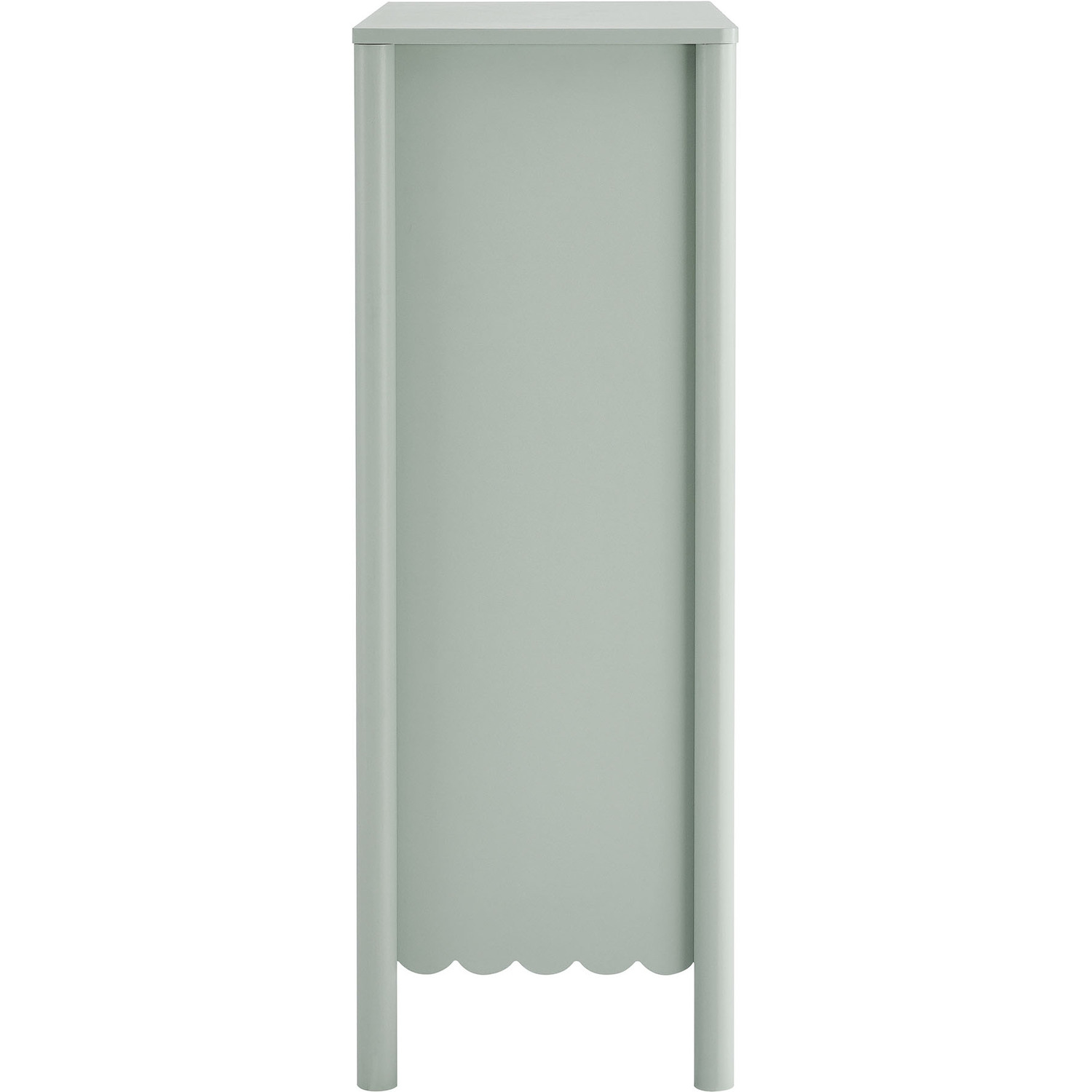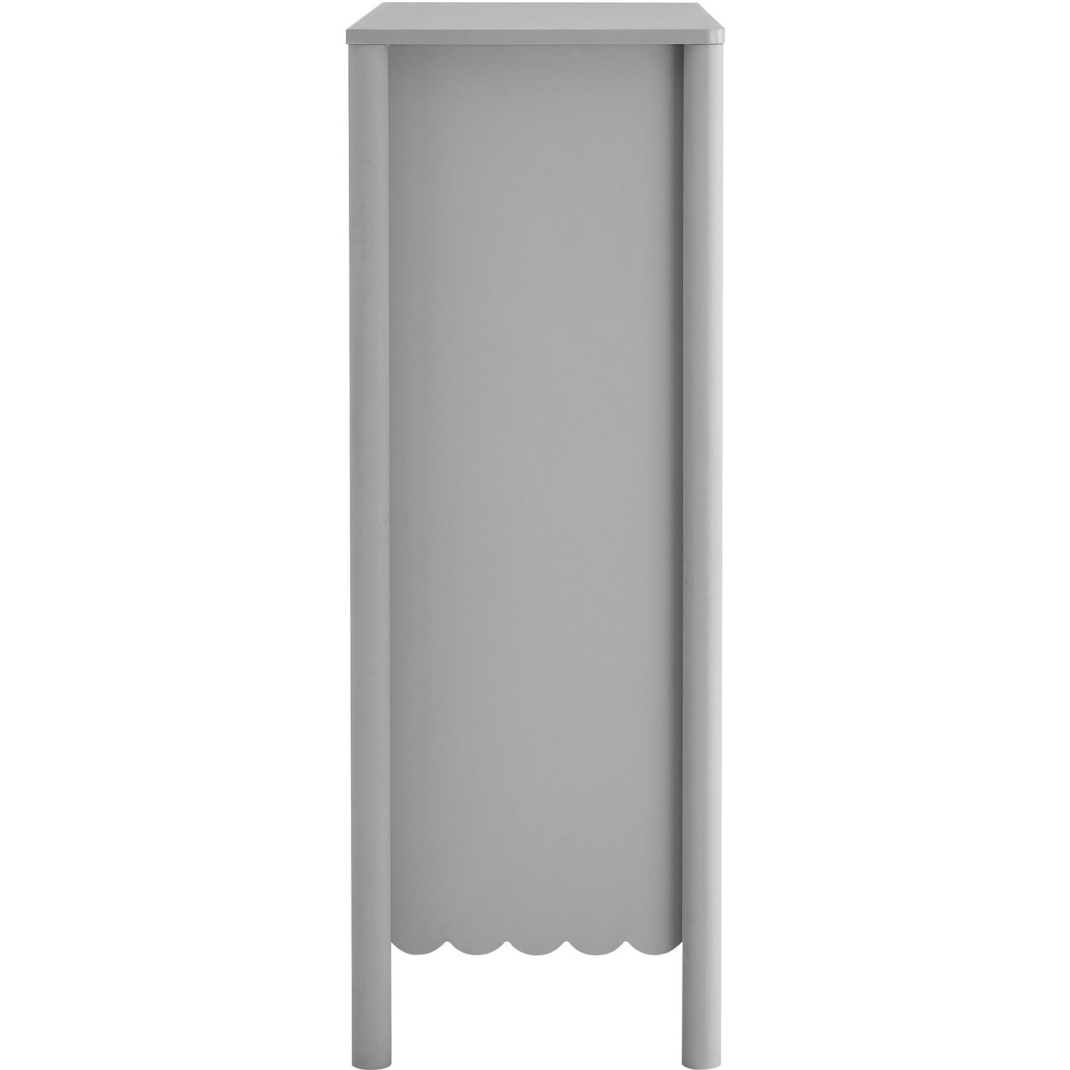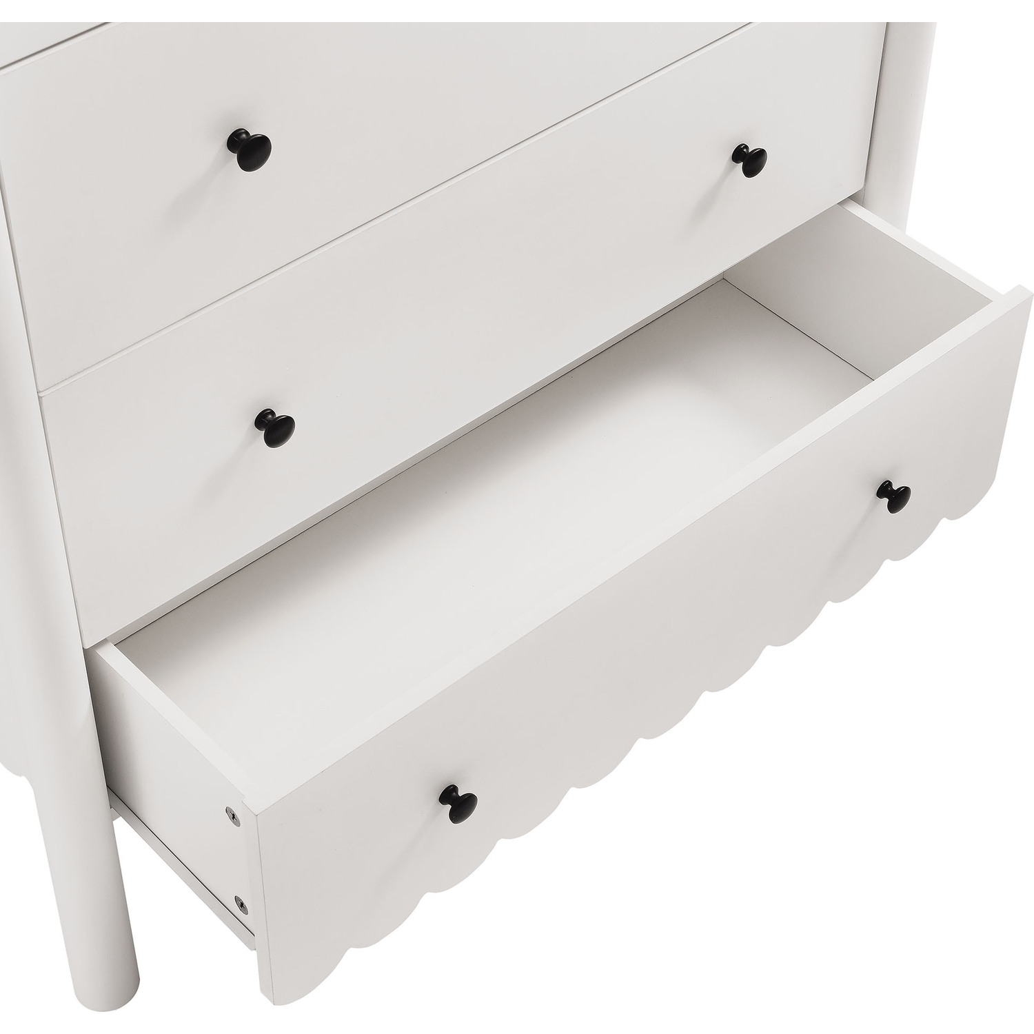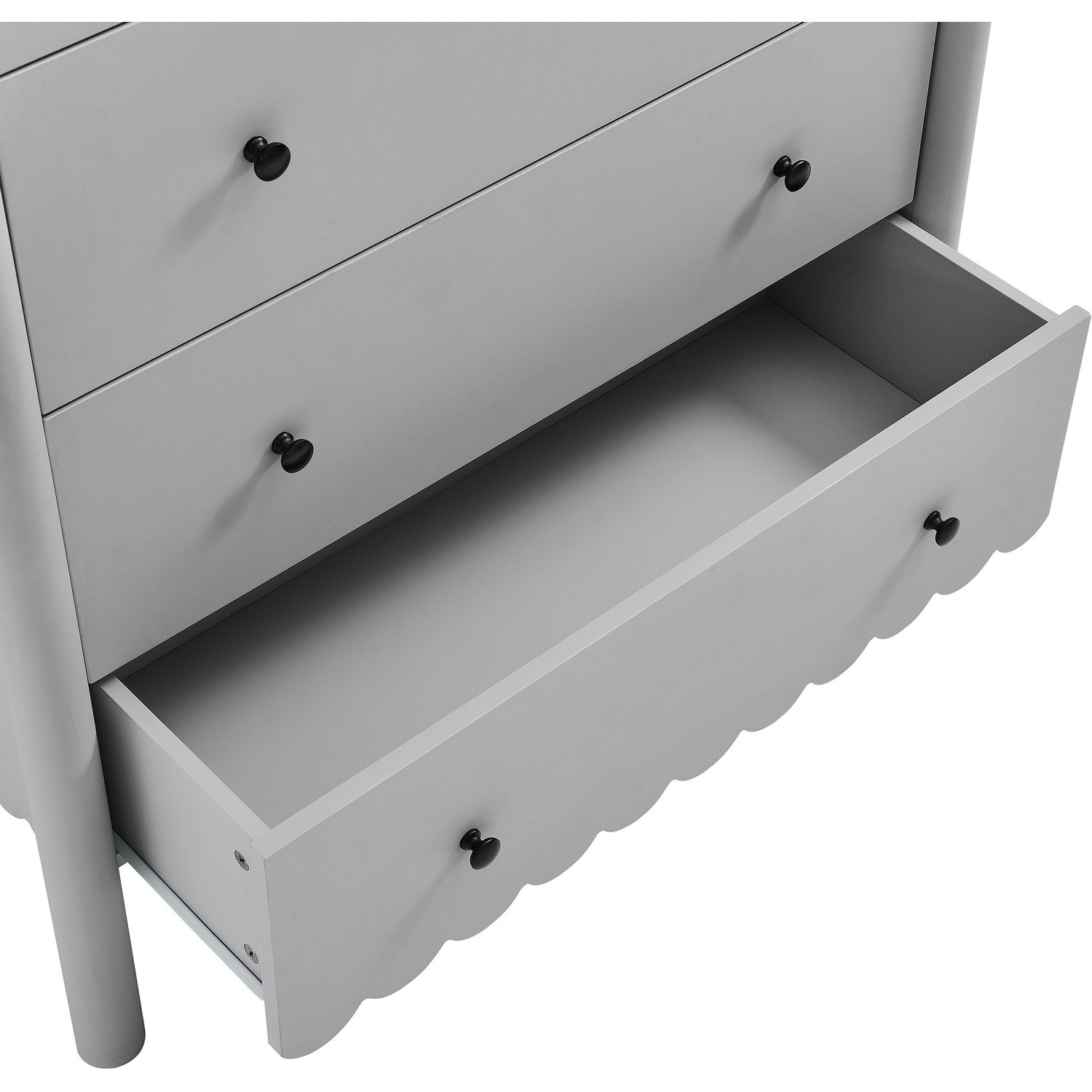 An elegant blend of subtle curves and practical storage, the Emmeline 5-Drawer Chest brings a touch of artistic flair to any room. Its standout feature—a scalloped edge design—creates a soft, flowing silhouette that enhances the modern simplicity of the design. With five spacious full-glide drawers, this chest of drawers offers flexible storage space, ideal for organizing clothing, bedroom essentials, linens, and more. Crafted with a sturdy frame and finished in smooth laminate, this versatile 51-inch tall dresser is as functional as it is stylish. The round drawer knobs and non-marking glides add to its refined appearance, while ensuring your floors remain protected. Whether serving as a modern bedroom dresser or living room organizer, the Emmeline 5-Drawer Chest adds a contemporary, polished look to any space. Assembly required.Versatile 5-Drawer Chest