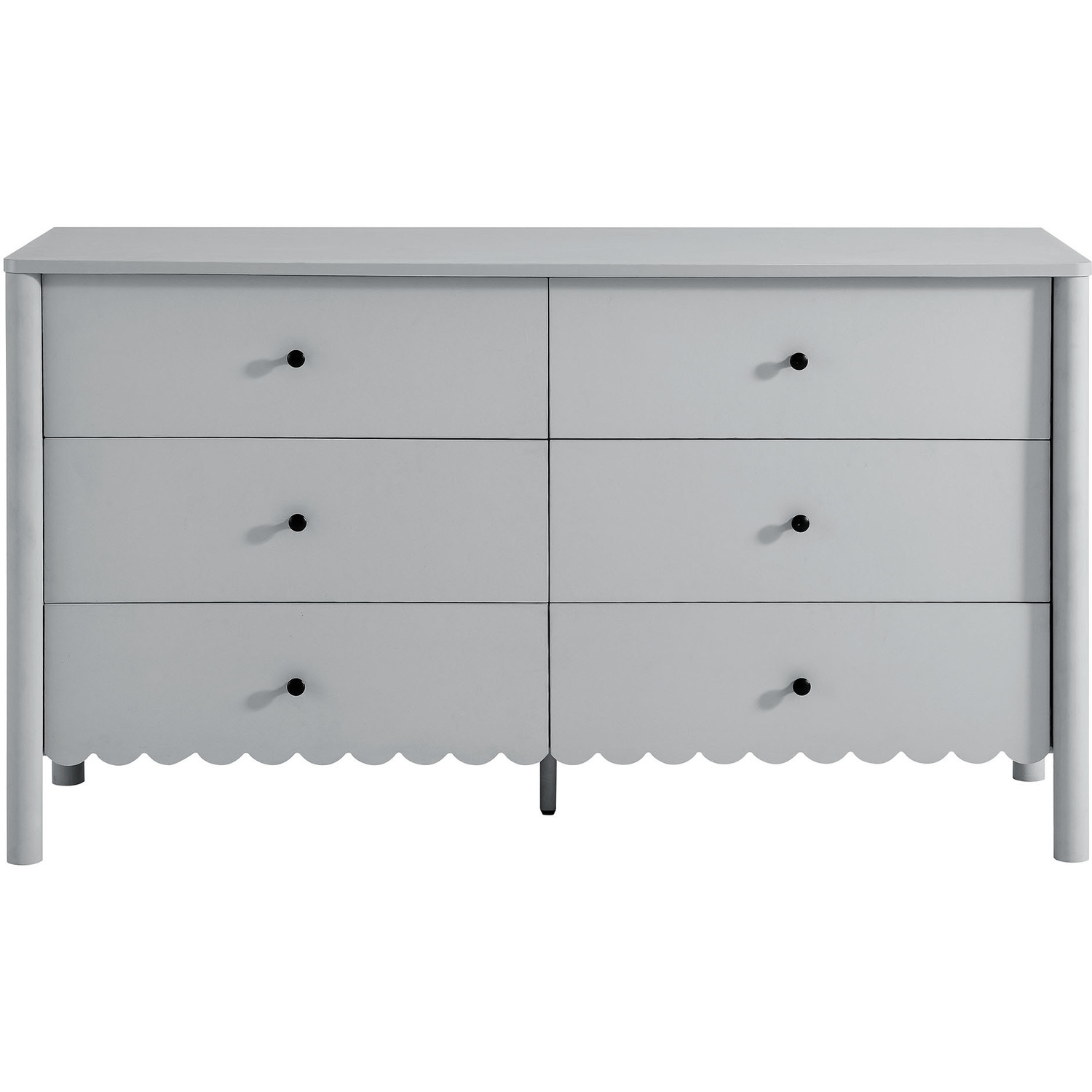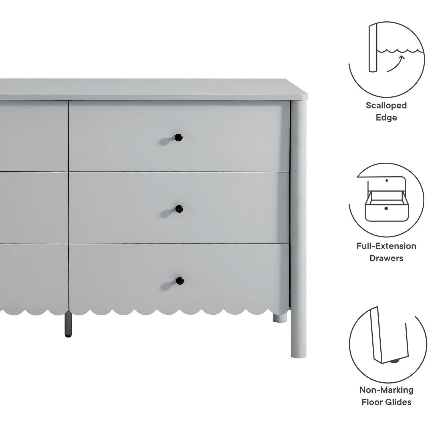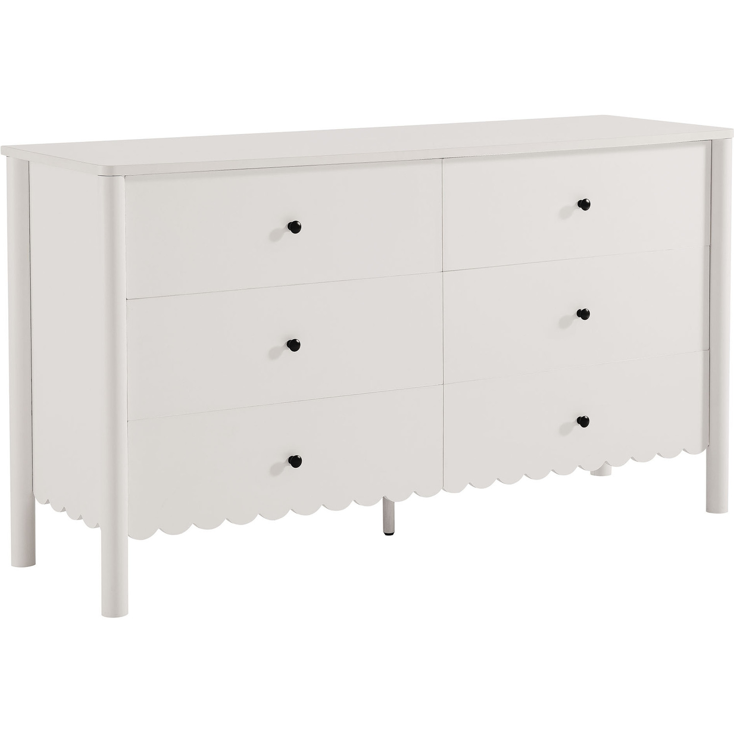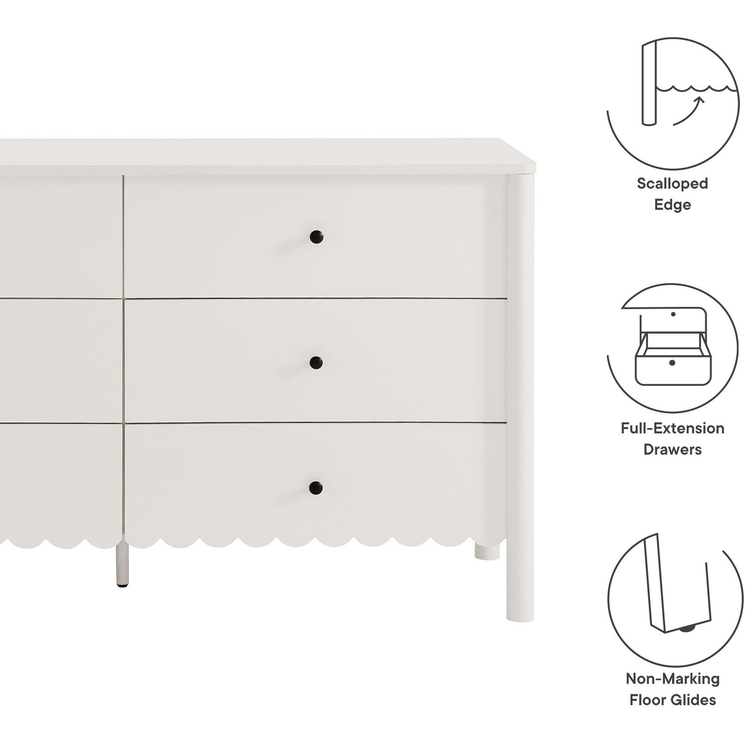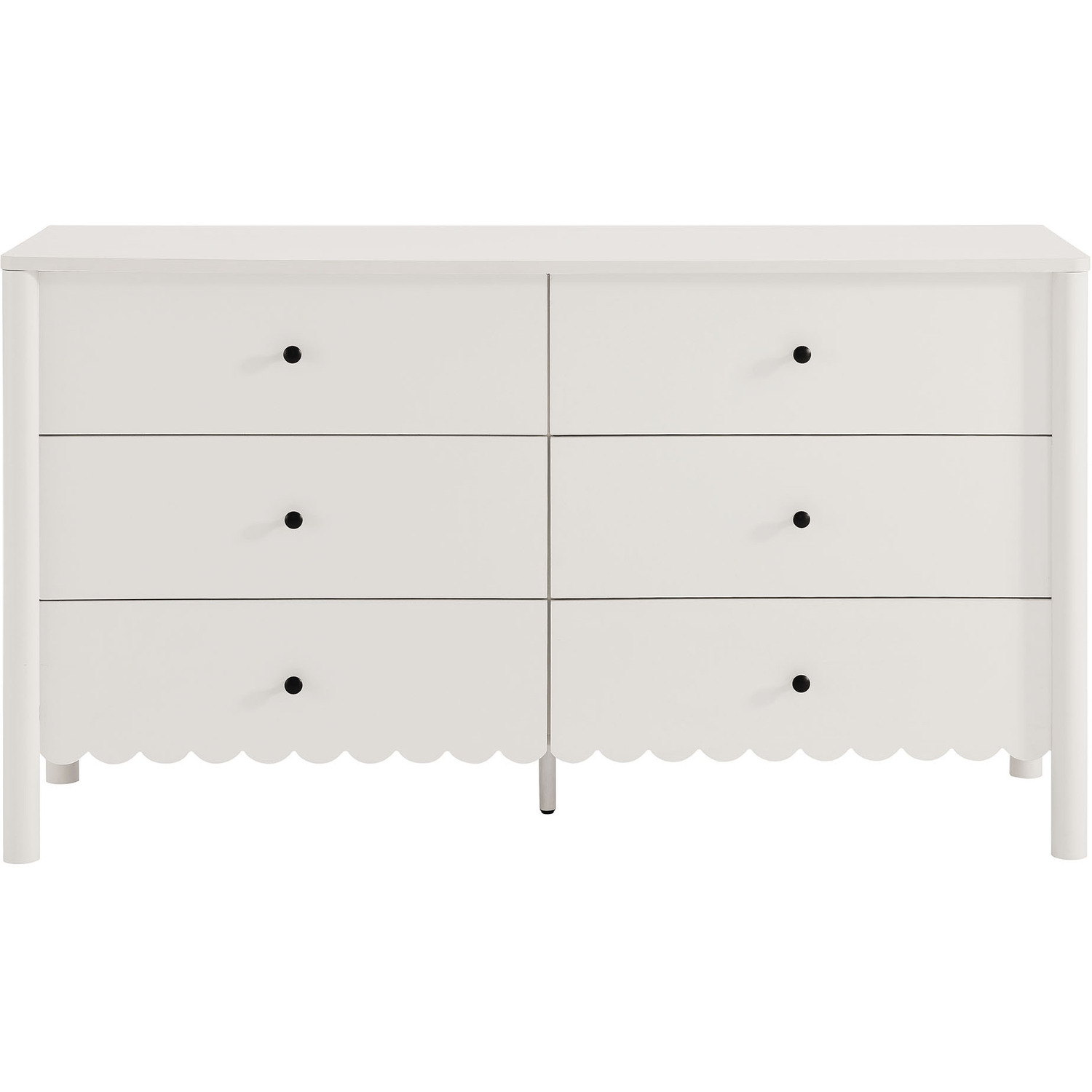 The Emmeline 6-Drawer Dresser blends modern elegance with practical storage, bringing artistic flair to your bedroom or living room. Featuring a signature scalloped edge, this wavy double dresser adds a soft, flowing silhouette to any space. With six spacious full-glide drawers, the dresser offers ample storage for organizing clothing, bedroom essentials, linens, or even media accessories when used as a TV stand for a wall-mounted TV. Crafted with a sturdy frame and finished in smooth laminate, this versatile dresser brings both function and style to your home. The round drawer knobs and non-marking glides enhance its refined appearance while ensuring your floors stay protected. Whether used in a girls' bedroom, a modern living room, or as an organizer in the hallway, the Emmeline 6-Drawer Dresser provides an elegant storage solution. Assembly required.Scalloped Edge Detail