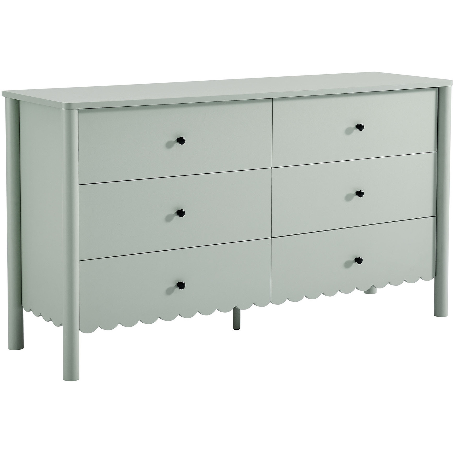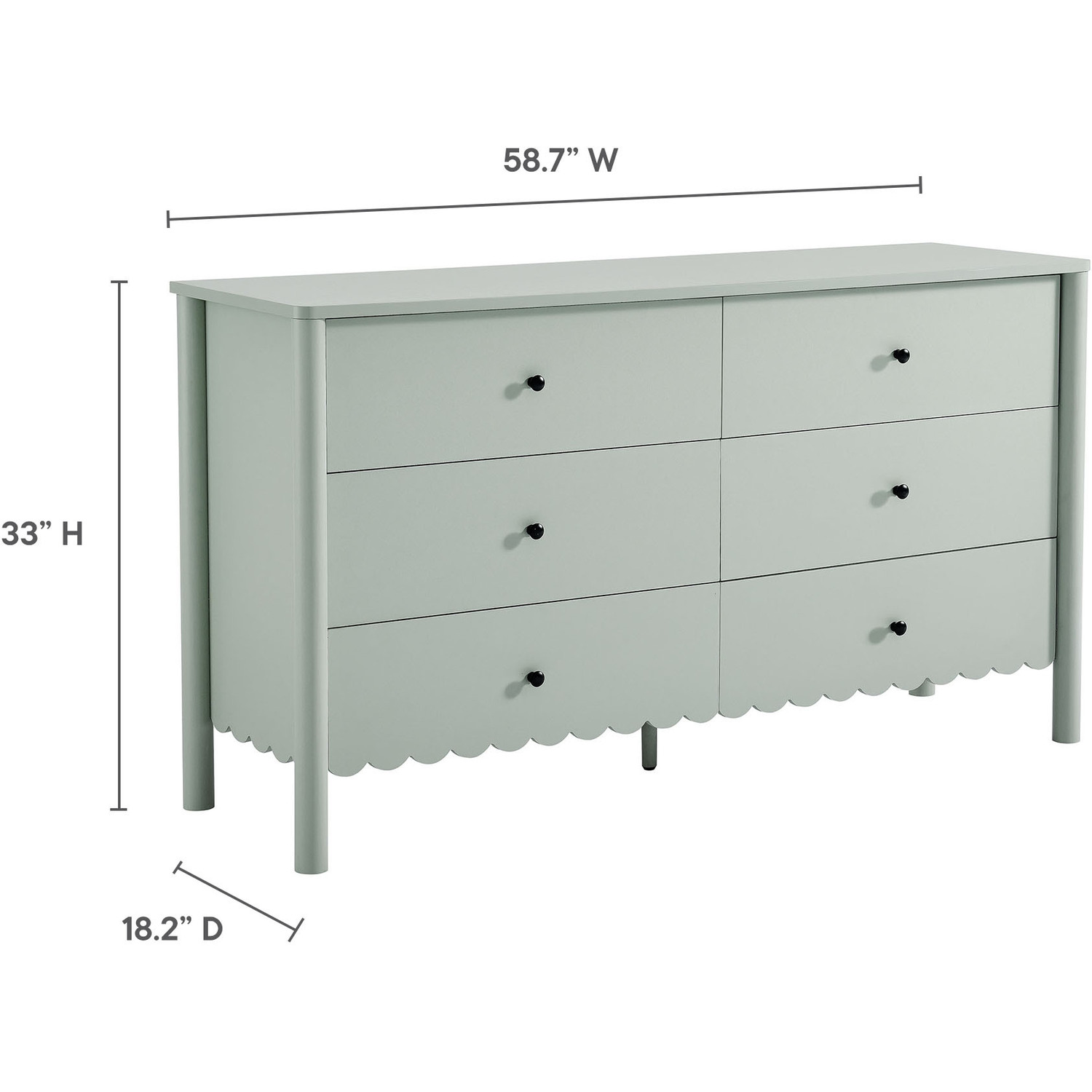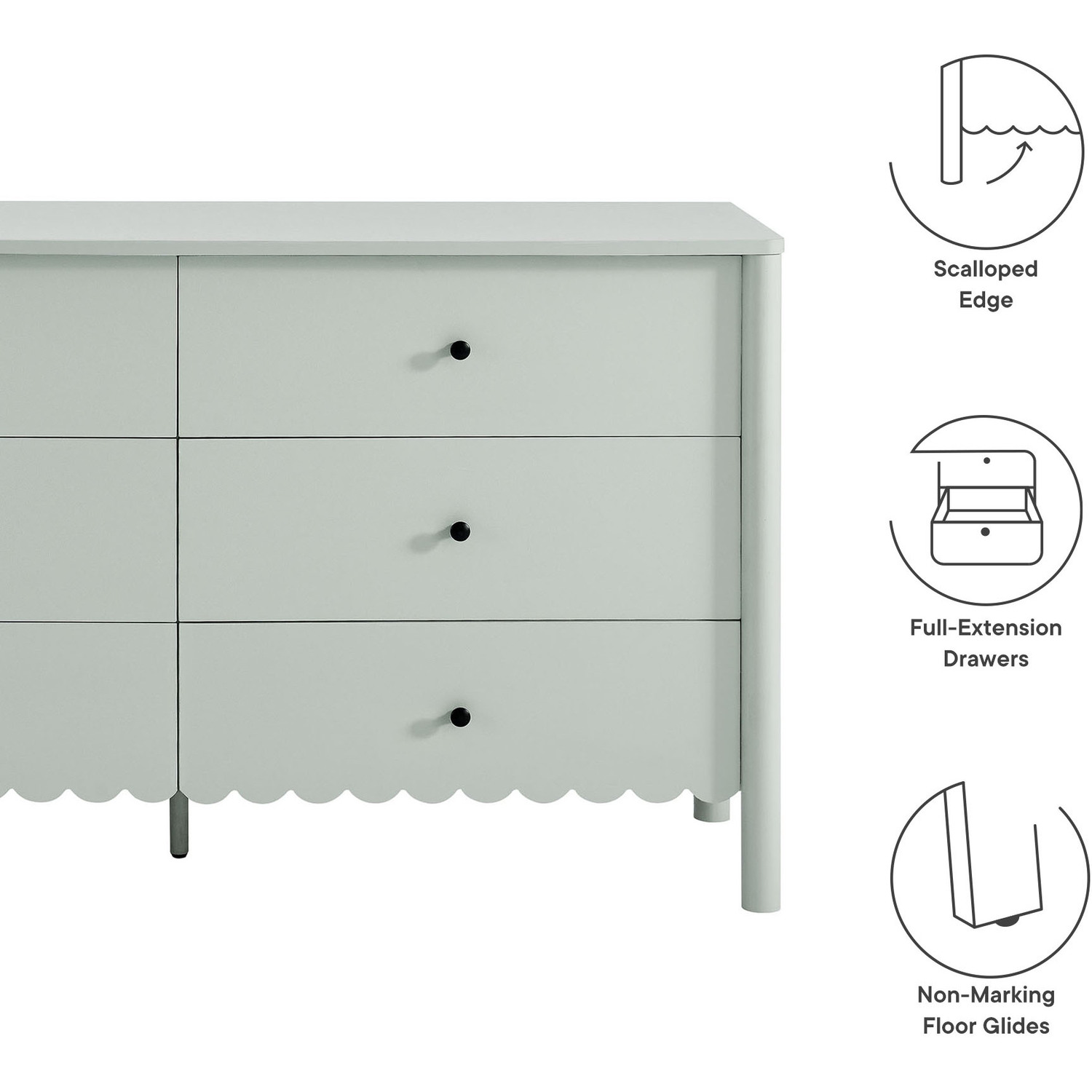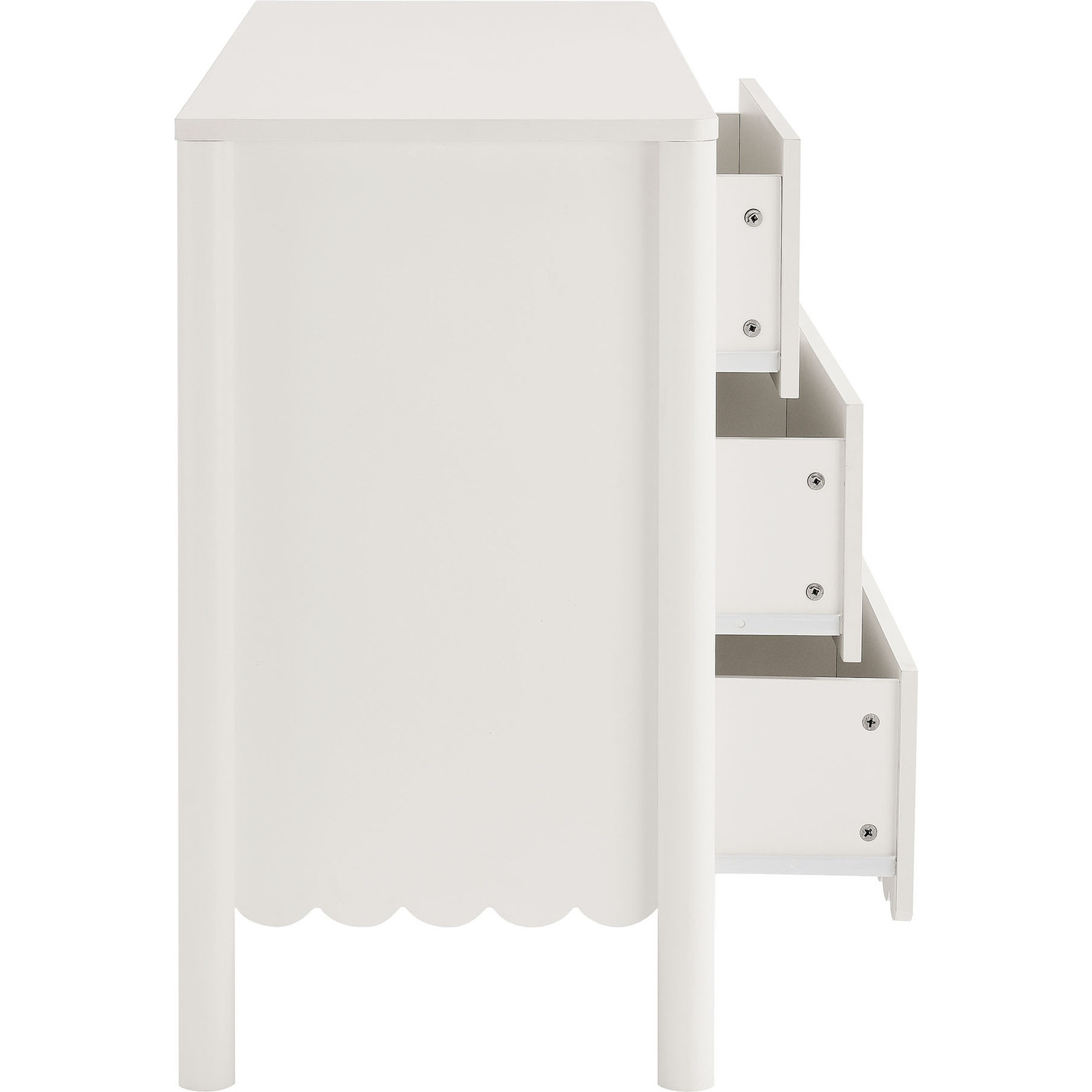 The Emmeline 6-Drawer Dresser blends modern elegance with practical storage, bringing artistic flair to your bedroom or living room. Featuring a signature scalloped edge, this wavy double dresser adds a soft, flowing silhouette to any space. With six spacious full-glide drawers, the dresser offers ample storage for organizing clothing, bedroom essentials, linens, or even media accessories when used as a TV stand for a wall-mounted TV. Crafted with a sturdy frame and finished in smooth laminate, this versatile dresser brings both function and style to your home. The round drawer knobs and non-marking glides enhance its refined appearance while ensuring your floors stay protected. Whether used in a girls' bedroom, a modern living room, or as an organizer in the hallway, the Emmeline 6-Drawer Dresser provides an elegant storage solution. Assembly required.Scalloped Edge Detail