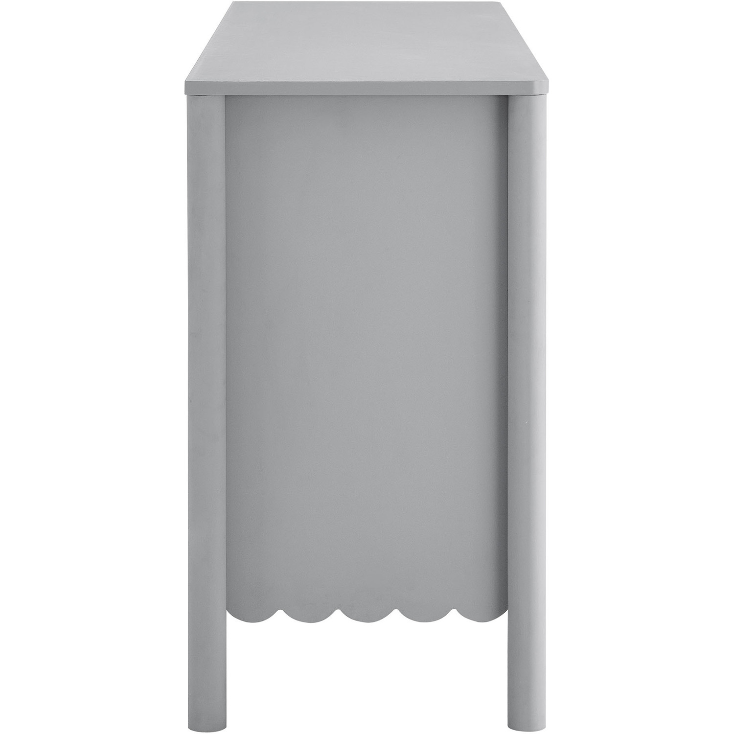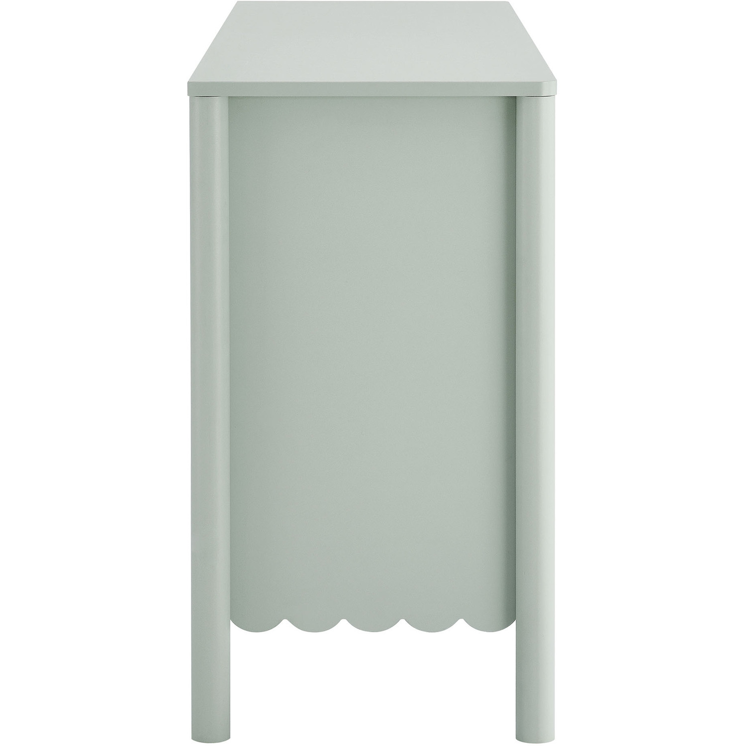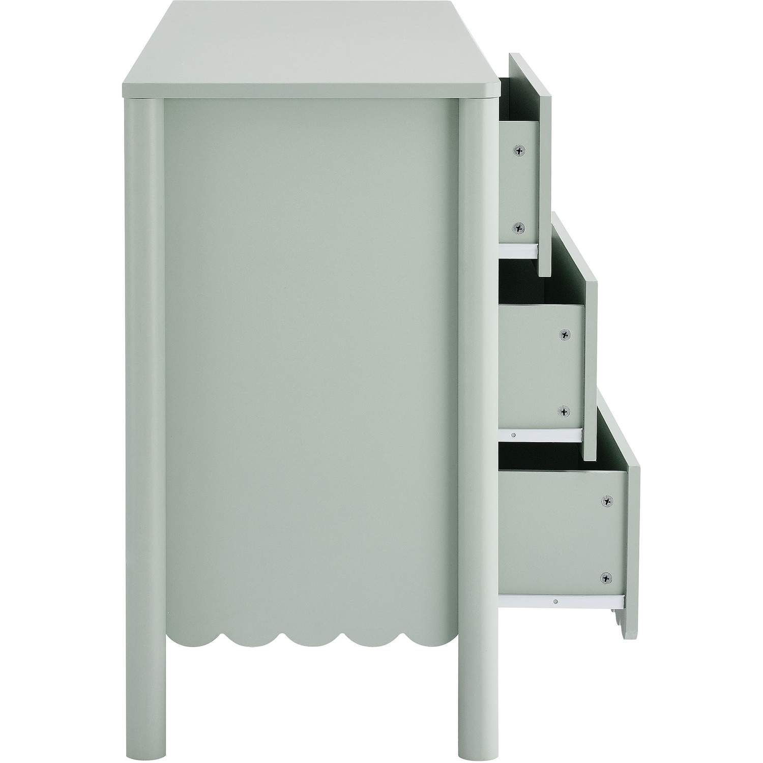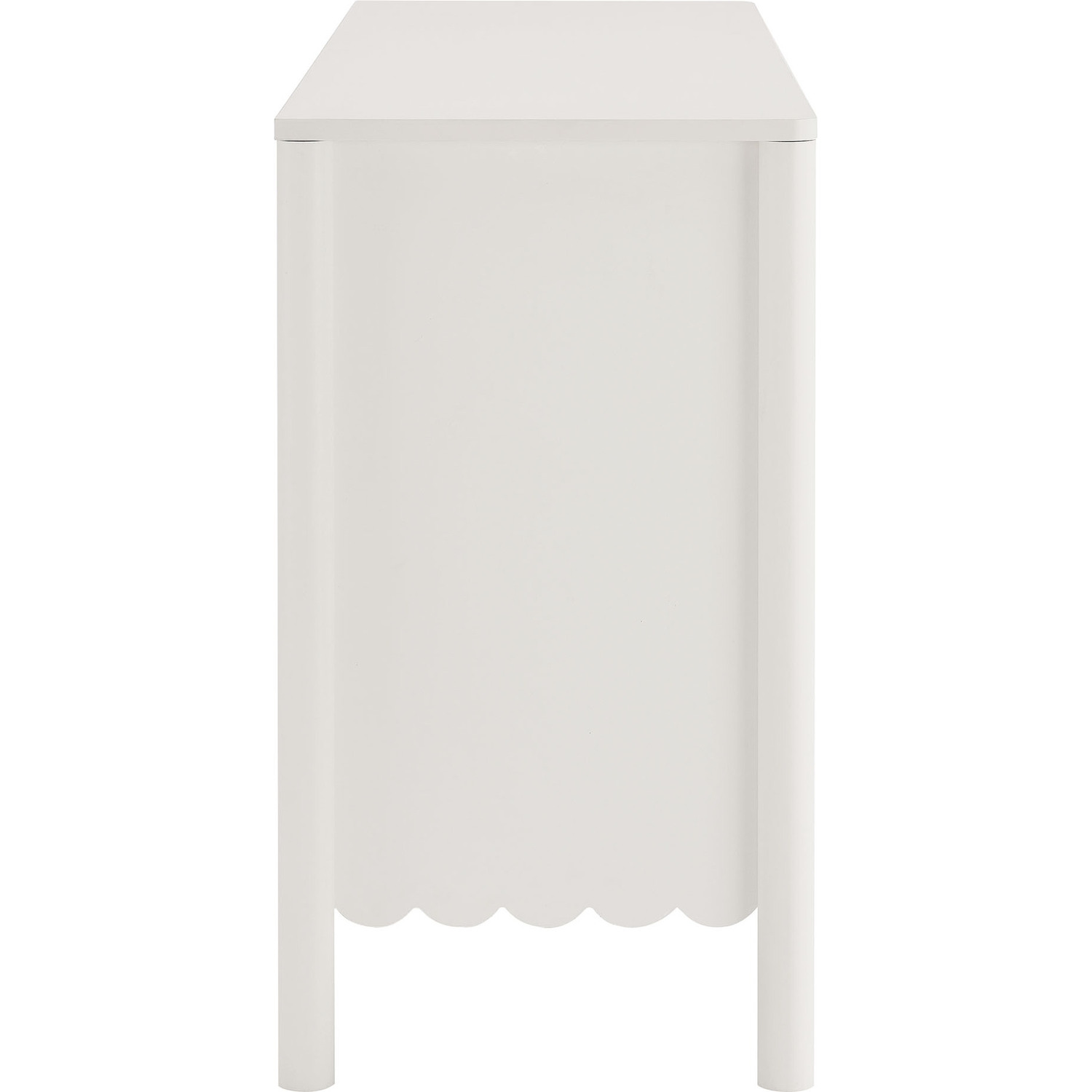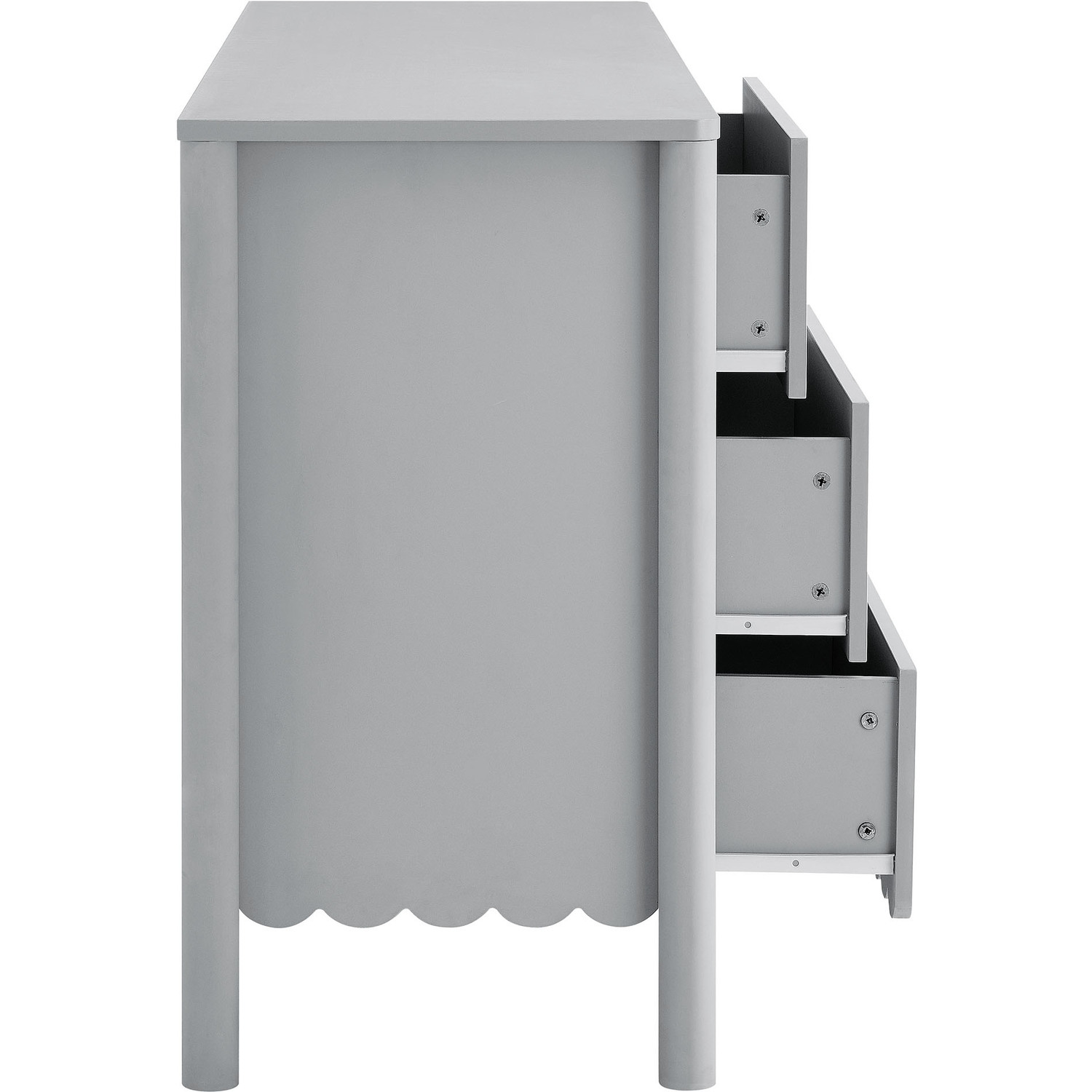 The Emmeline 6-Drawer Dresser blends modern elegance with practical storage, bringing artistic flair to your bedroom or living room. Featuring a signature scalloped edge, this wavy double dresser adds a soft, flowing silhouette to any space. With six spacious full-glide drawers, the dresser offers ample storage for organizing clothing, bedroom essentials, linens, or even media accessories when used as a TV stand for a wall-mounted TV. Crafted with a sturdy frame and finished in smooth laminate, this versatile dresser brings both function and style to your home. The round drawer knobs and non-marking glides enhance its refined appearance while ensuring your floors stay protected. Whether used in a girls' bedroom, a modern living room, or as an organizer in the hallway, the Emmeline 6-Drawer Dresser provides an elegant storage solution. Assembly required.Scalloped Edge Detail