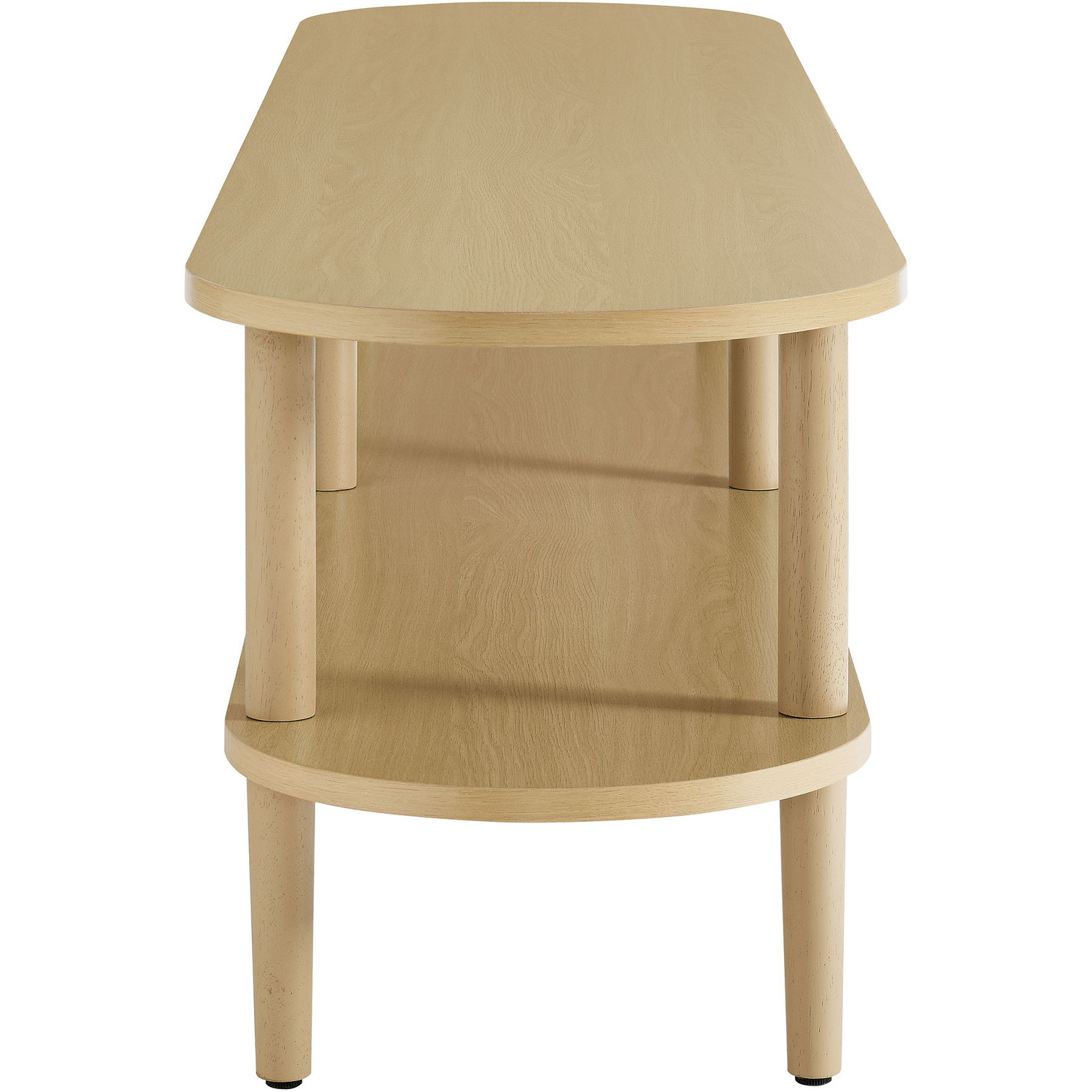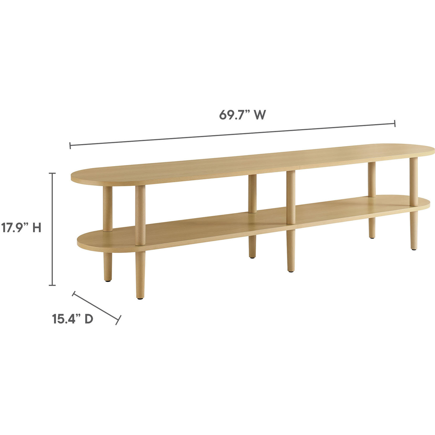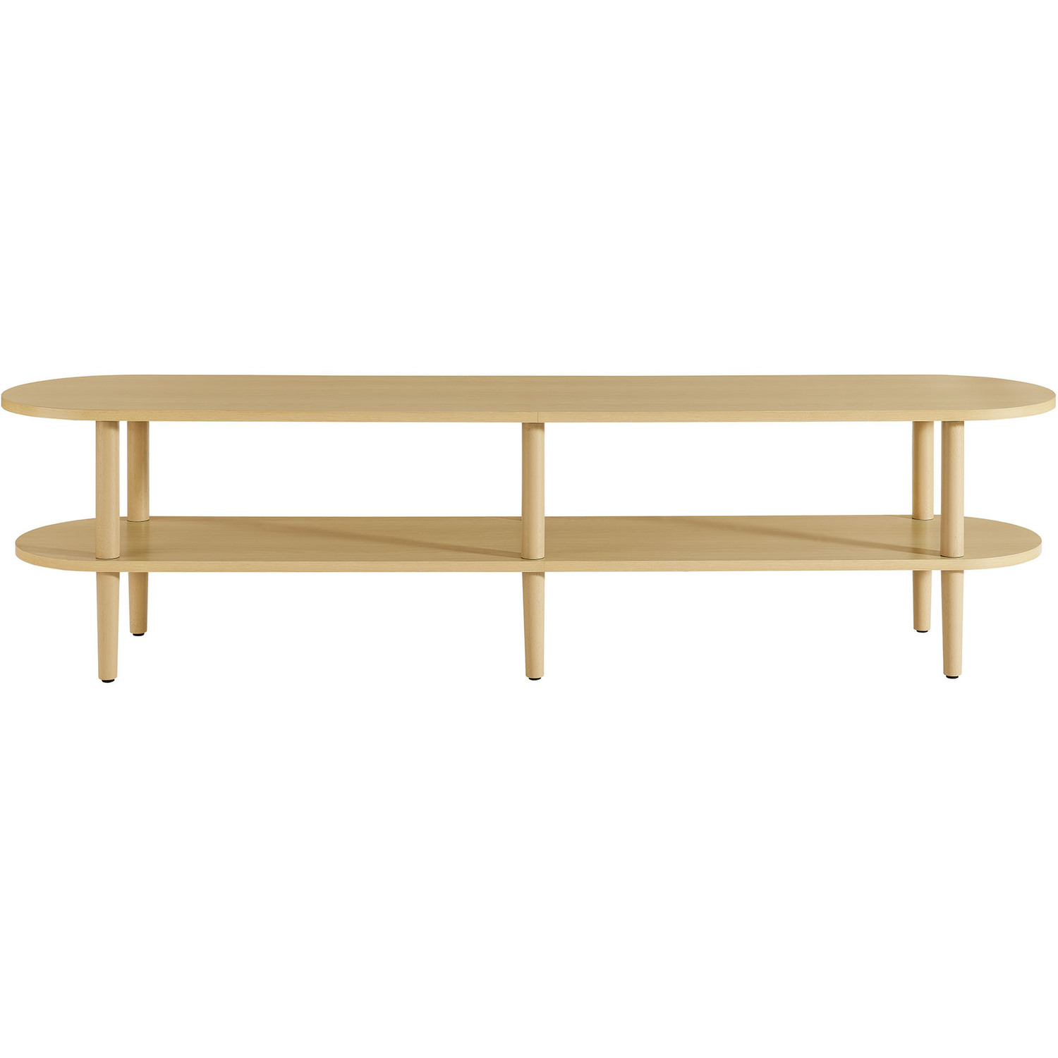 The Torus Modern TV Stand showcases a unique blend of contemporary and minimalist aesthetics with its stylish oval silhouette. Made of wood with a laminate finish, this 70" curved TV stand includes an upper panel and a bottom shelf, providing ample space for displaying plants, books, media devices, or decorative items. The open shelf design suits modern living rooms, allowing you to showcase your favorite decor while adding a touch of openness and airiness to the space. A great addition to any room, this low TV table serves as a stylish platform for anchored or wall-mounted TVs, elevating both your entertainment setup and your decor. The stand's six legs provide robust support, while non-marking foot caps protect your floors. Assembly required. Weight Capacity: 198 lbs.Oval TV Table