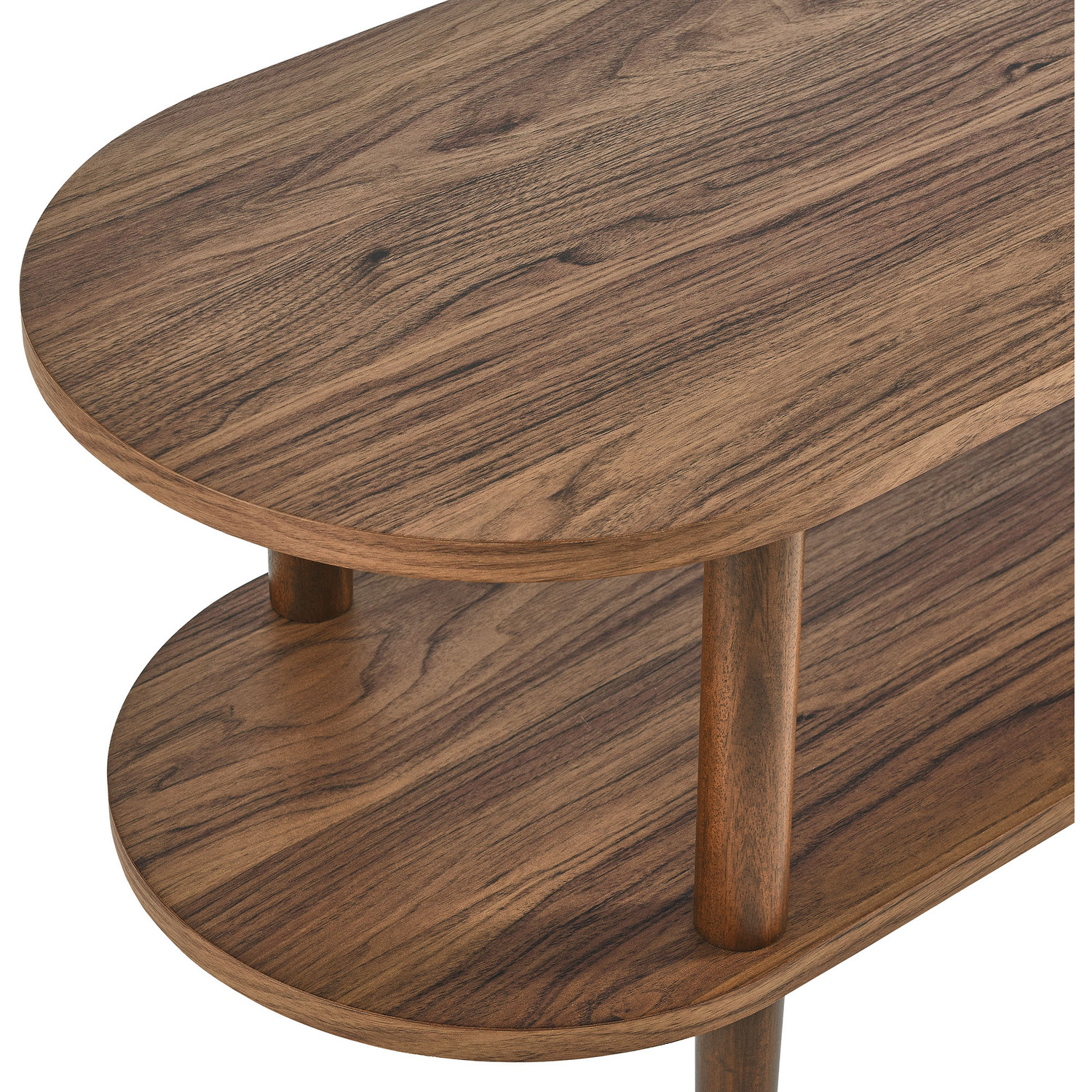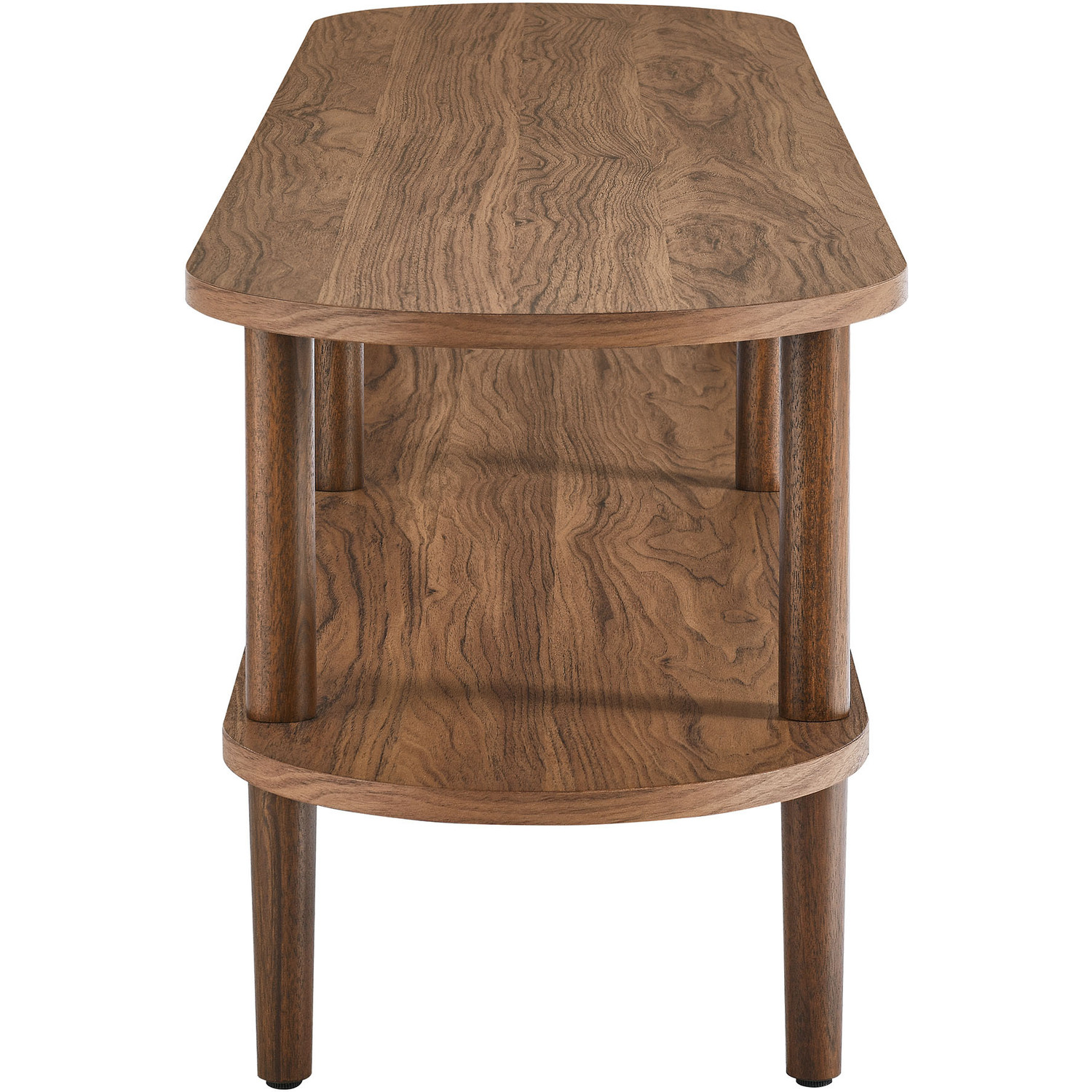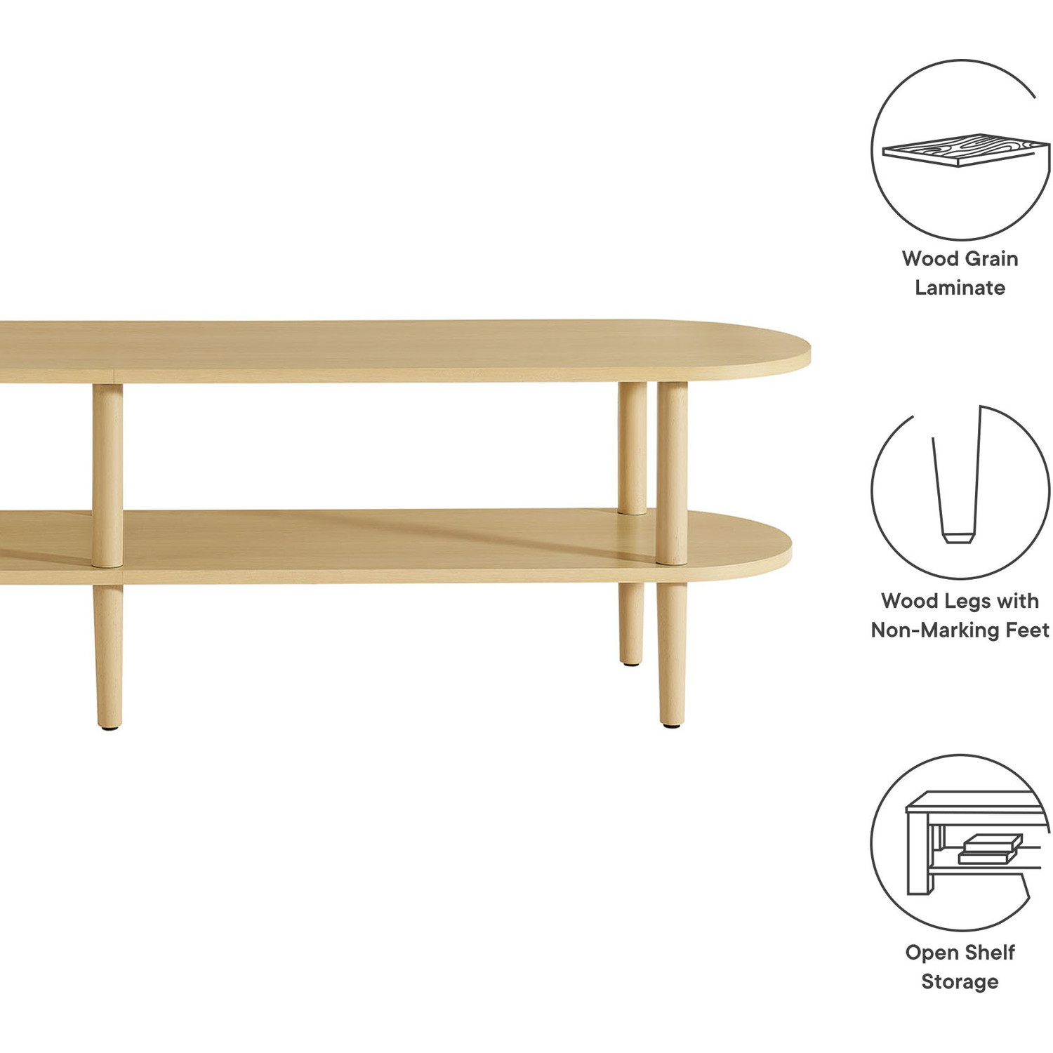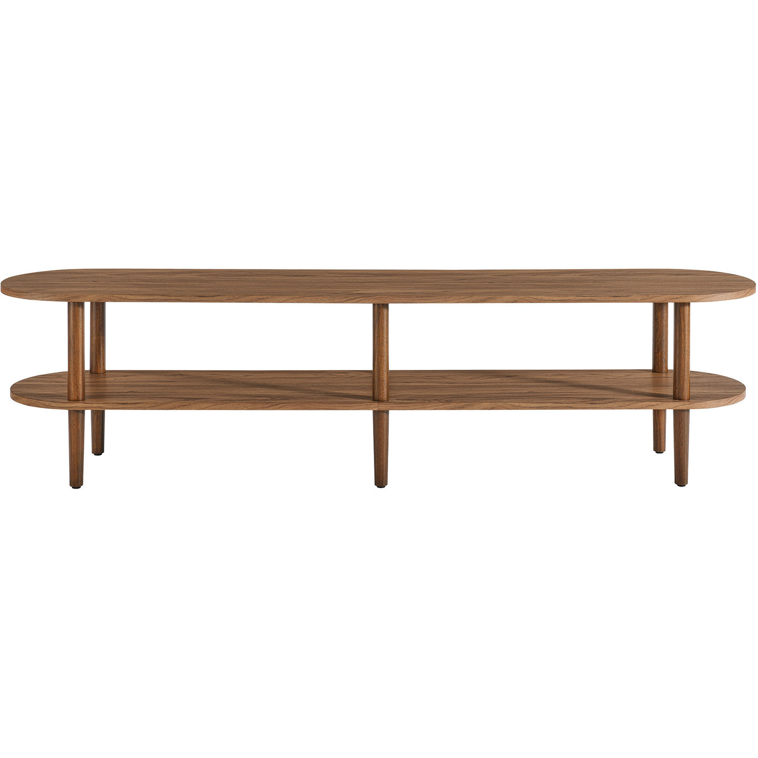 The Torus Modern TV Stand showcases a unique blend of contemporary and minimalist aesthetics with its stylish oval silhouette. Made of wood with a laminate finish, this 70" curved TV stand includes an upper panel and a bottom shelf, providing ample space for displaying plants, books, media devices, or decorative items. The open shelf design suits modern living rooms, allowing you to showcase your favorite decor while adding a touch of openness and airiness to the space. A great addition to any room, this low TV table serves as a stylish platform for anchored or wall-mounted TVs, elevating both your entertainment setup and your decor. The stand's six legs provide robust support, while non-marking foot caps protect your floors. Assembly required. Weight Capacity: 198 lbs.Oval TV Table