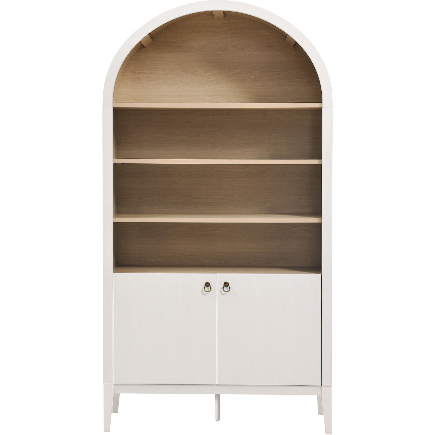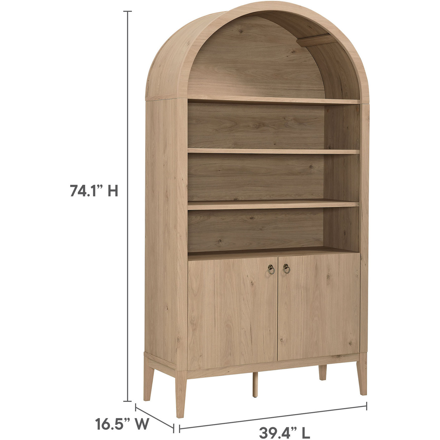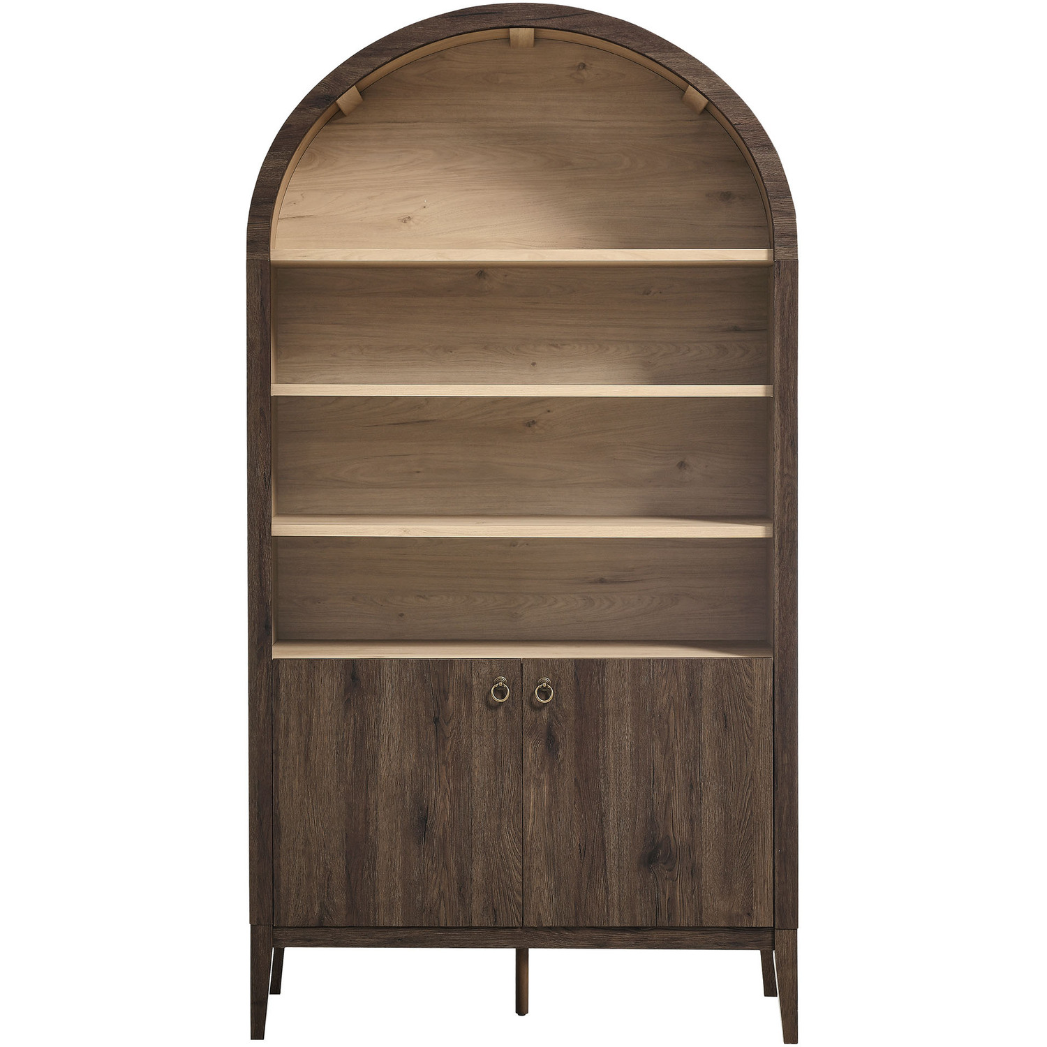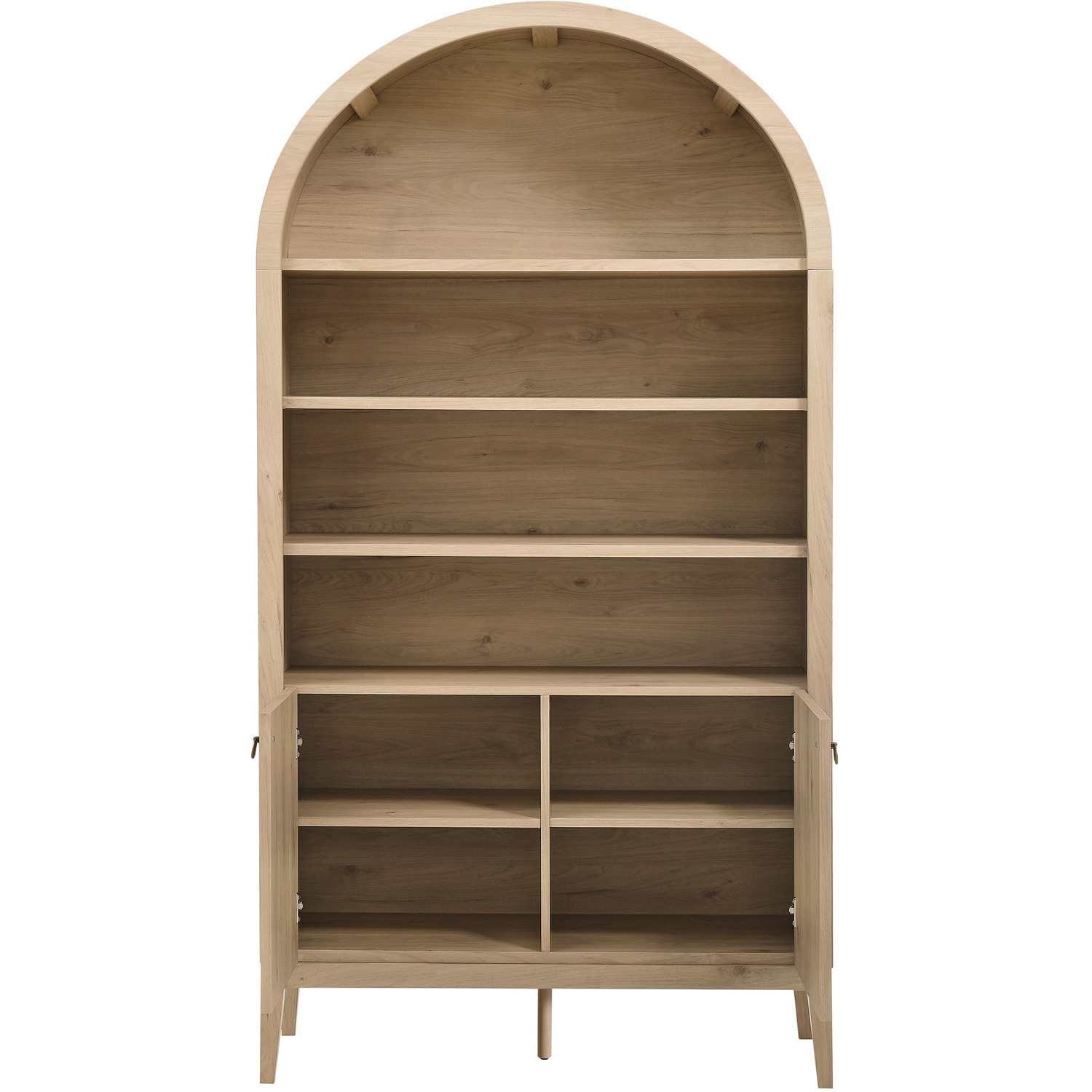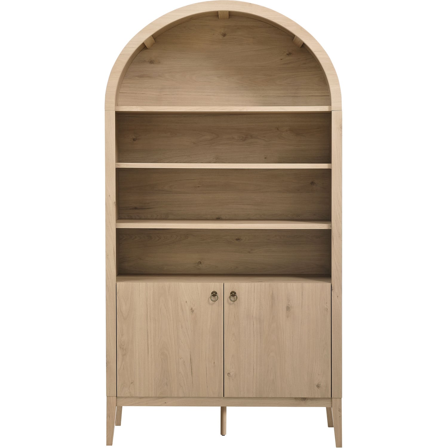 The Nolan Display Cabinet combines functional storage versatility with charming modern farmhouse style. Crafted with a beautiful wood grain laminate, the chic design flaunts subtle edge trimming and an elegantly rounded, arched top shelf. Supported by tapered wood legs, the Nolan tall storage cabinet combines open shelving with concealed storage. The upper section includes two adjustable shelves flanked between two fixed shelves, perfect for displaying decor and books. The lower section is enclosed by two solid doors, which open to reveal two adjustable shelves inside, creating four compartments for additional storage. Complete with soft-close hinges and metal ring pull handles with a brushed gold finish, this wood storage cabinet is as stylish as it is practical. Perfect for your living room, hallway, or dining area, this arched bookcase effortlessly adds an air of sophistication and vintage allure to your home. To protect your flooring, the Nolan Wide Storage Cabinet comes equipped with non-marking foot pads. Assembly required. Weight Capacity of each shelf: 44 lbsWood Grain Laminate