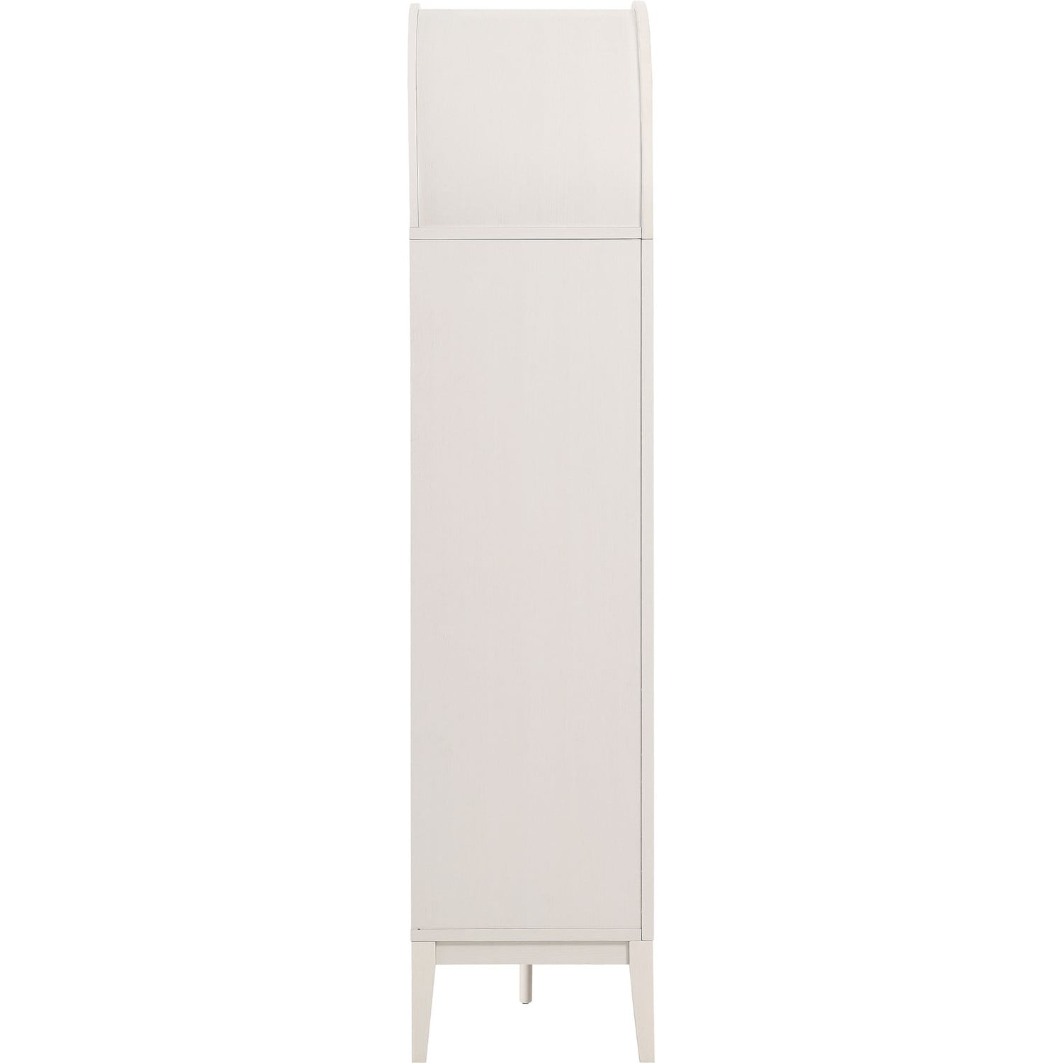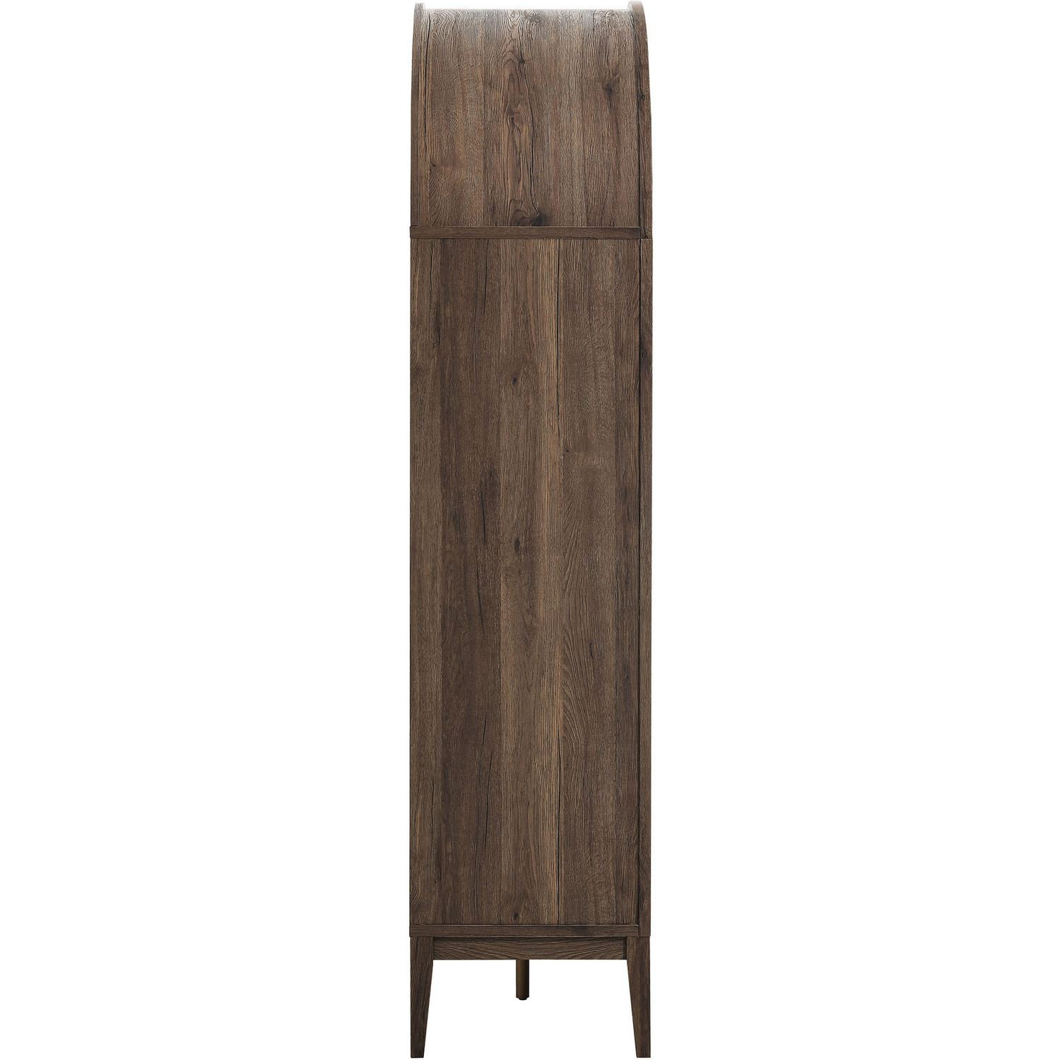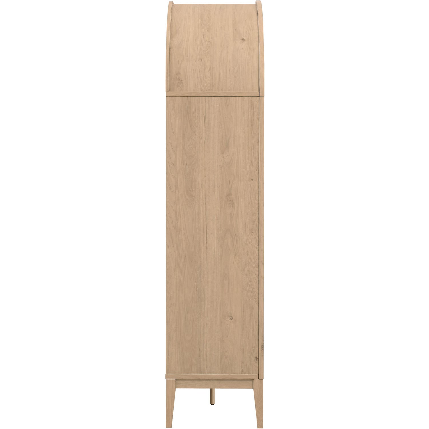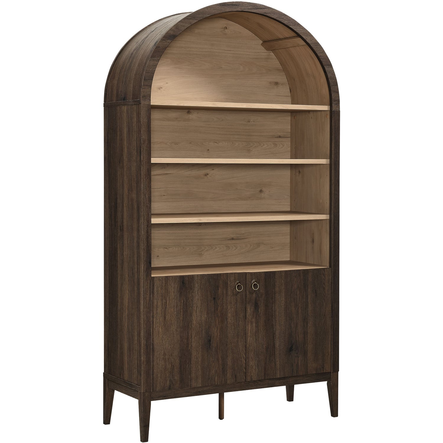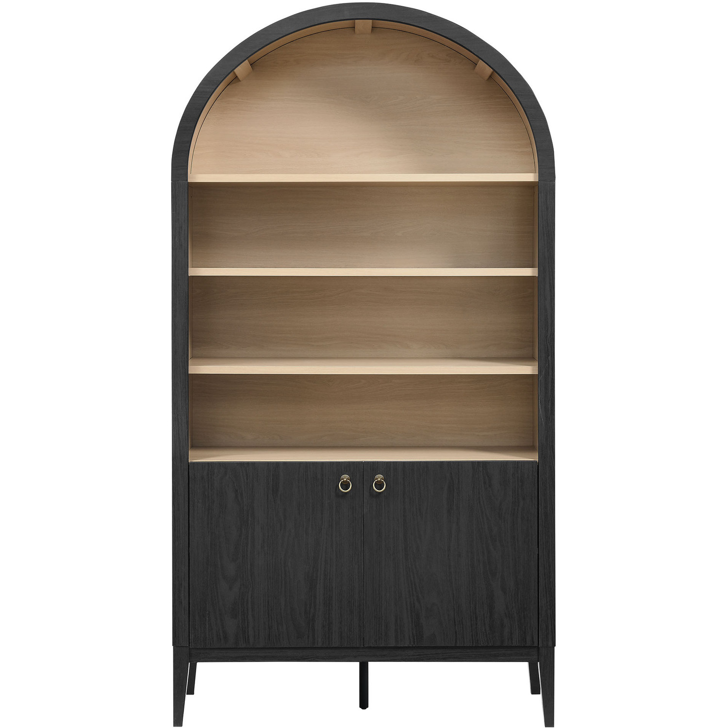 The Nolan Display Cabinet combines functional storage versatility with charming modern farmhouse style. Crafted with a beautiful wood grain laminate, the chic design flaunts subtle edge trimming and an elegantly rounded, arched top shelf. Supported by tapered wood legs, the Nolan tall storage cabinet combines open shelving with concealed storage. The upper section includes two adjustable shelves flanked between two fixed shelves, perfect for displaying decor and books. The lower section is enclosed by two solid doors, which open to reveal two adjustable shelves inside, creating four compartments for additional storage. Complete with soft-close hinges and metal ring pull handles with a brushed gold finish, this wood storage cabinet is as stylish as it is practical. Perfect for your living room, hallway, or dining area, this arched bookcase effortlessly adds an air of sophistication and vintage allure to your home. To protect your flooring, the Nolan Wide Storage Cabinet comes equipped with non-marking foot pads. Assembly required. Weight Capacity of each shelf: 44 lbsWood Grain Laminate
