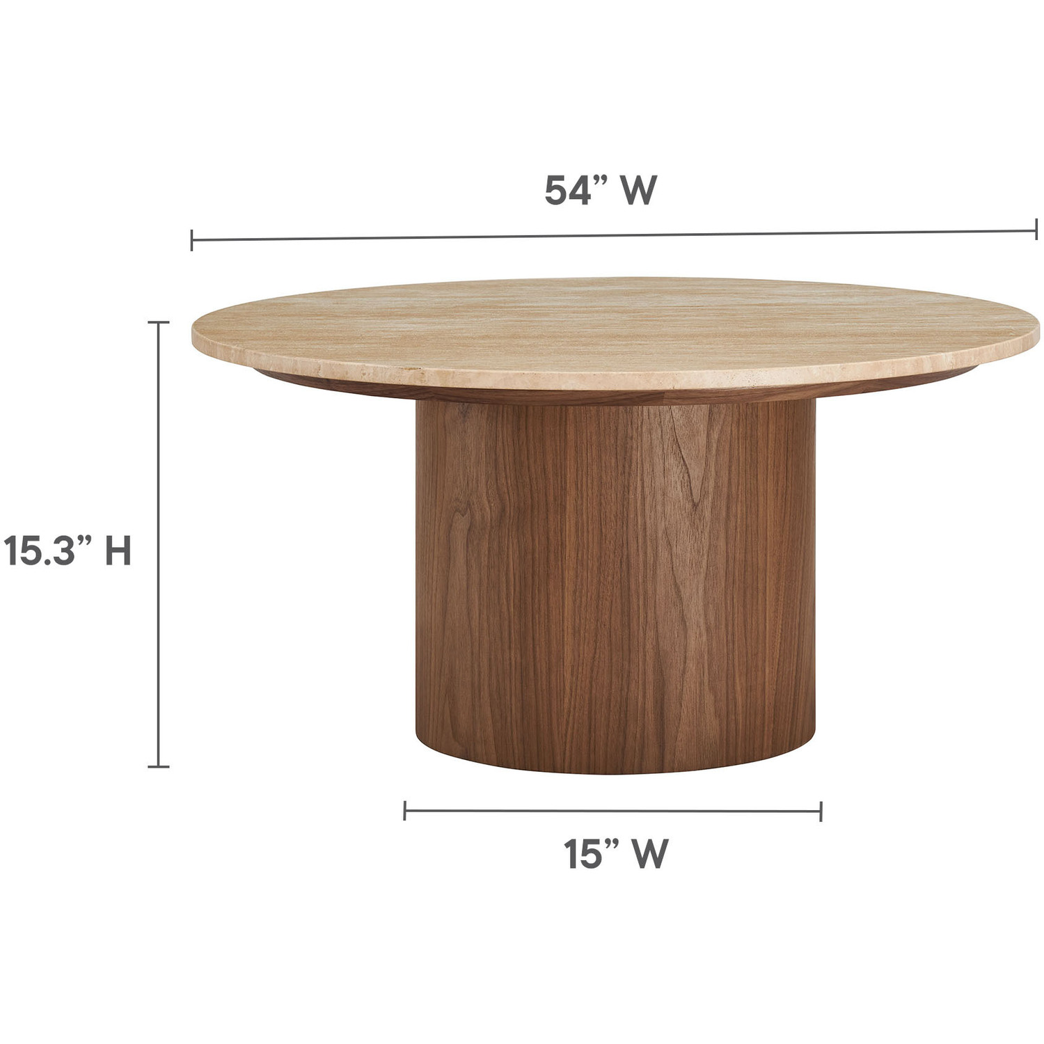 The Kioni Round Coffee Table brings modern organic appeal to any living room with its minimalist design and natural materials. Featuring a smooth travertine tabletop paired with a sleek walnut veneer base, this round coffee table offers a refined contrast between its natural stone surface and the warm, wood grain of its pedestal base, creating a perfect balance of texture and tone. The travertine top is reinforced by a walnut veneer board, providing both strength and a cohesive look that enhances the table's harmonious blend of natural materials. At 31"es, this travertine coffee table offers plenty of space for beverages and snacks, making it not only a practical center table but also a stylish focal point. With simple assembly and non-marking felt pads to protect your floors, Kioni is ideal for modern interiors seeking an elegant yet simple statement piece.31.5" Round Coffee Table