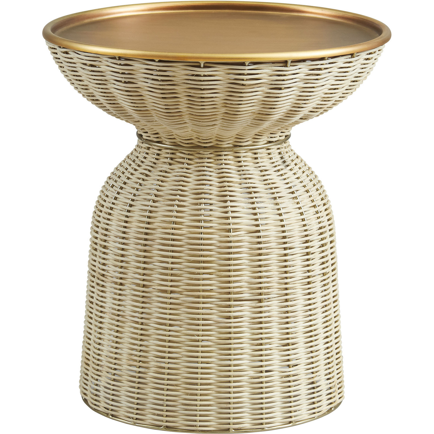 Blending natural textures with modern versatility, the Lazaro Side Table is a stylish and functional accent piece for any space. This round rattan side table features an intricate handwoven base with a sculptural hourglass silhouette, adding a touch of organic beauty to boho, coastal, or eclectic interiors. The metal tabletop has a warm finish with a raised lip, offering both style and practicality for holding drinks, books, or decorative pieces. Designed with convenience in mind, the removable tray top on this versatile end table allows for easy serving or styling. Whether used as a bedside table, accent table, or indoor plant stand, this woven rattan table makes a statement while keeping your space effortlessly chic. Weight Capacity: 75 lbs.17-Inch Round Rattan Side Table
