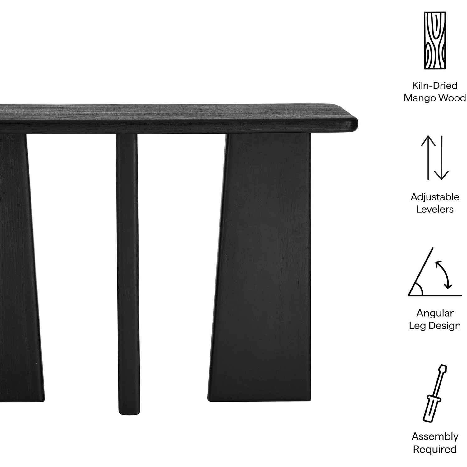 The Porter Console Table redefines versatility with its striking design and solid wood craftsmanship. With a black wirebrushed finish, this 45-inch console table features unique angular legs that create a sculptural, geometric aesthetic, blending artistry with functionality. Perfect for use as a sofa table, hallway accent table, or entryway statement piece, this narrow console table is ideal for both spacious and compact interiors. The natural richness of mango wood highlights its rustic charm, while adjustable levelers ensure stability on uneven surfaces. Whether placed behind a sofa, against a wall, or in your entryway, the Porter Console Table is an artful fusion of form and function. Assembly required. Weight Capacity: 176 lbs.Narrow Console Table