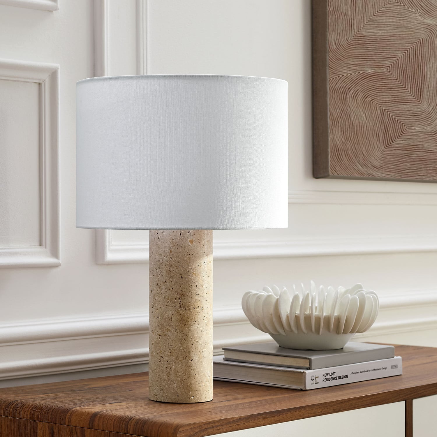 With its refined materials and timeless silhouette, the Zenith Table Lamp brings natural elegance to any space. A striking real travertine stone pillar base adds natural beauty, while the fabric drum shade diffuses soft, ambient lighting. The modern lamp design blends seamlessly into contemporary, boho, or classic interiors, making it a perfect accent light for bedside tables, living room side tables, buffets, or entryway consoles. A 70-inch cord with an in-line on/off switch offers effortless control, and the table lamp with drum shade requires one A19 E26 60W bulb (not included). ETL listed.Natural Travertine Stone