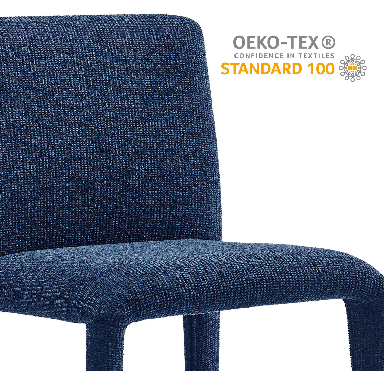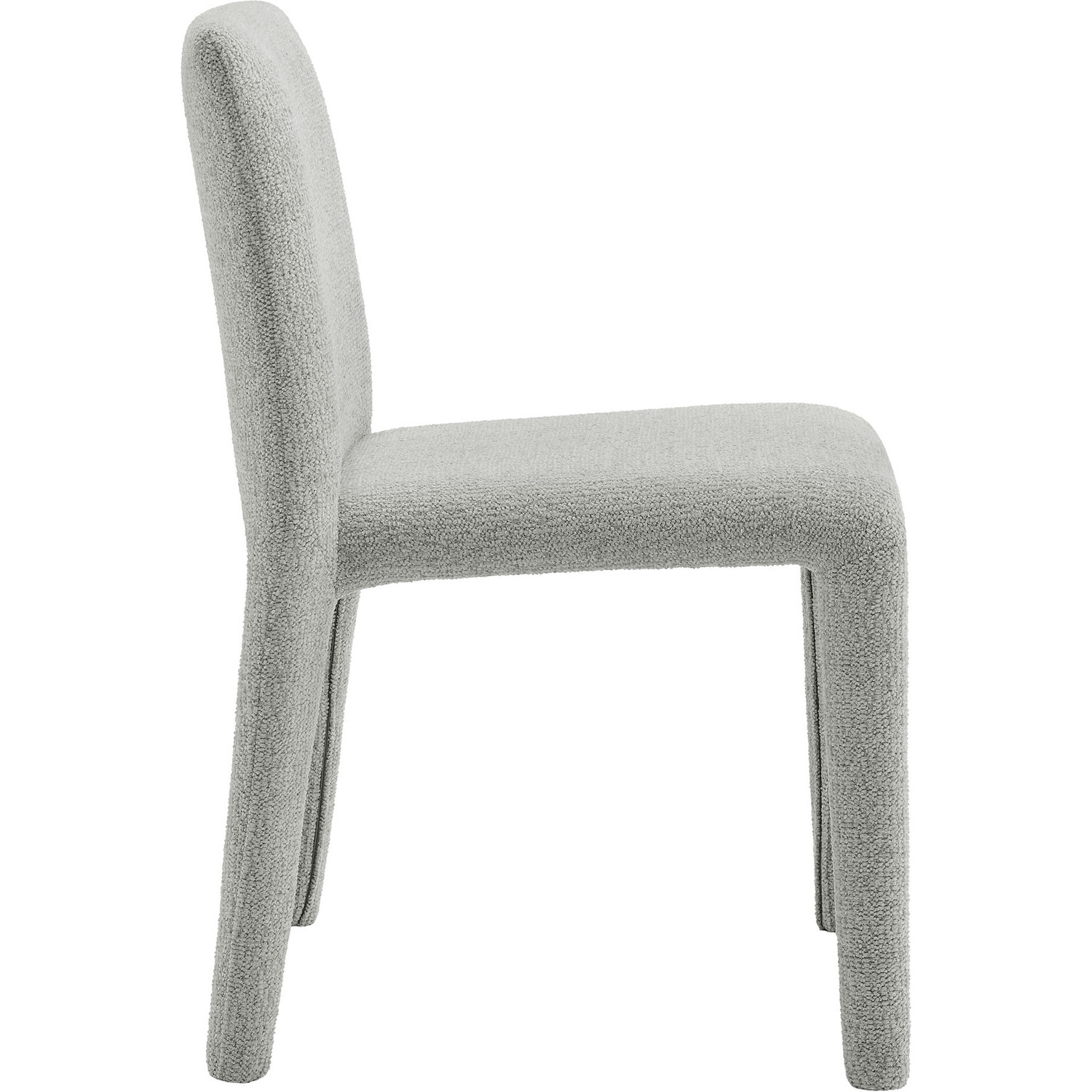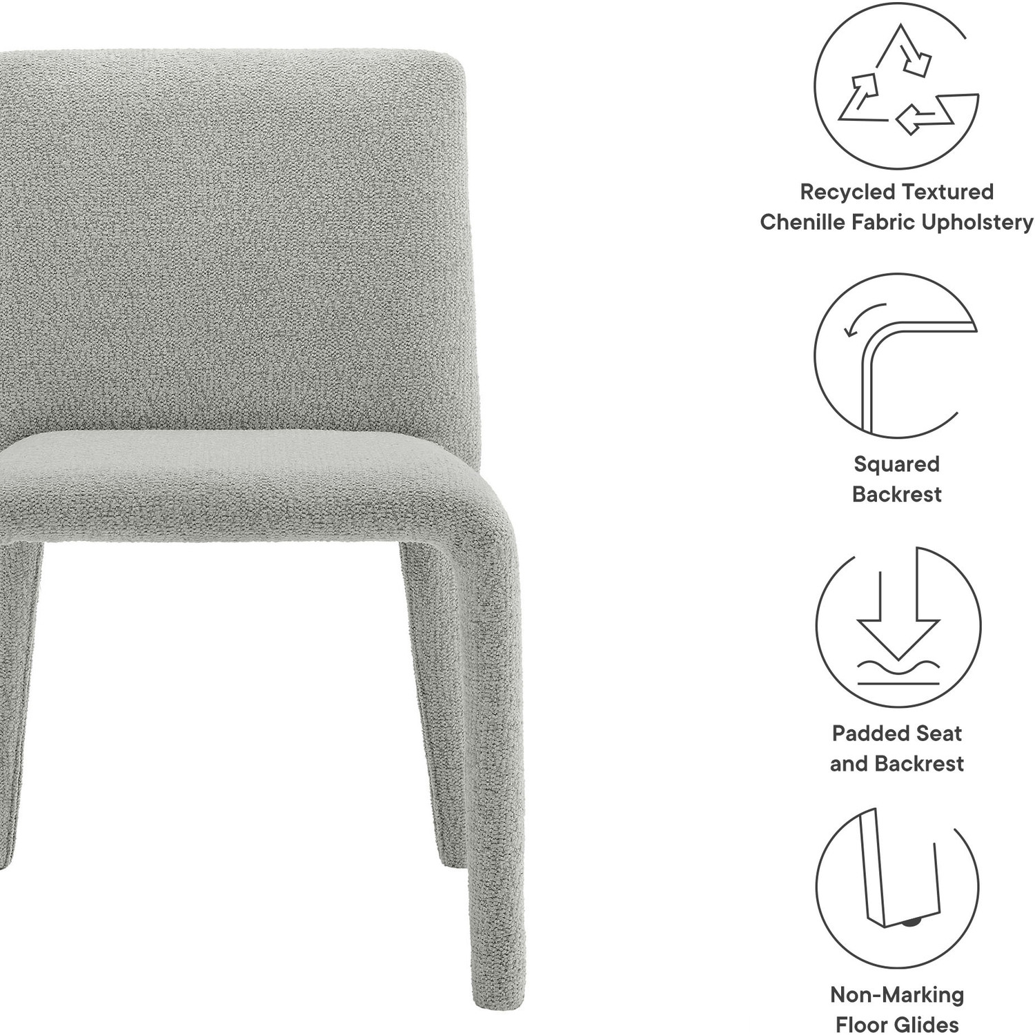 Bring an understated sophistication to your dining or living space with the Rhodes Dining Chair. Fully wrapped in soft, textured chenille fabric—including the legs—this modern accent chair exudes sleek elegance. The dining side chair's fully upholstered minimalist design features a high square backrest with subtly rounded edges and a padded seat for exceptional comfort. Made from recycled plastic bottles, the upholstery fabric is also OEKO-TEX® STANDARD 100 Certified. Perfectly suited as a side chair, desk chair, or as a living room accent chair, Rhodes complements a variety of interiors, from contemporary to mid-century modern. Non-marking floor glides protect your floors, and this upholstered dining chair arrives fully assembled for effortless setup. Weight Capacity: 300 lbs.Fully Upholstered Dining Chair