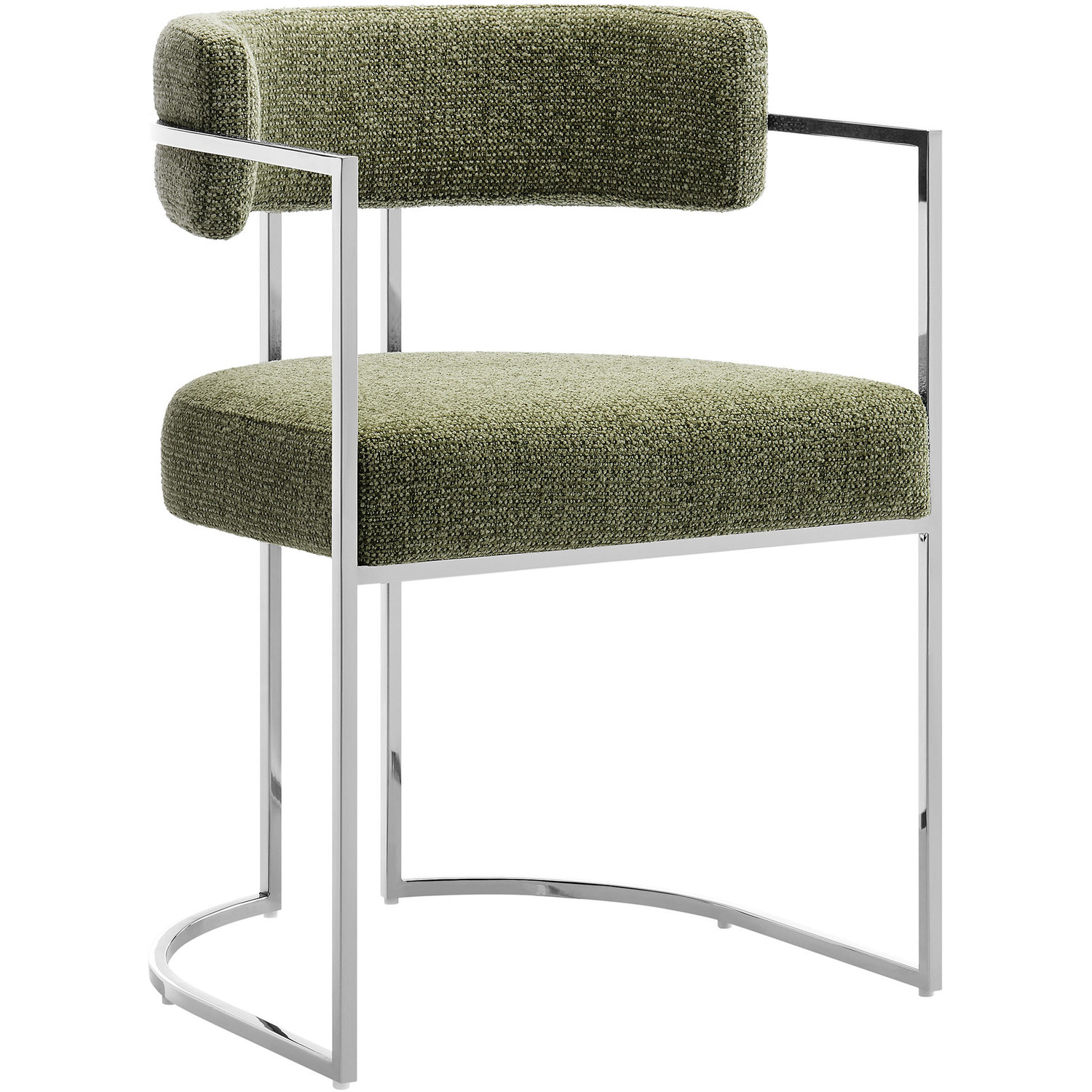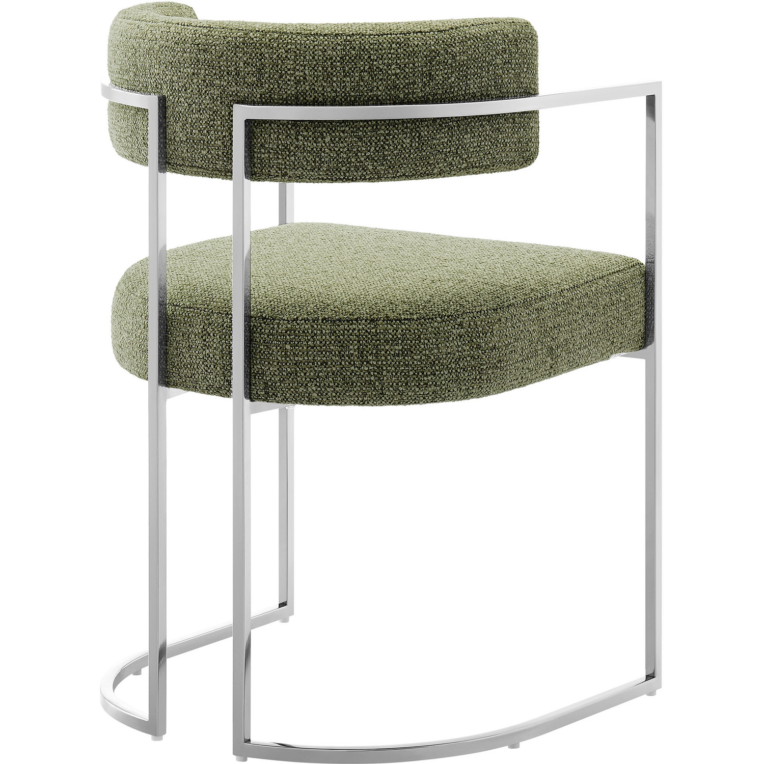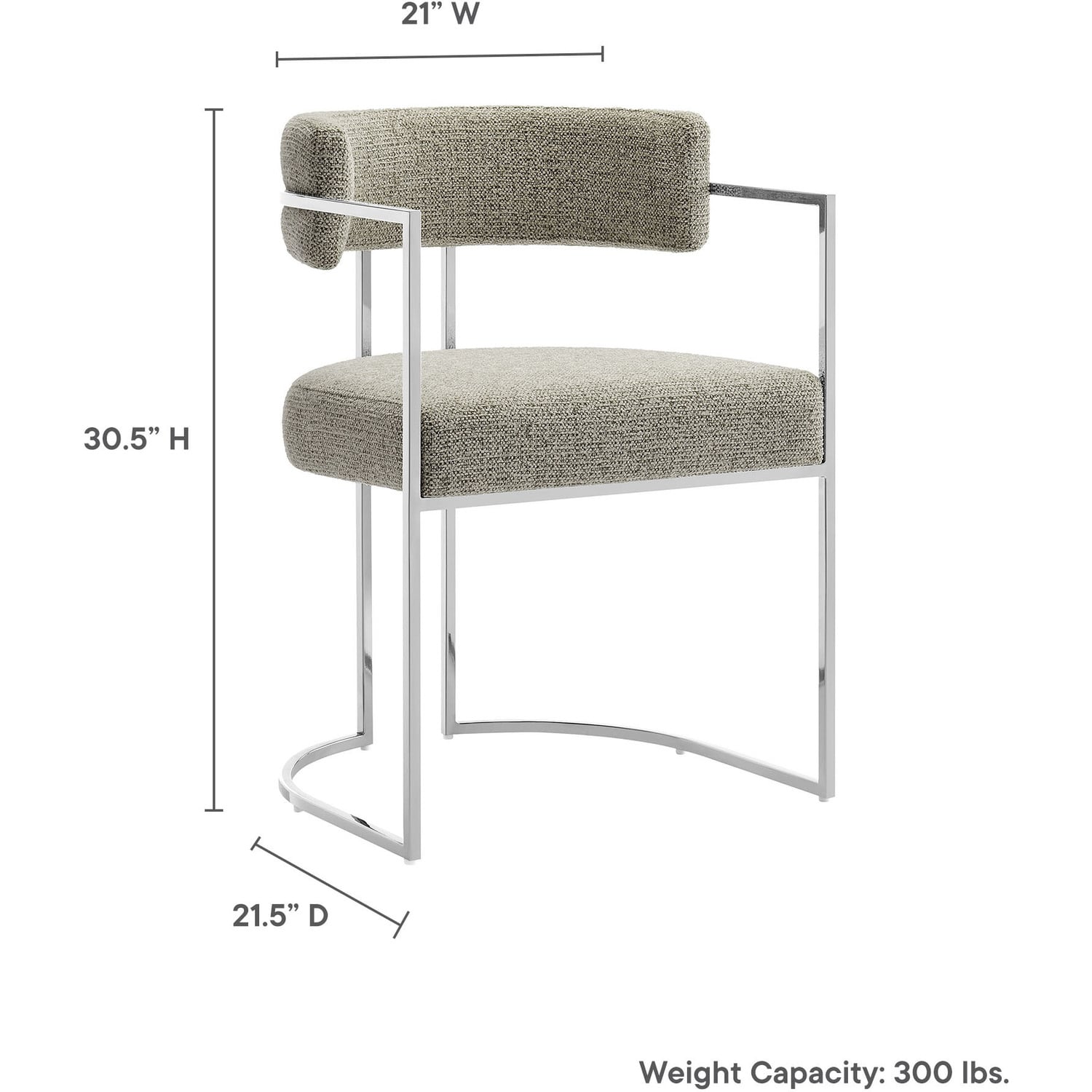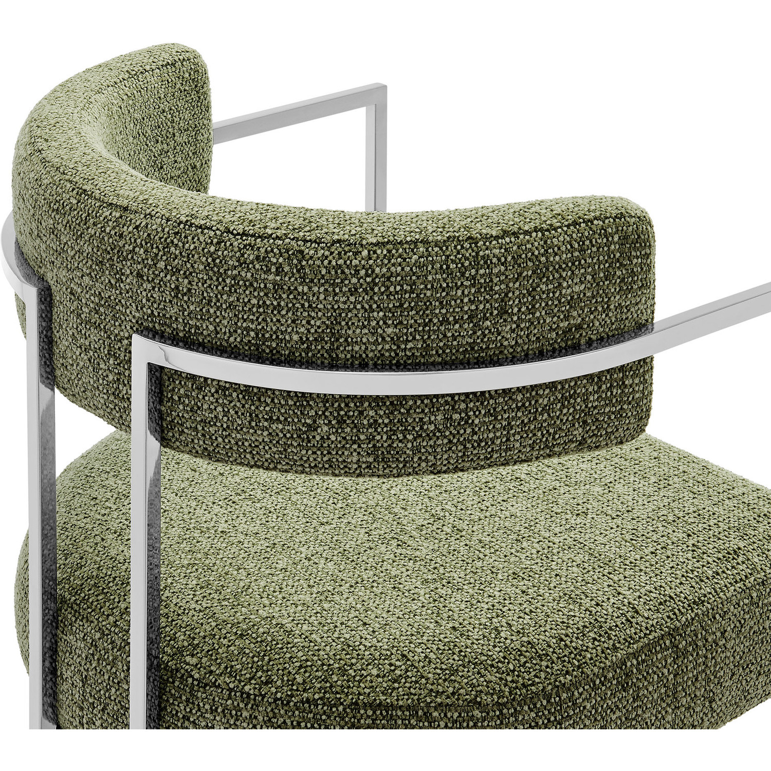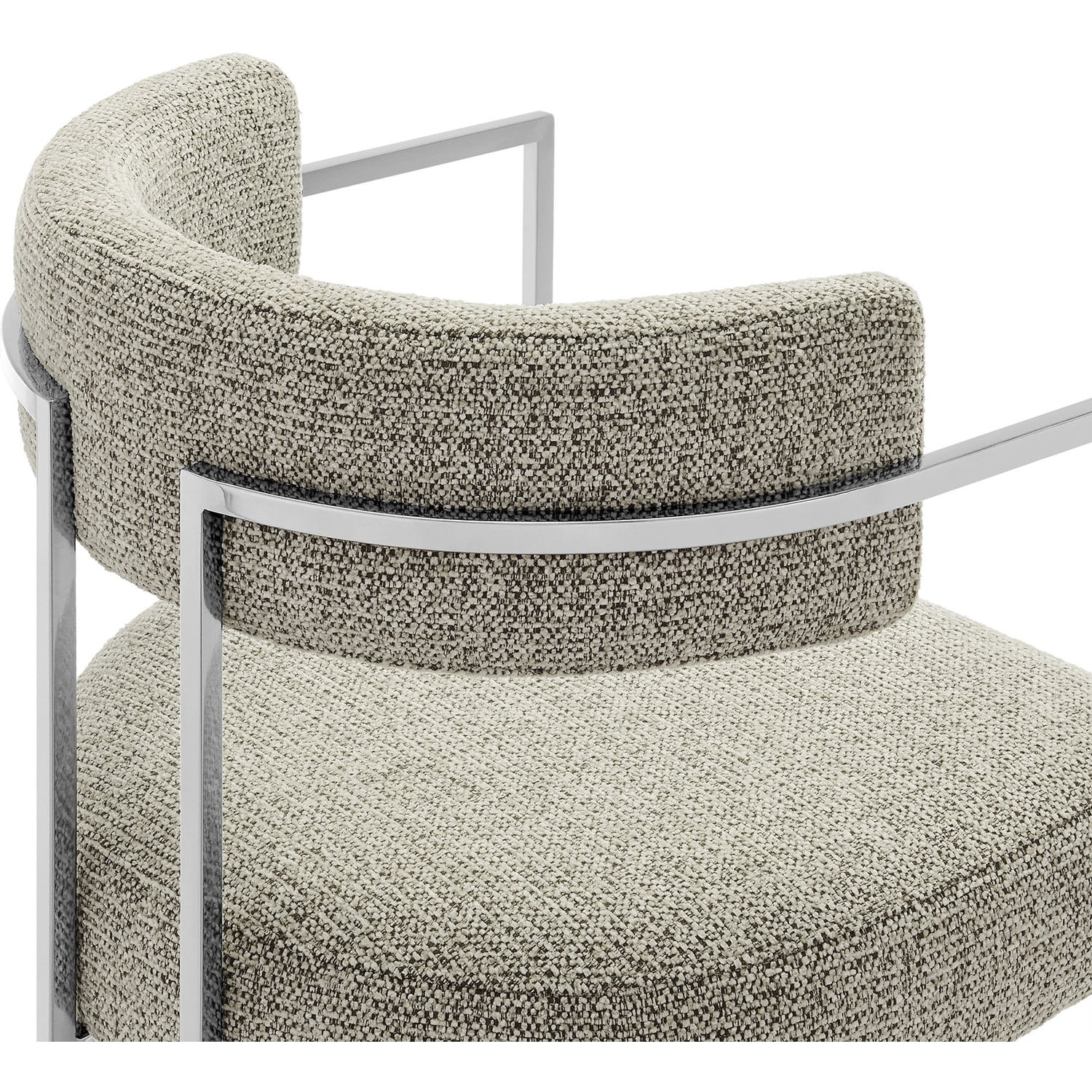 Elevate your dining room, living space, or workspace with the Huron Curved Back Dining Chair, a true fusion of artful design and functional comfort. Featuring a bold barrel silhouette with a curved metal frame and unique sled base, this modern dining chair offers a sleek, architectural profile that enhances contemporary interiors. Upholstered in soft woven fabric with a textured depth, the padded seat and backrest ensure luxurious comfort for dining, working, or relaxing. Better for you and the environment, the upholstery fabric is also OEKO-TEX® STANDARD 100 Certified. Perfect as a dining chair, accent chair, vanity chair, or desk chair, Huron's sculptural shape and supportive arms add sophistication and retro style to any room. Designed for effortless living with 70's flair, this upholstered chair with metal frame includes adjustable non-marking floor glides to protect surfaces and arrives fully assembled for immediate use. Weight Capacity: 300 lbs.Modern Barrel Dining Chair