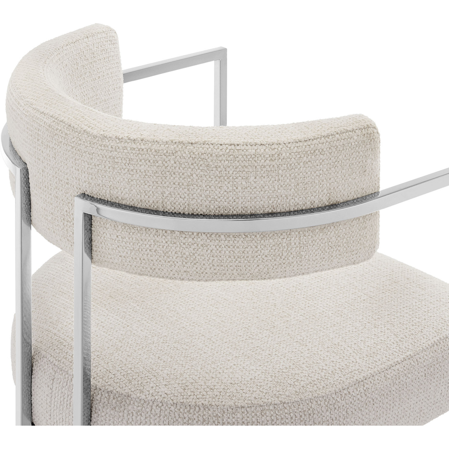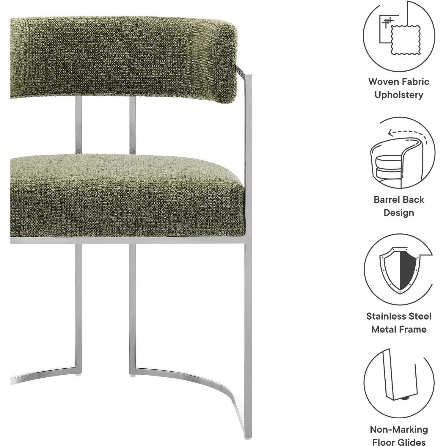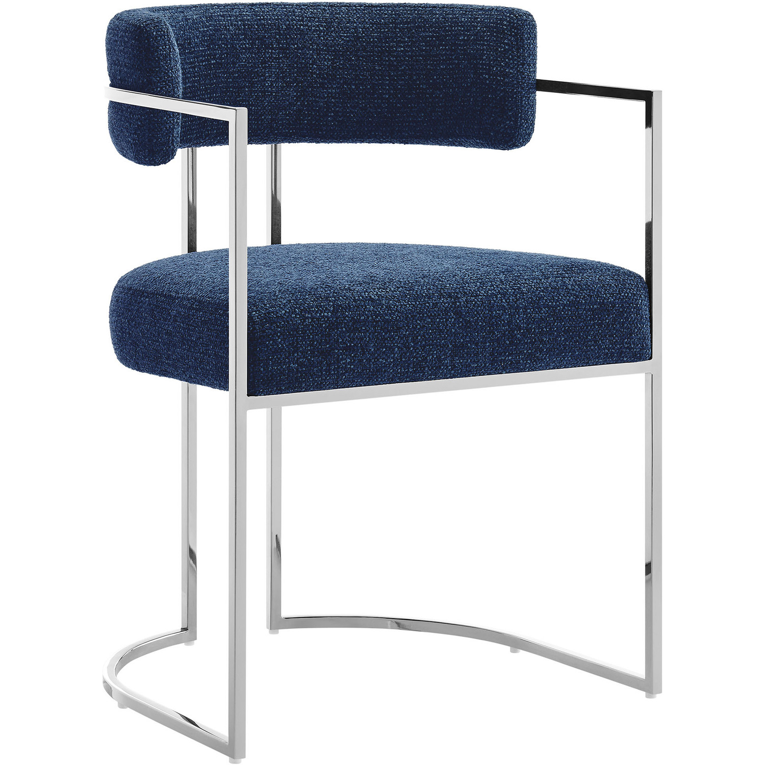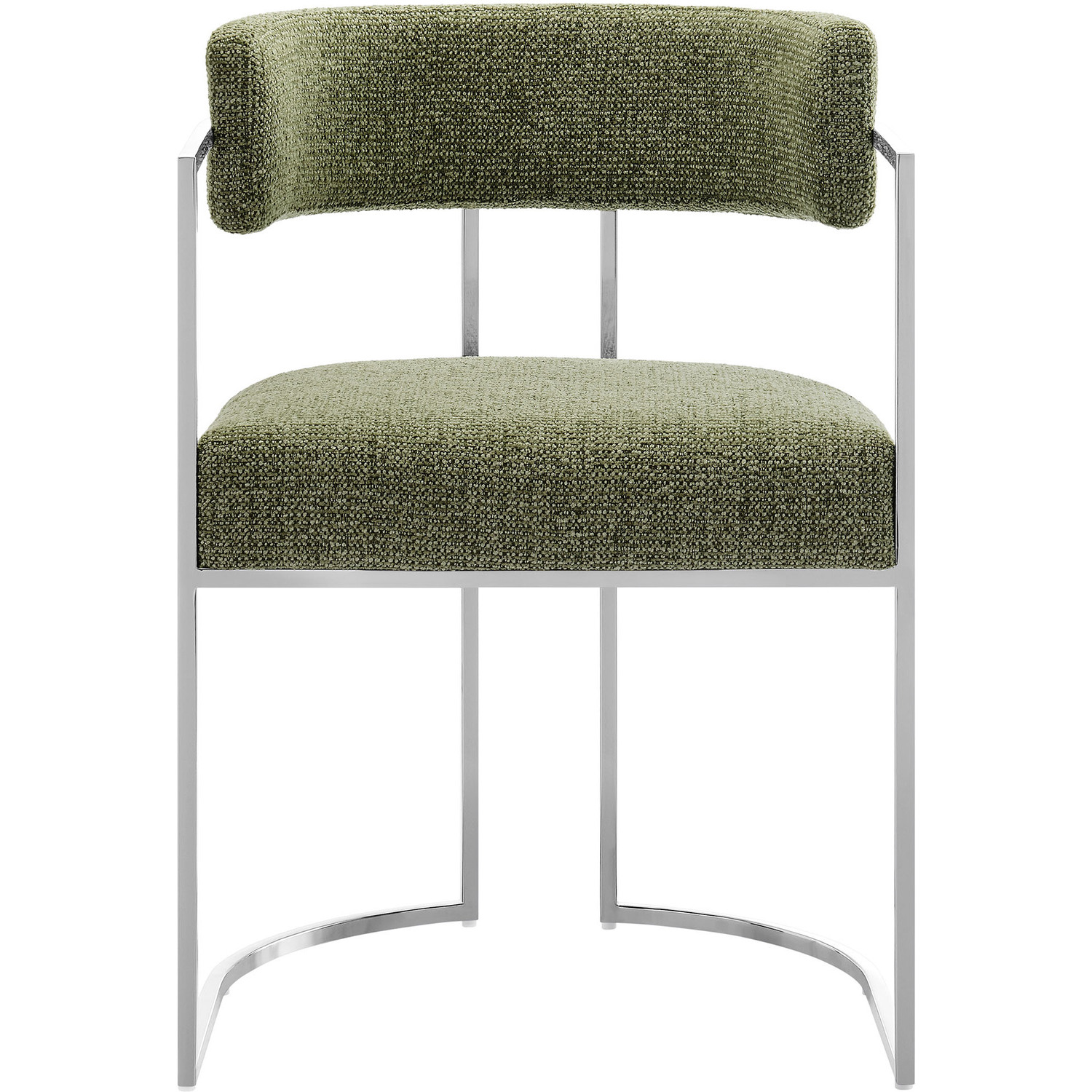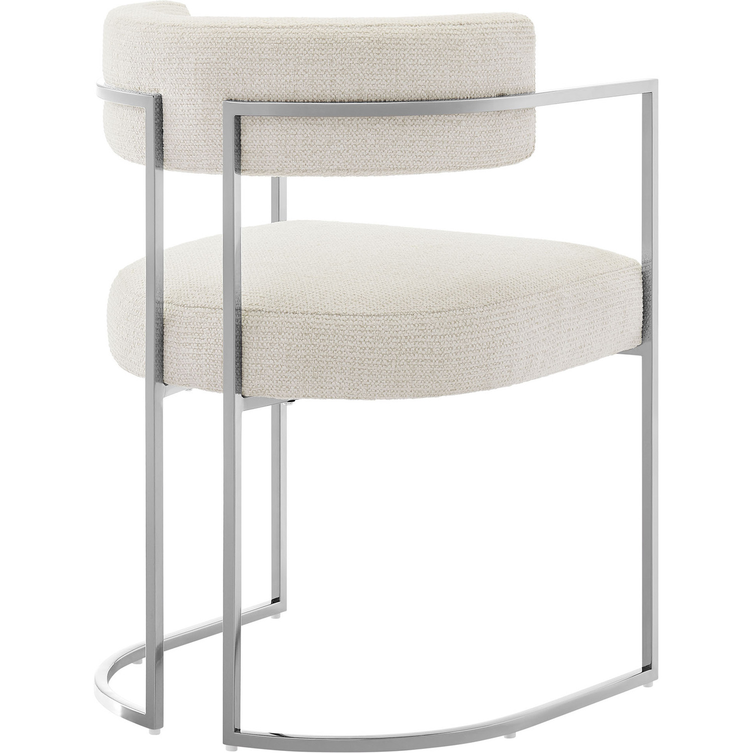 Elevate your dining room, living space, or workspace with the Huron Curved Back Dining Chair, a true fusion of artful design and functional comfort. Featuring a bold barrel silhouette with a curved metal frame and unique sled base, this modern dining chair offers a sleek, architectural profile that enhances contemporary interiors. Upholstered in soft woven fabric with a textured depth, the padded seat and backrest ensure luxurious comfort for dining, working, or relaxing. Better for you and the environment, the upholstery fabric is also OEKO-TEX® STANDARD 100 Certified. Perfect as a dining chair, accent chair, vanity chair, or desk chair, Huron's sculptural shape and supportive arms add sophistication and retro style to any room. Designed for effortless living with 70's flair, this upholstered chair with metal frame includes adjustable non-marking floor glides to protect surfaces and arrives fully assembled for immediate use. Weight Capacity: 300 lbs.Modern Barrel Dining Chair